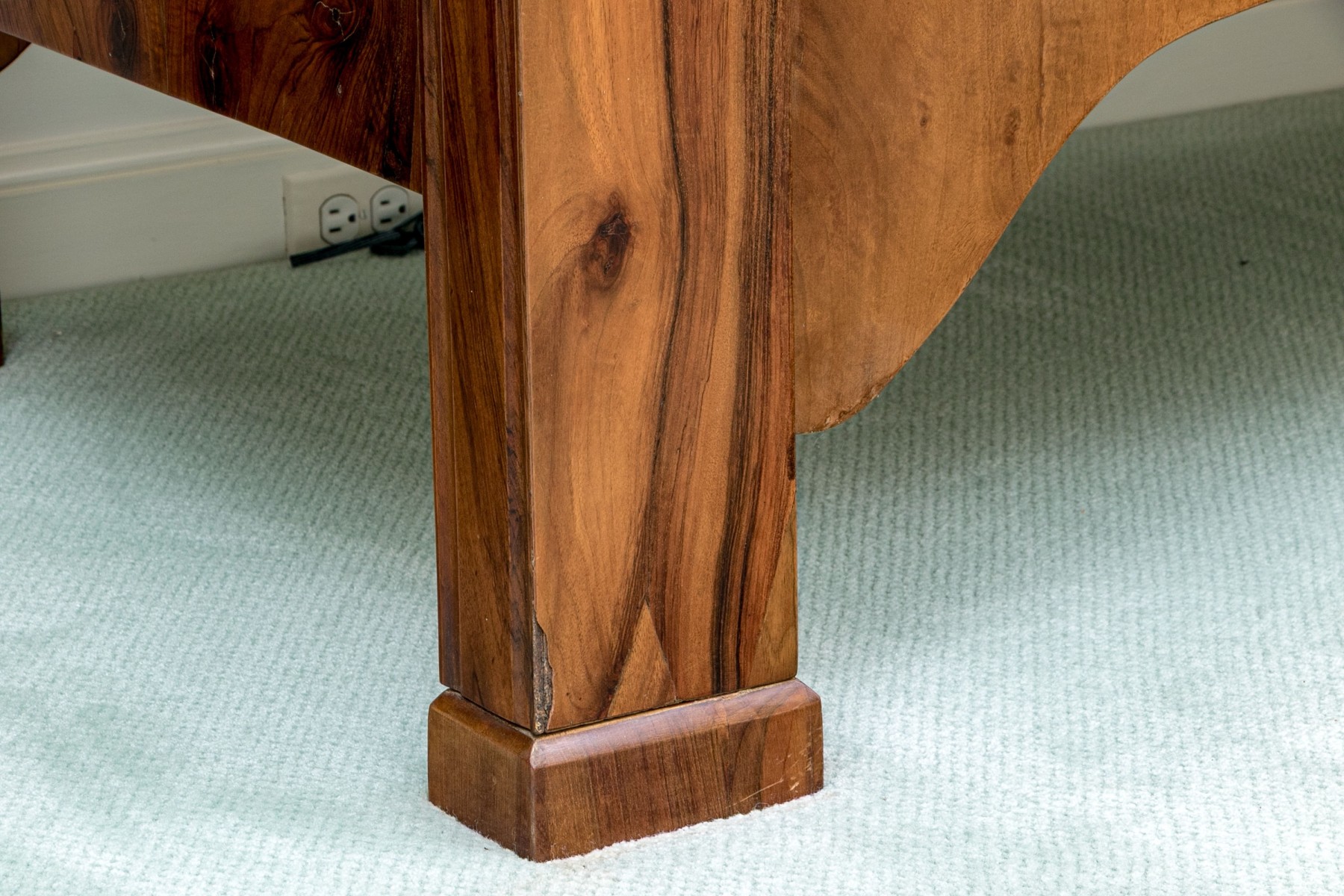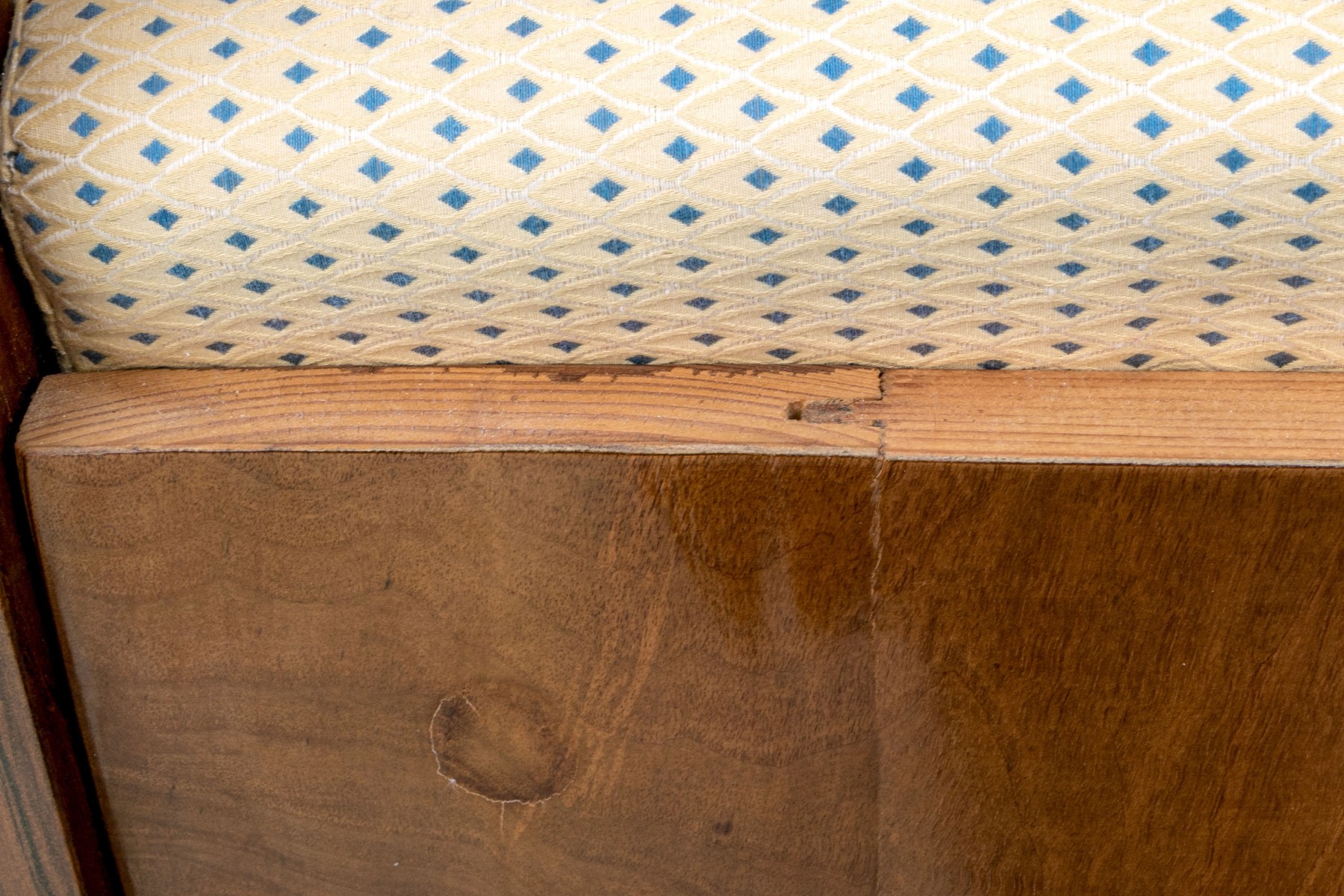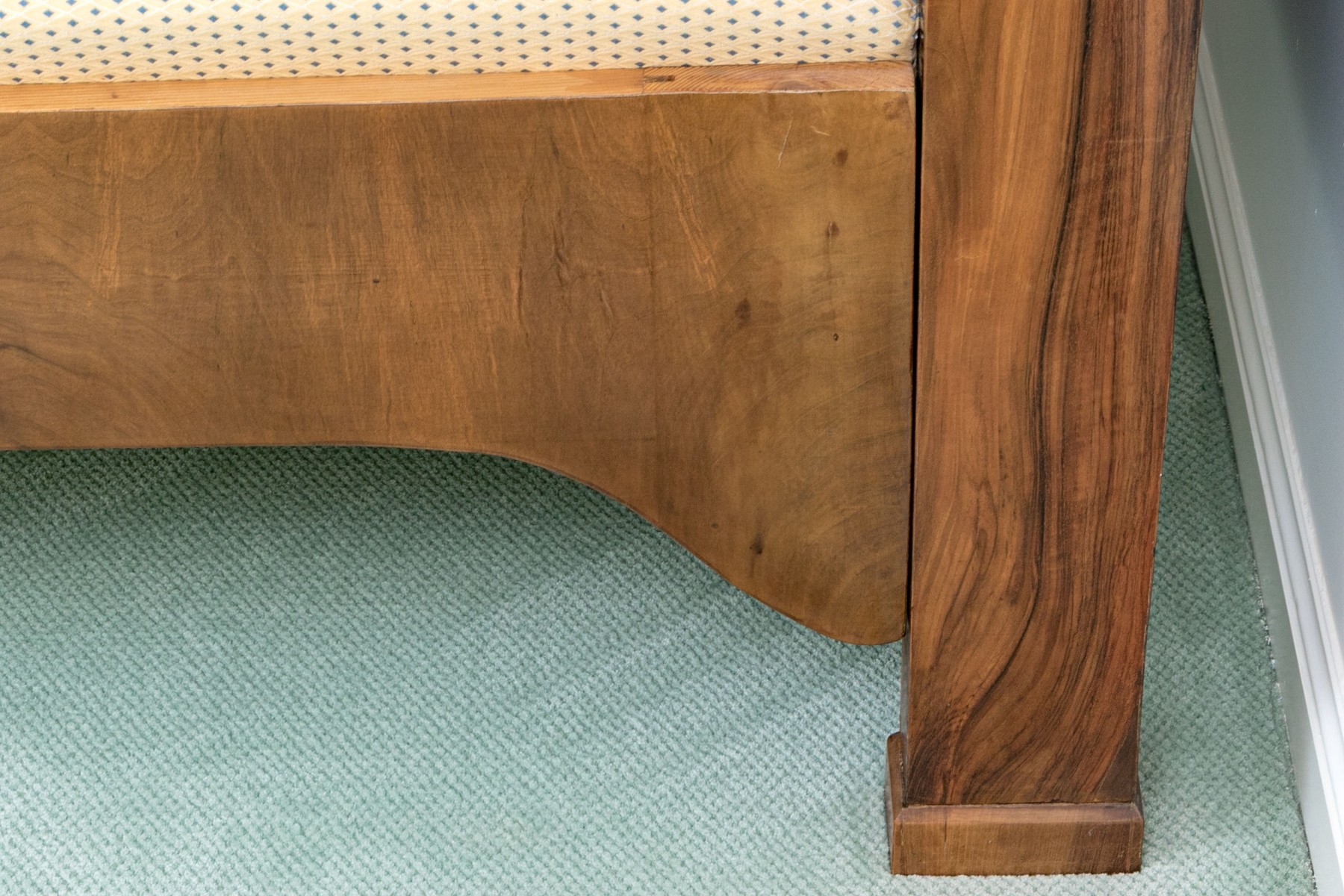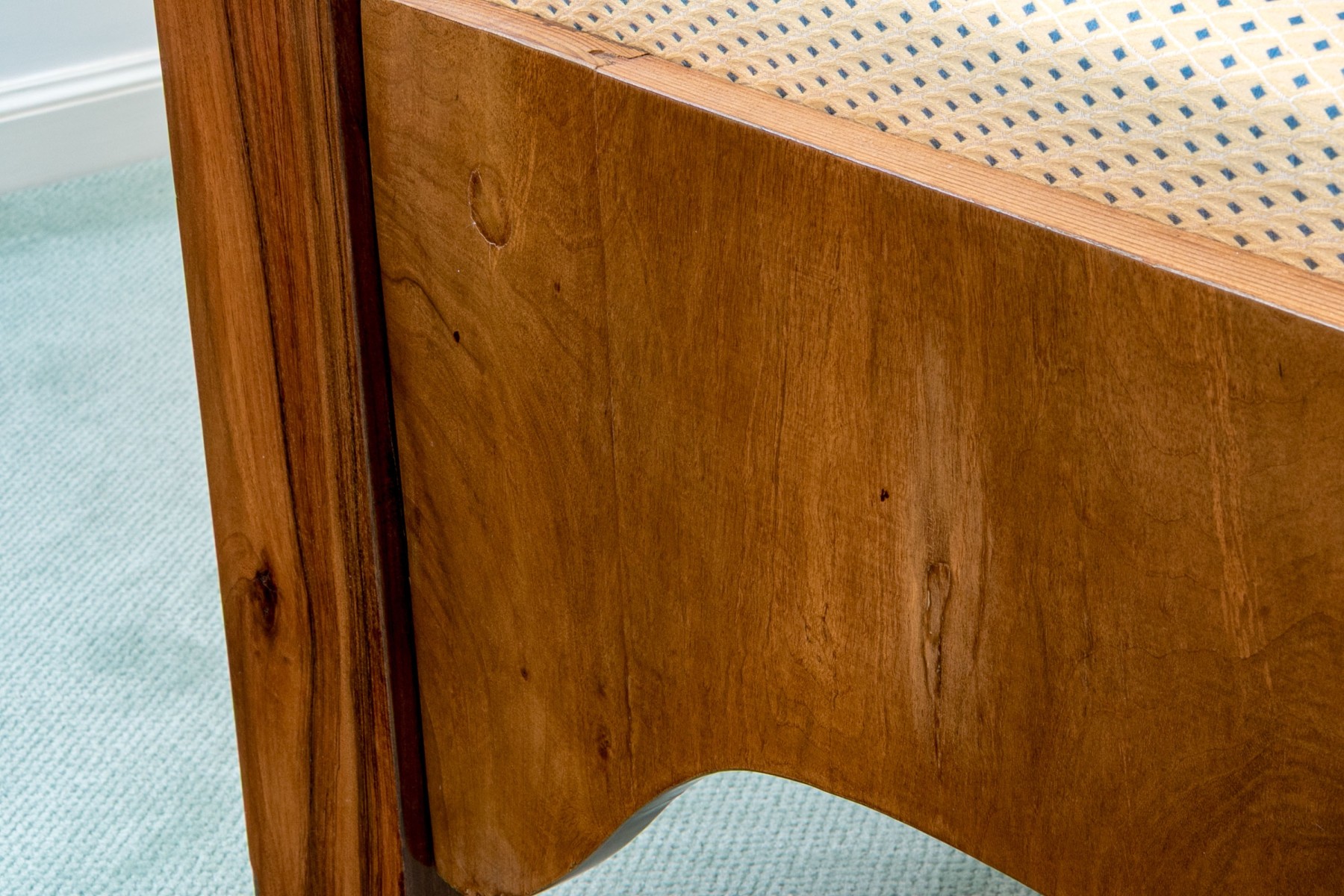 A beautiful bed professionally restored and French polished. A spot of veneer loss to the corner of a leg and checking along the inner side of a leg. A small tear to the mattress but still in good form overall.