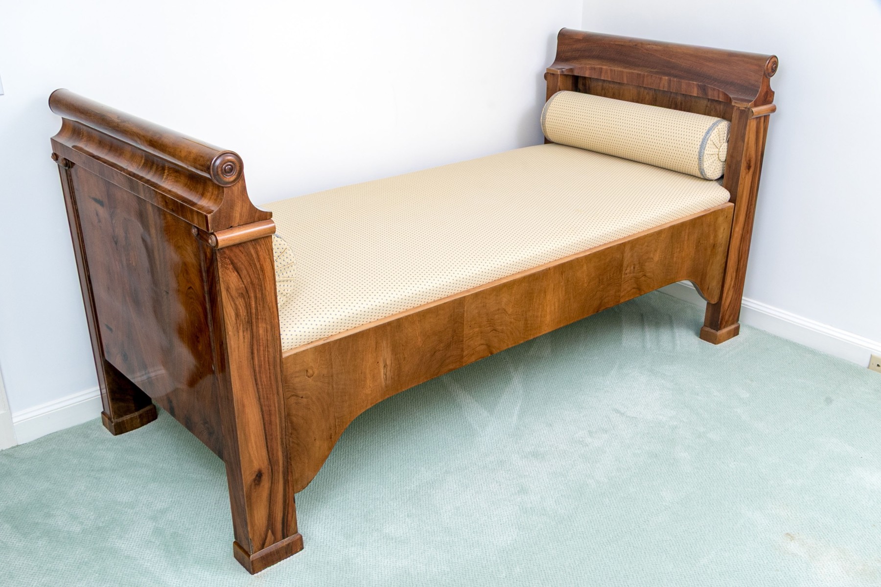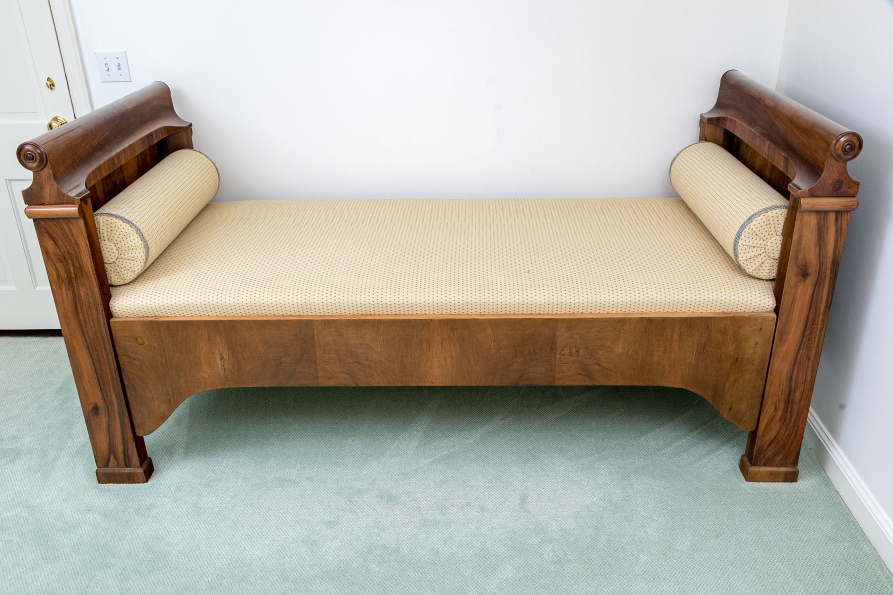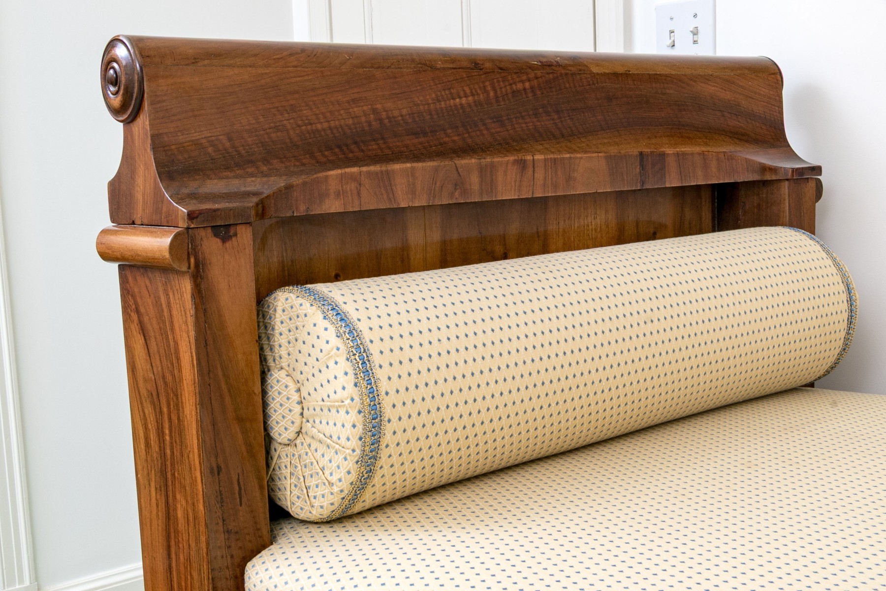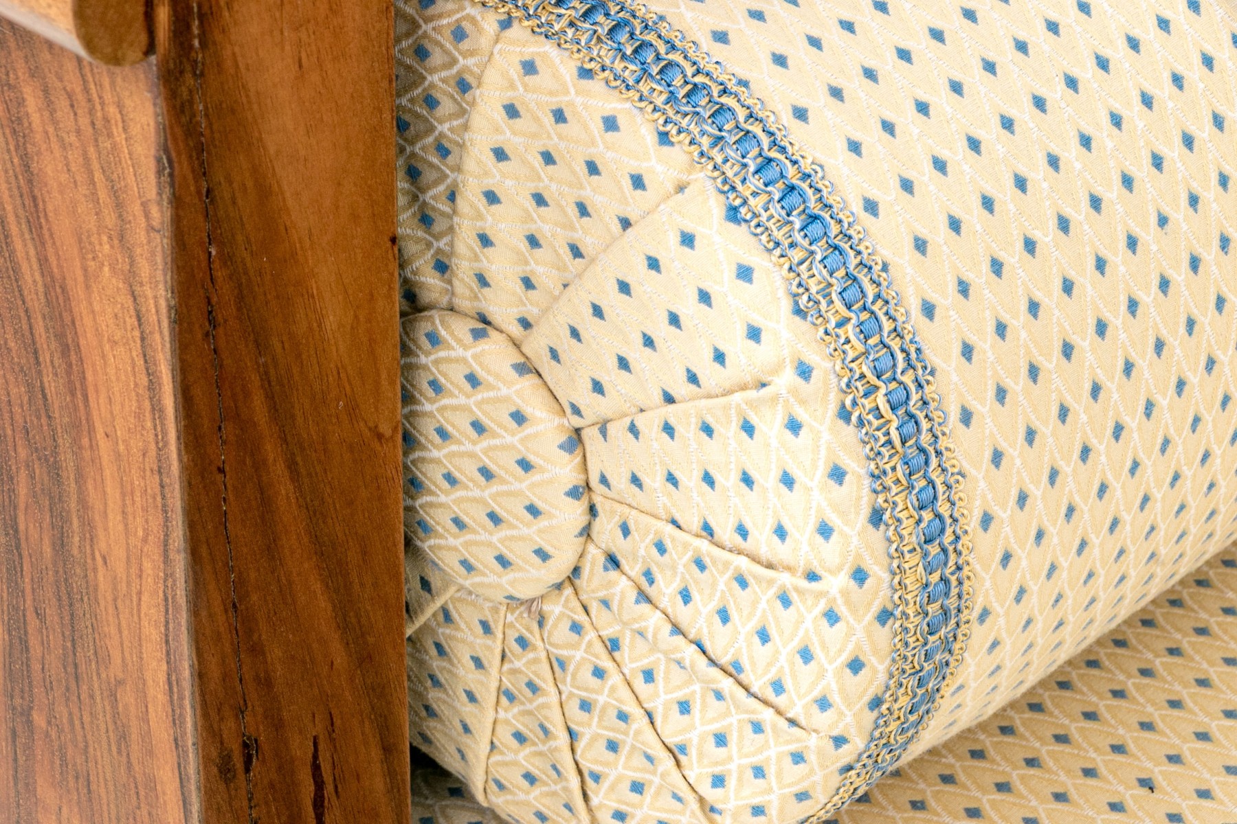 A quality Biedermeier daybed veneered with gorgeous warm-toned medium brown wood, designed with rolled rails at the top and rosette end caps leading down to rectangular columnar posts for the legs. Fitted with a custom mattress in pale yellow fabric with white lattice patterns and blue diamond motifs, matching gorgeous woven braiding. Includes two matching bolster pillows.