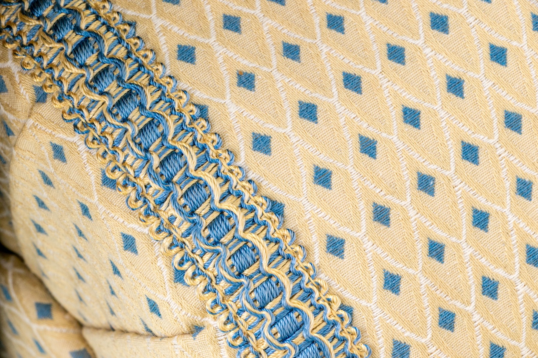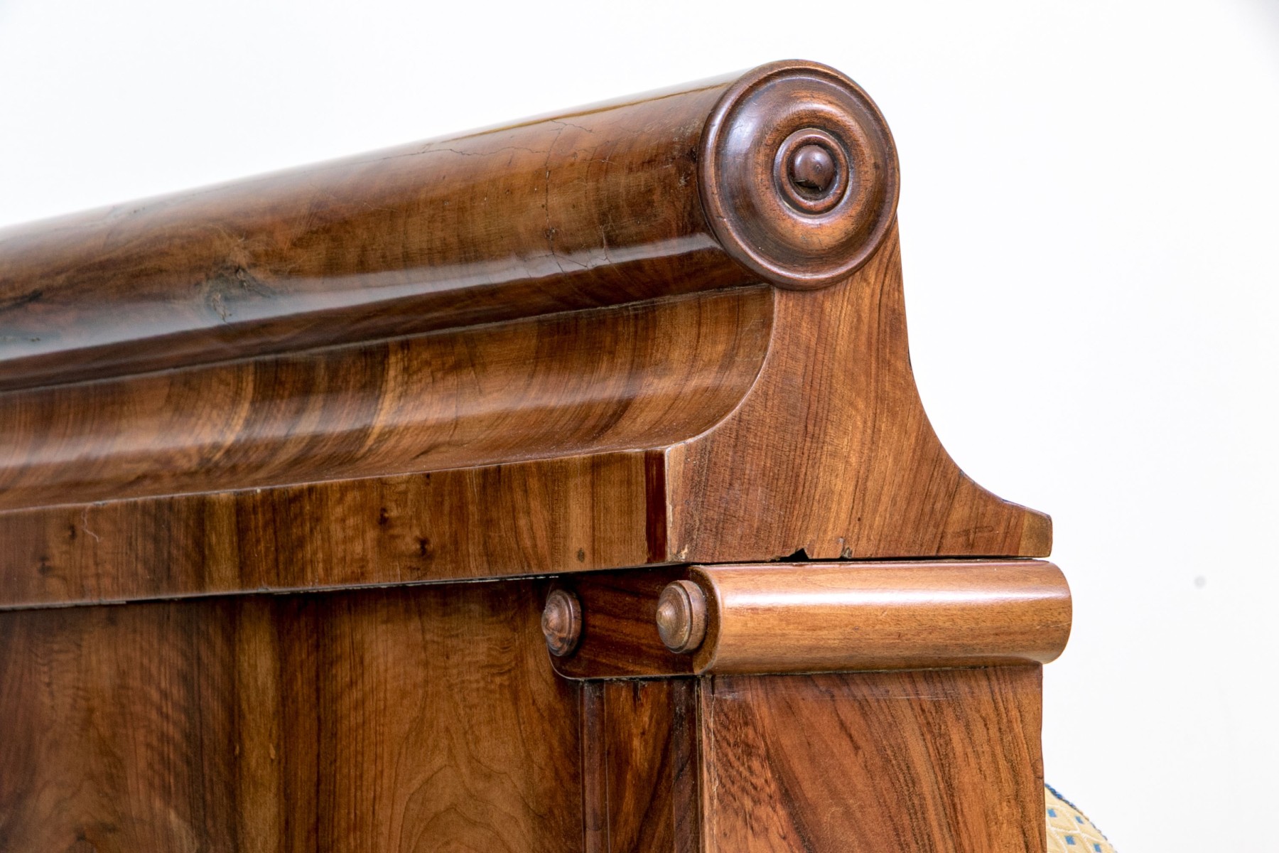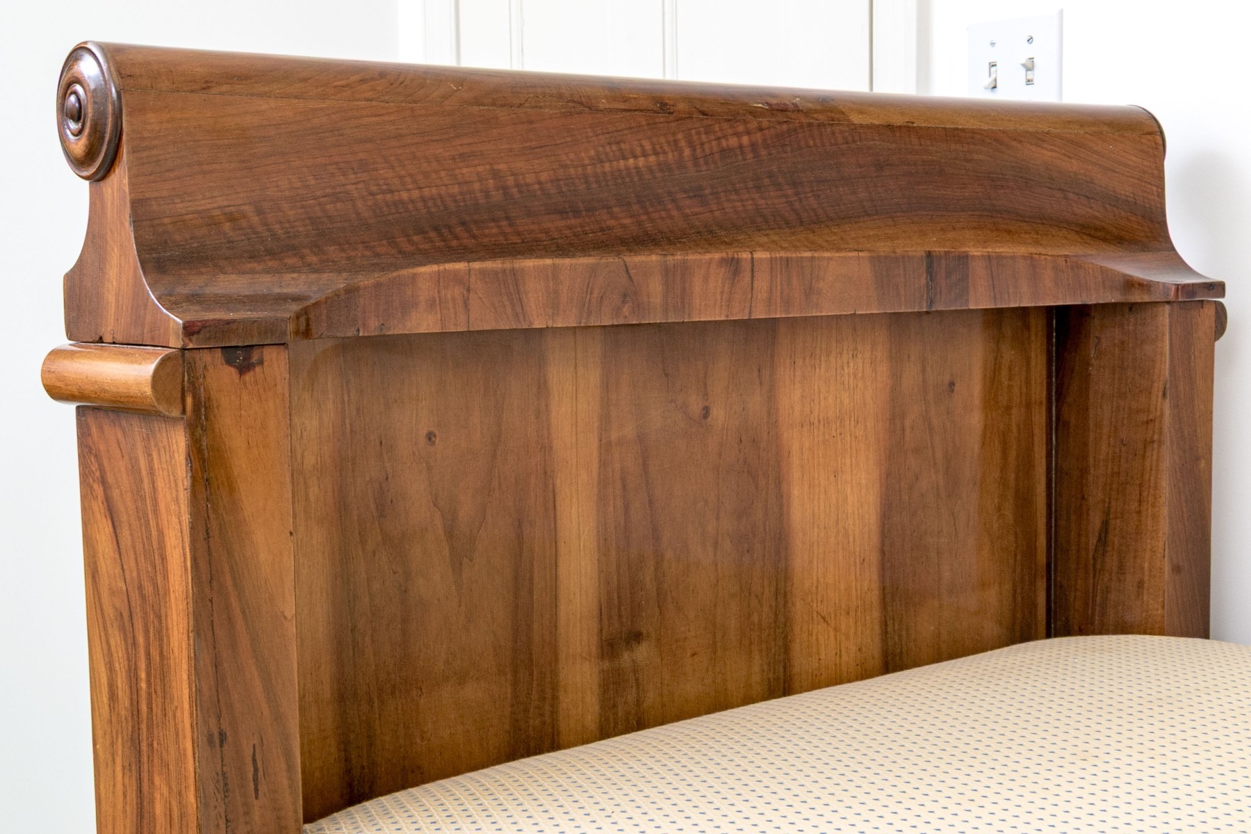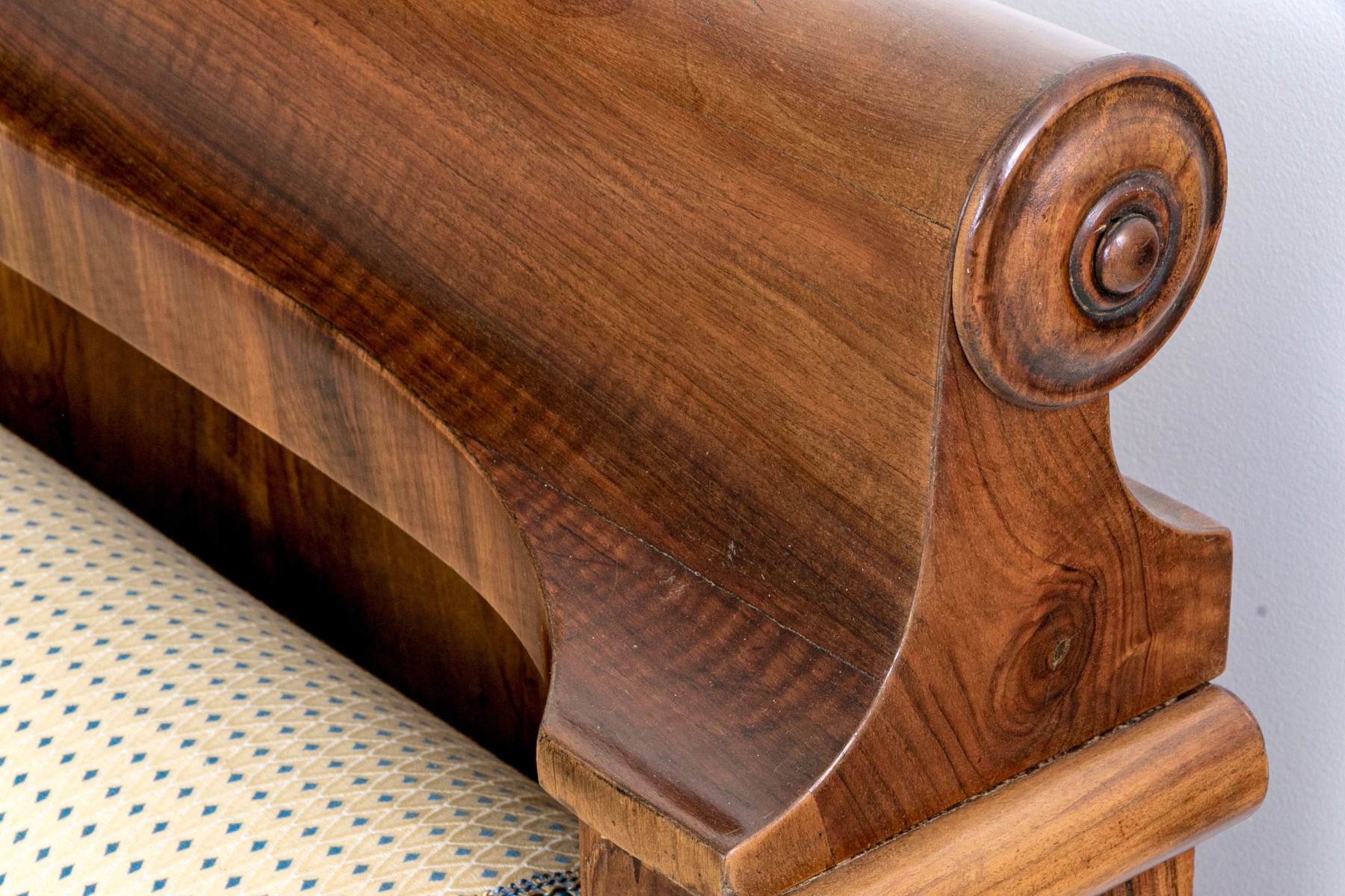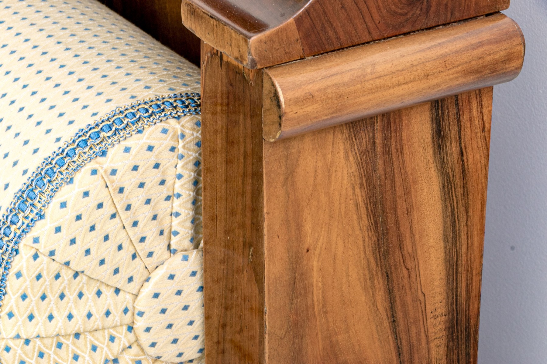 A quality Biedermeier daybed veneered with gorgeous warm-toned medium brown wood, designed with rolled rails at the top and rosette end caps leading down to rectangular columnar posts for the legs. Fitted with a custom mattress in pale yellow fabric with white lattice patterns and blue diamond motifs, matching gorgeous woven braiding. Includes two matching bolster pillows.