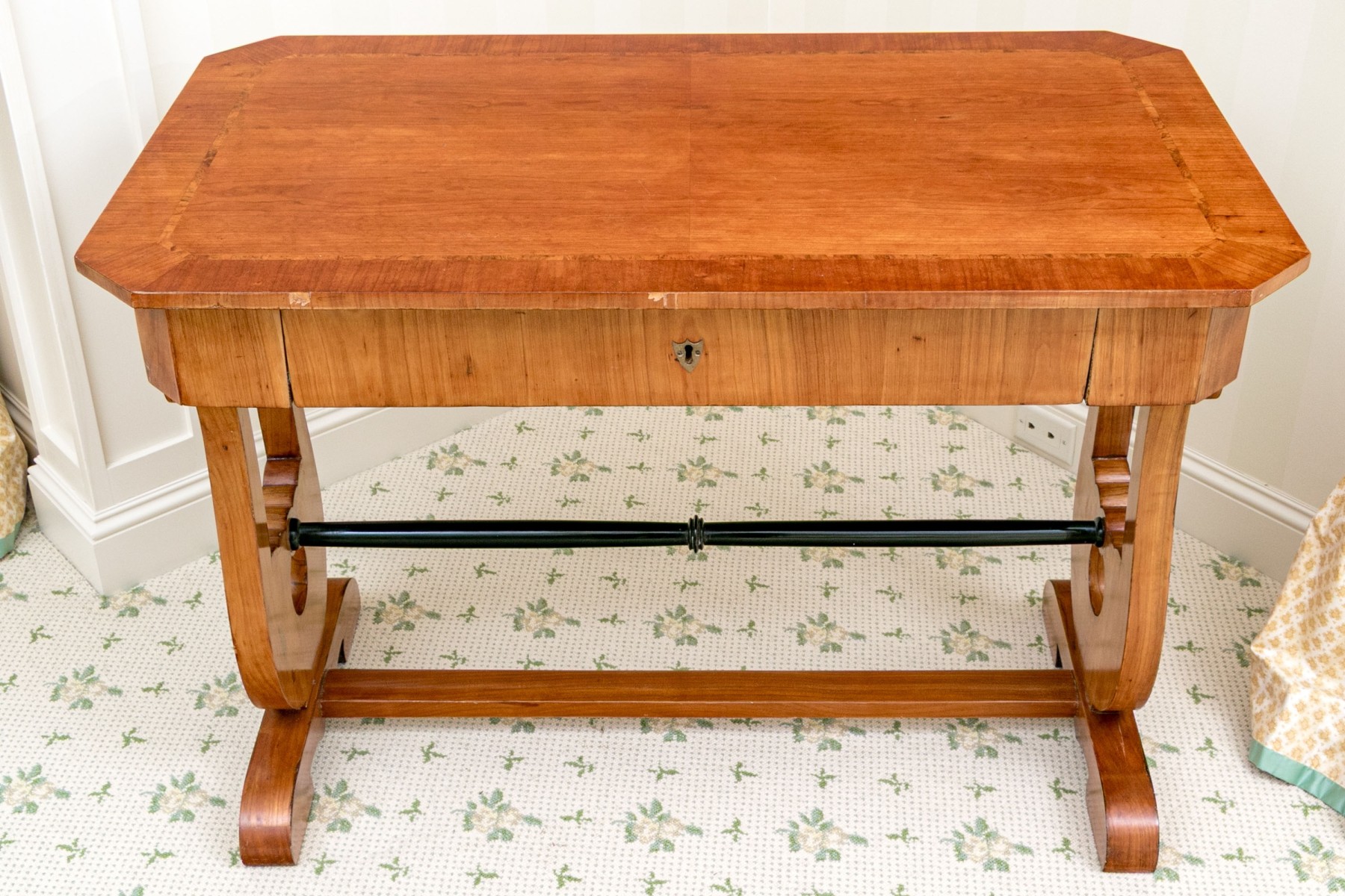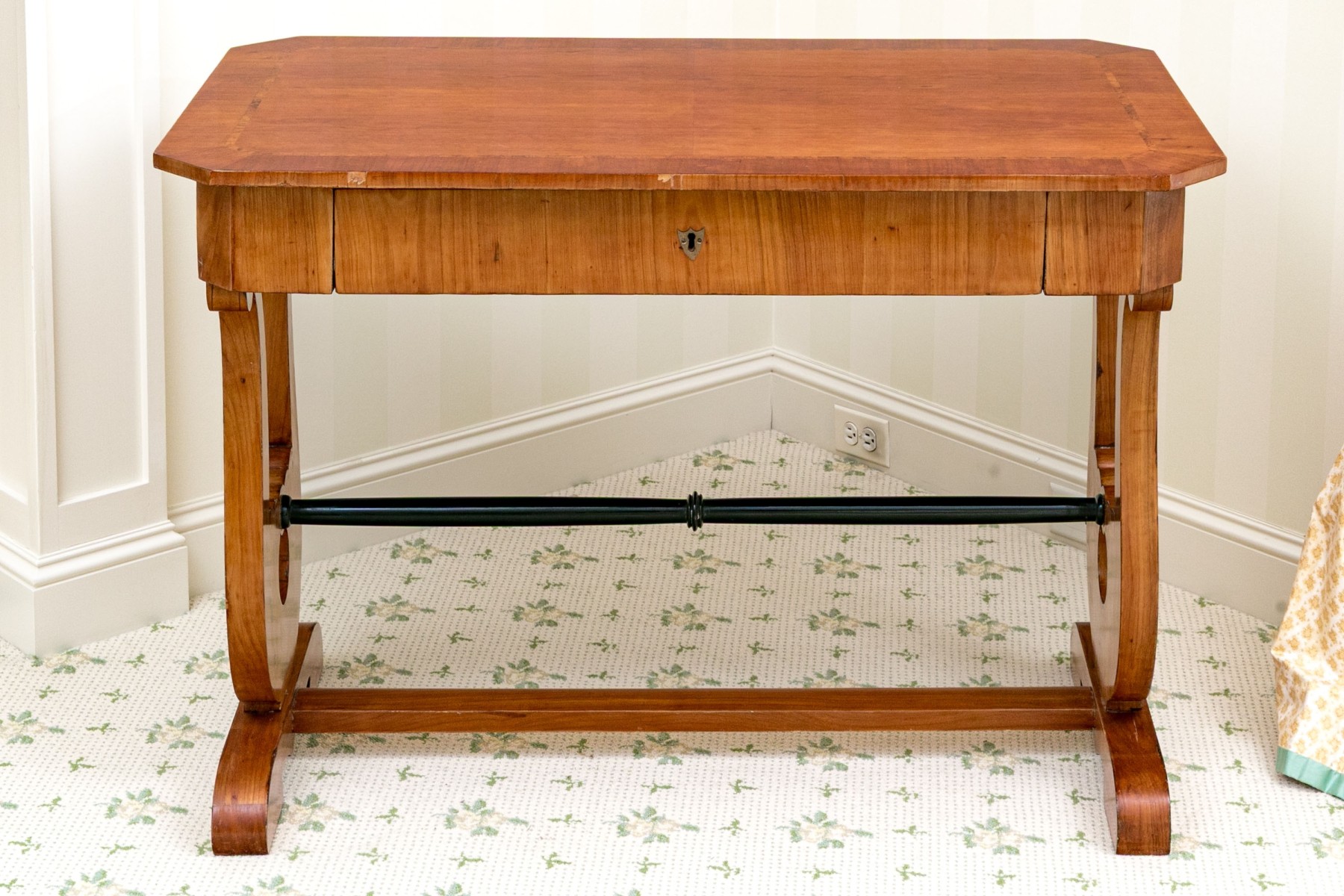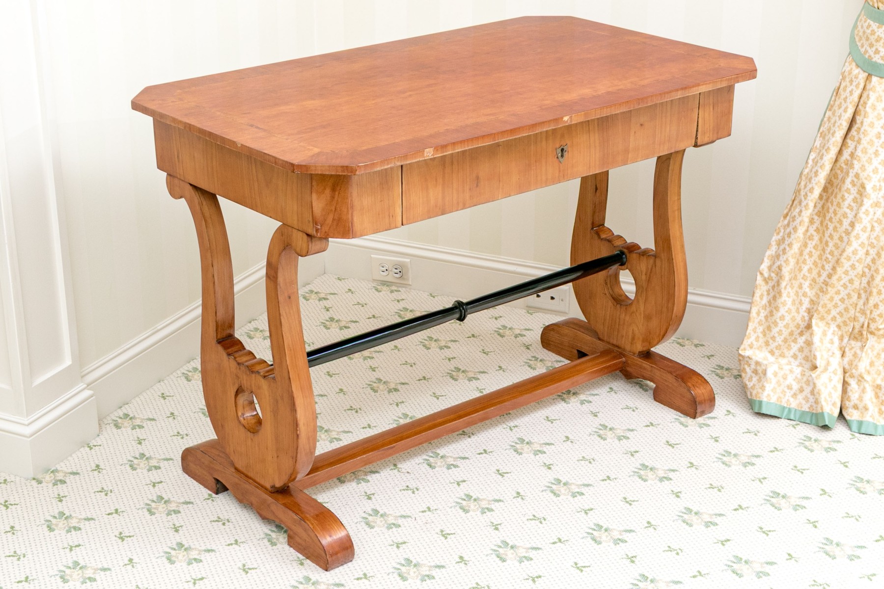 A wonderful antique Biedermeier writing table veneered in beautiful orange-brown wood, showcasing a cut-corner rectangular top with a banded edge overhanging a single drawer with a brass shield key escutcheon. Raised on lyre form trestle legs with an ebonized upper stretcher providing a pop of contrast and a lower stretcher for additional support.