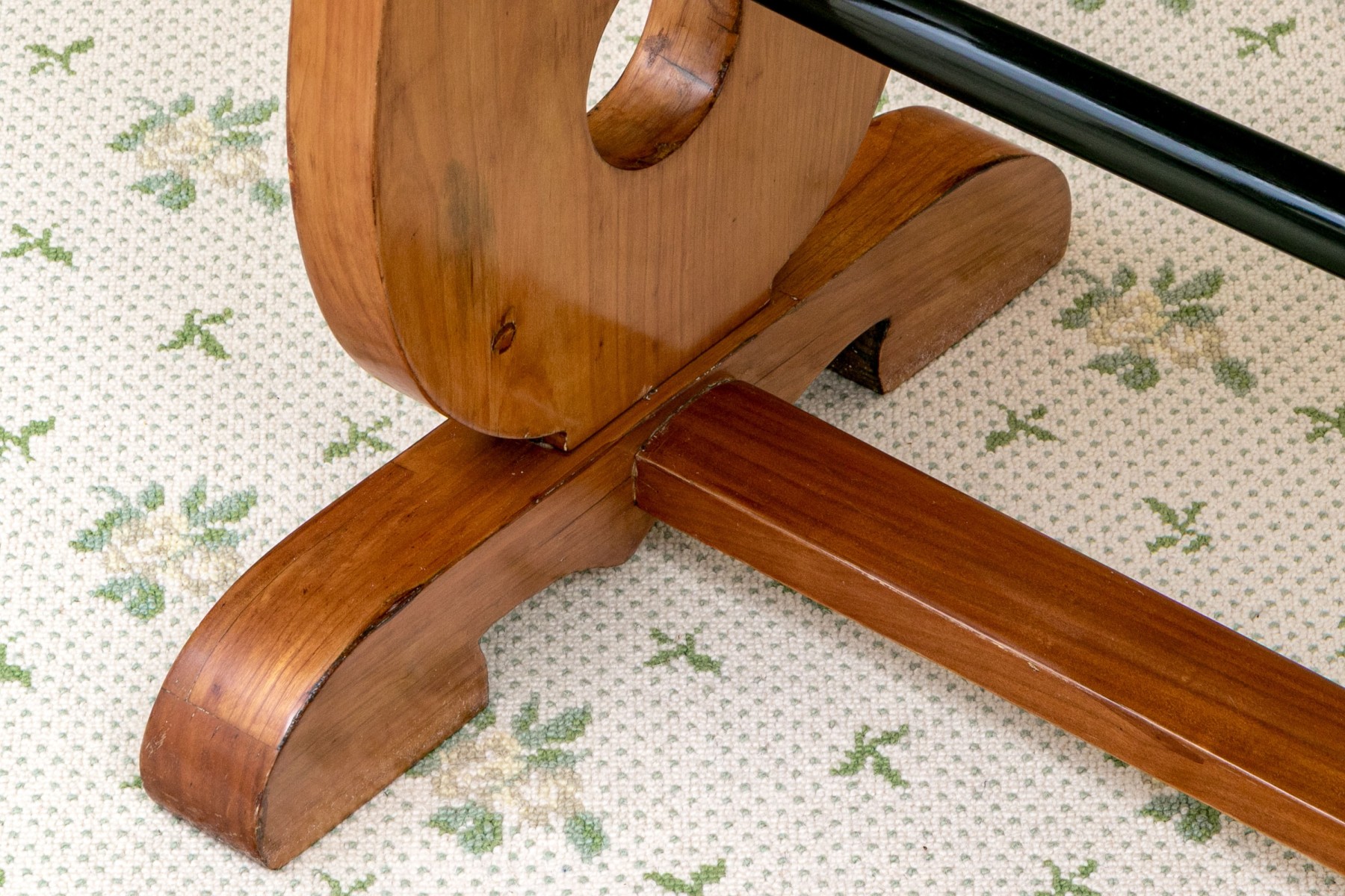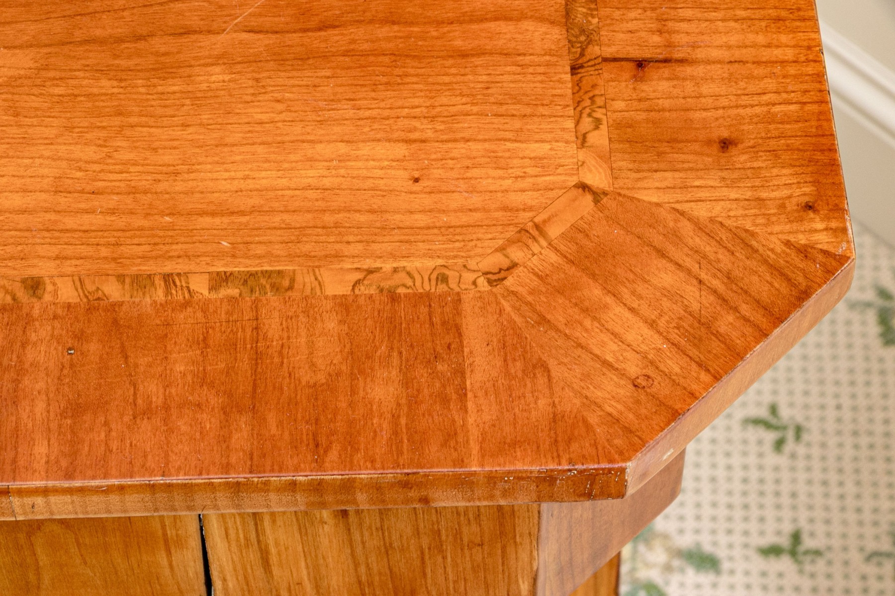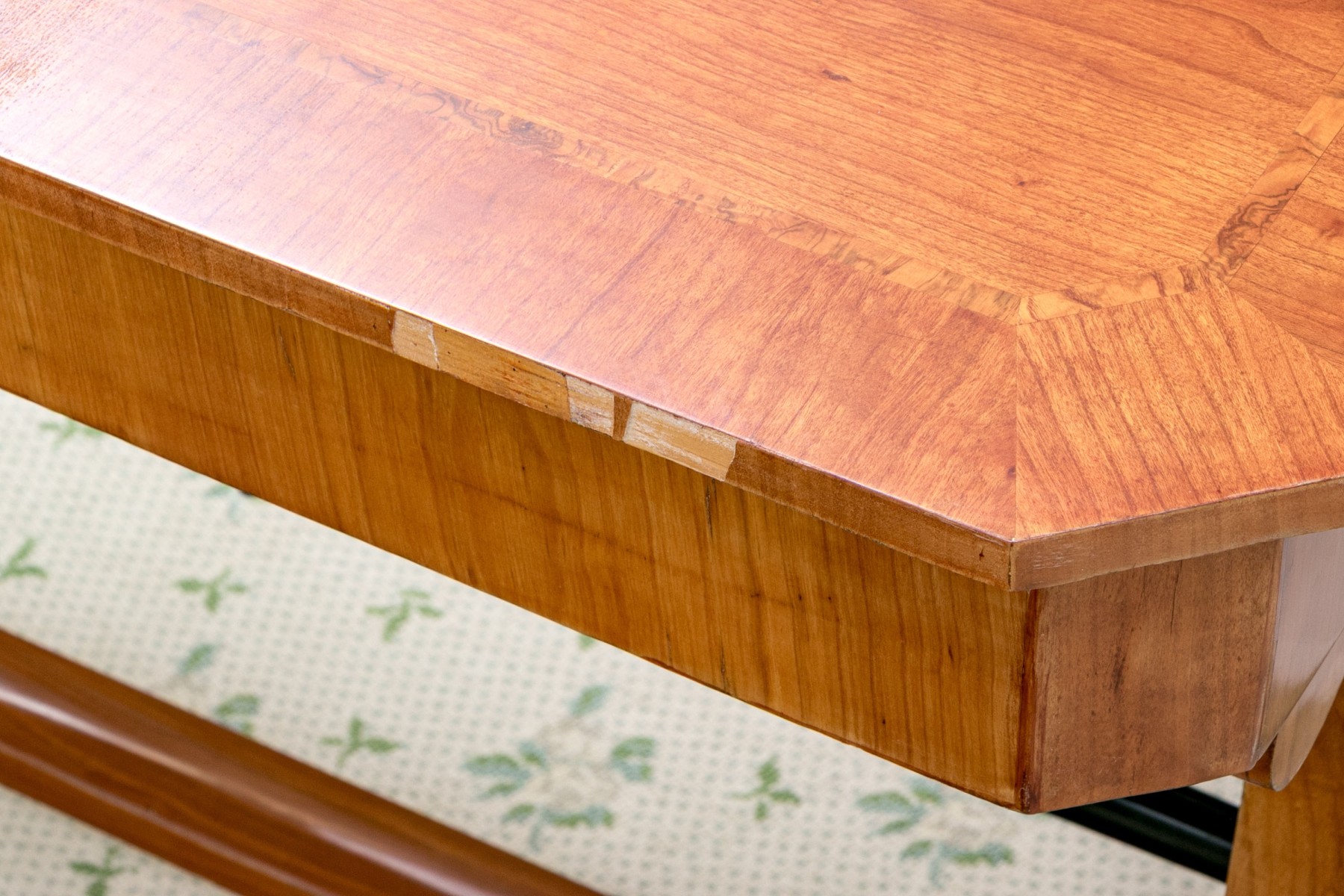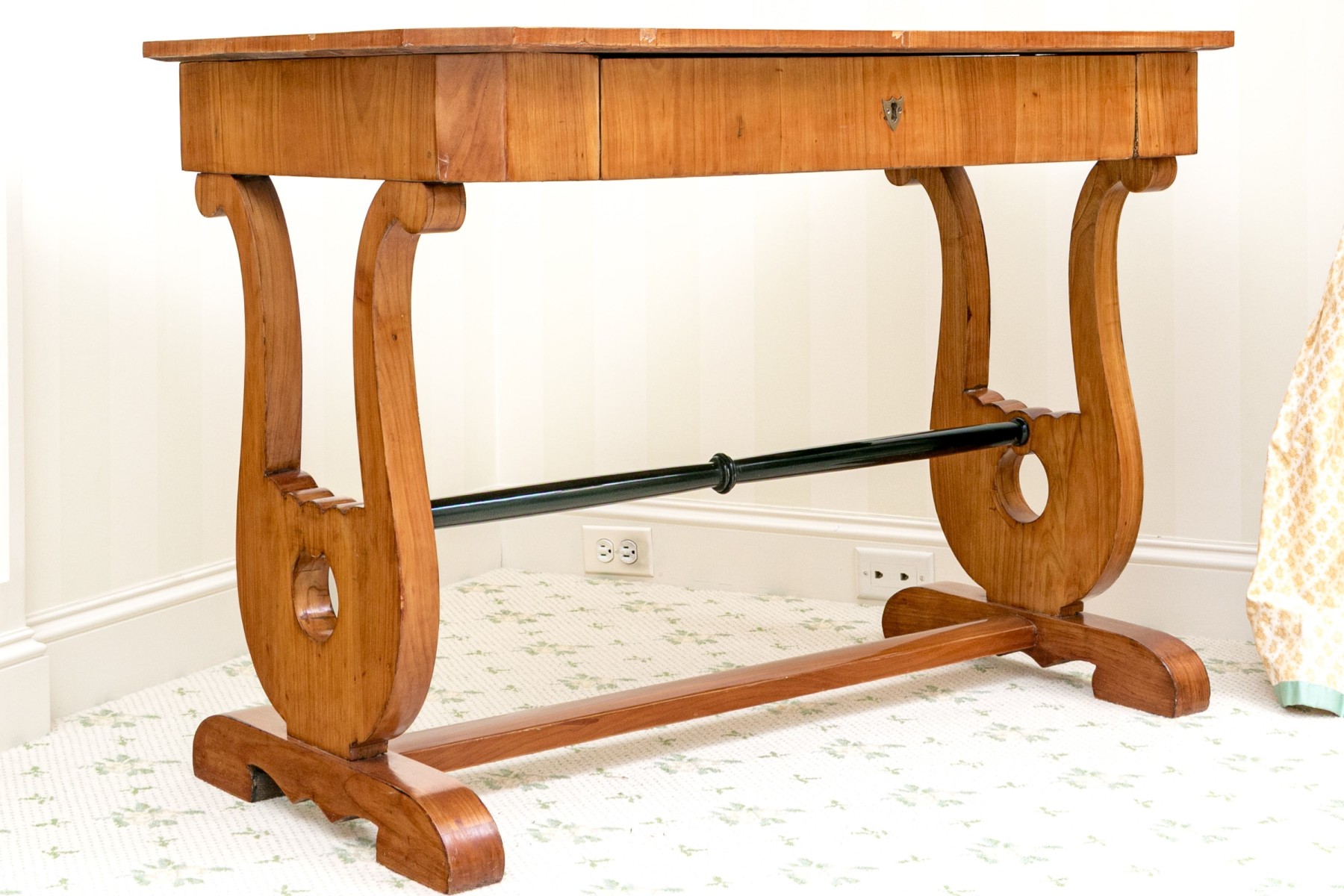 A wonderful antique Biedermeier writing table veneered in beautiful orange-brown wood, showcasing a cut-corner rectangular top with a banded edge overhanging a single drawer with a brass shield key escutcheon. Raised on lyre form trestle legs with an ebonized upper stretcher providing a pop of contrast and a lower stretcher for additional support.