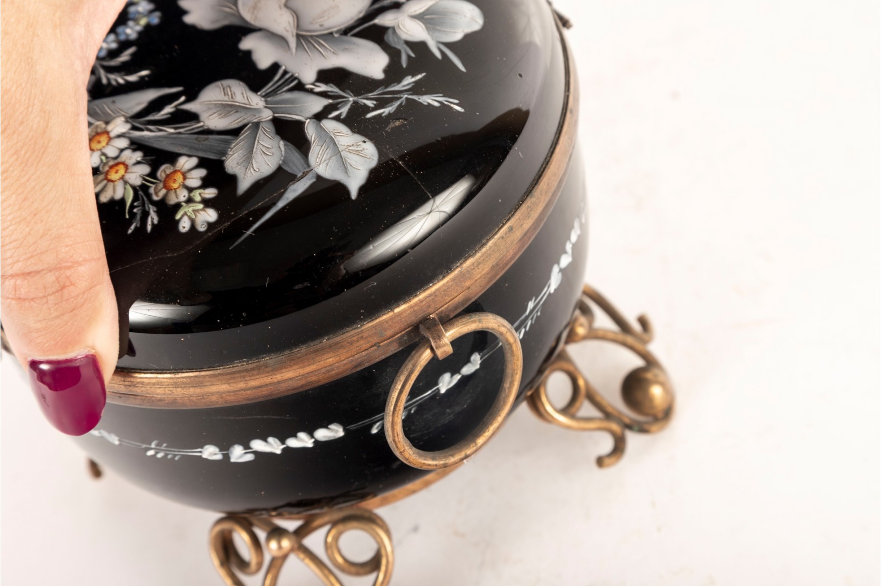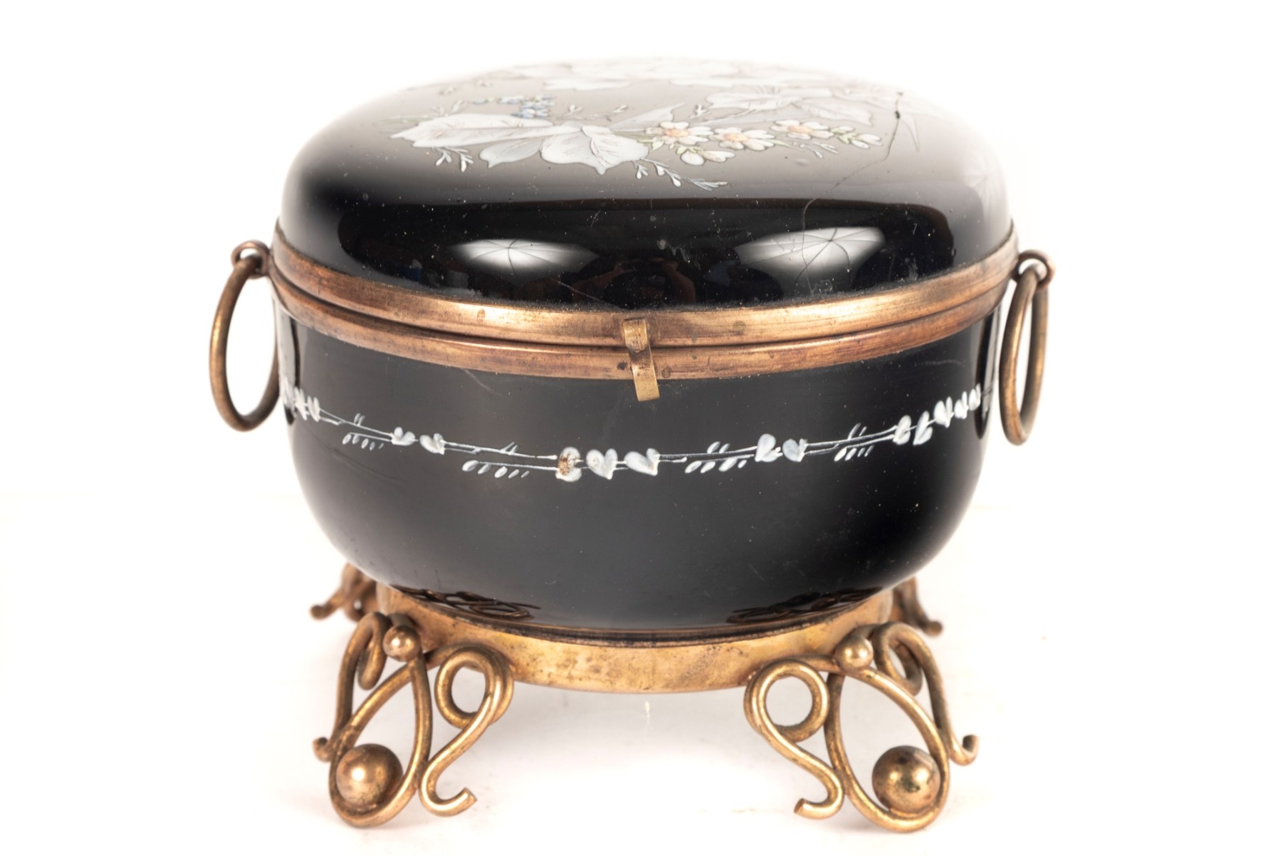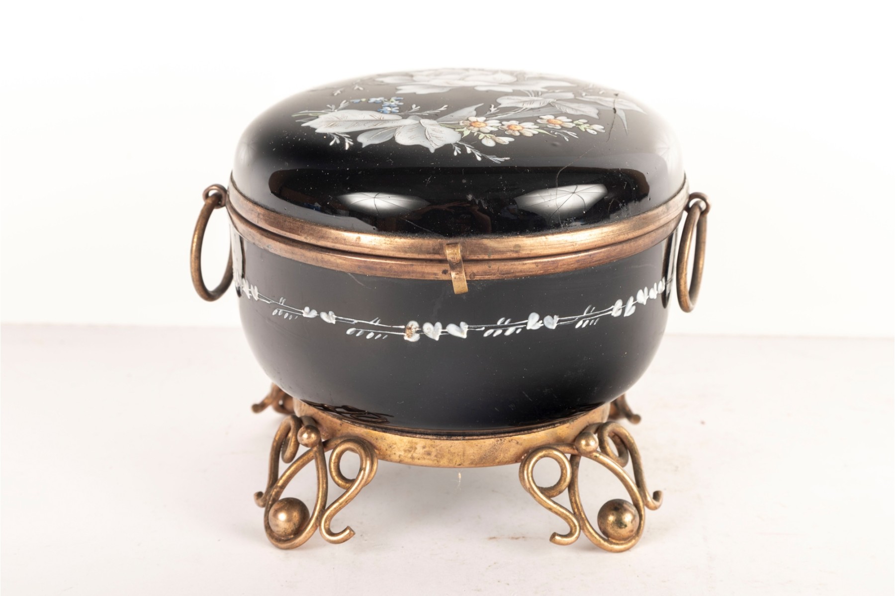 Charming antique enameled glass casket box in a deep black finish, delicately hand-painted with floral motifs on the lid and garland-style decoration around the sides.