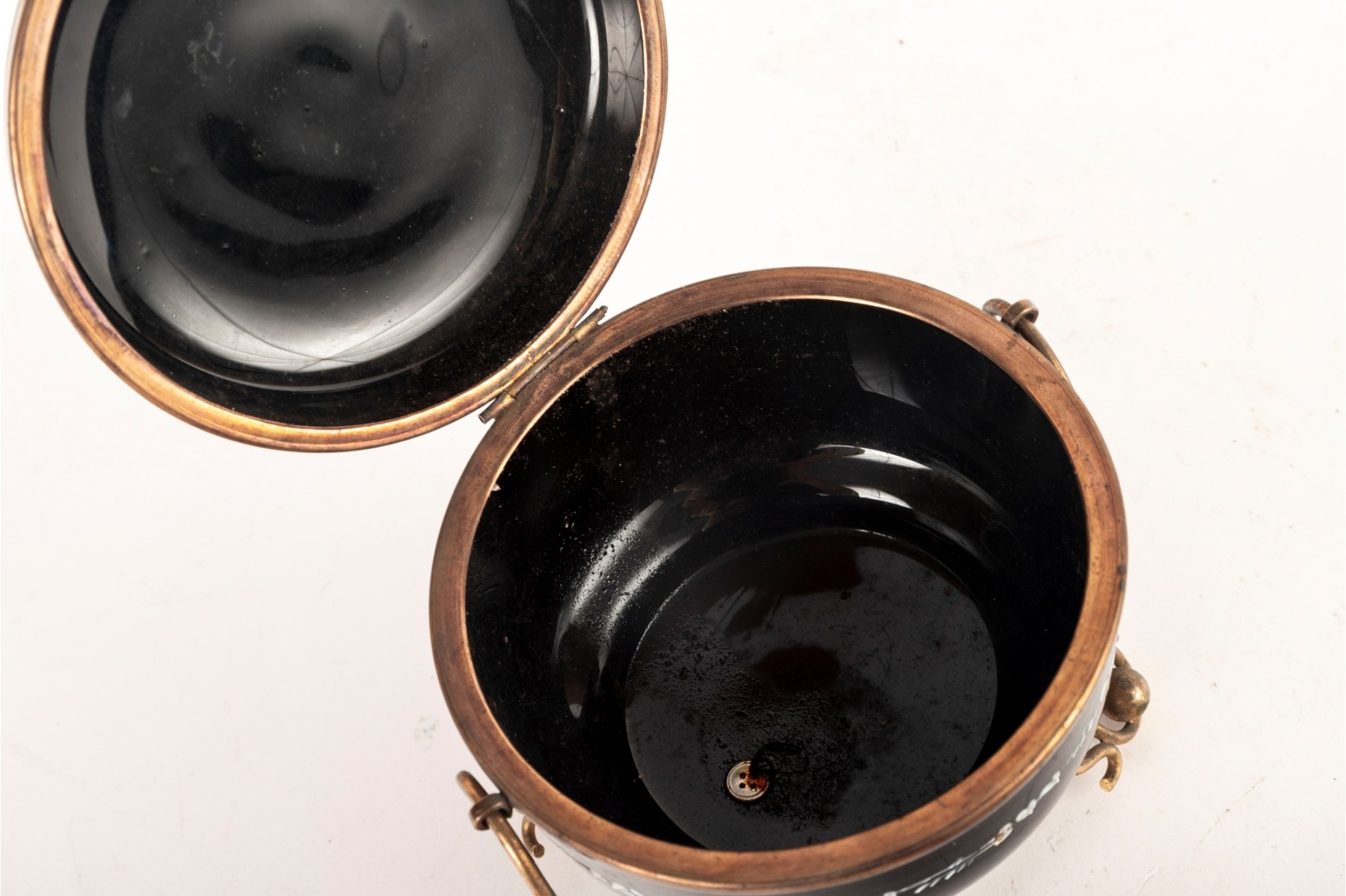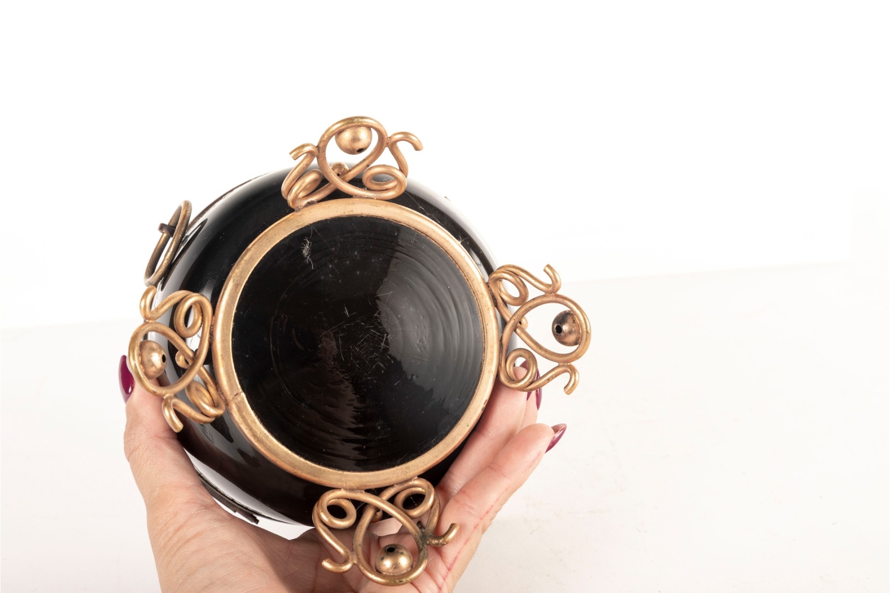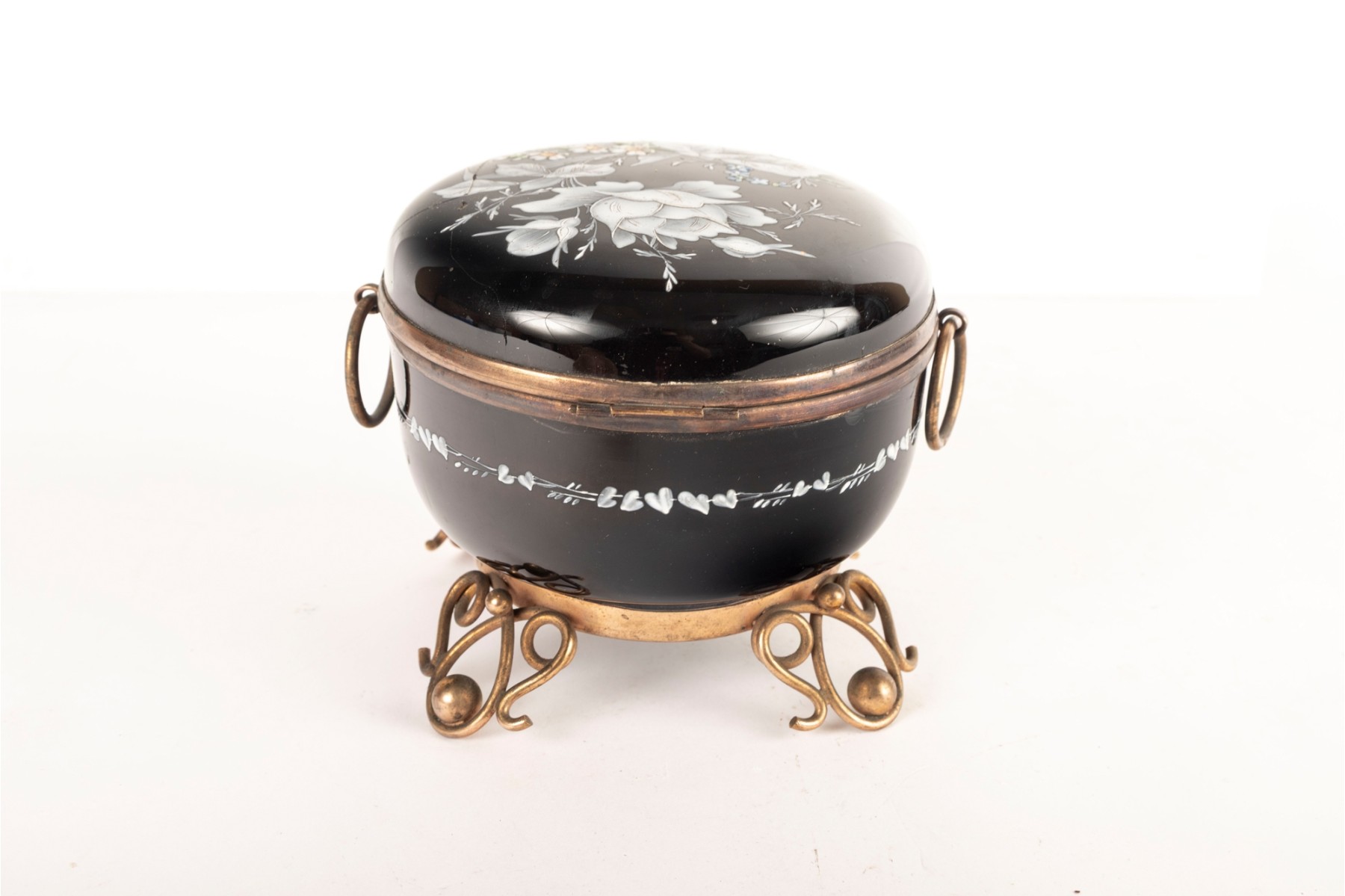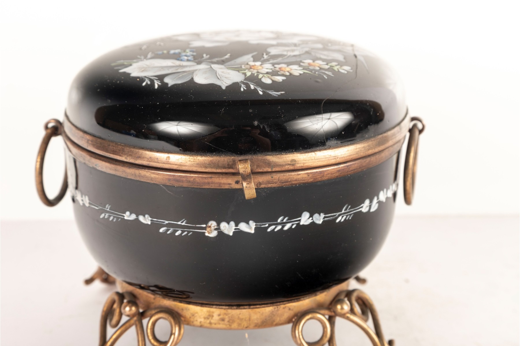 Charming antique enameled glass casket box in a deep black finish, delicately hand-painted with floral motifs on the lid and garland-style decoration around the sides.