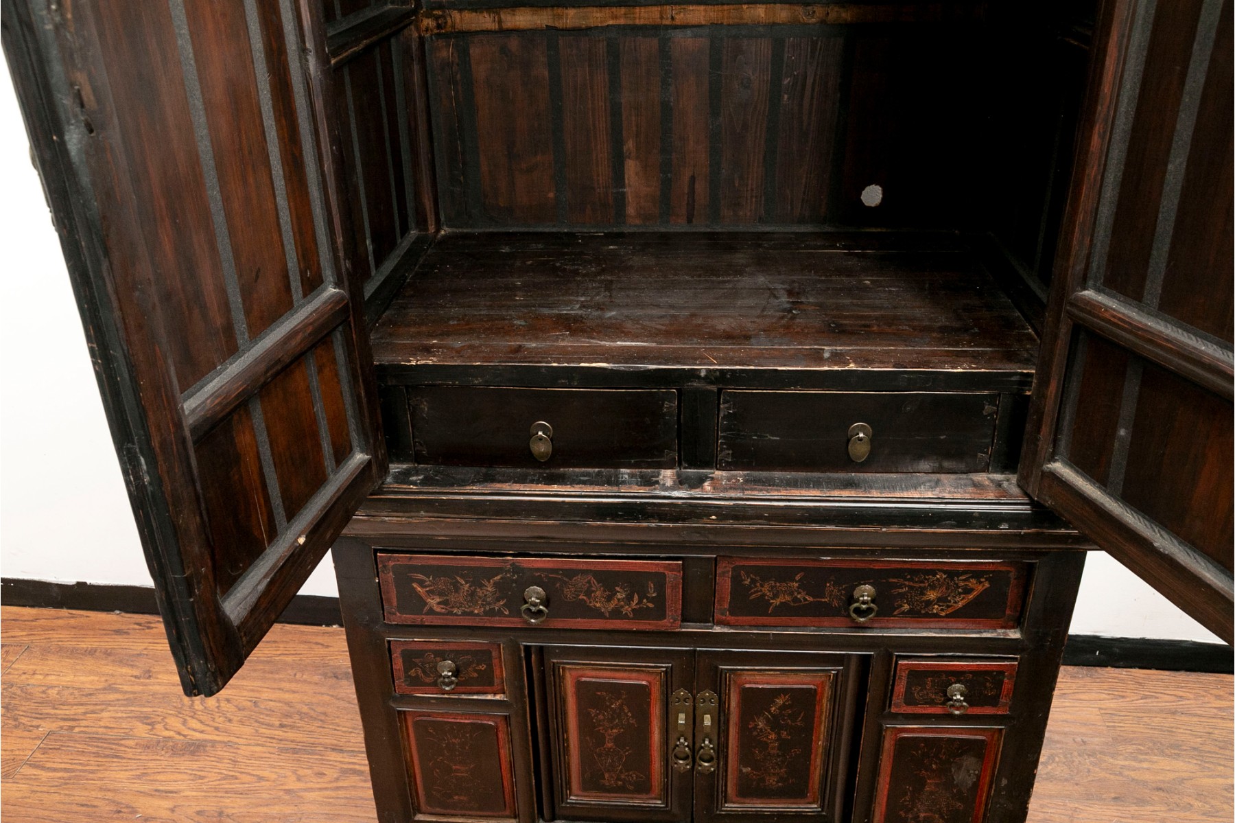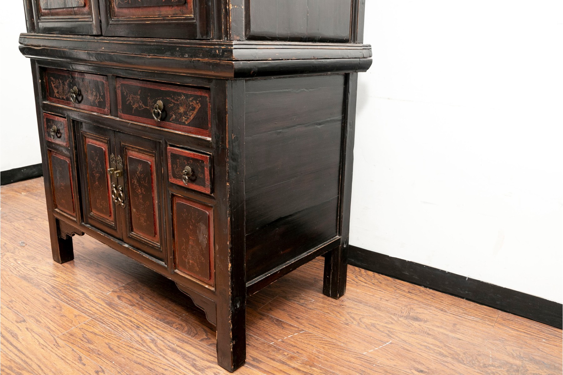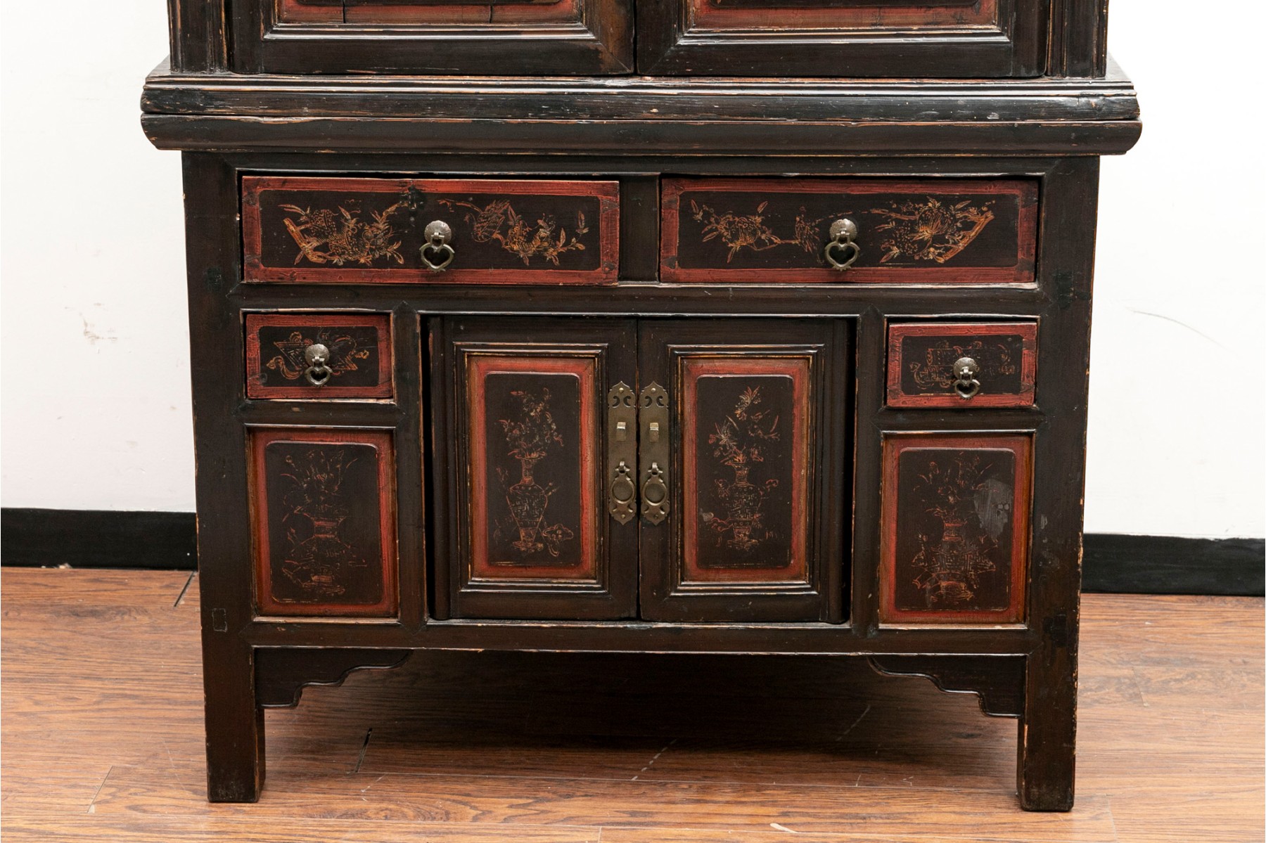 A fantastic antique Chinese marriage cabinet lacquered black and ornately carved and illuminated in oxblood red and gilt. The two-piece unit features a double-door cabinet on the upper half, carved with scenes of flowers, phoenixes, and figures enjoying outdoor balconies around trees and fences. The cabinet opens to a top shelf over a generous open storage area with a hole in the backboard providing potential use as a media cabinet, finishing with two drawers. The lower half displays two drawers over a double-door cabinet flanked by small drawers on the sides, with beautiful paneling depicting birds, vases, and foliage.