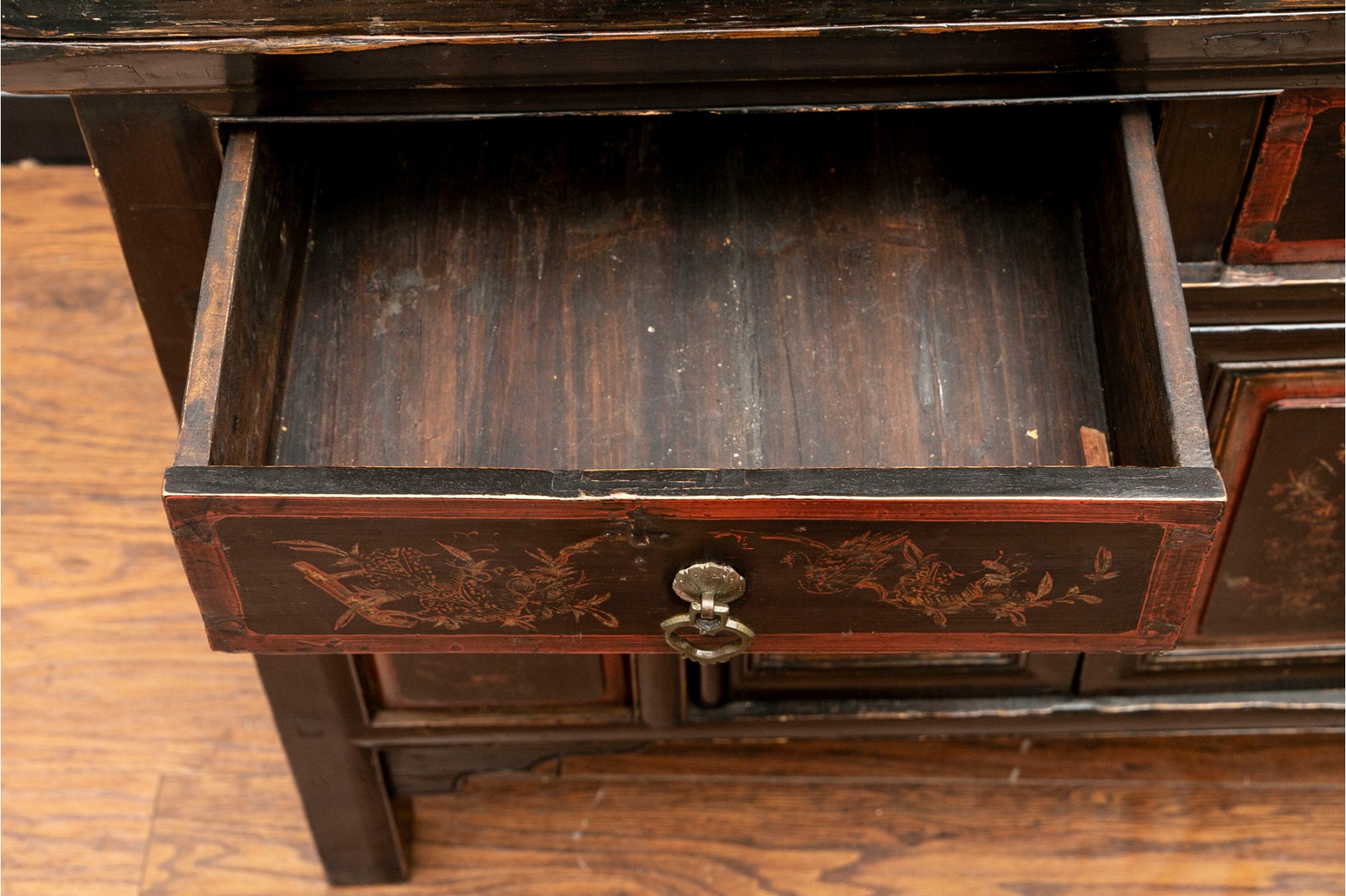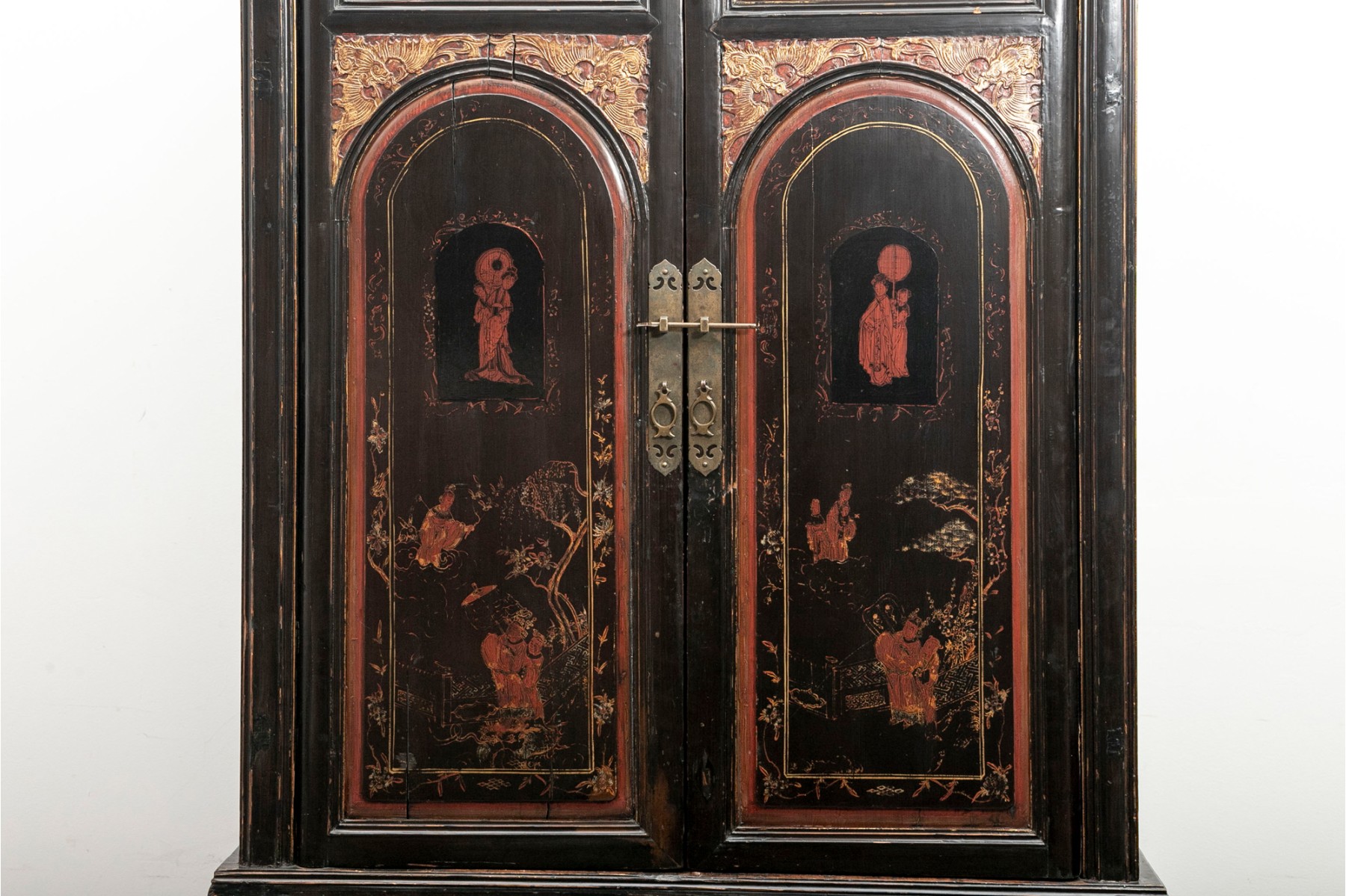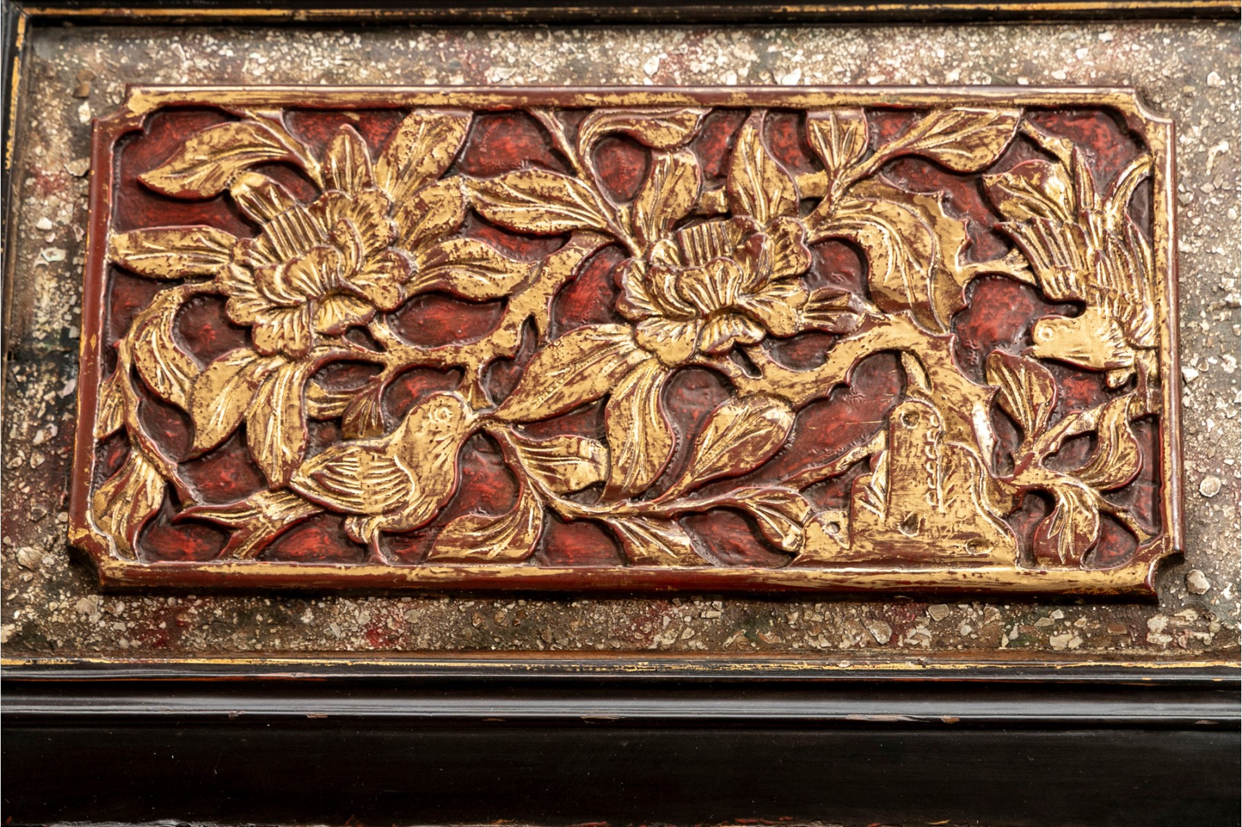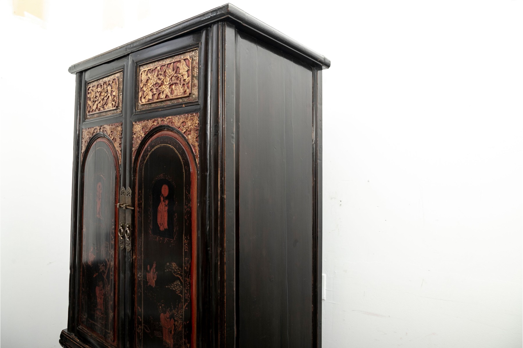A fantastic antique Chinese marriage cabinet lacquered black and ornately carved and illuminated in oxblood red and gilt. The two-piece unit features a double-door cabinet on the upper half, carved with scenes of flowers, phoenixes, and figures enjoying outdoor balconies around trees and fences. The cabinet opens to a top shelf over a generous open storage area with a hole in the backboard providing potential use as a media cabinet, finishing with two drawers. The lower half displays two drawers over a double-door cabinet flanked by small drawers on the sides, with beautiful paneling depicting birds, vases, and foliage.