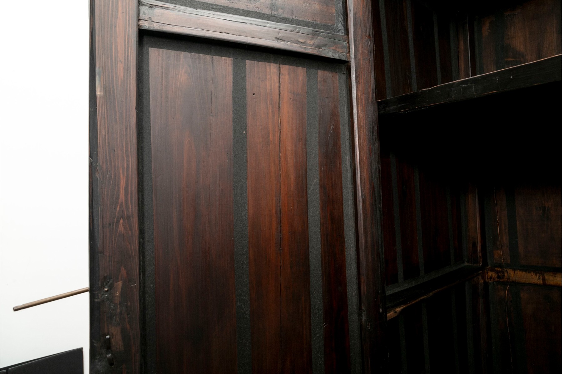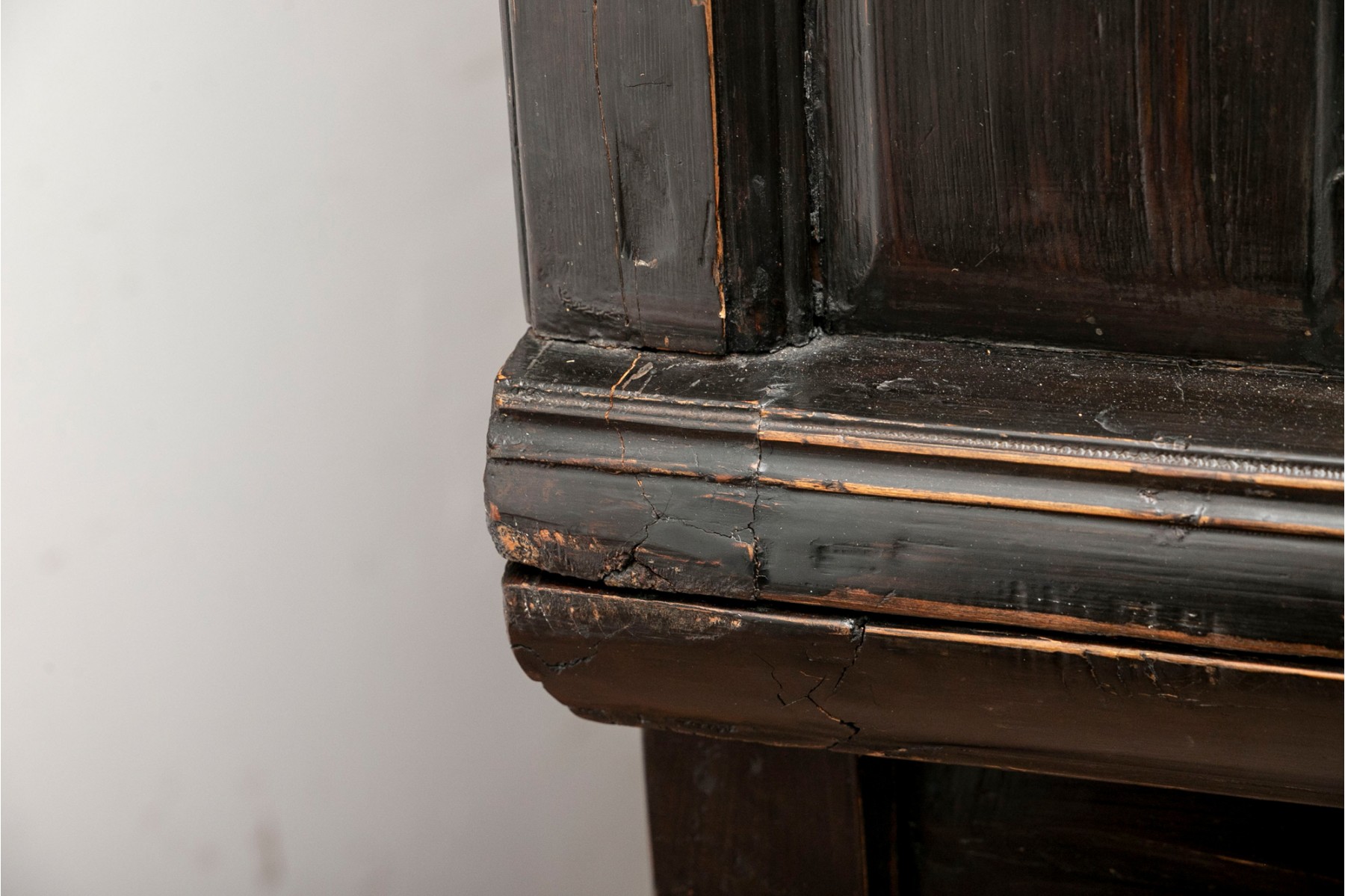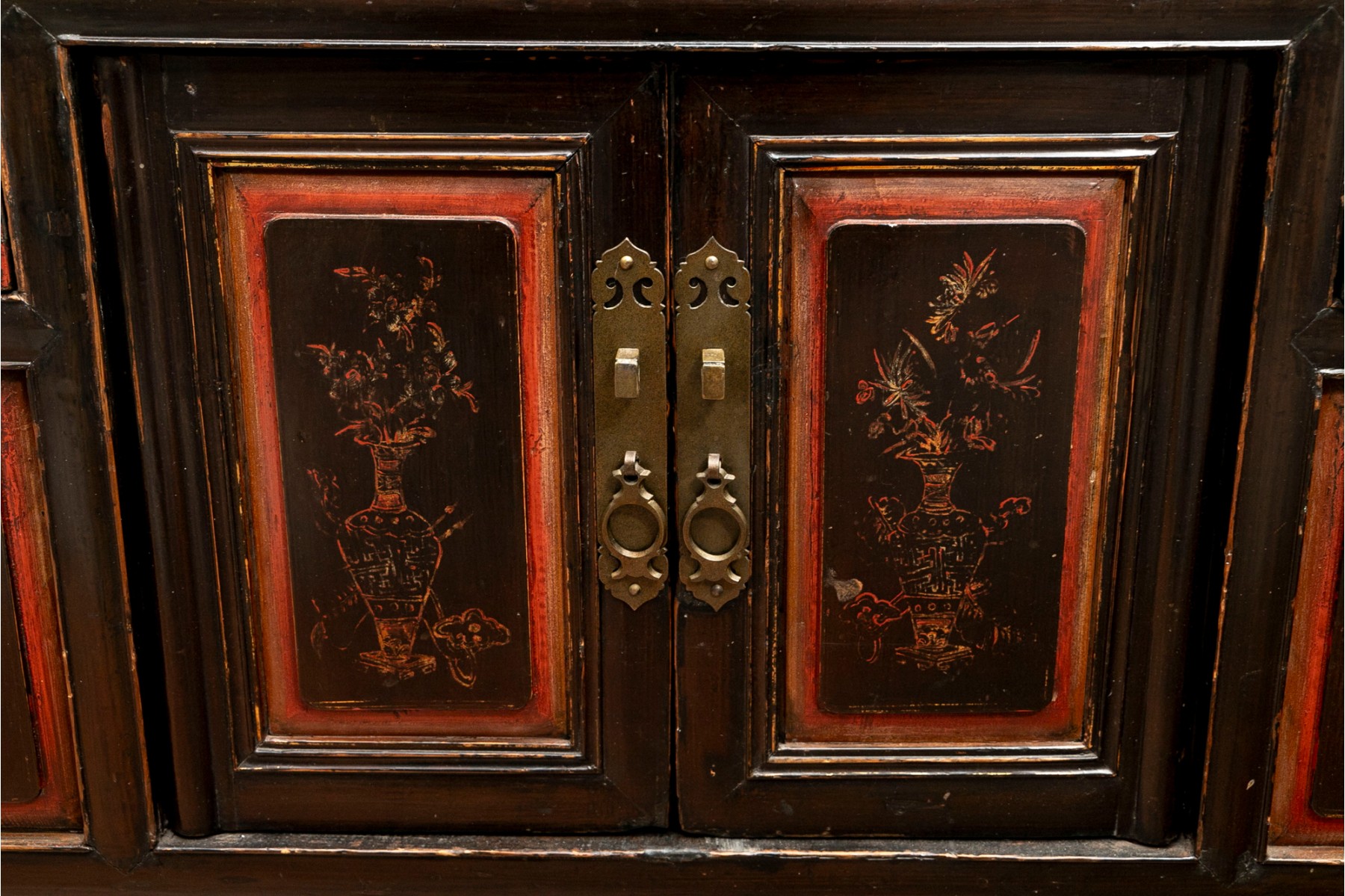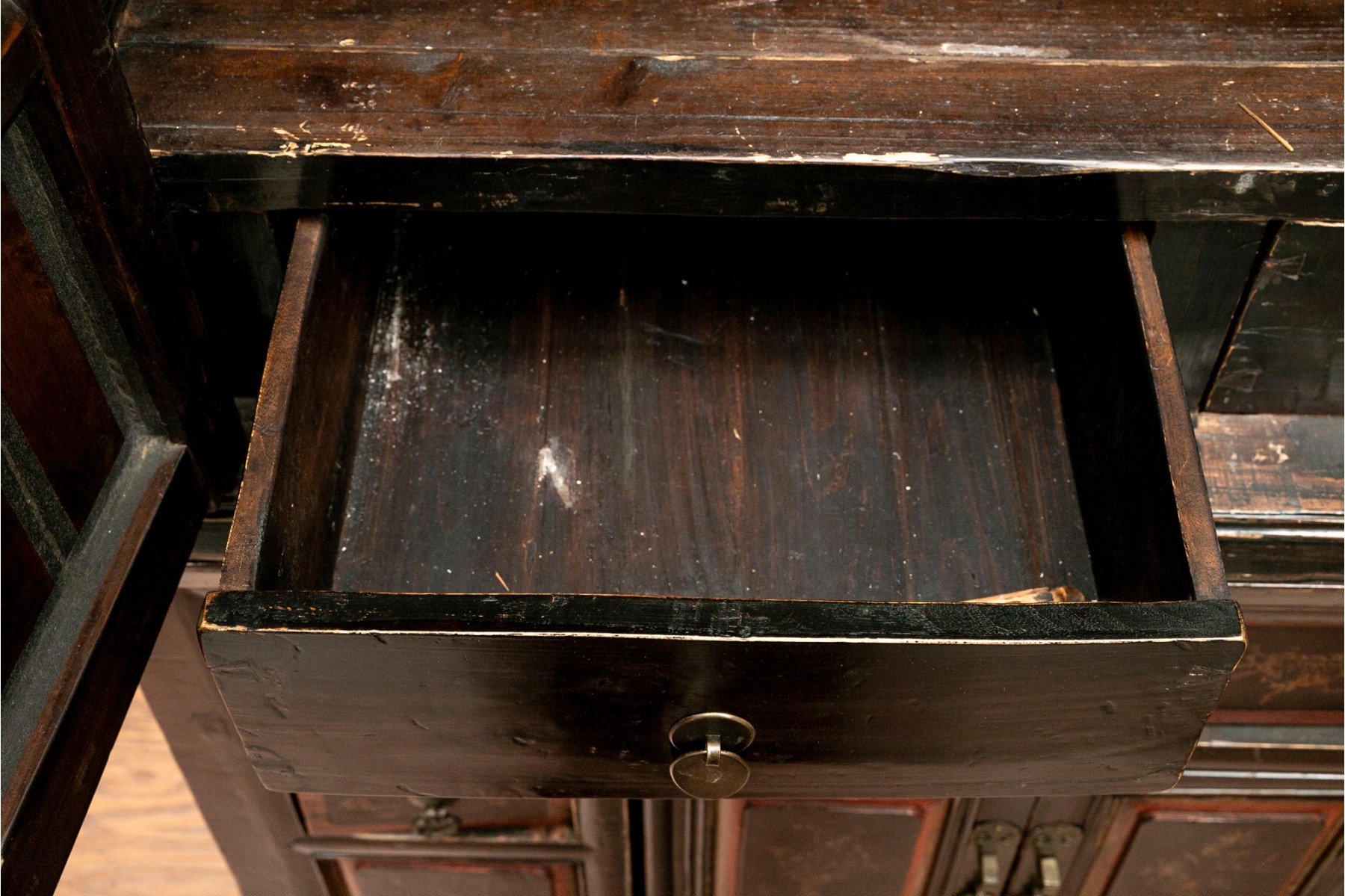 Displays well with wear commensurate with age and use including surface scratches, scuffs, nicks, finish wear, some surface irregularities to the lacquering. The backboard has some vertical checking that does not significantly detract from appearance. The upper cabinet doors also have some checking. The lower cabinet doors do not have a peg for keeping the doors shut; they stay shut well on their own, however. Please review the pictures as they are a part of the condition report.