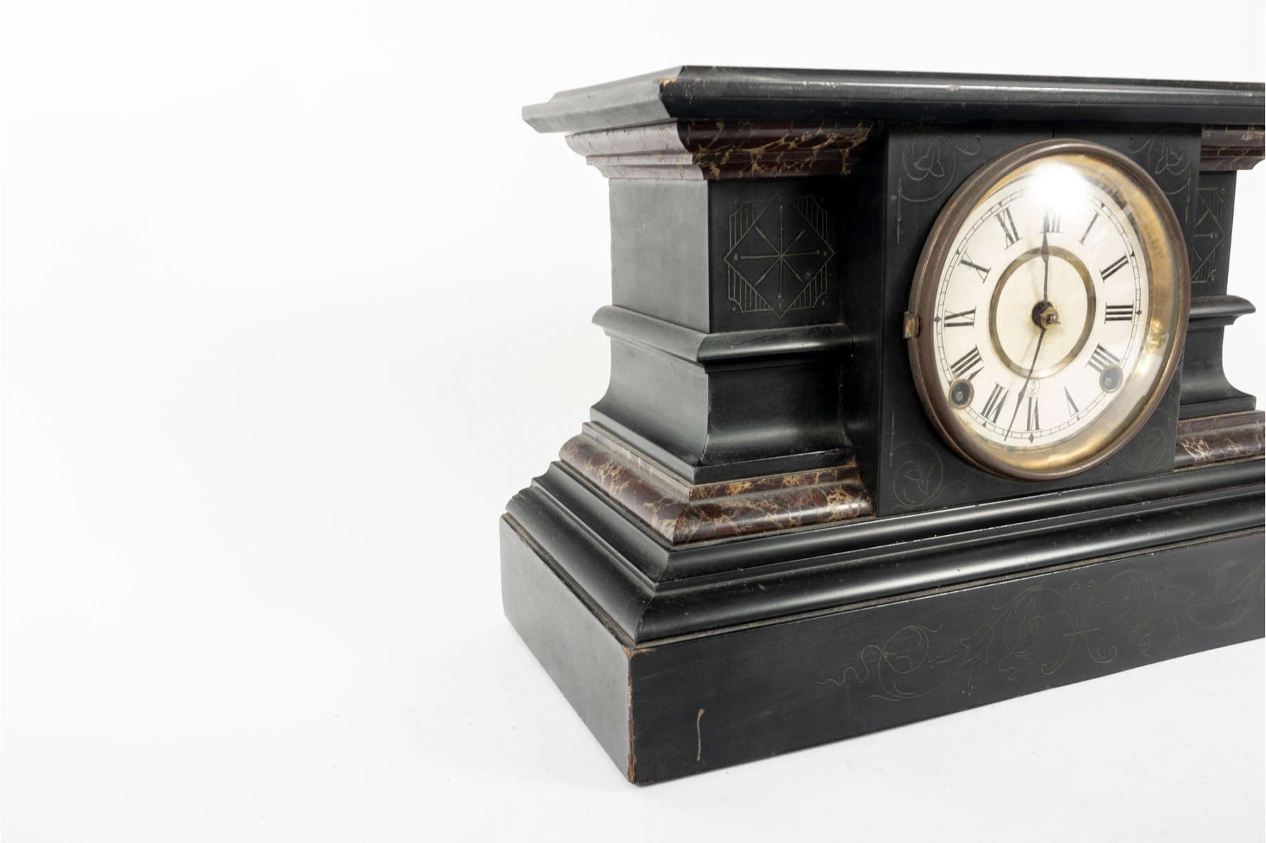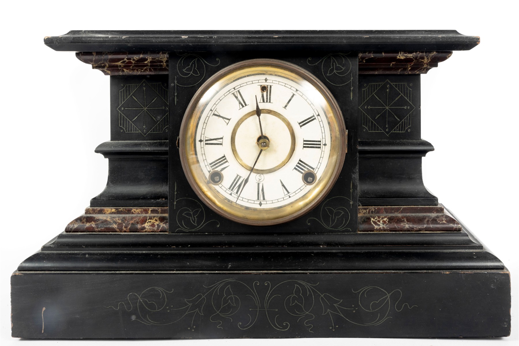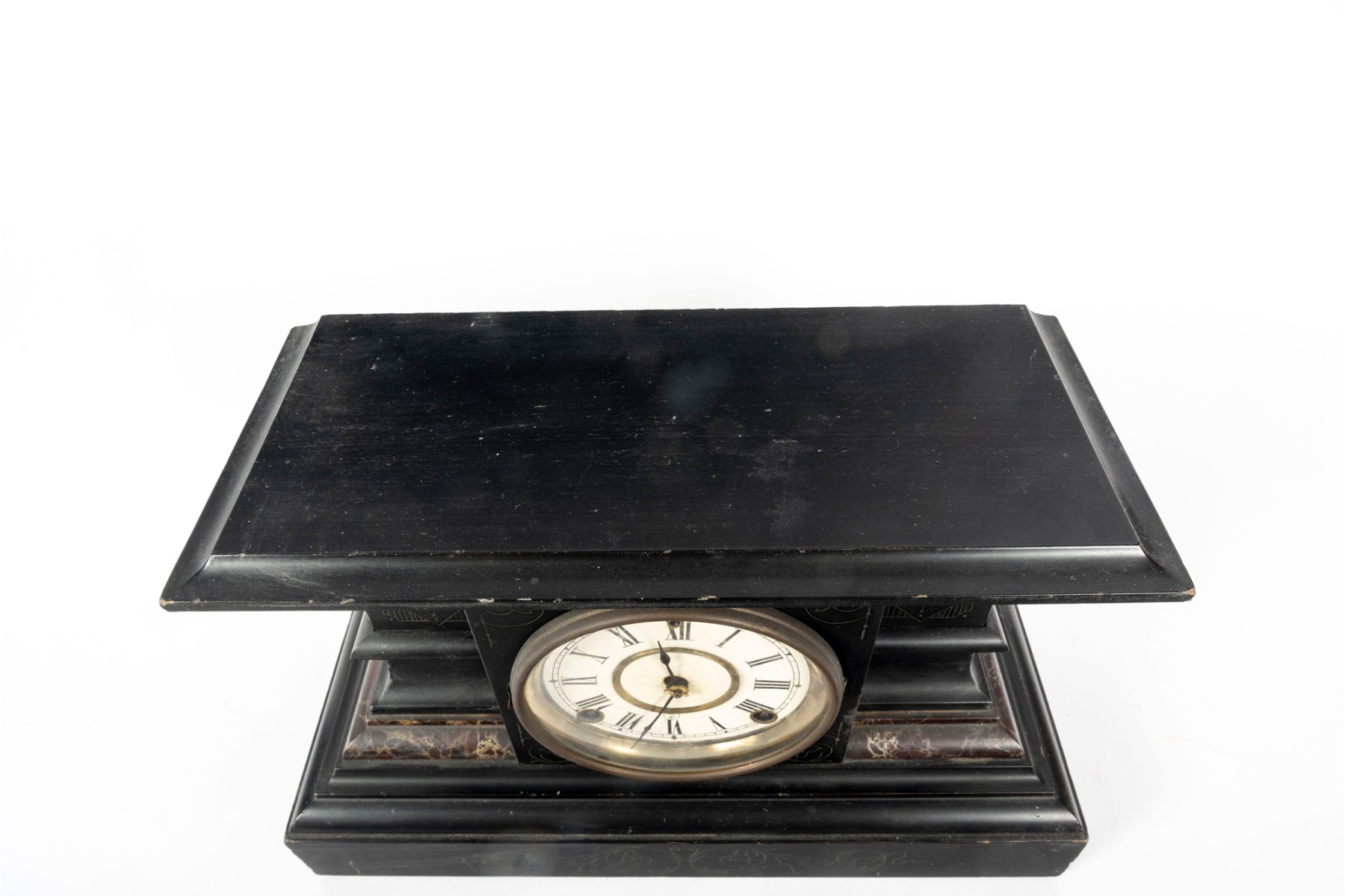 A wooden mantel clock in the style of E. Ingraham. Features a black finish with faux marble trim and chamfered edges. Item is non-functional. No key included.
