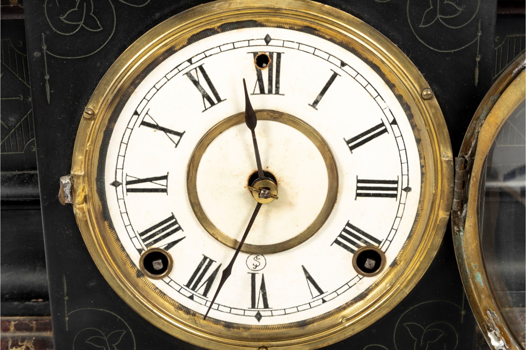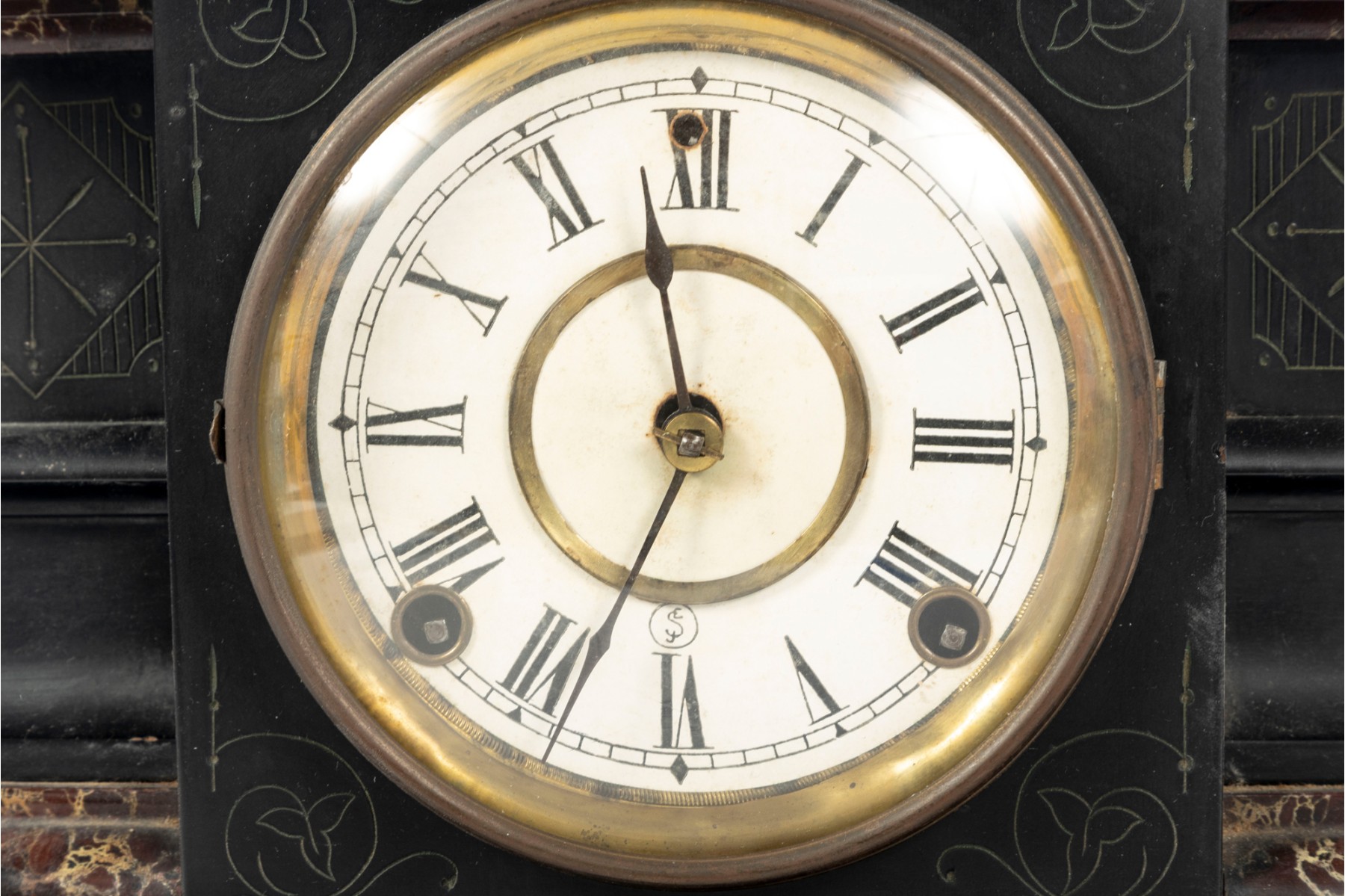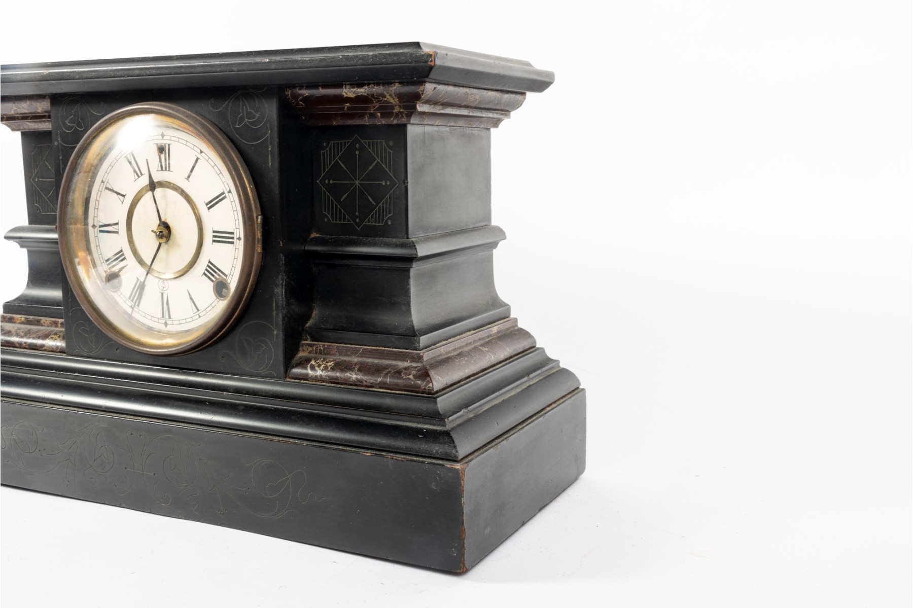 A wooden mantel clock in the style of E. Ingraham. Features a black finish with faux marble trim and chamfered edges. Item is non-functional. No key included.