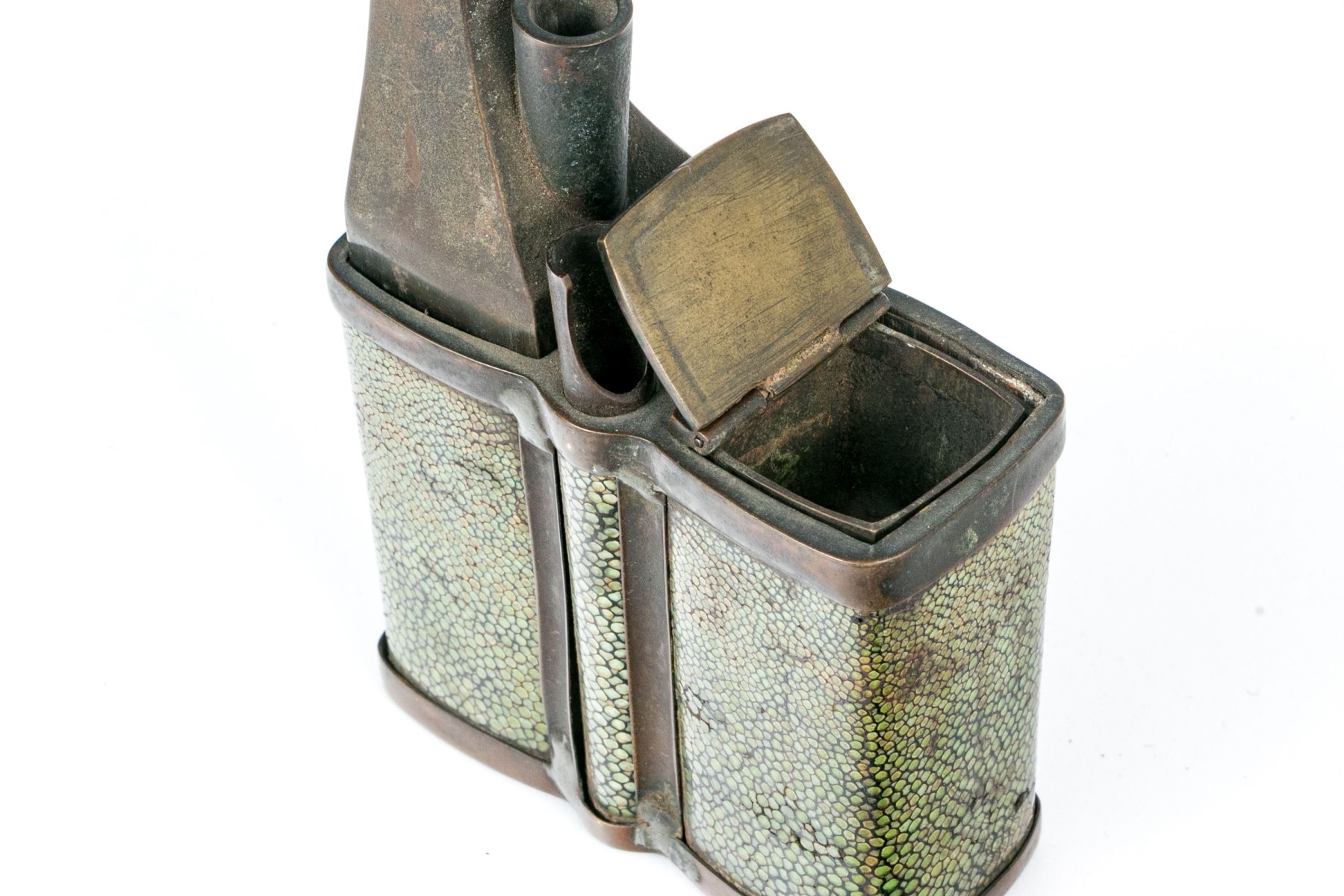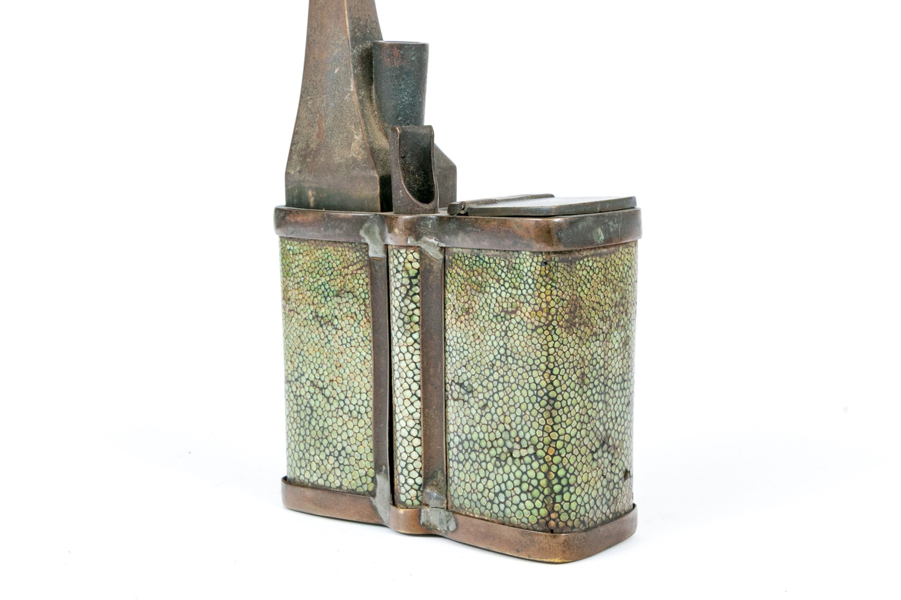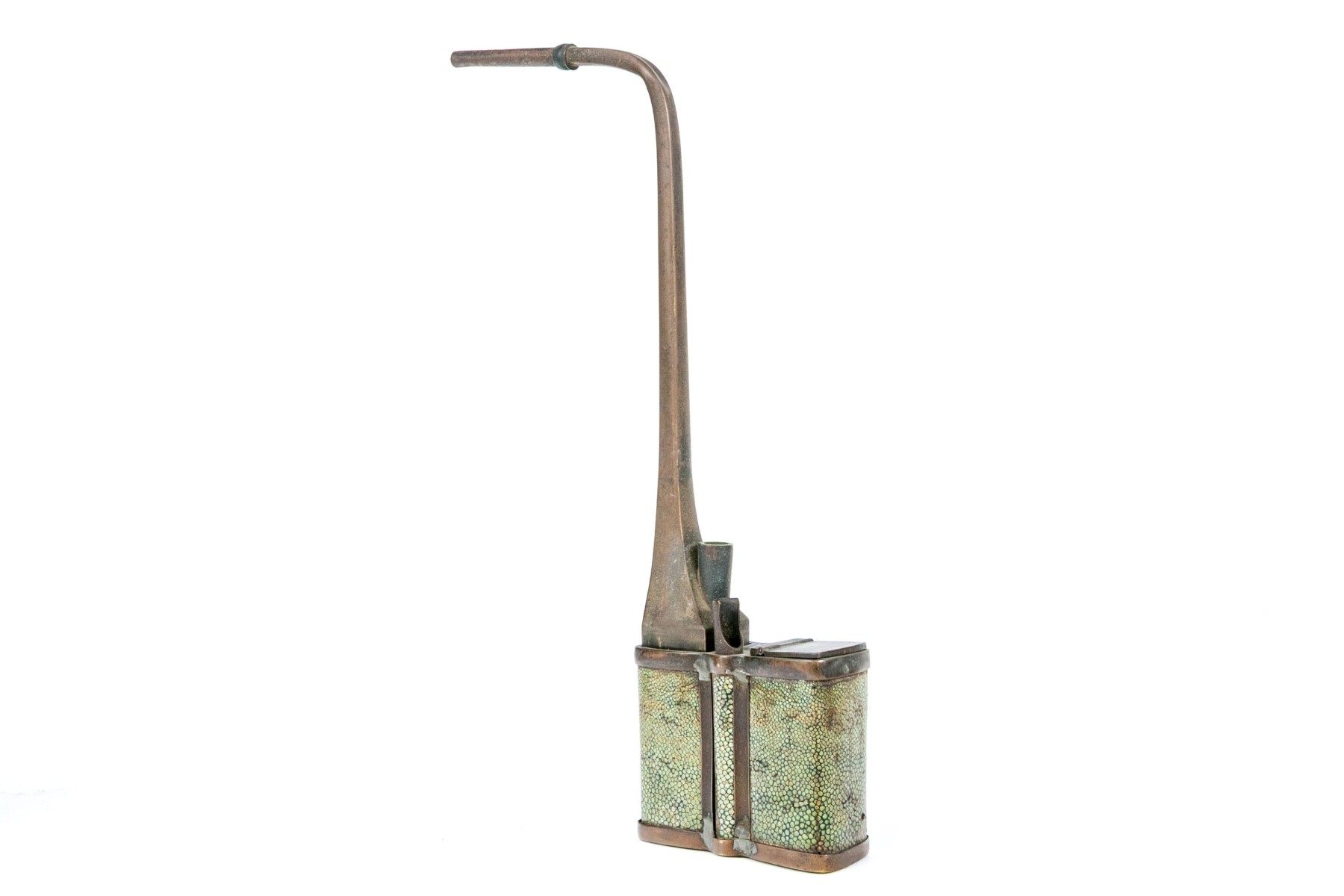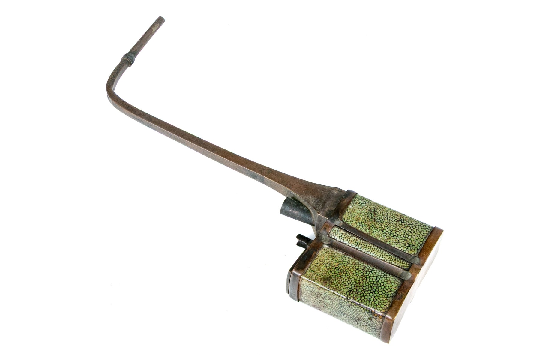 An antique brass opium pipe detailed with a hinged lid and long spout. The body is wrapped in beautiful green shagreen.