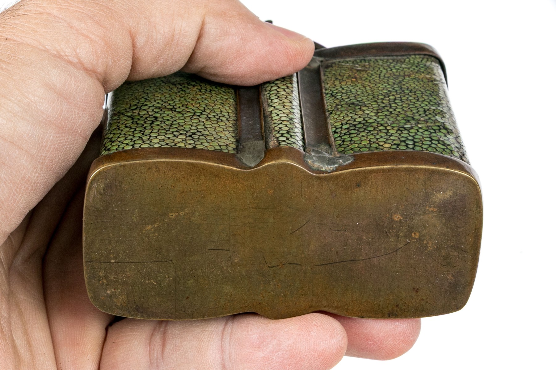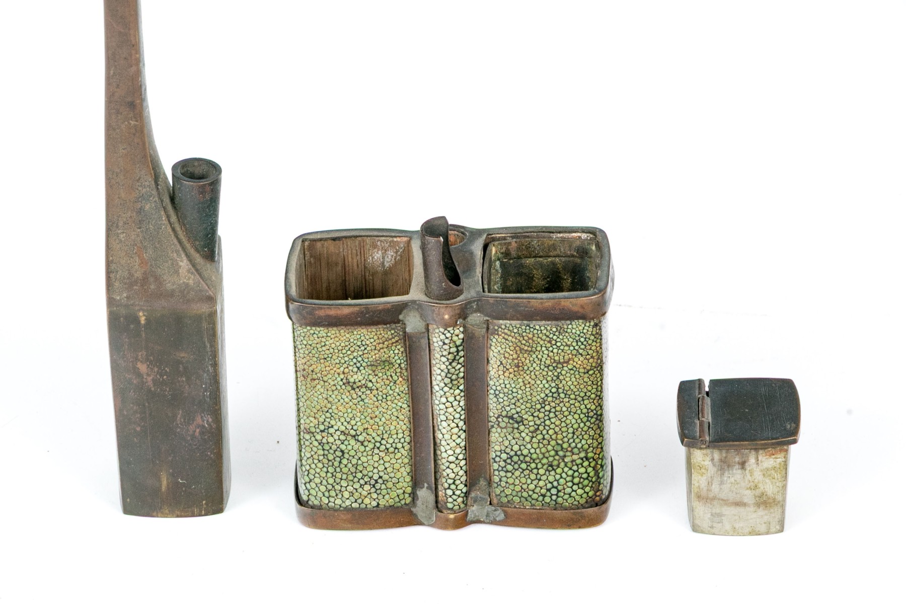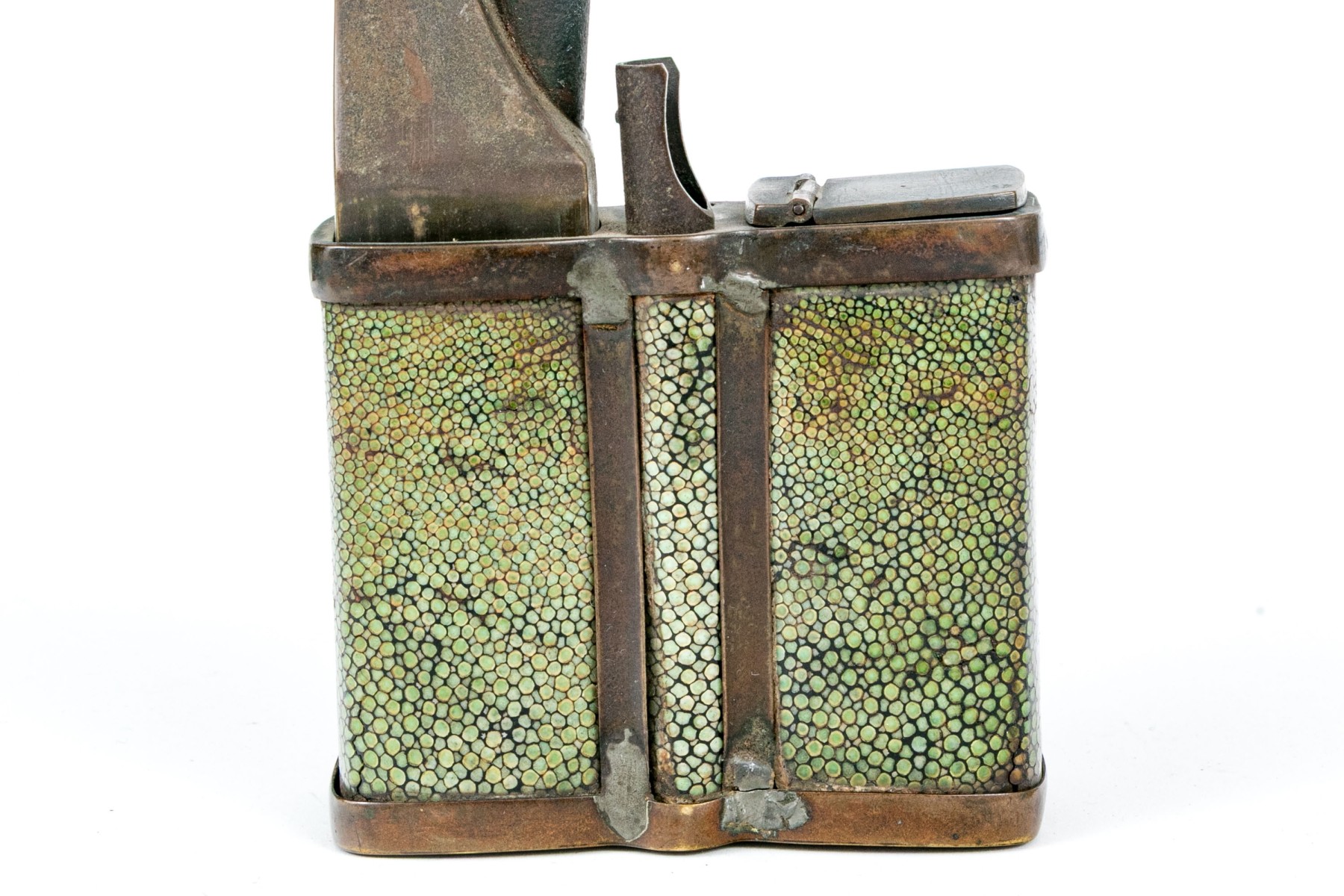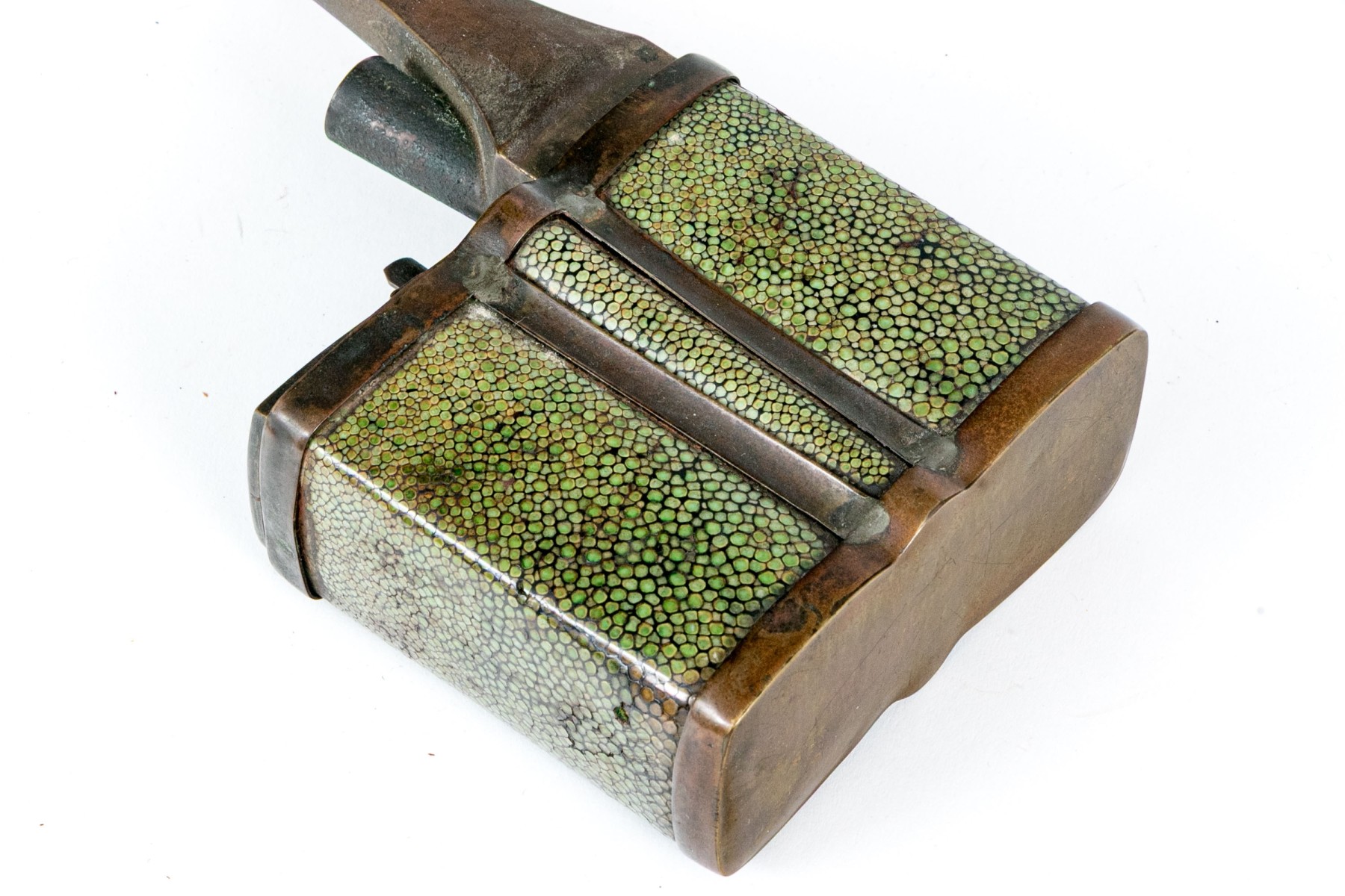 An antique brass opium pipe detailed with a hinged lid and long spout. The body is wrapped in beautiful green shagreen.