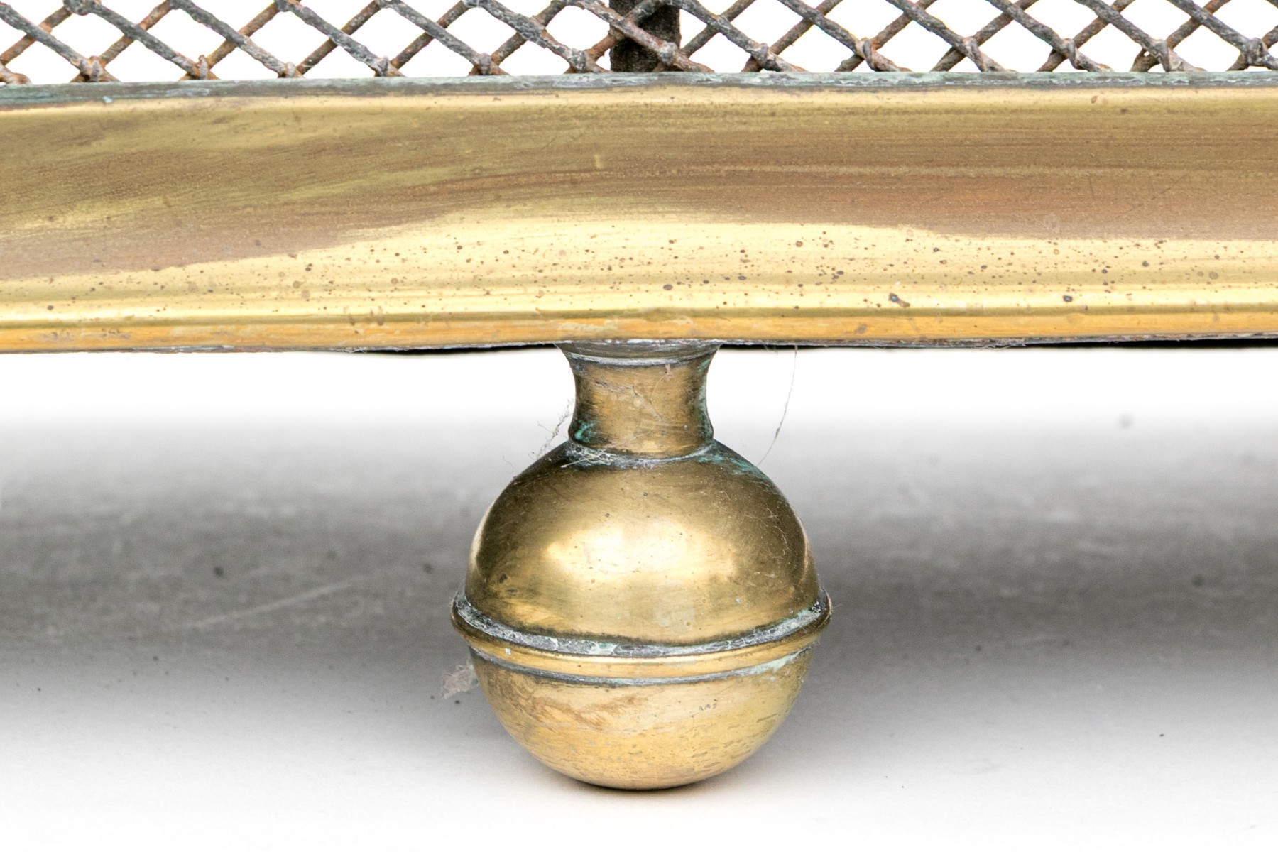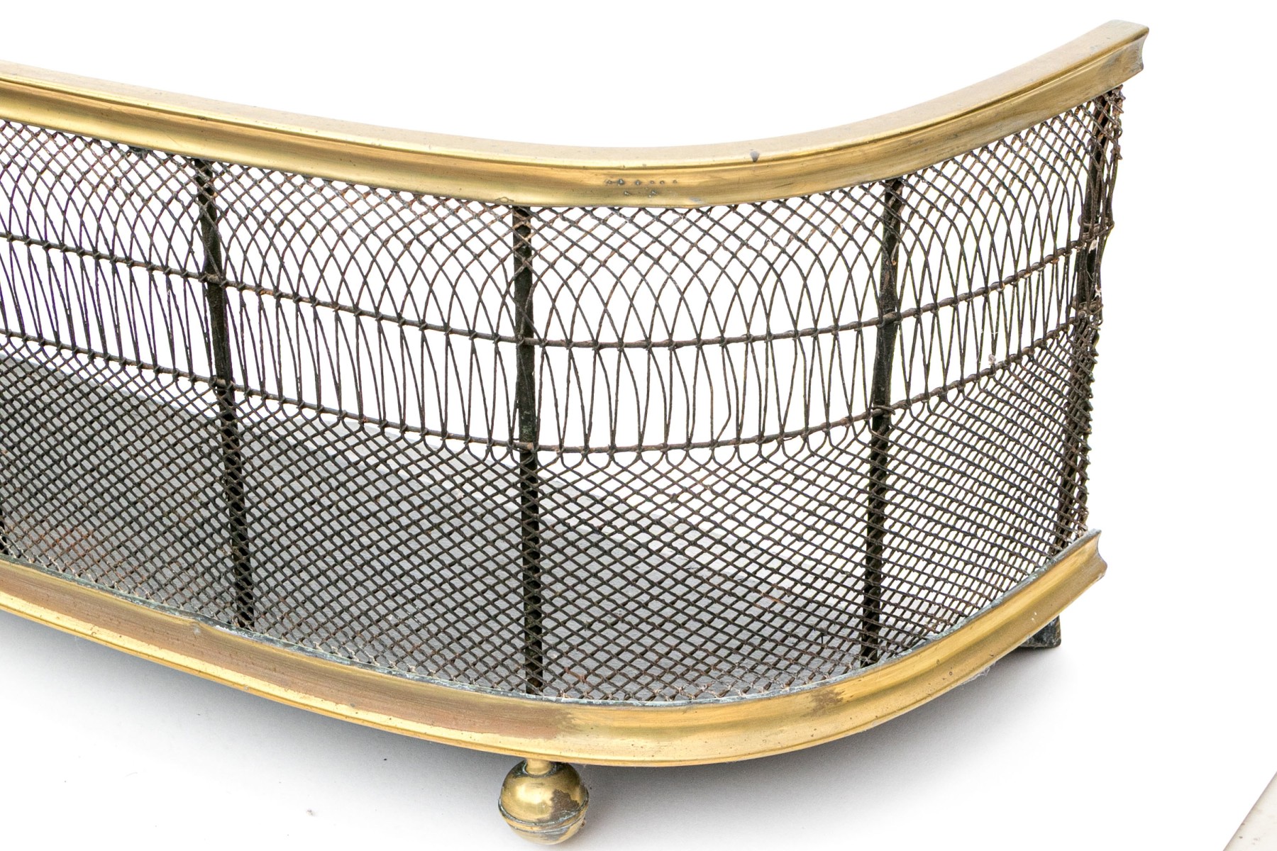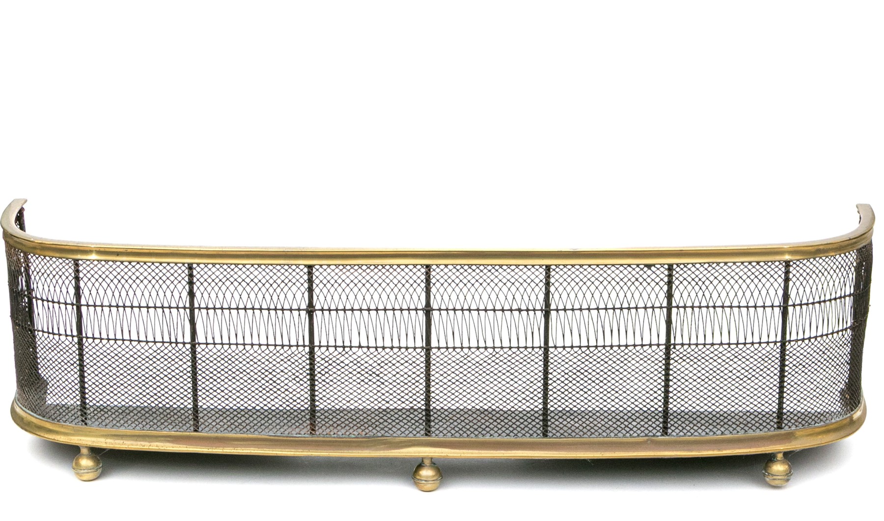 A wonderful antique brass fireplace fender with a sleek, rounded design showcasing a fine metal mesh with a decorative elongated pattern around an upper band. Raised on five stately sphere feet.