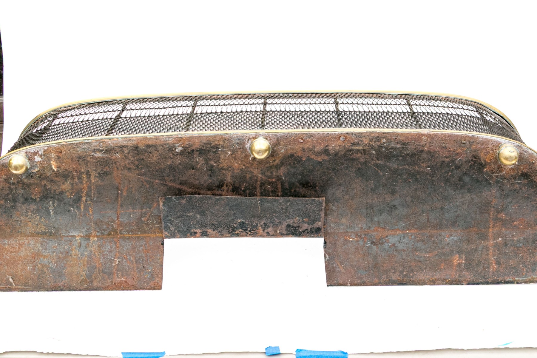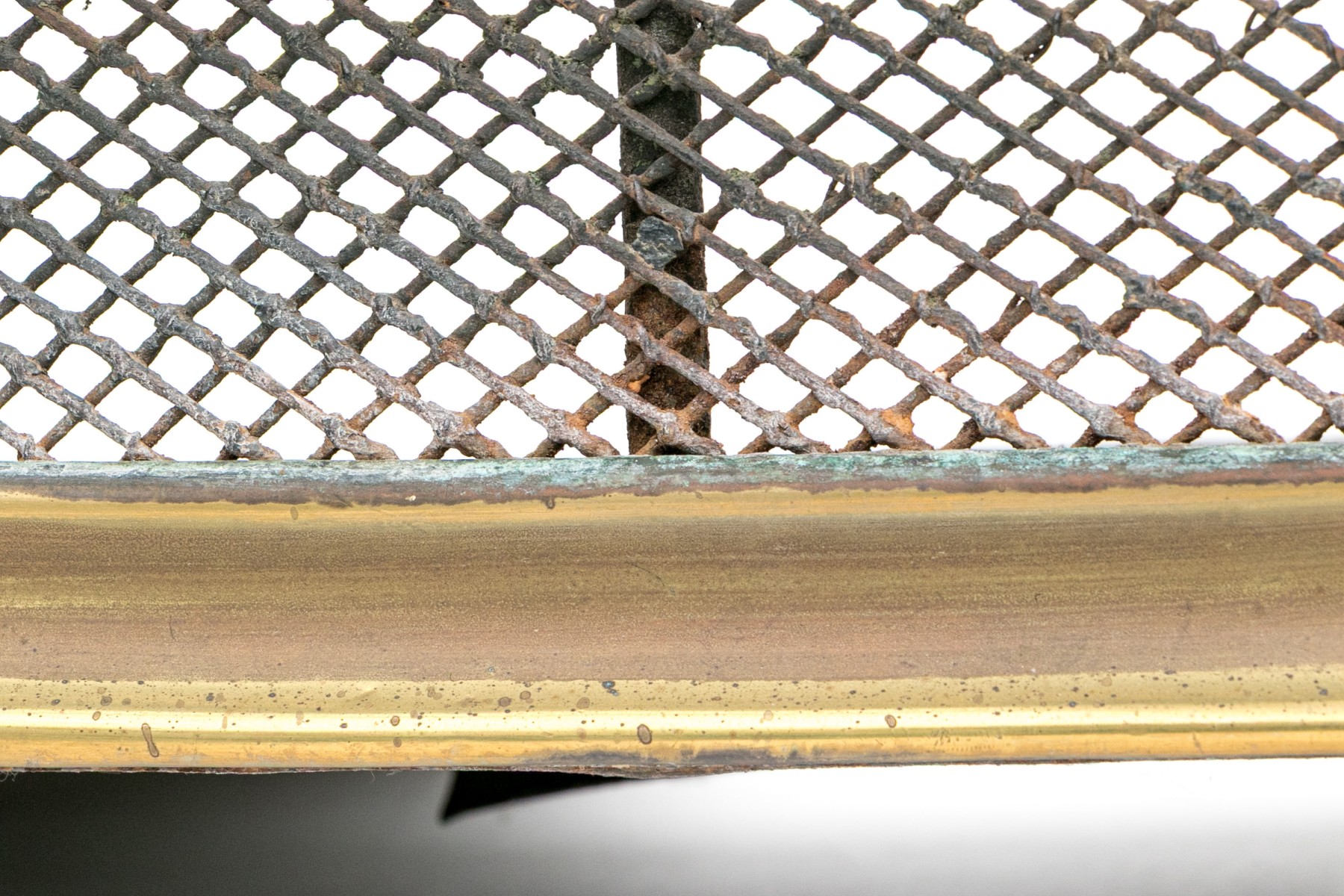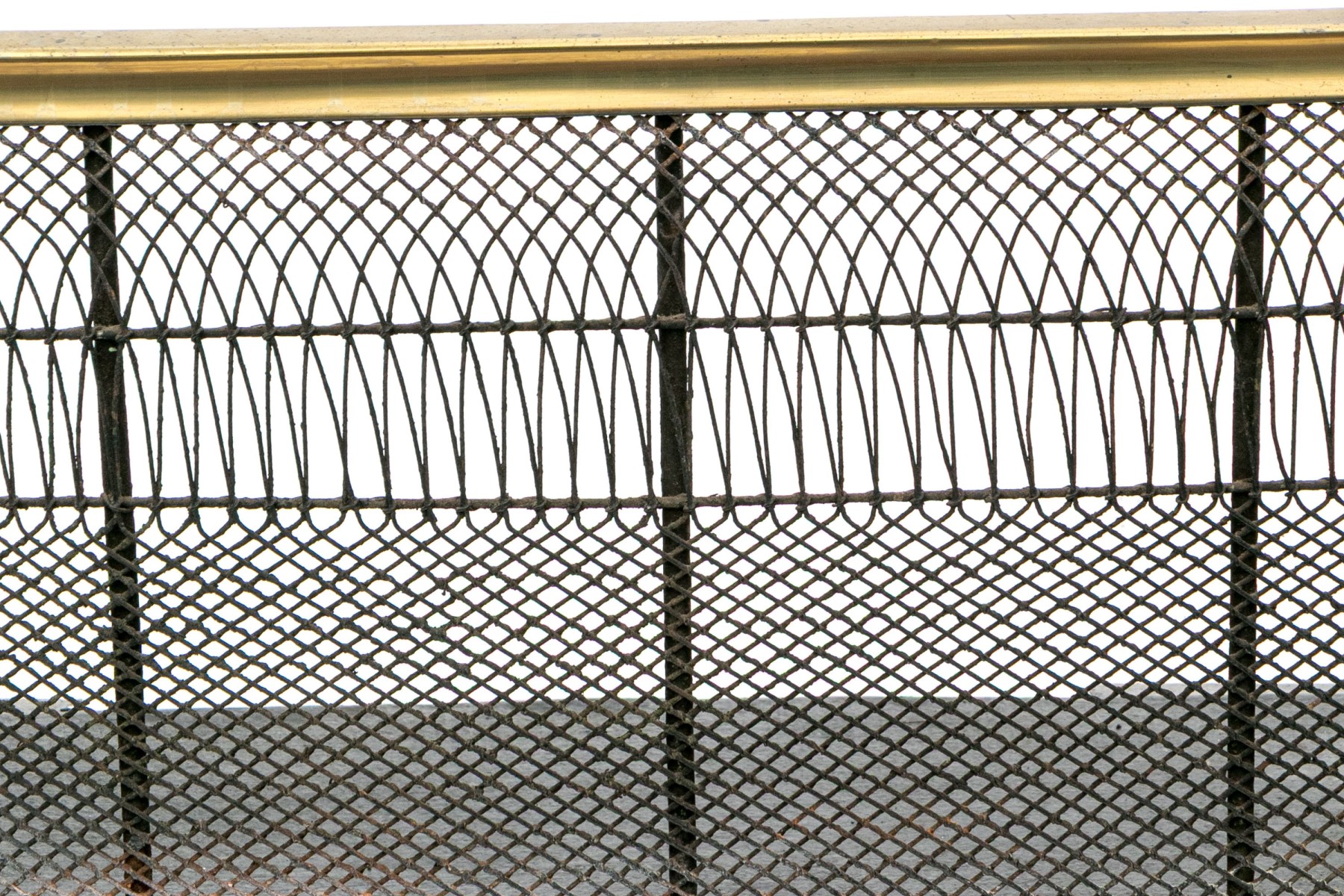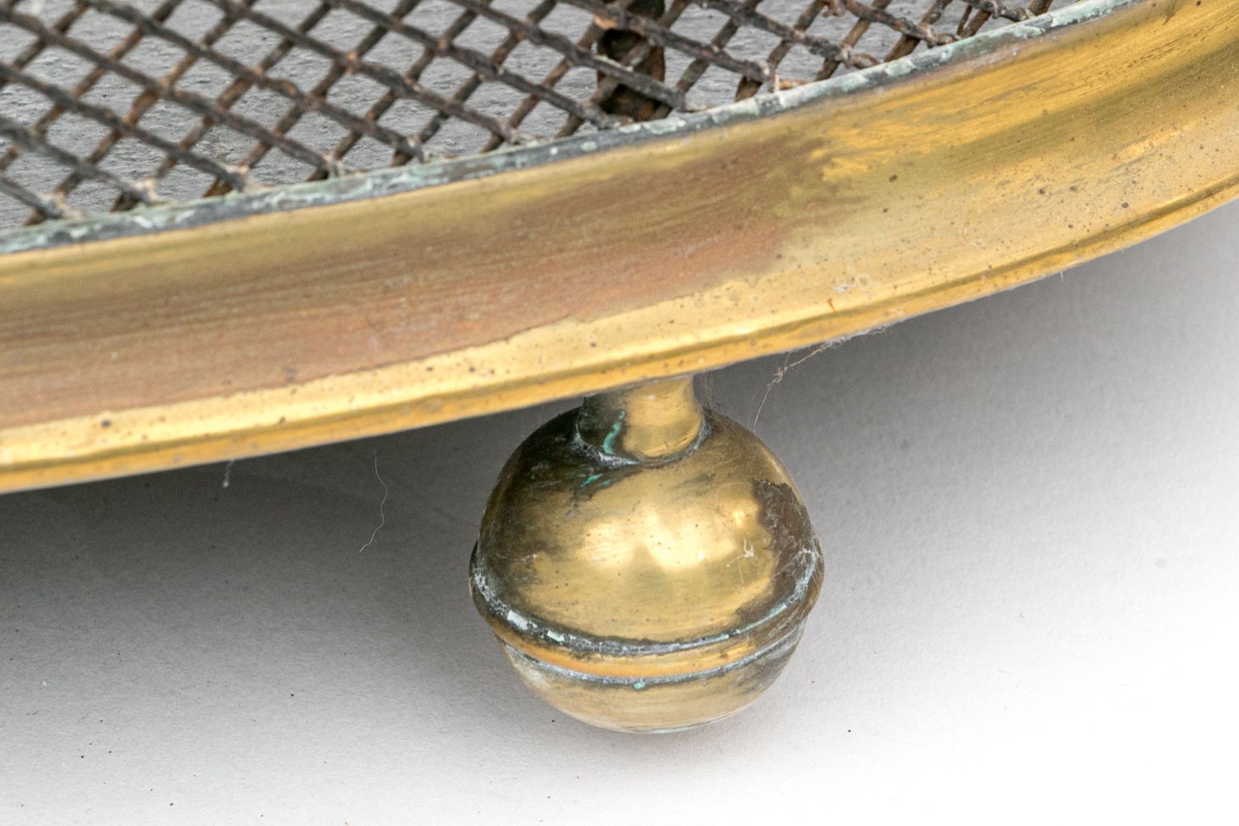 A wonderful antique brass fireplace fender with a sleek, rounded design showcasing a fine metal mesh with a decorative elongated pattern around an upper band. Raised on five stately sphere feet.