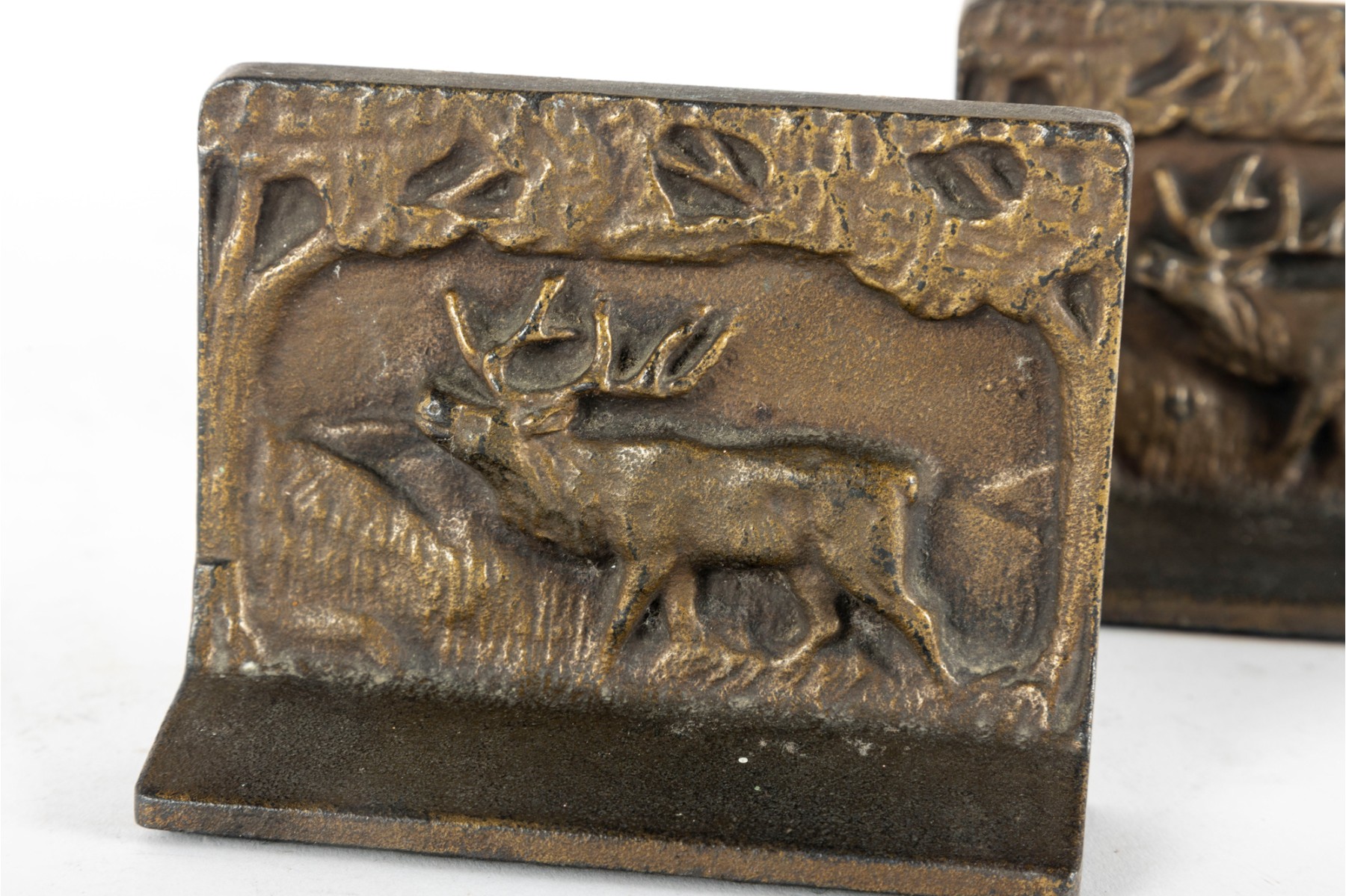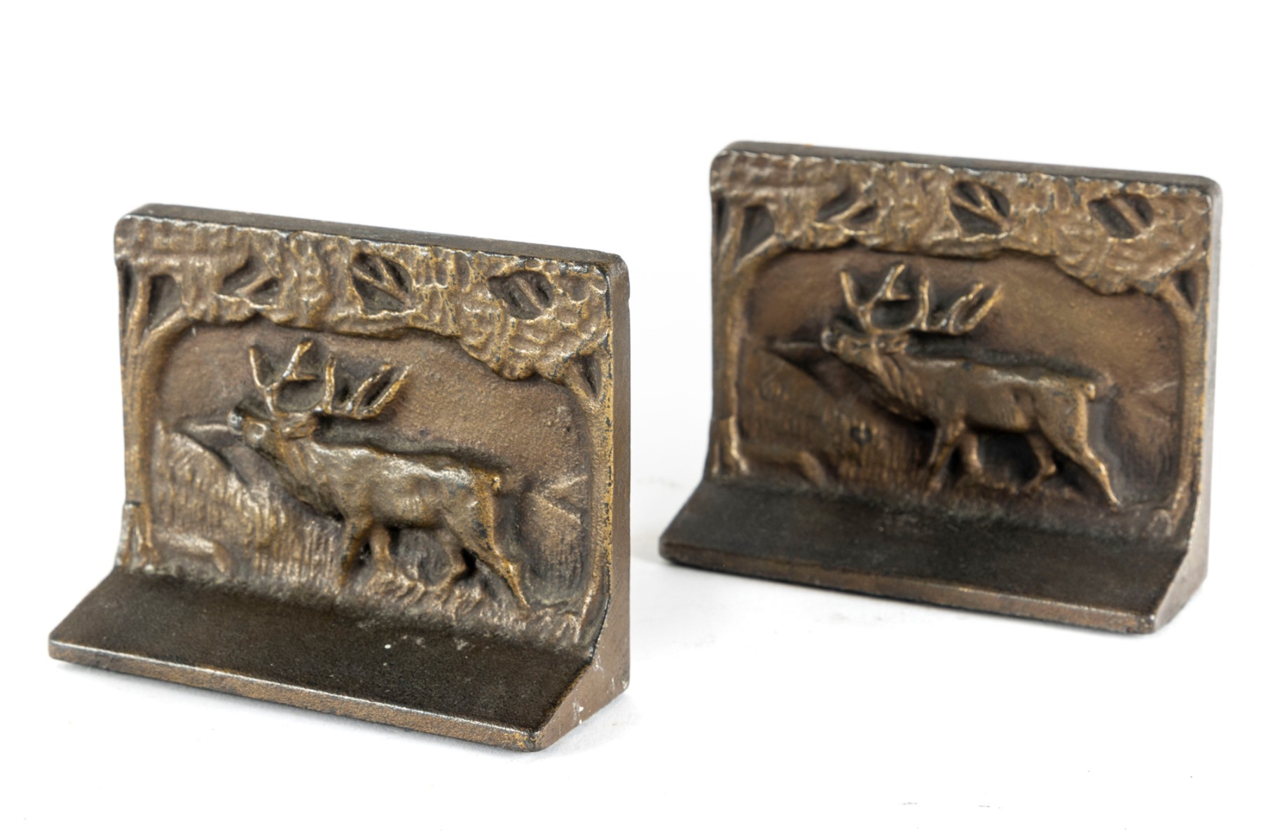 A pair of antique, solid brass elk landscape scene bookends set on felt bottoms.