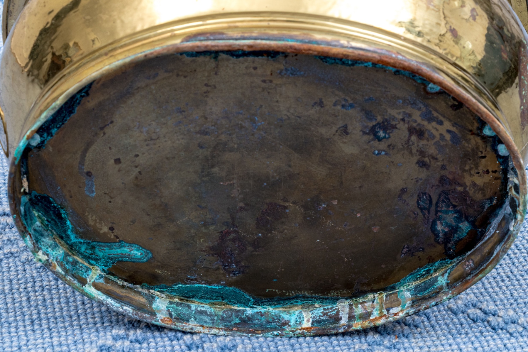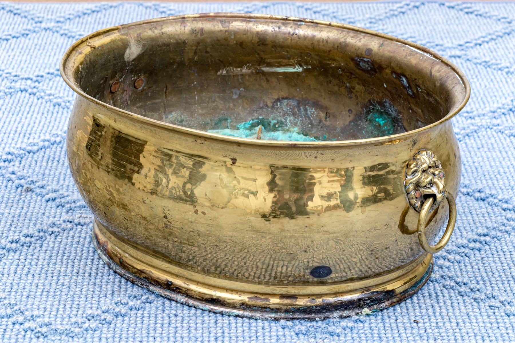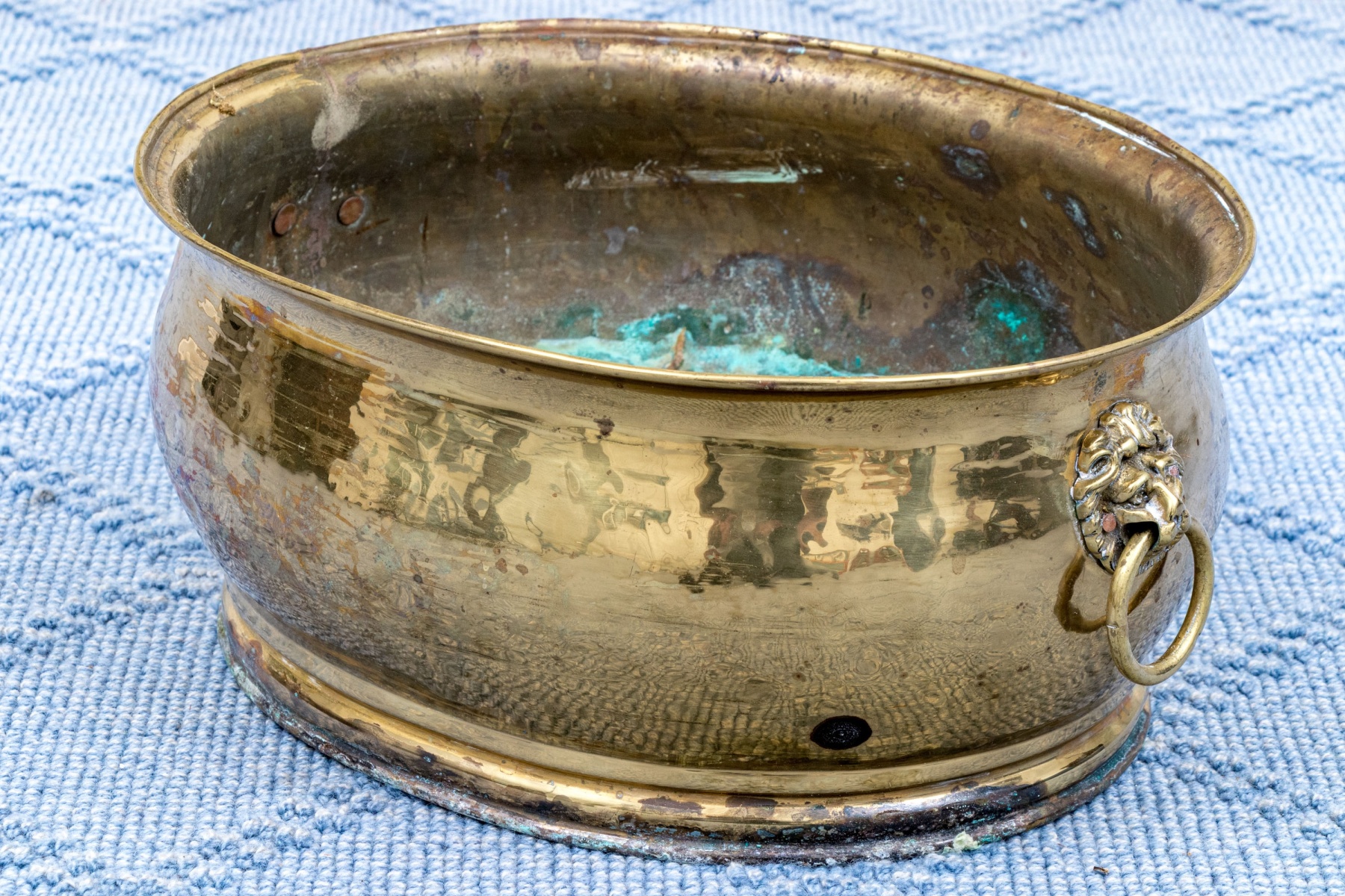 A fabulous antique brass jardinière in oval form with a flared rim and domed circular foot. The body is flanked by stately lion mask plaques with twin loop handles.