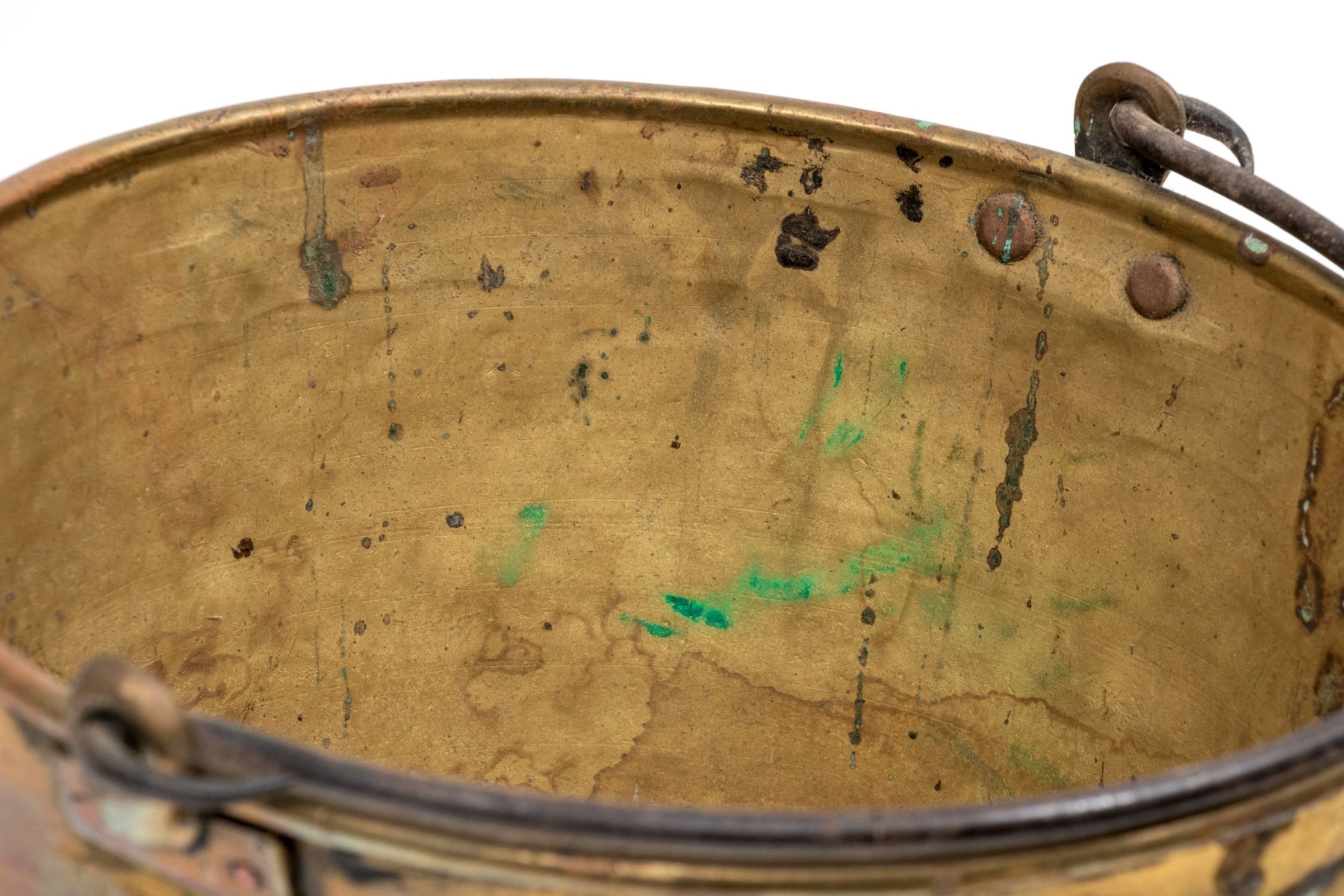 Presents well overall with great rustic decorative appeal. Losses to the metal frame around the base with holes making the pail not suitable for liquid use. Past soldered repairs, dings, and abrasions with oxidation commensurate with age and use.