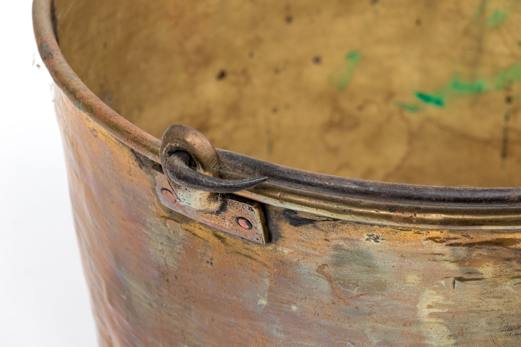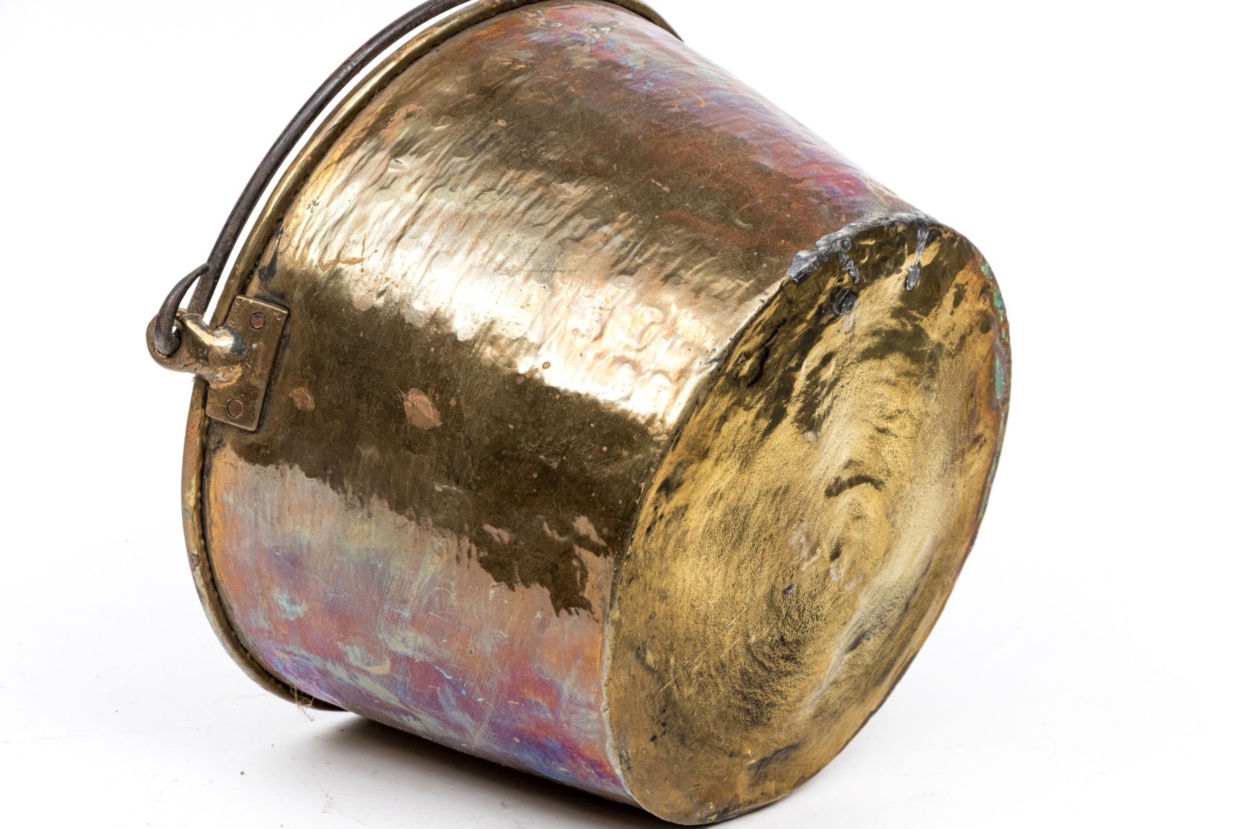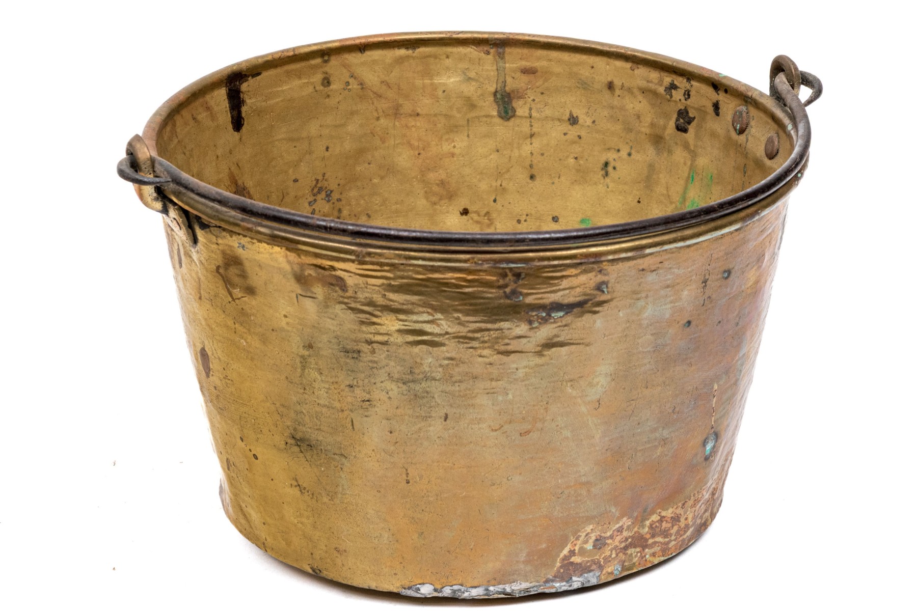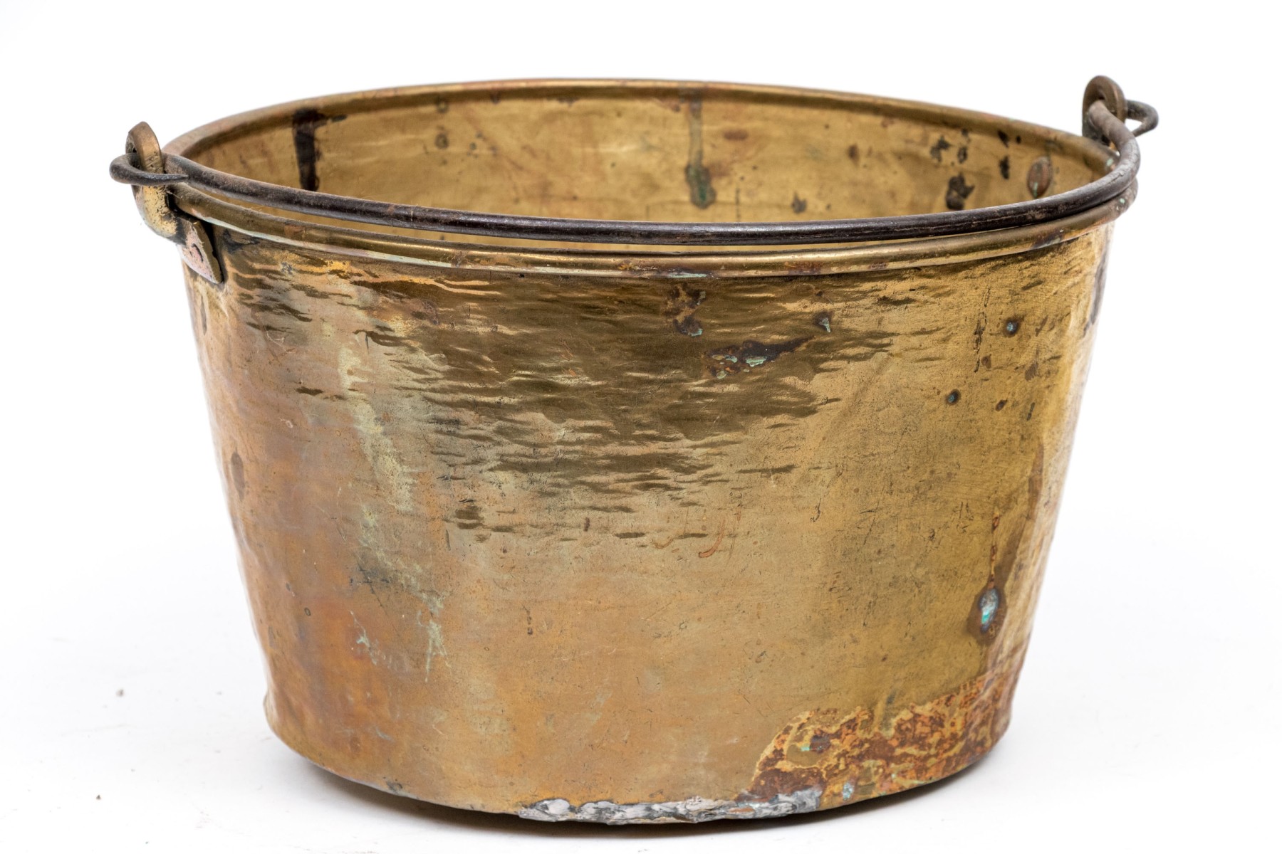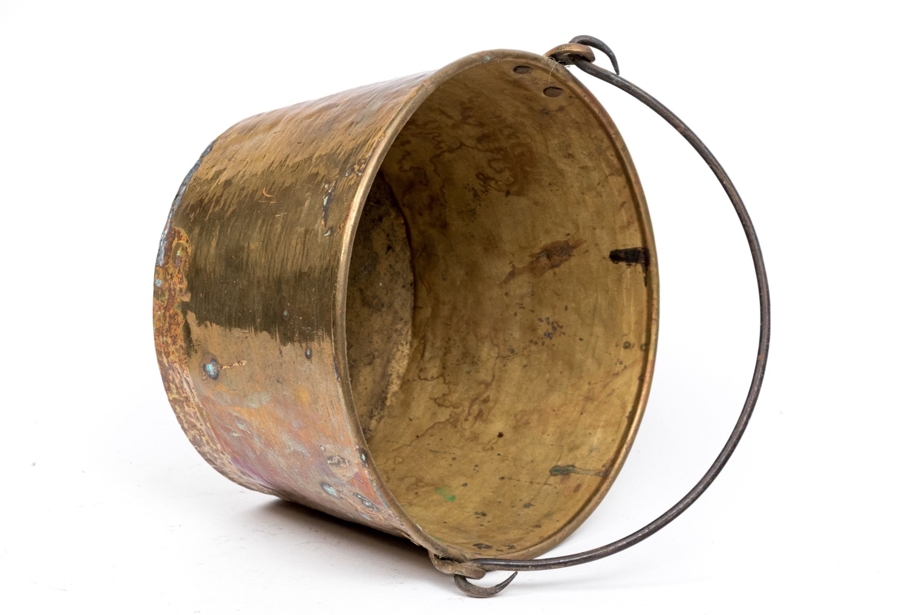 A charming antique brass pail with an iron swing handle at the top of a gently tapered cylindrical body.