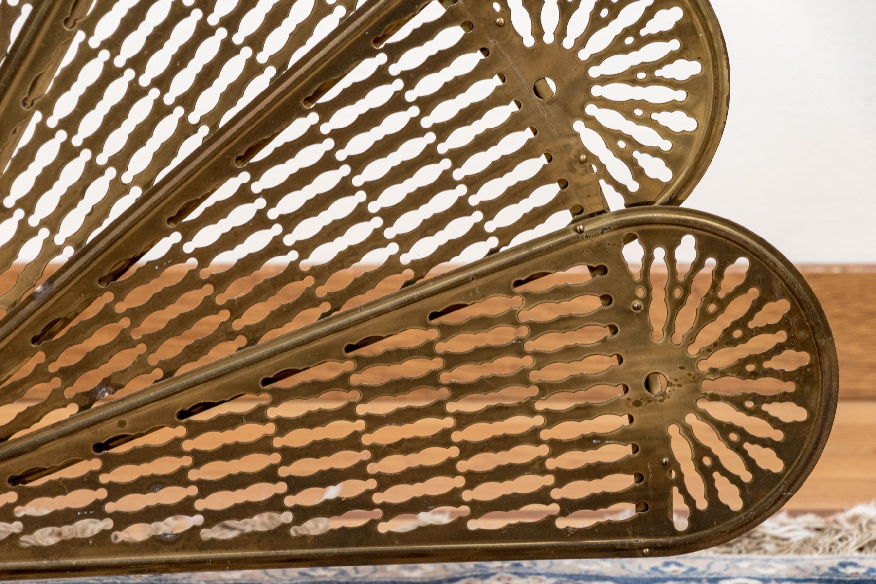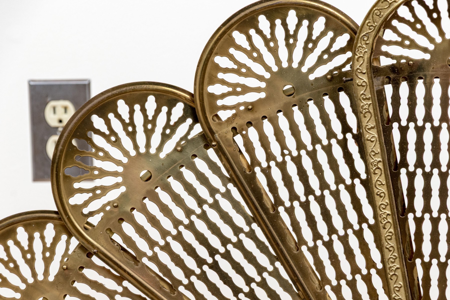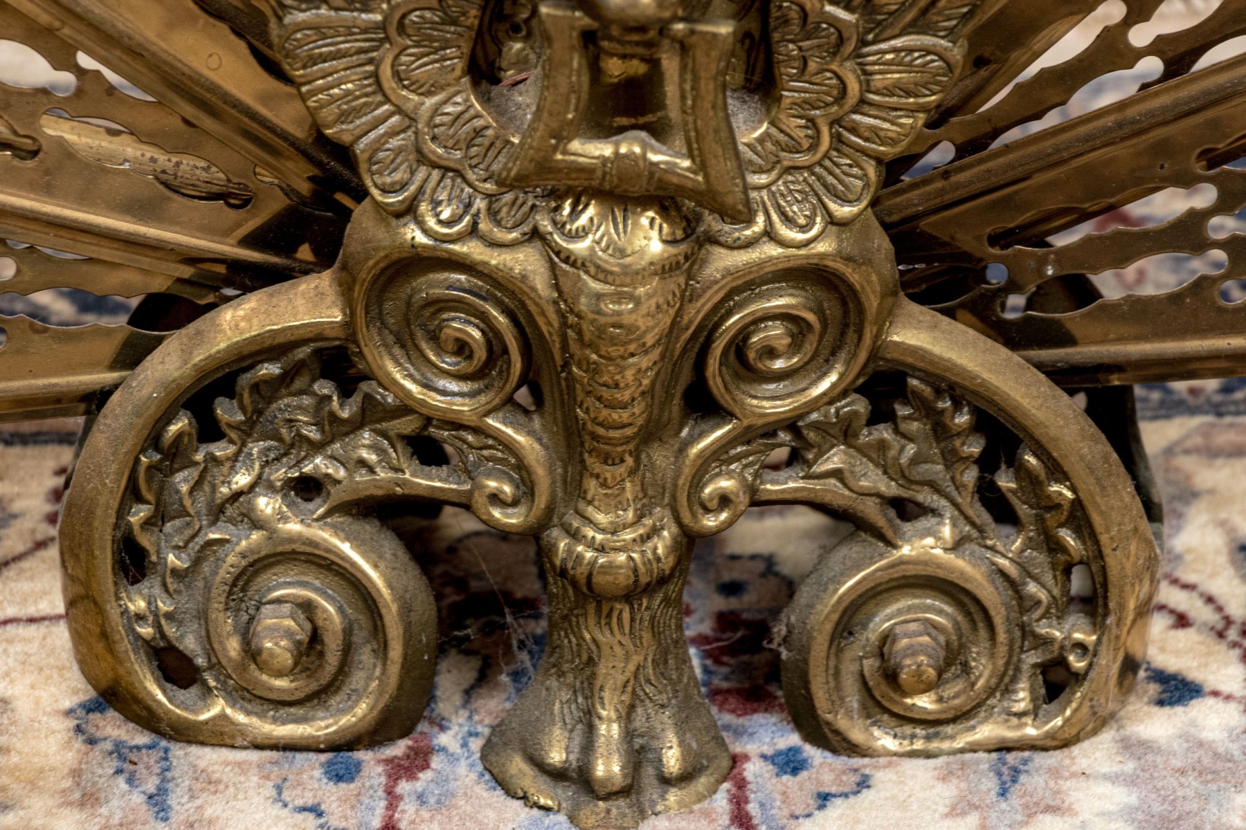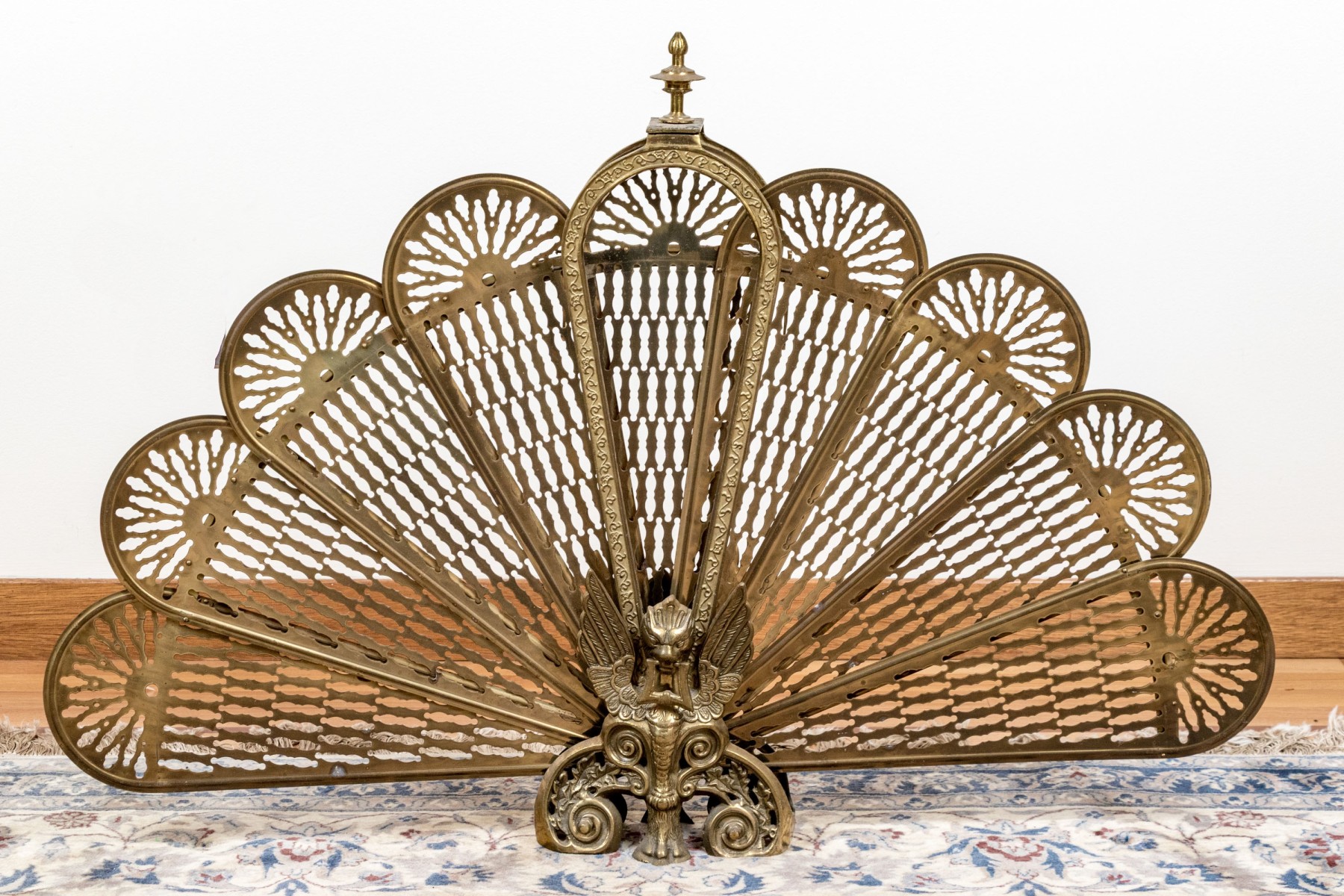 A stunning brass figural fireplace screen in the form of a peacock, featuring a series of nine scalloped tail panels with finely pierced geometric designs that can collapse into the central case. The central case is topped with a finial and further decorated with vining relief, leading to a base with the bird's heat surrounded by outstretched wings and scrolled foliate motifs with a hairy paw at the center bottom.