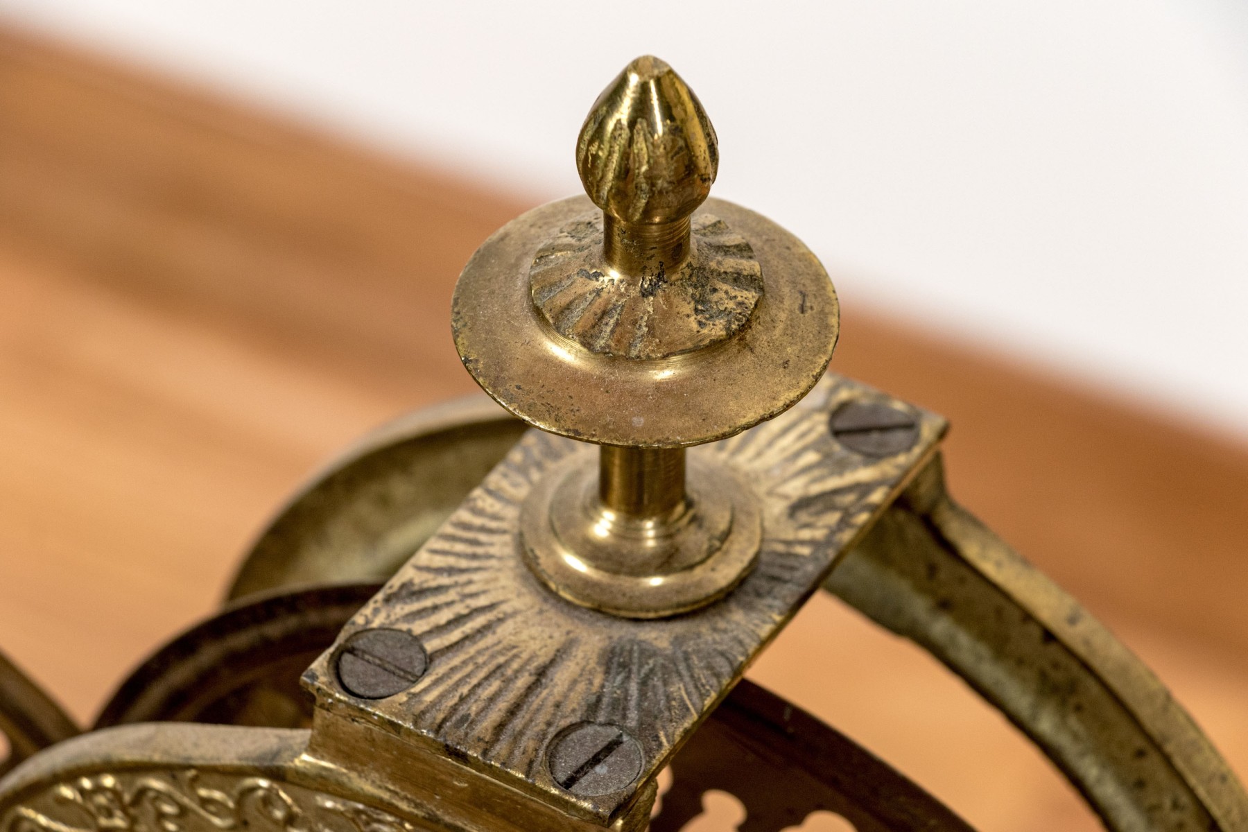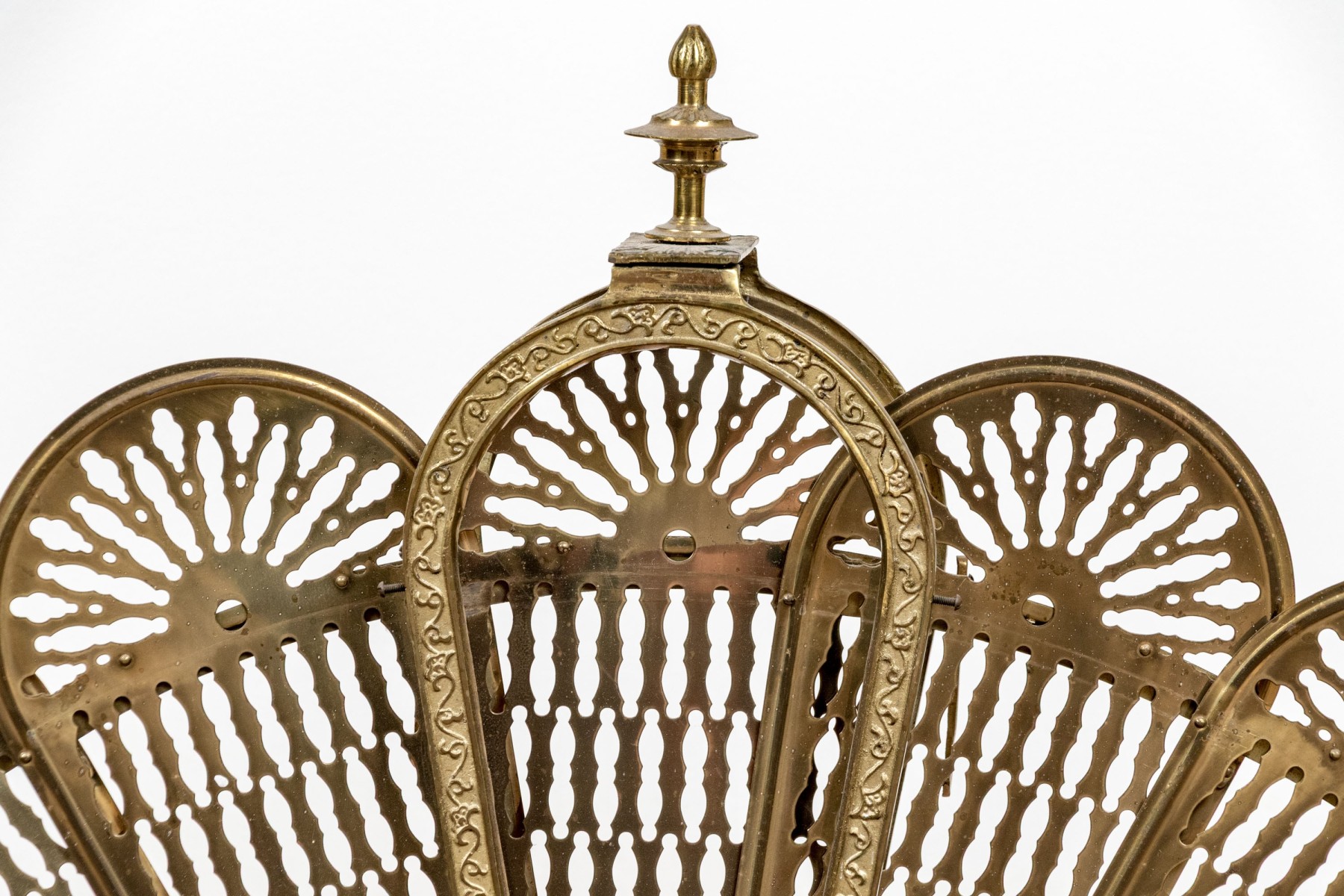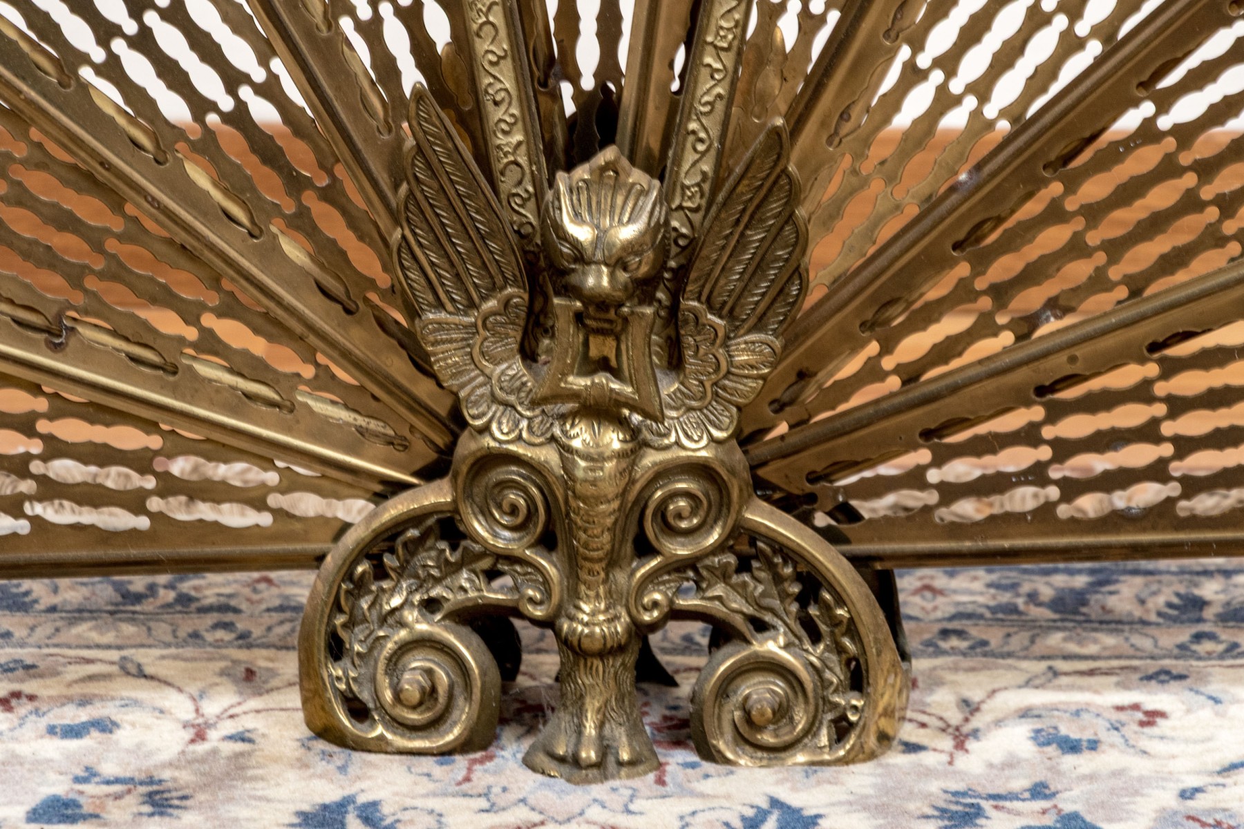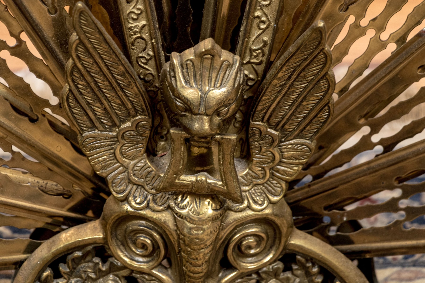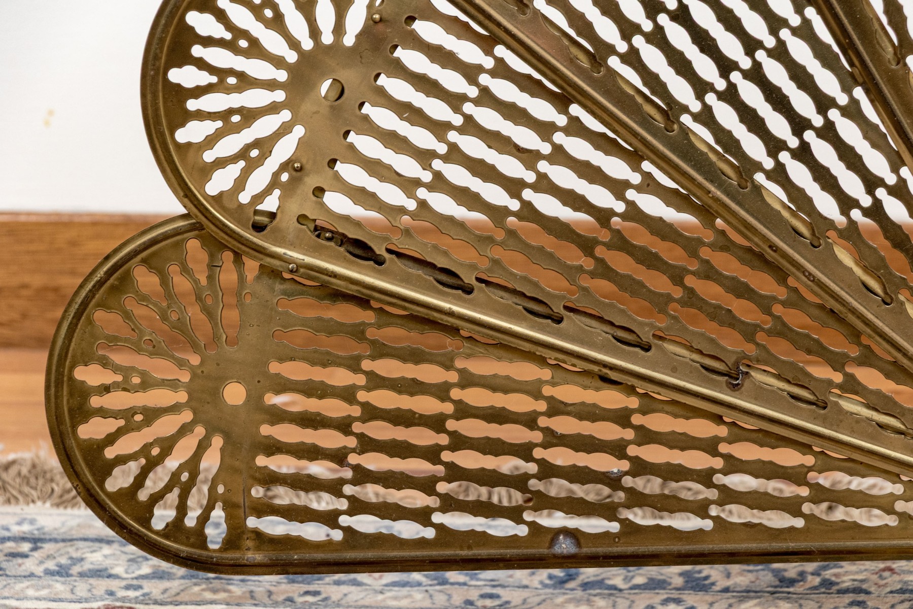 A stunning brass figural fireplace screen in the form of a peacock, featuring a series of nine scalloped tail panels with finely pierced geometric designs that can collapse into the central case. The central case is topped with a finial and further decorated with vining relief, leading to a base with the bird's heat surrounded by outstretched wings and scrolled foliate motifs with a hairy paw at the center bottom.