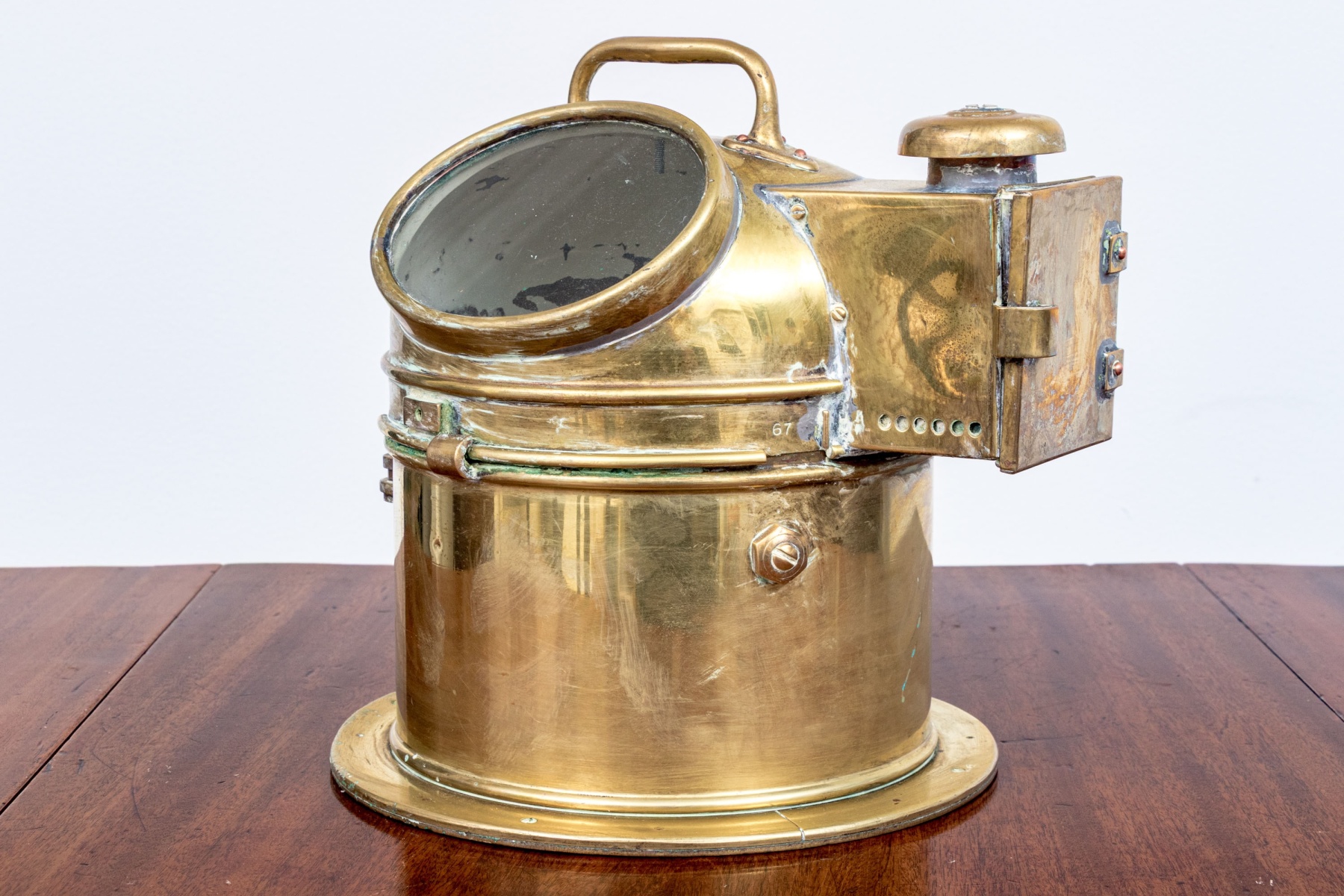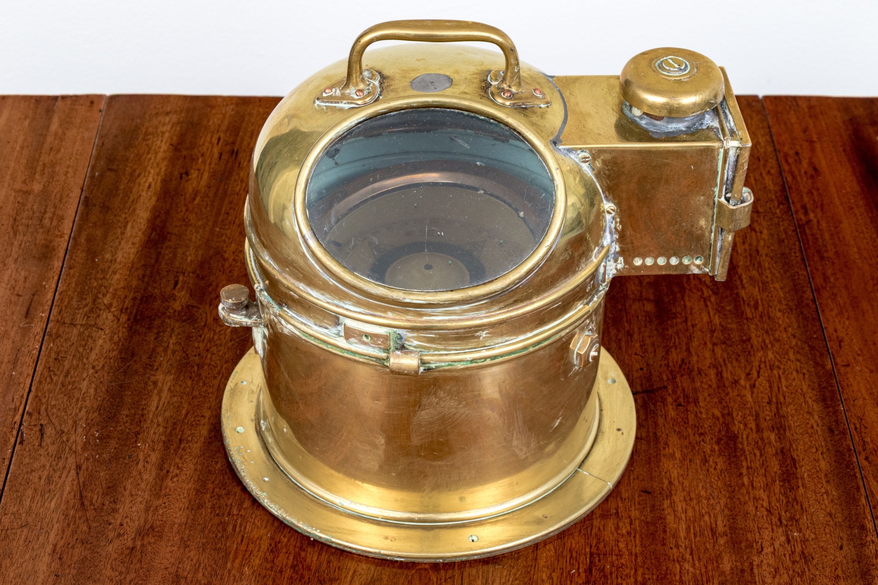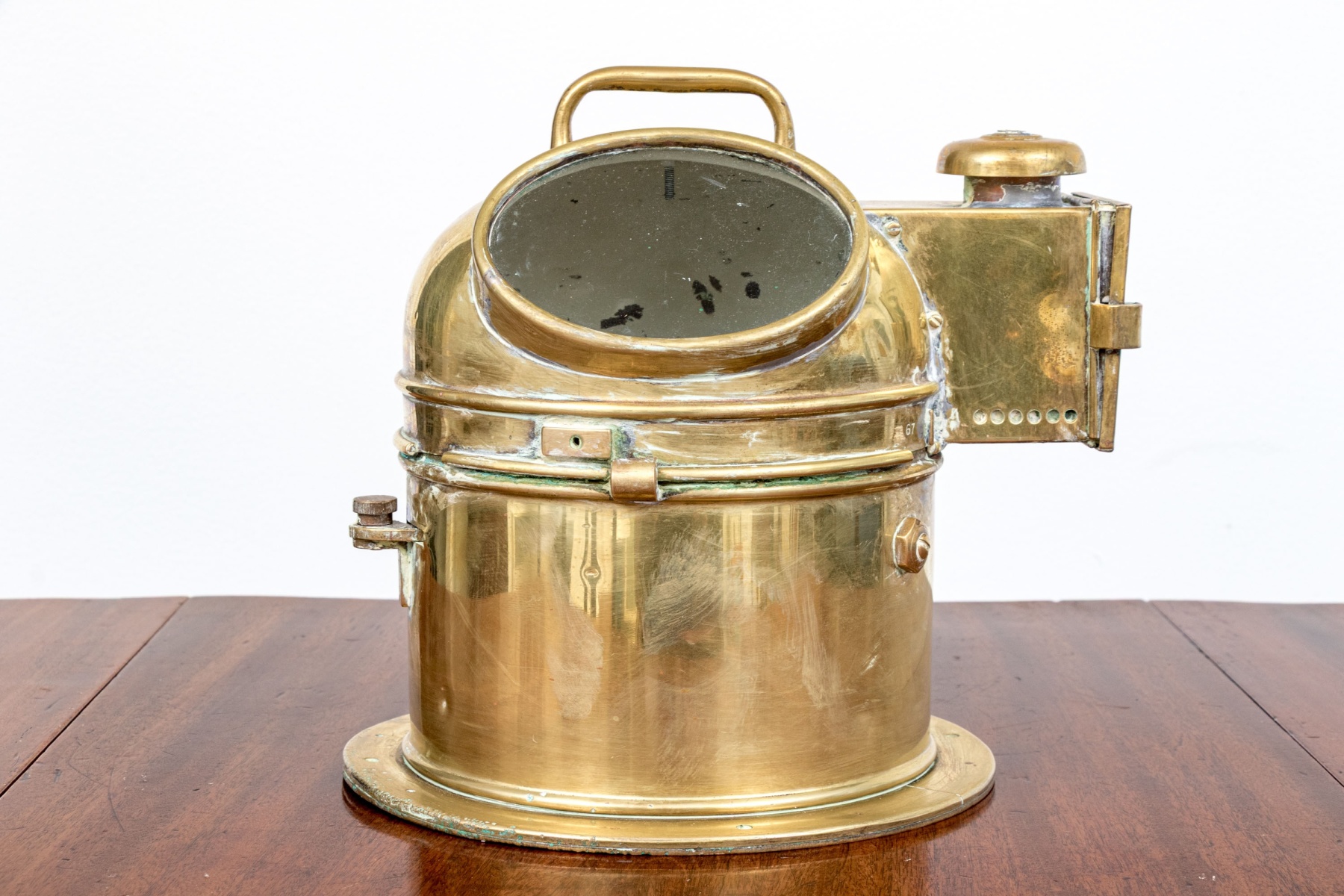 A wonderful brass ship binnacle with a brass porthole form case with removable top with glass oval viewing portal and handle with side box. Brass plaque marked Patt 183 No 6942/BHS / 24645 / Weight 23 Lbs.