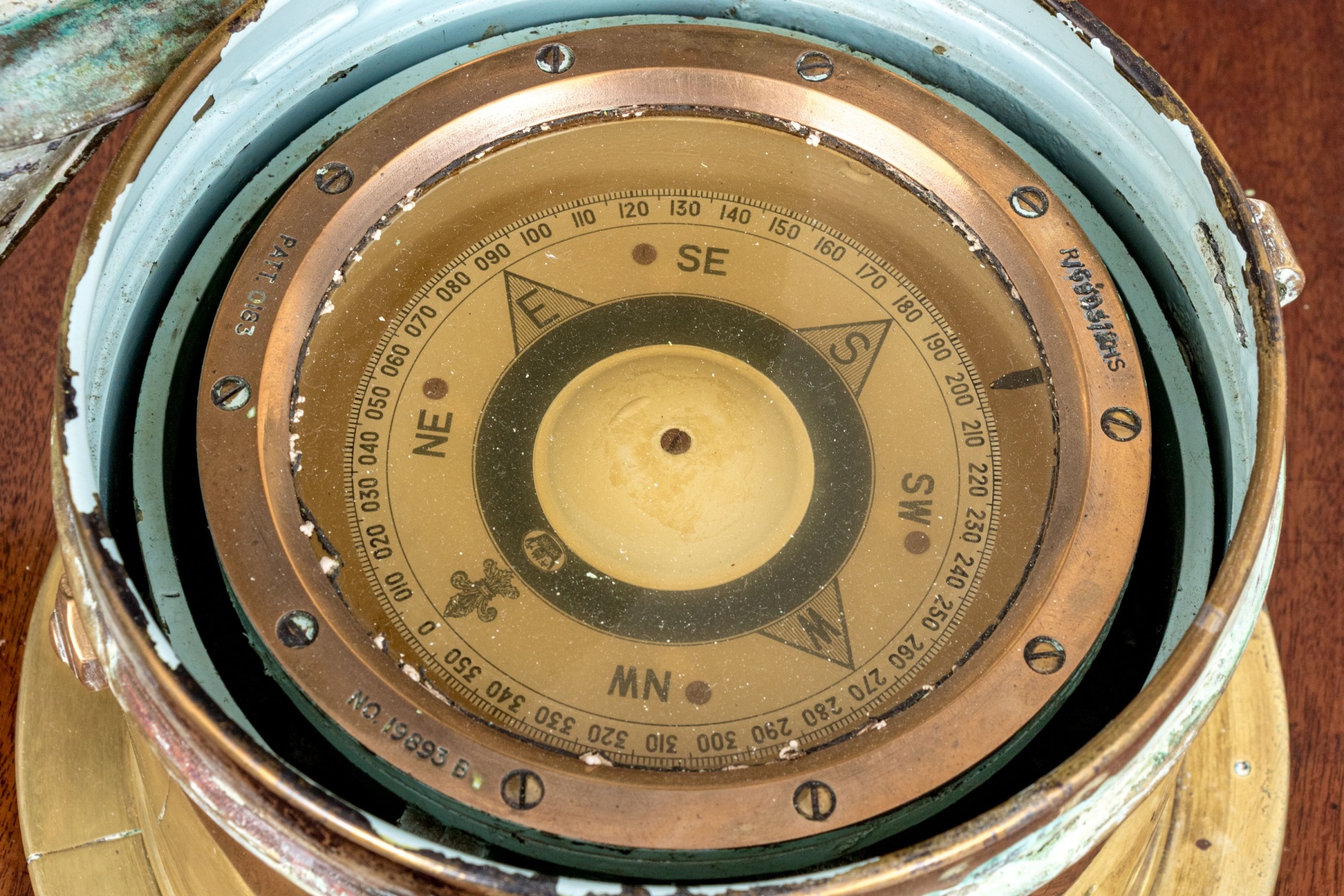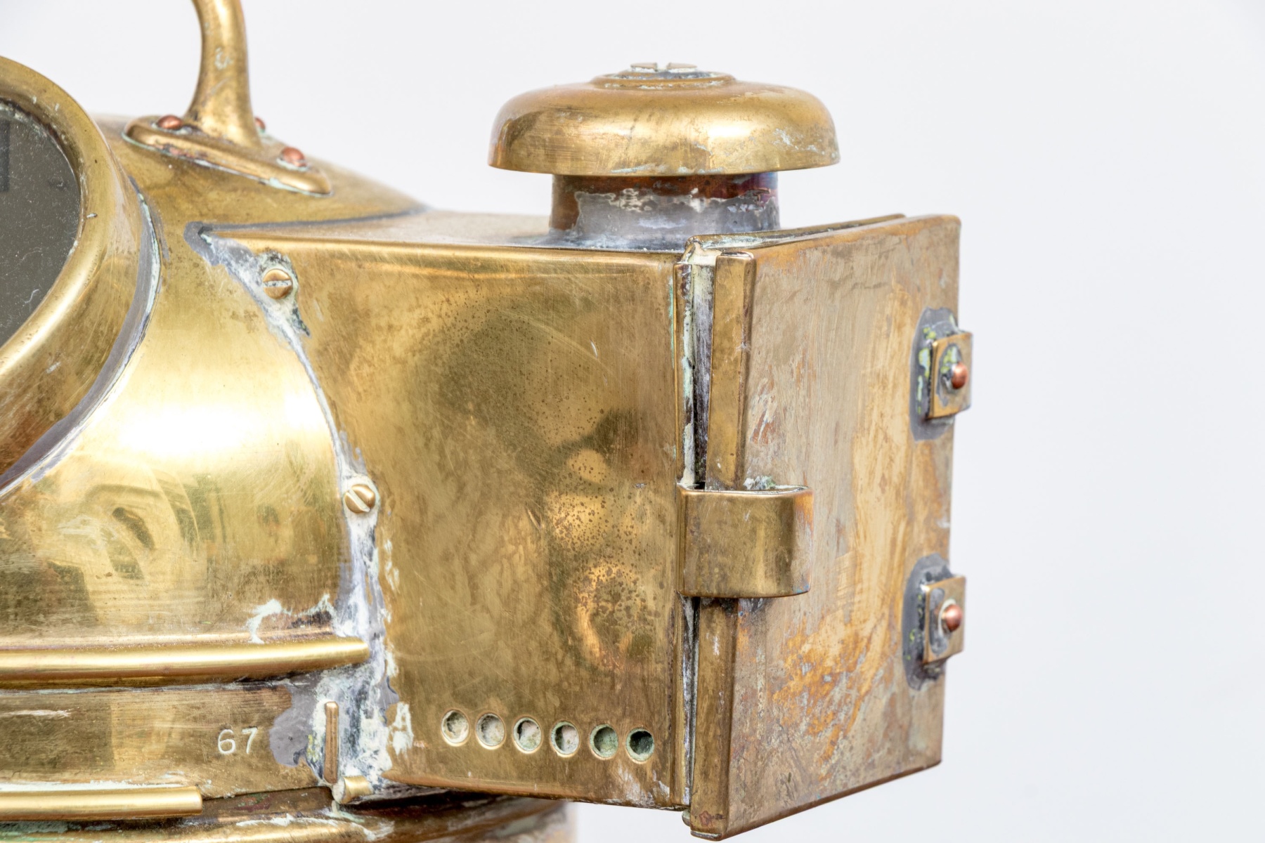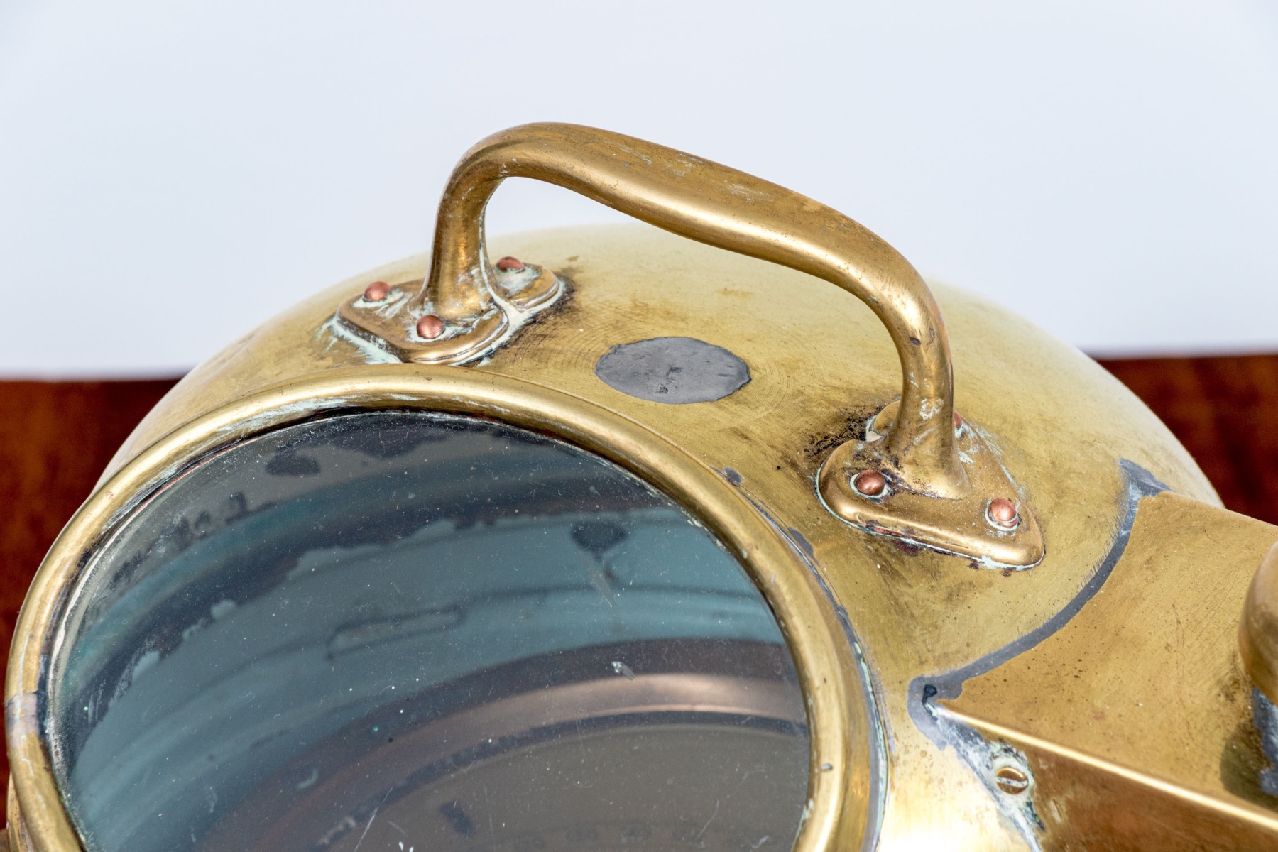 A wonderful brass ship binnacle with a brass porthole form case with removable top with glass oval viewing portal and handle with side box. Brass plaque marked Patt 183 No 6942/BHS / 24645 / Weight 23 Lbs.