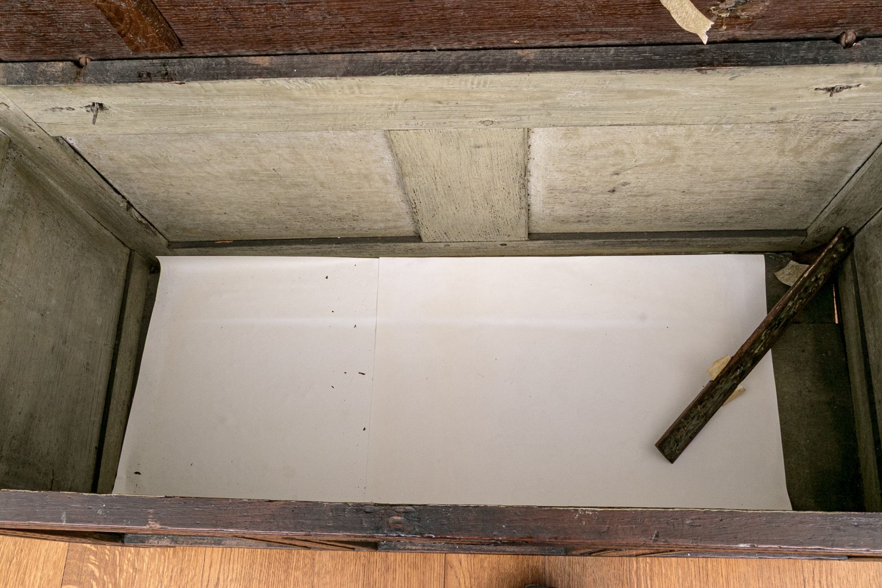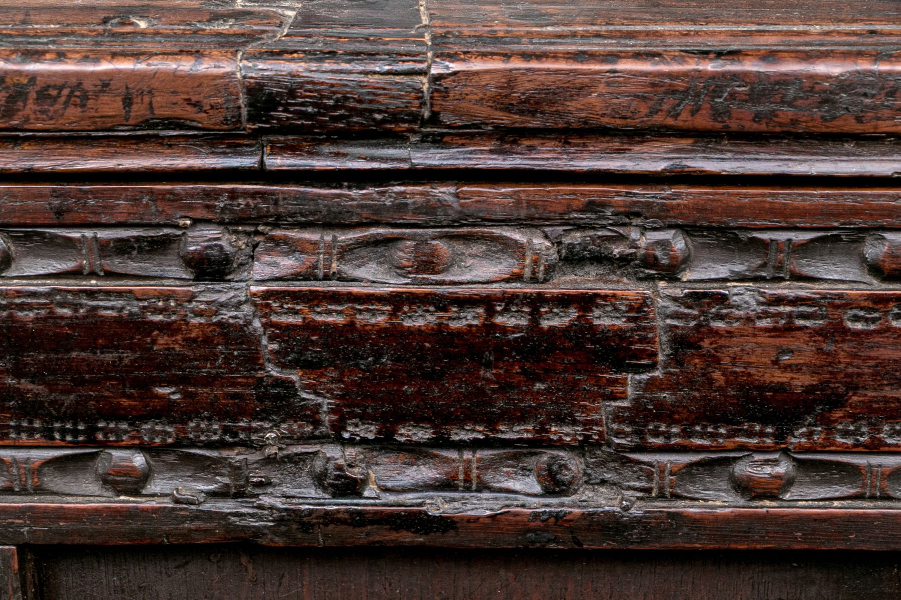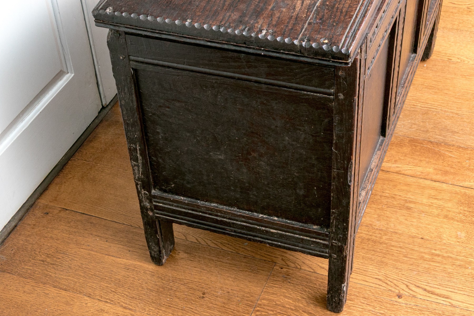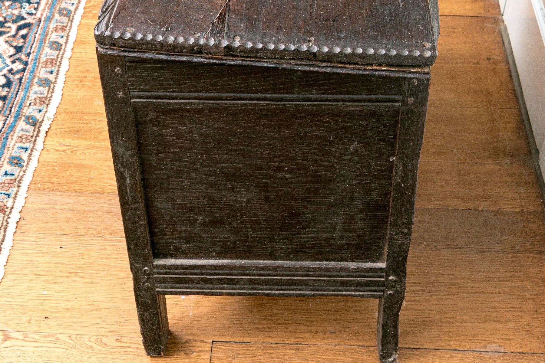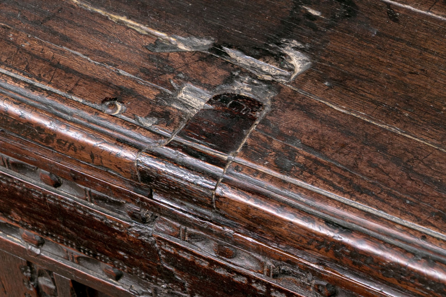 Old cracks and splits to the top of the chest and losses to one of the wooden legs, probably older insect damage. The lid does not close completely flush.