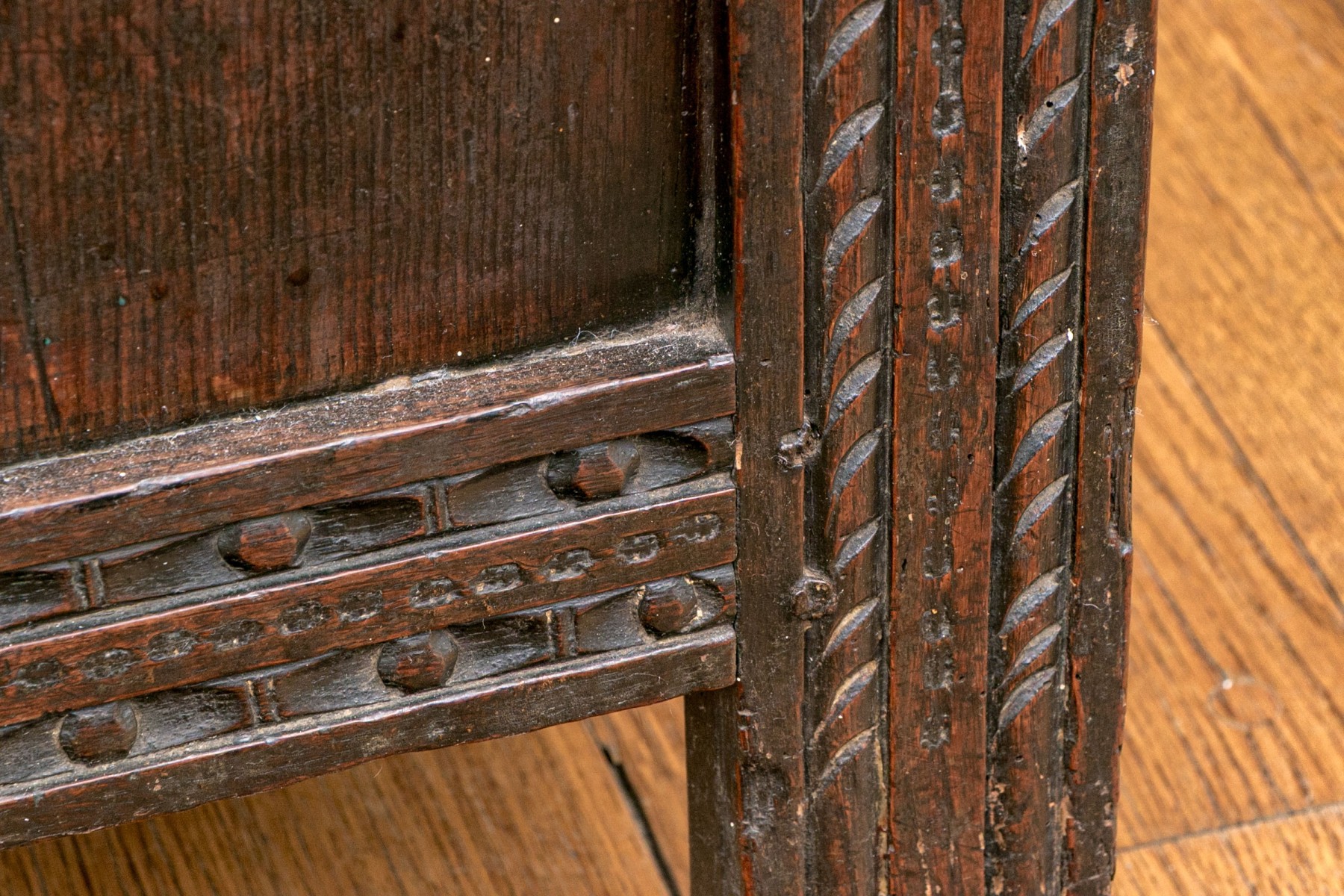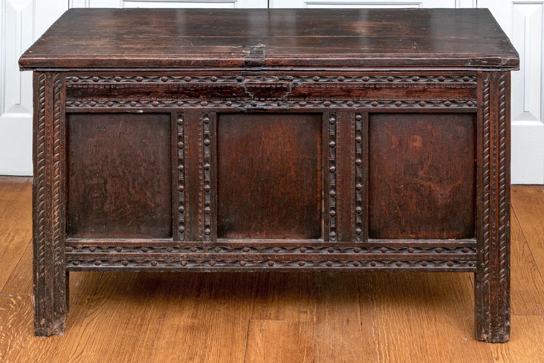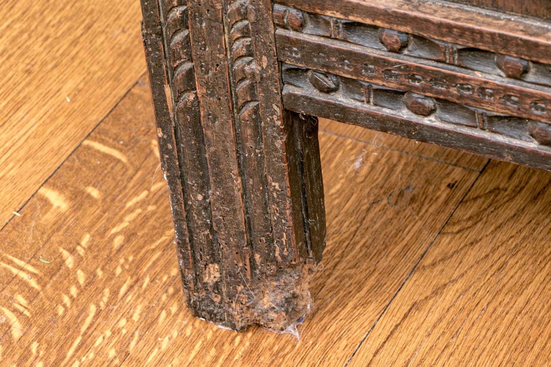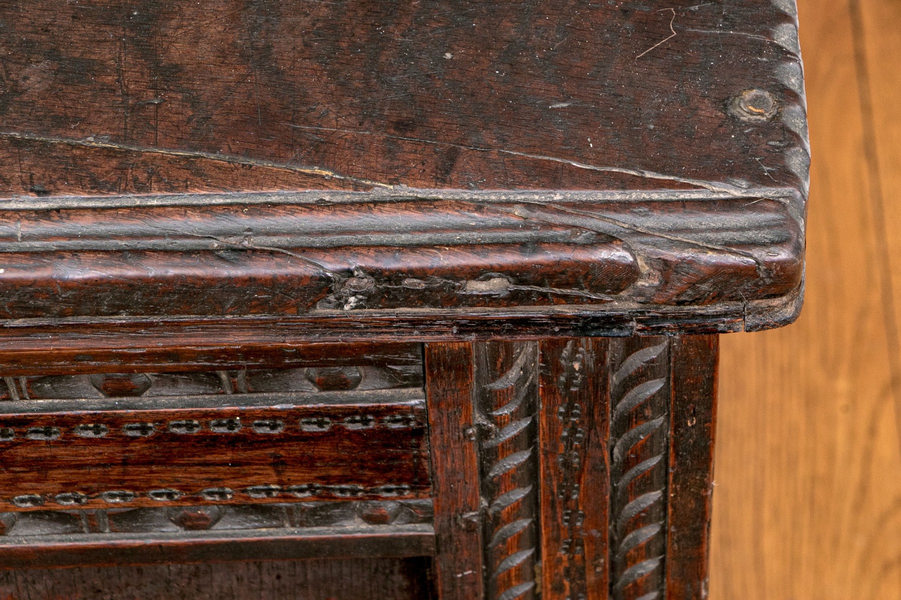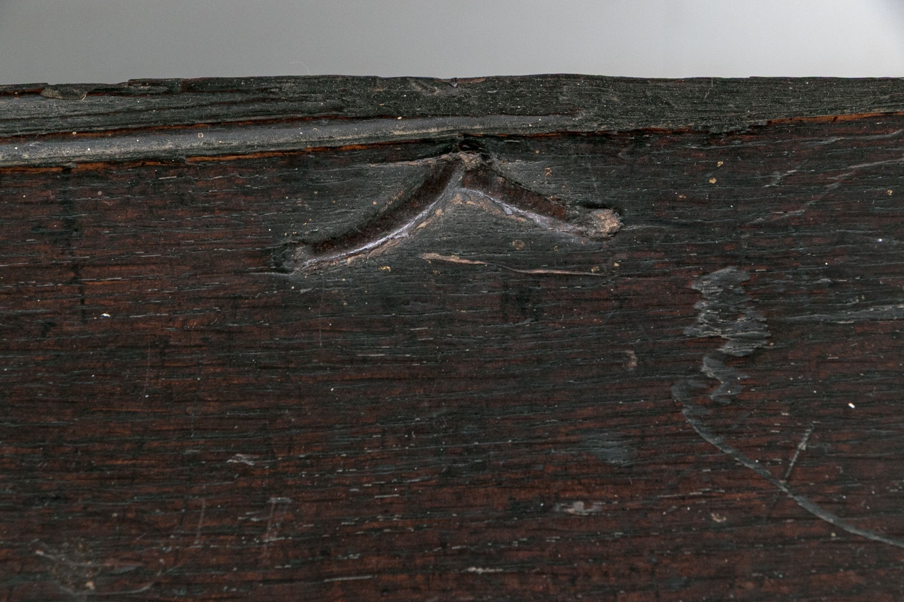 Old cracks and splits to the top of the chest and losses to one of the wooden legs, probably older insect damage. The lid does not close completely flush.