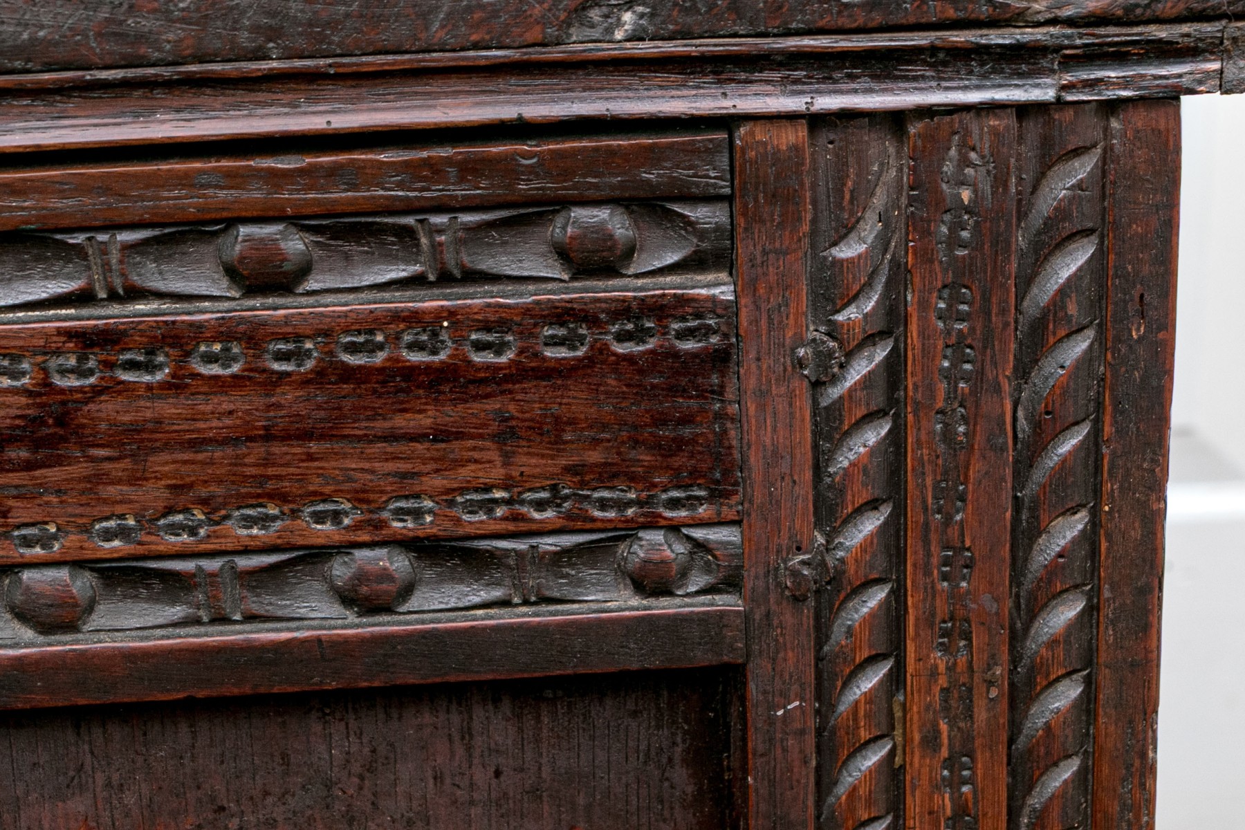 A fine antique British coffer chest in dark brown finished oak with great Jacobean appeal, designed with a rectangular hinged lid over a well carved body with three panels surrounded by decorative patterned trims. Raised on straight, rectangular legs with beautiful rope twist motifs.