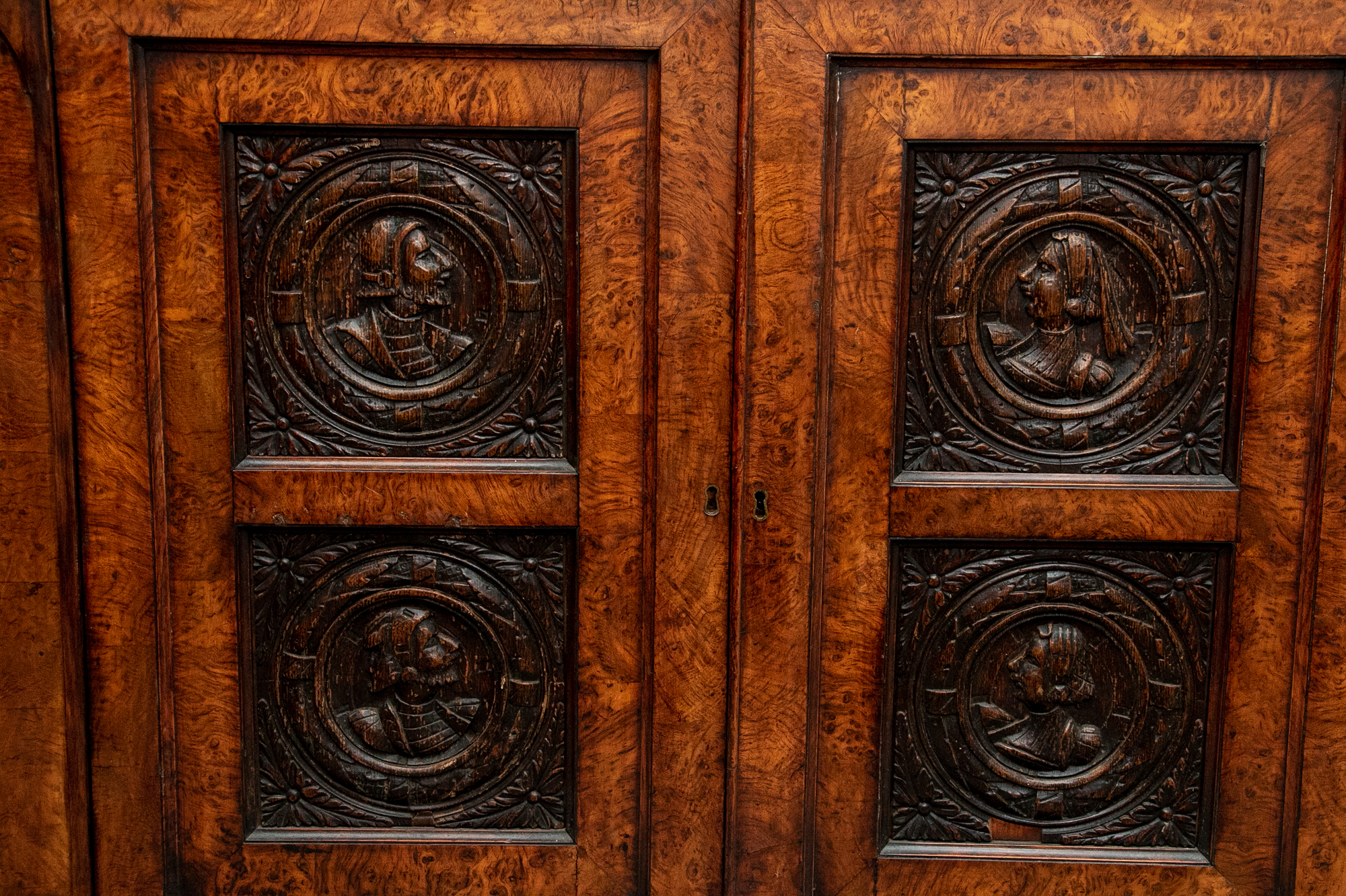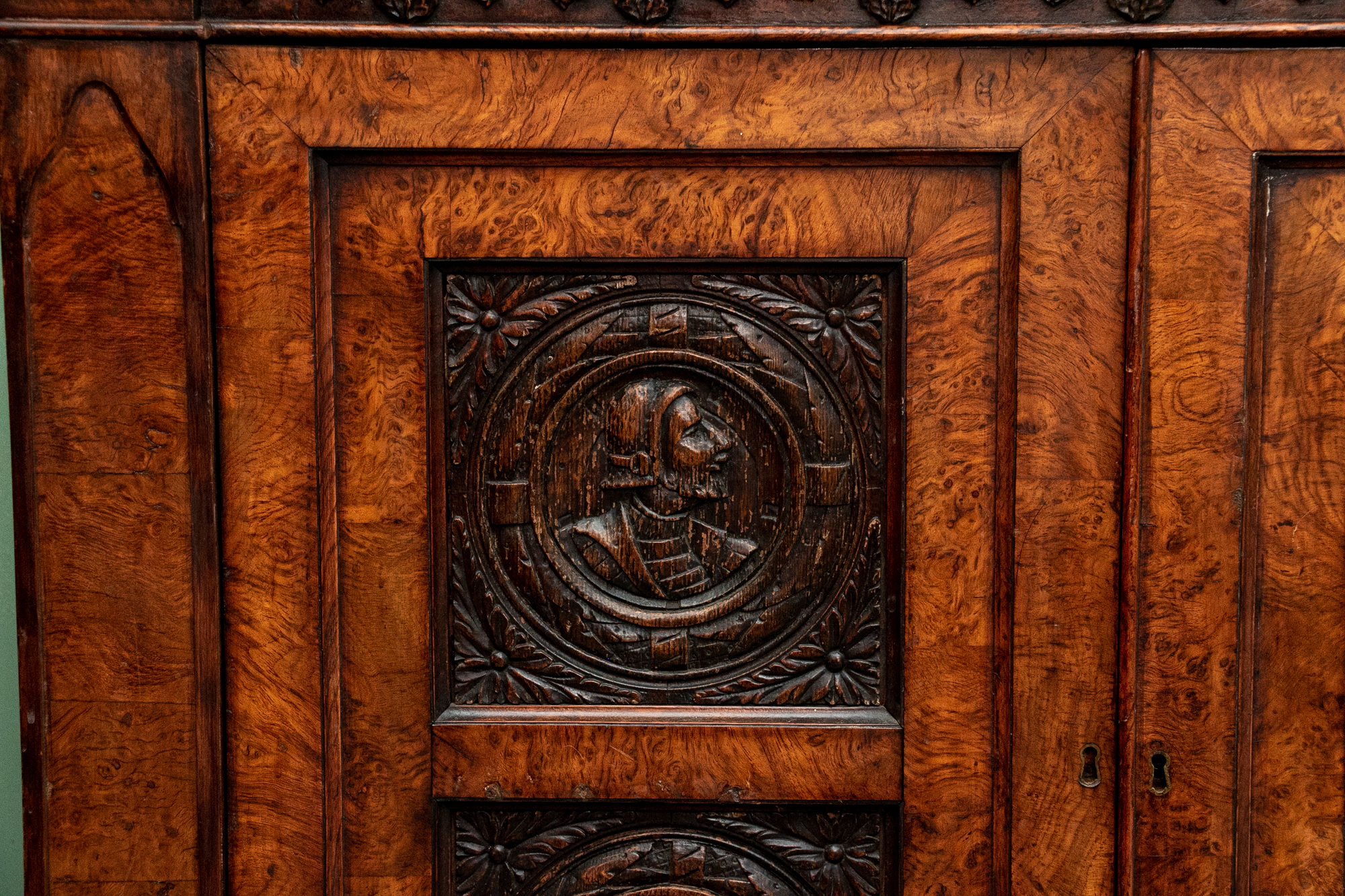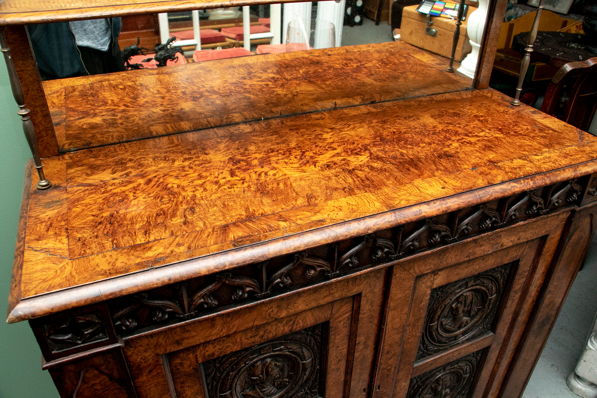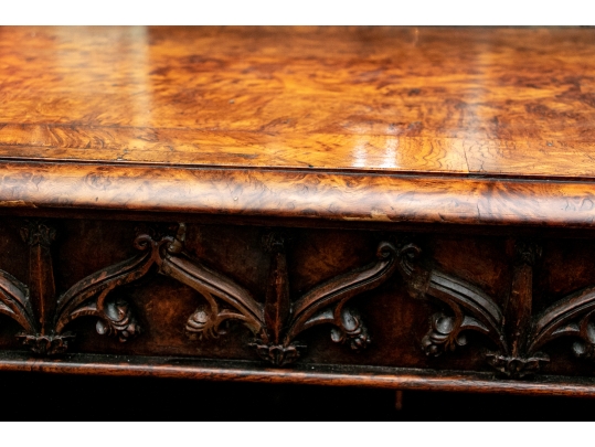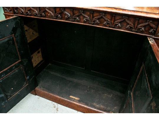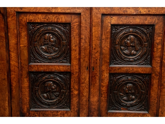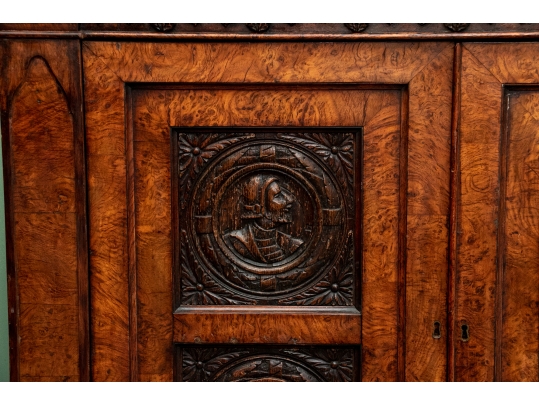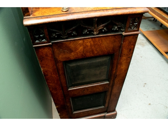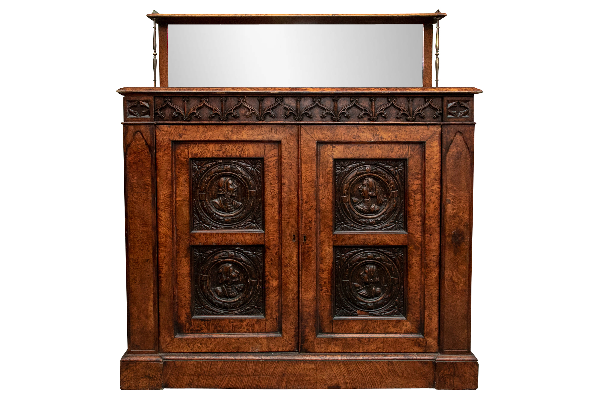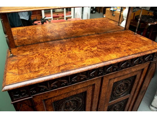 With a mirrored backsplash with a shelf and brass 3/4 gallery and supports. The top banded burled wood over a carved frieze in a Neo-Gothic style band. The double doors are carved with oak portrait medallions. Lacking a shelf and a key. The sides with dark recessed panels and inset burled supports with arched Neo-Gothic tops.