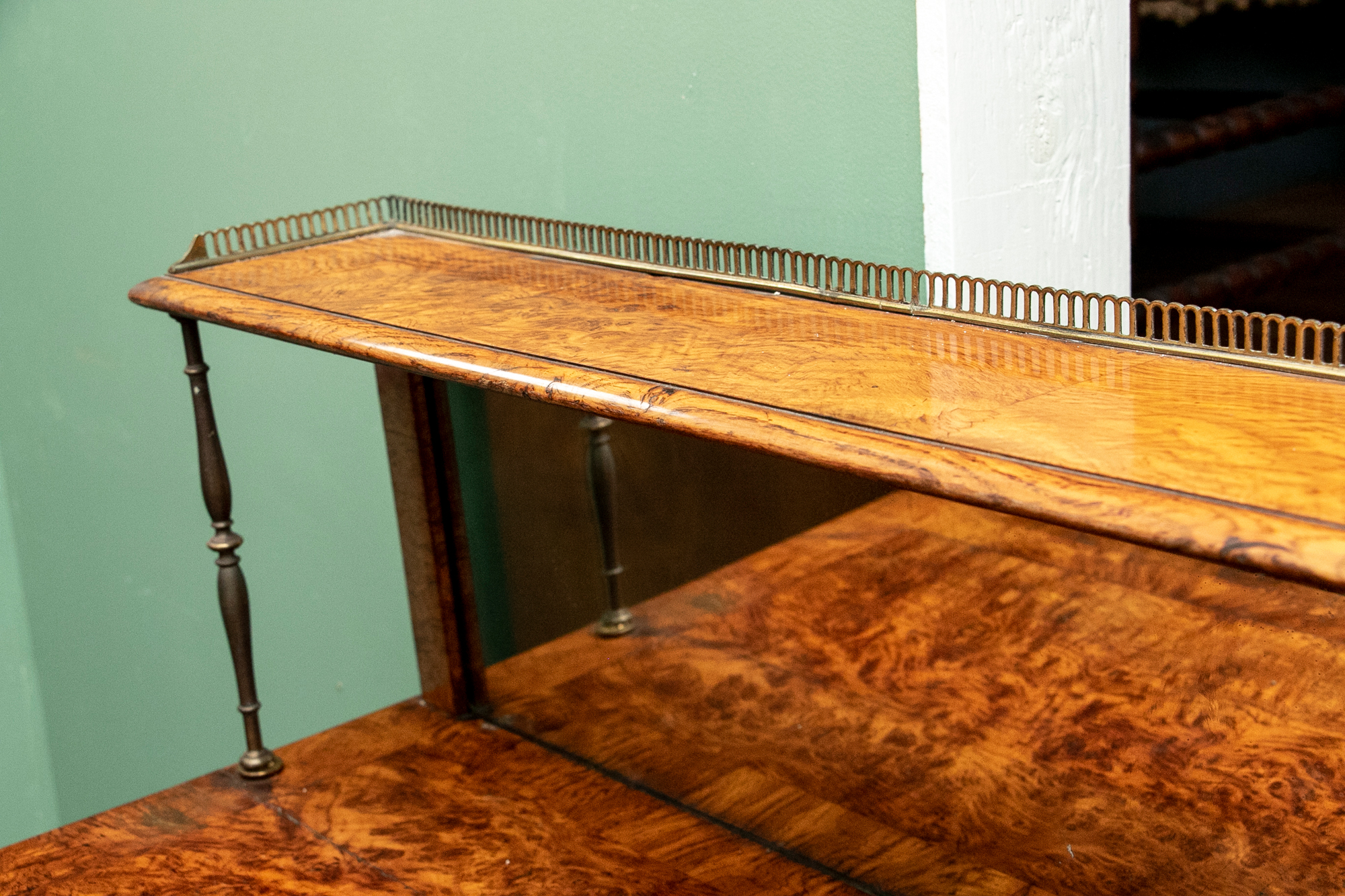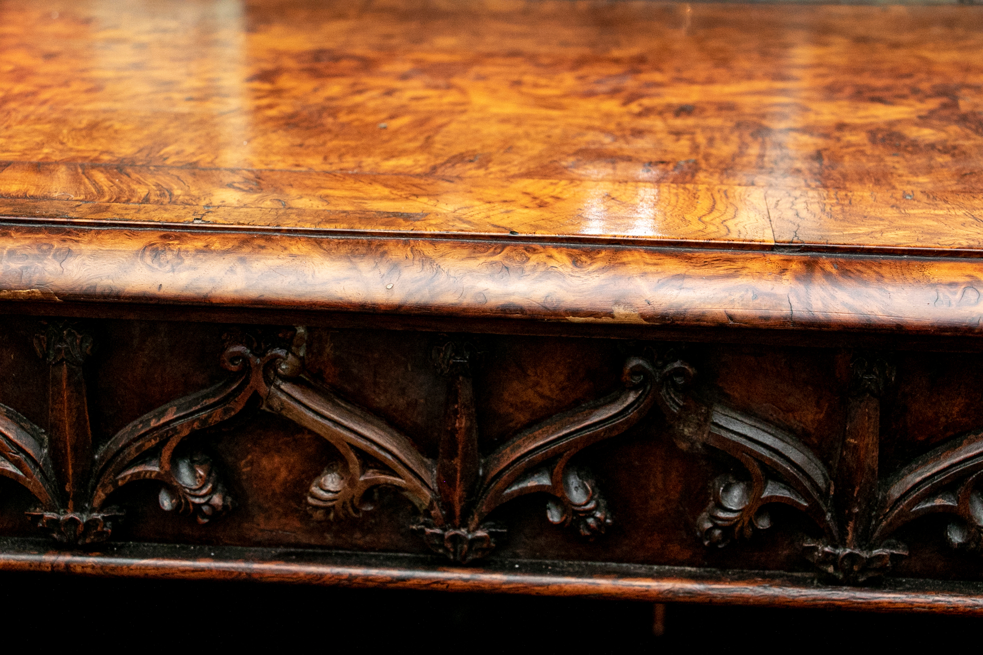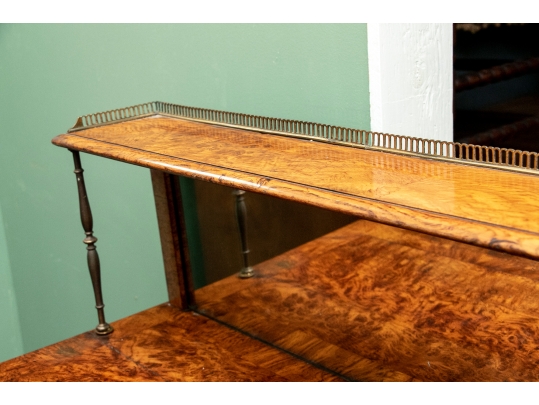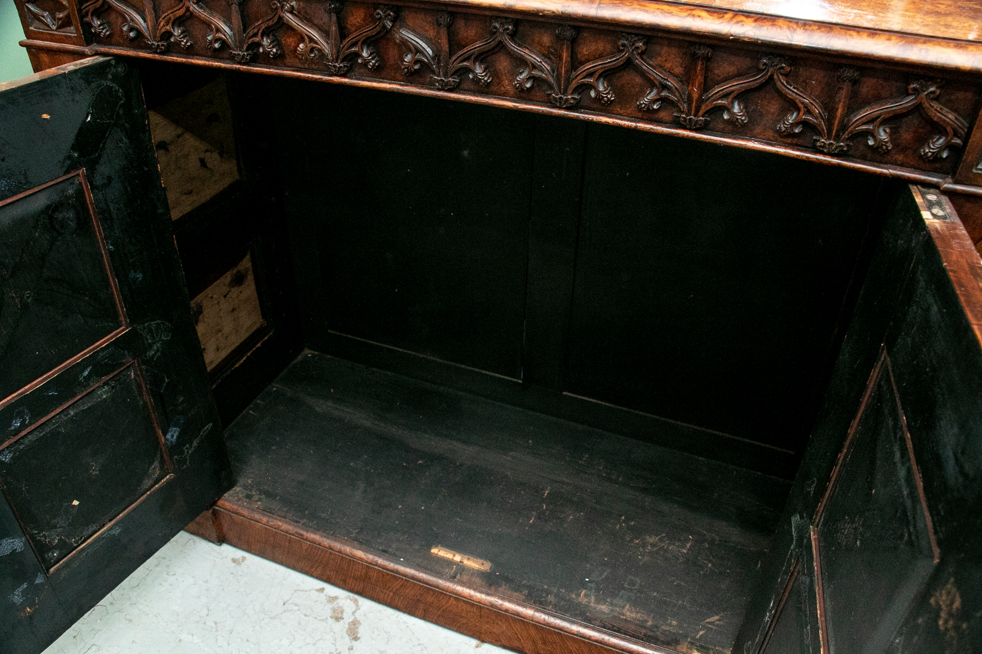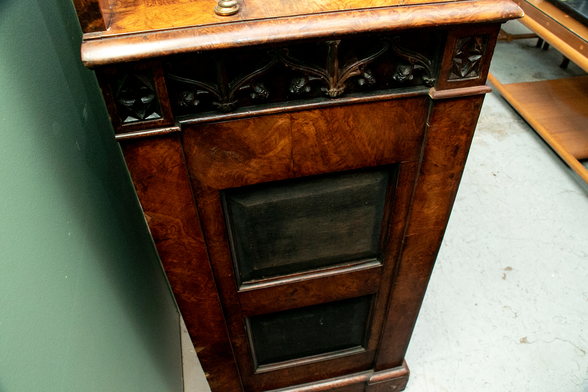 With a mirrored backsplash with a shelf and brass 3/4 gallery and supports. The top banded burled wood over a carved frieze in a Neo-Gothic style band. The double doors are carved with oak portrait medallions. Lacking a shelf and a key. The sides with dark recessed panels and inset burled supports with arched Neo-Gothic tops.