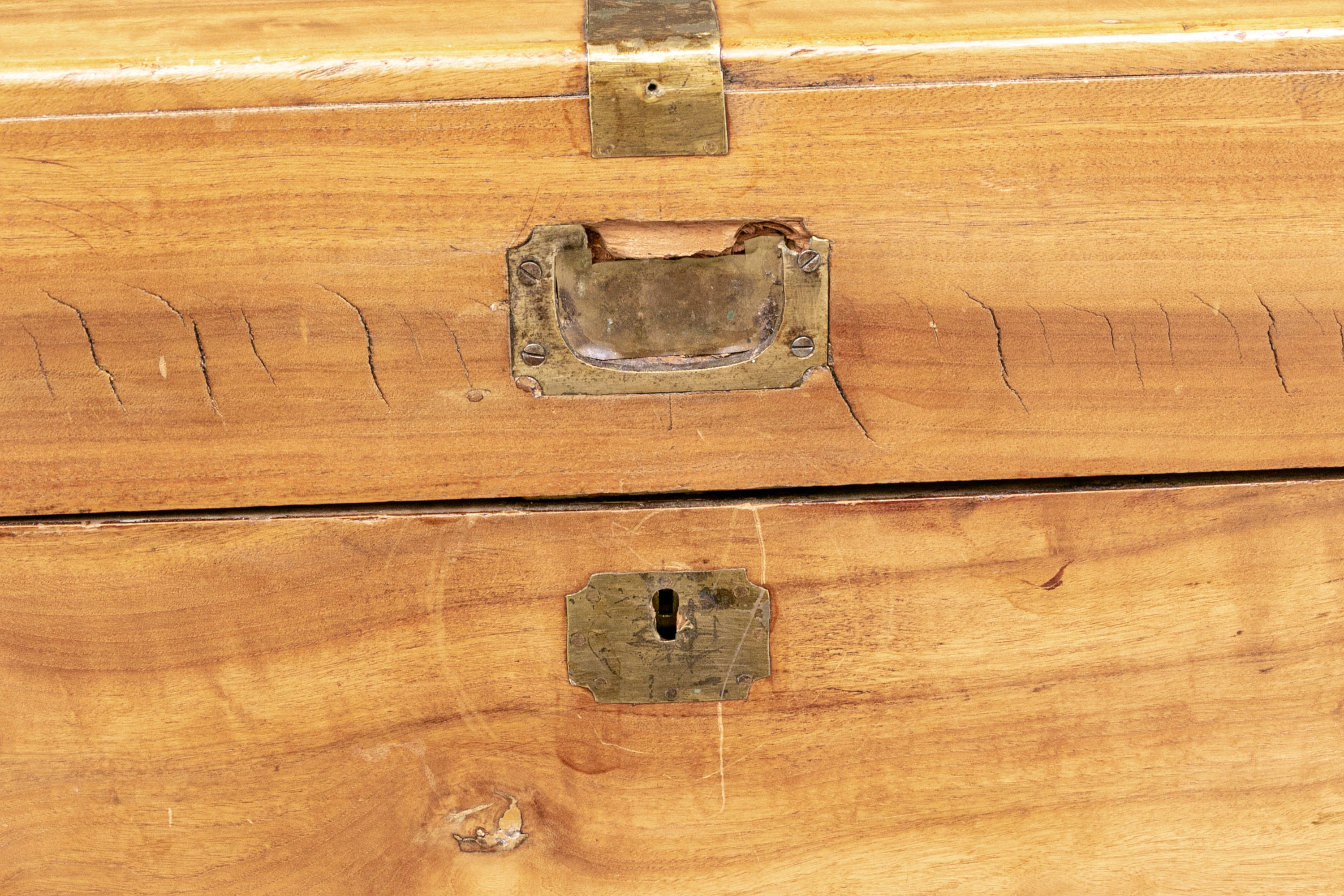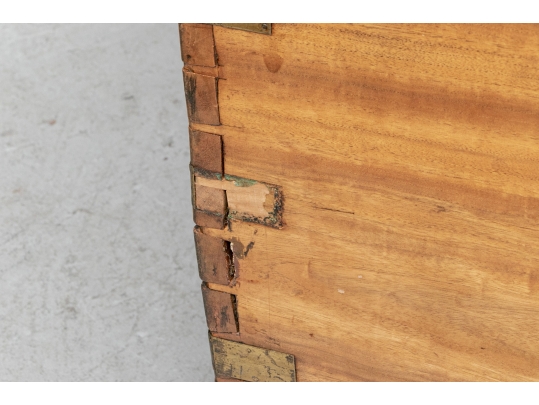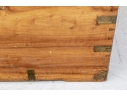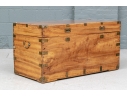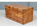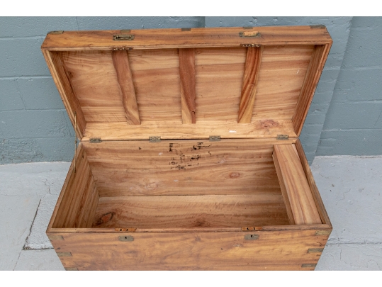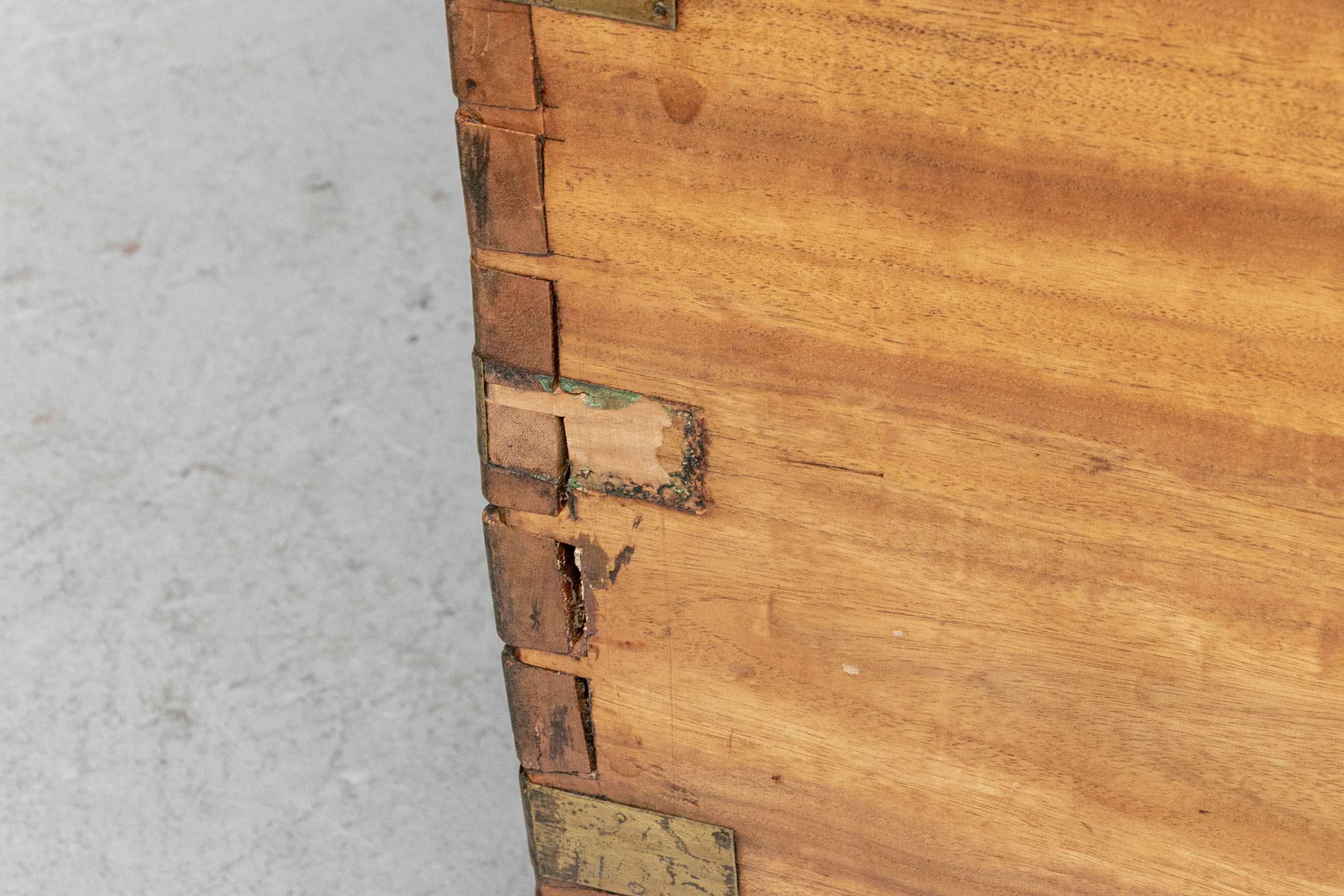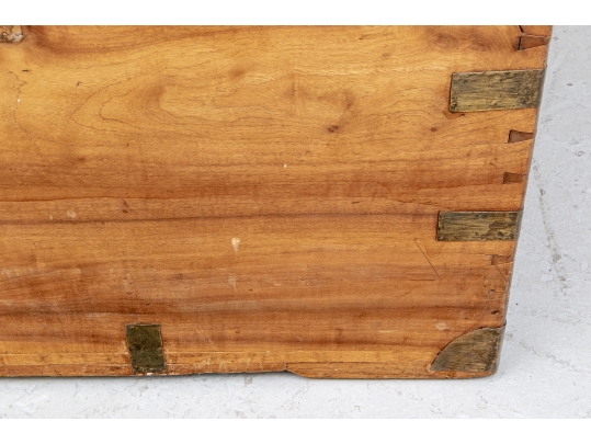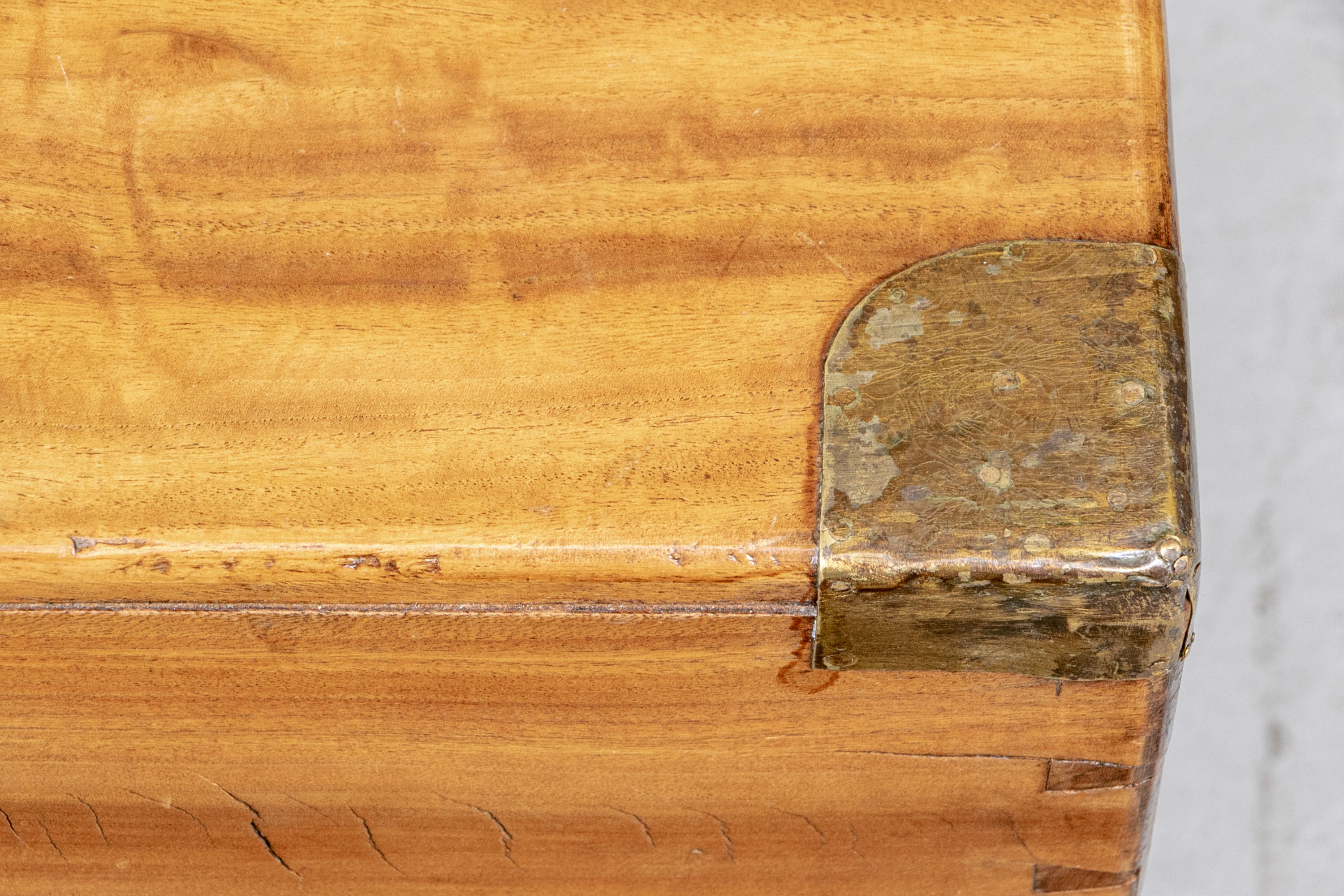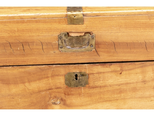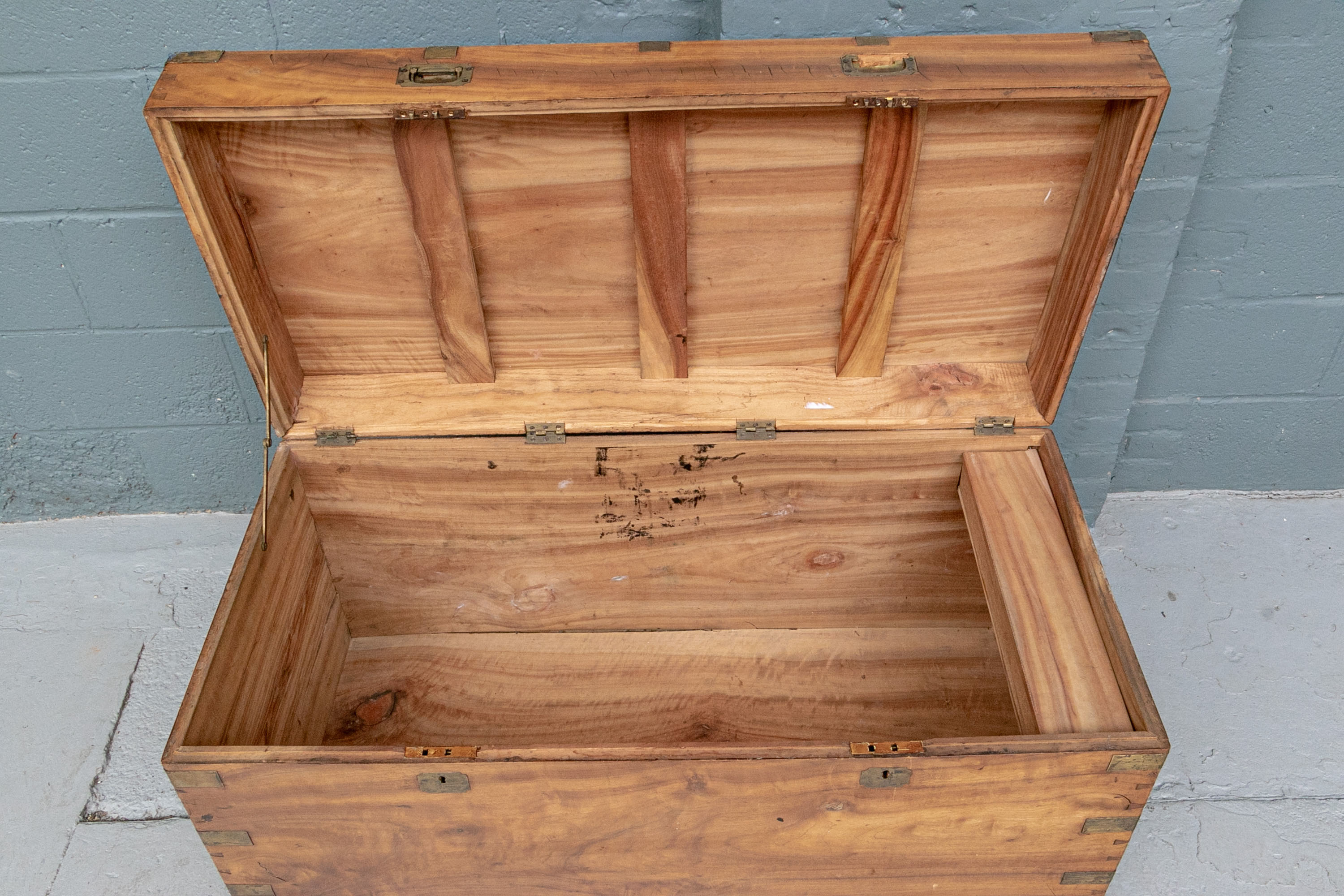 An antique camphor wood campaign style trunk with hand-cut dove tail joinery, recessed front handles, drop pull handles on sides, double locks with one working key, 4-hinge lid, metal corners and brackets, interior box with cover. With Key.