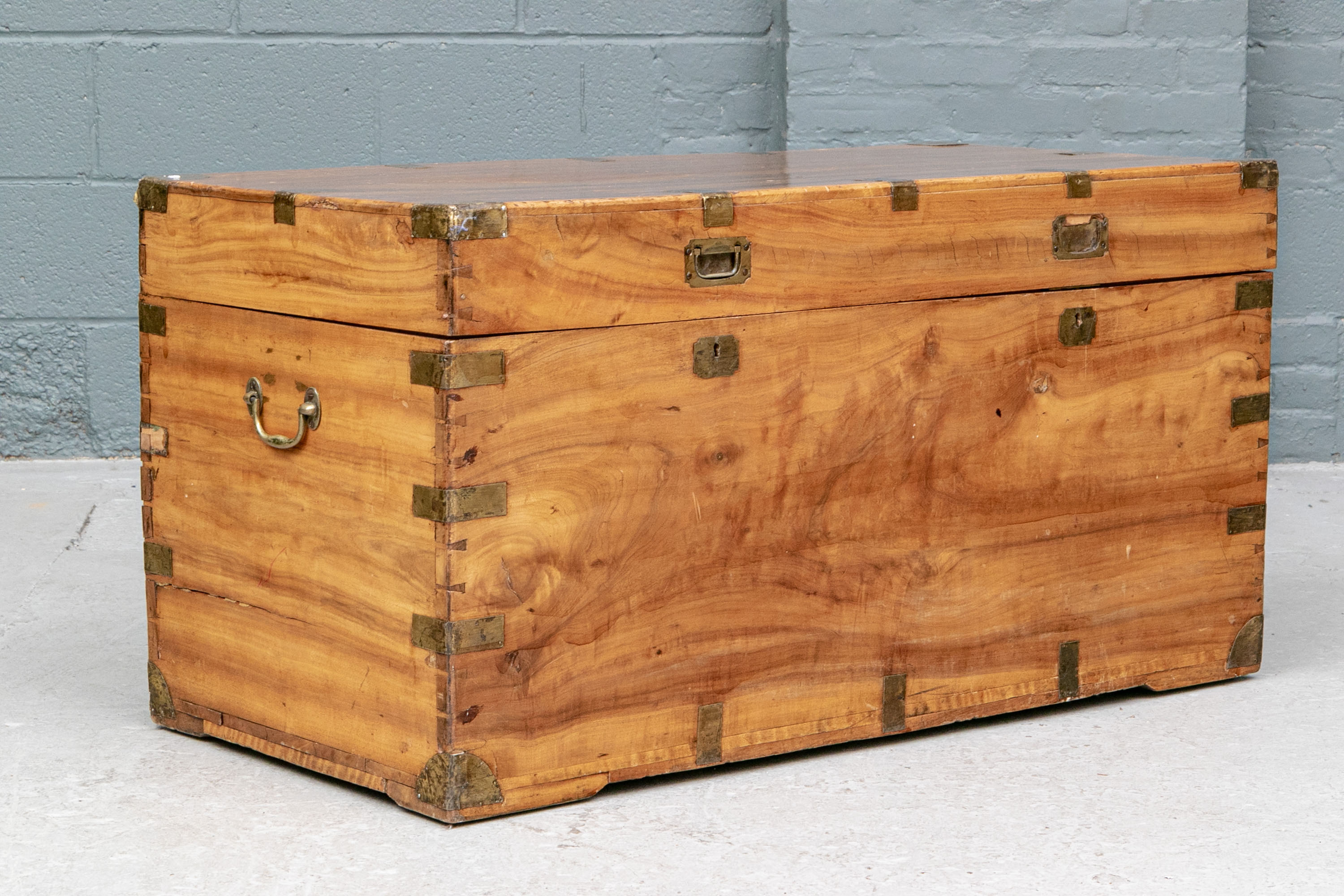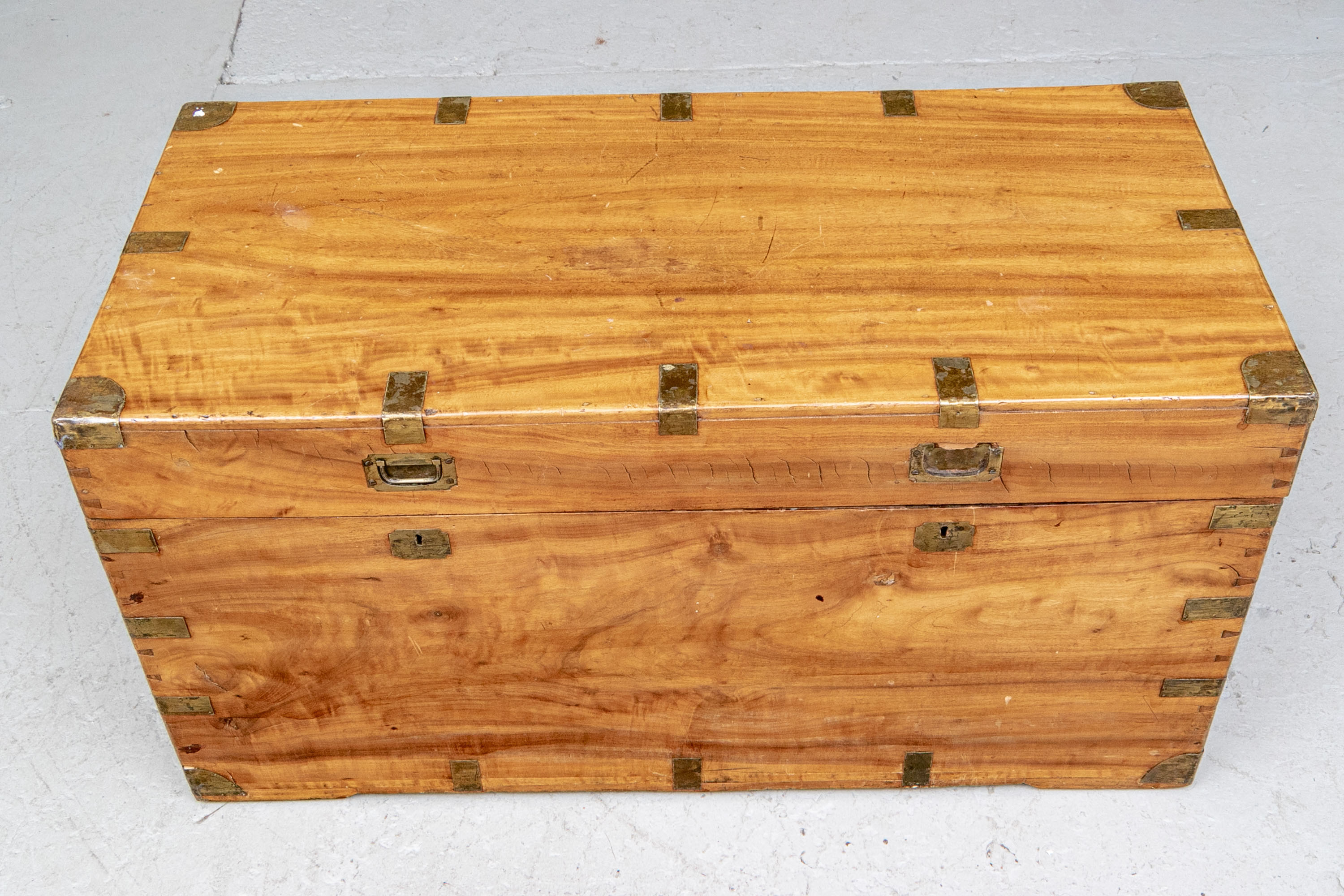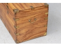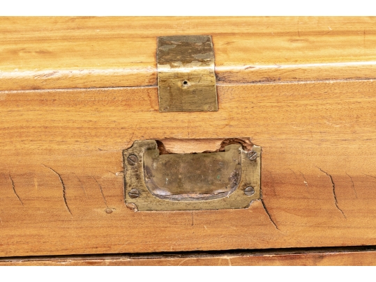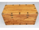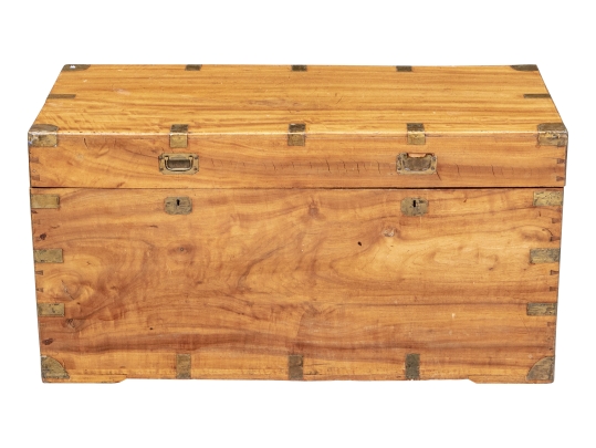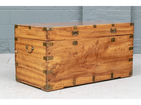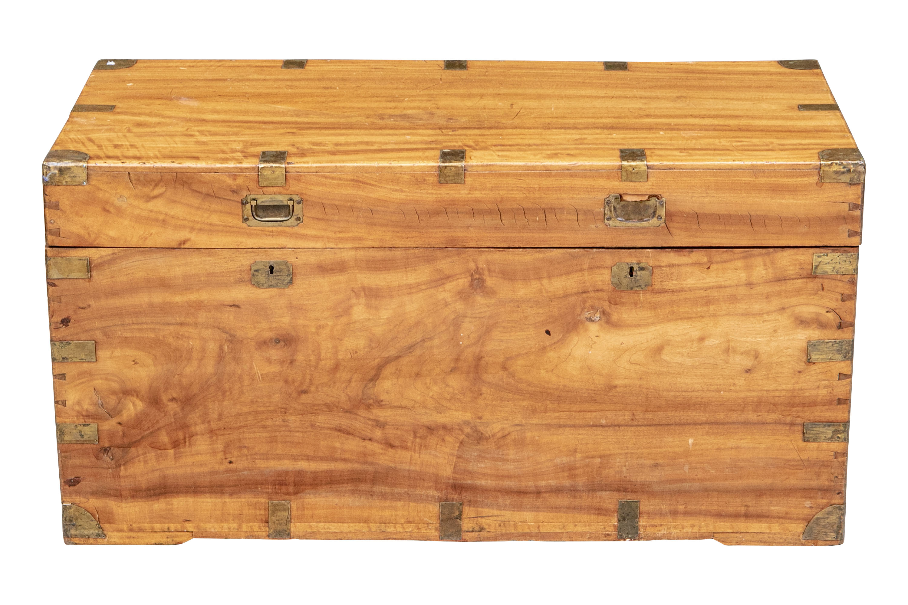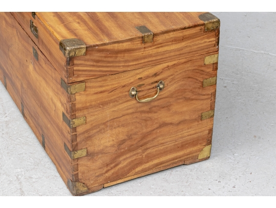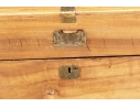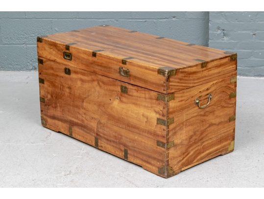 An antique camphor wood campaign style trunk with hand-cut dove tail joinery, recessed front handles, drop pull handles on sides, double locks with one working key, 4-hinge lid, metal corners and brackets, interior box with cover. With Key.