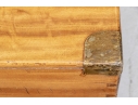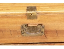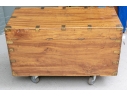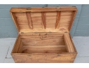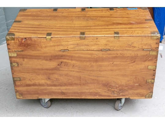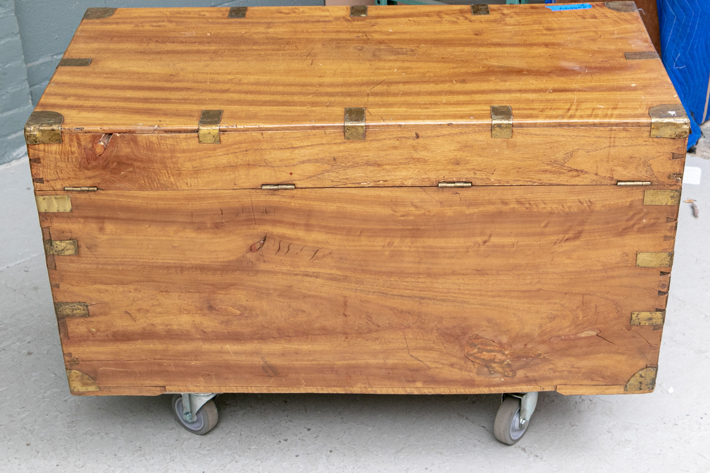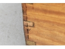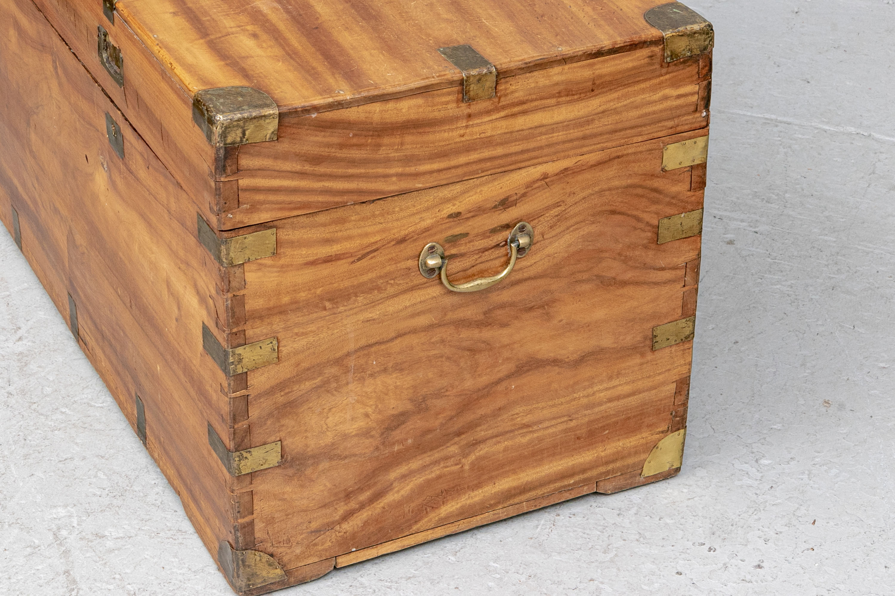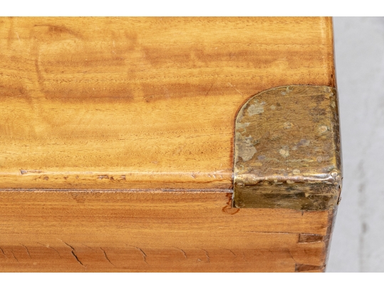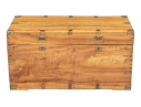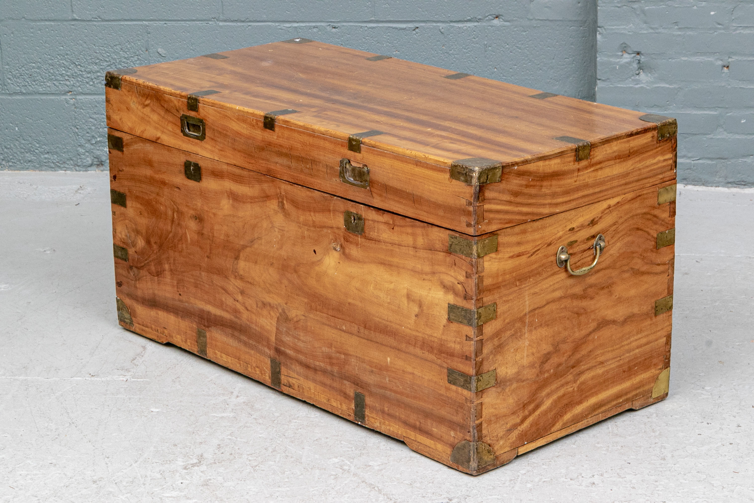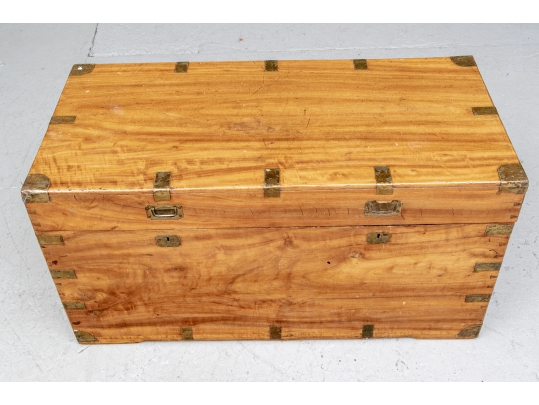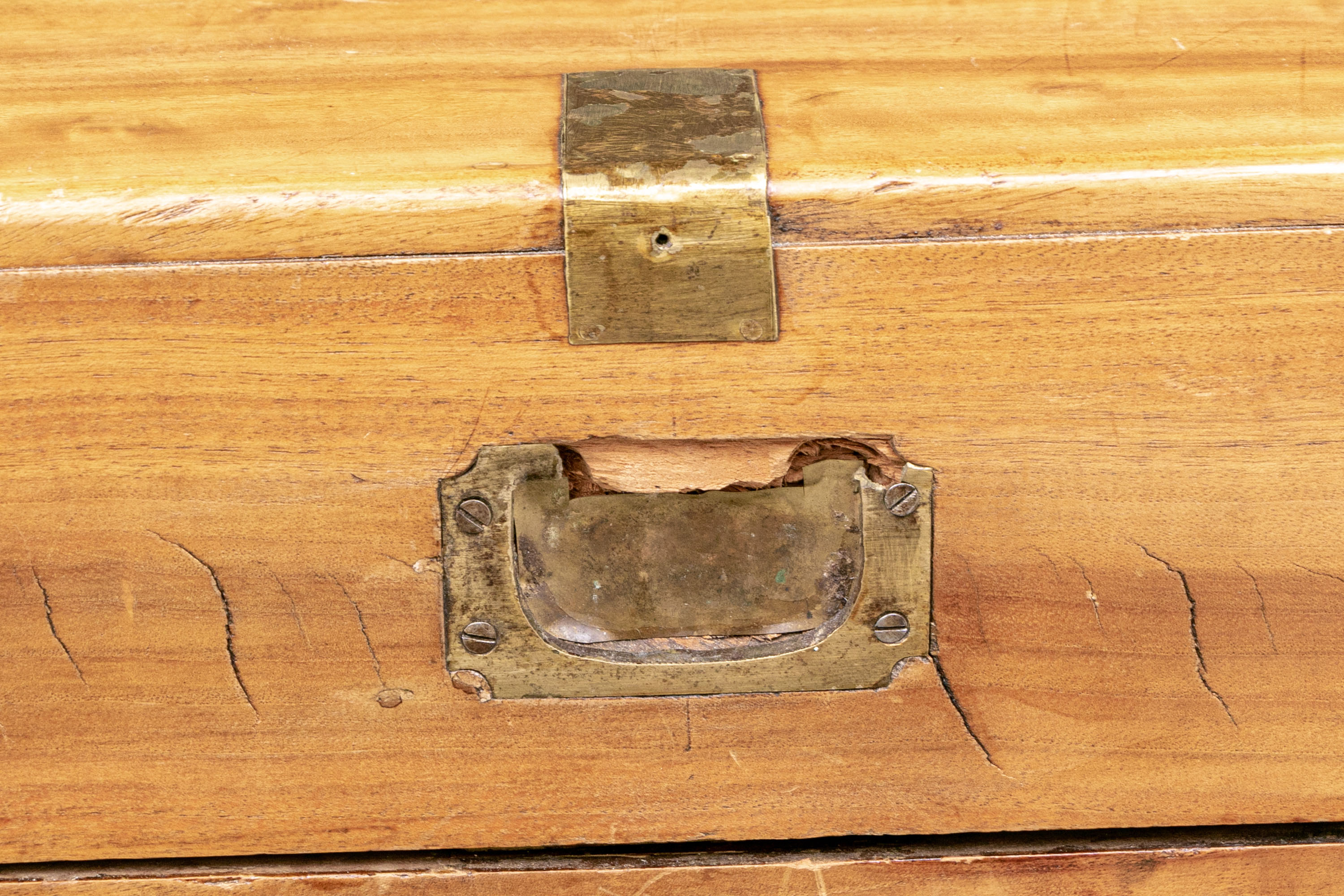 An antique camphor wood campaign style trunk with hand-cut dove tail joinery, recessed front handles, drop pull handles on sides, double locks with one working key, 4-hinge lid, metal corners and brackets, interior box with cover. With Key.