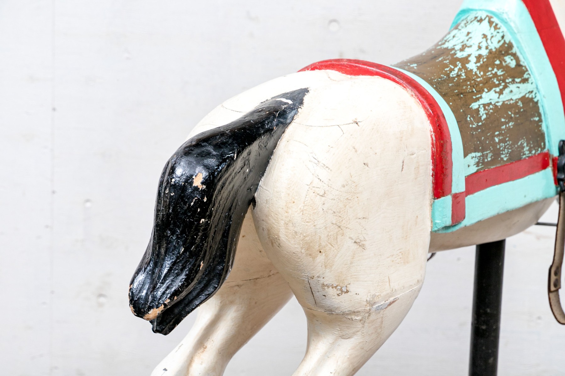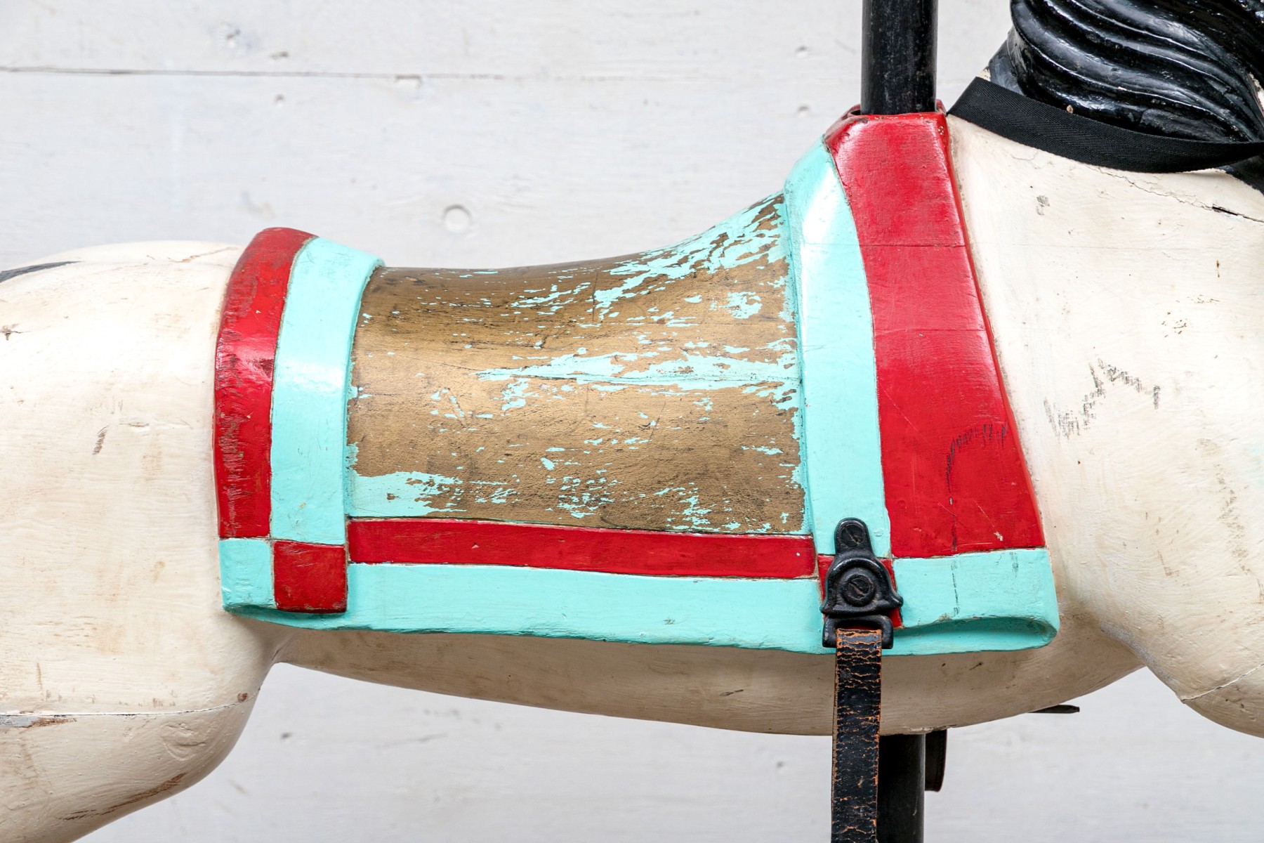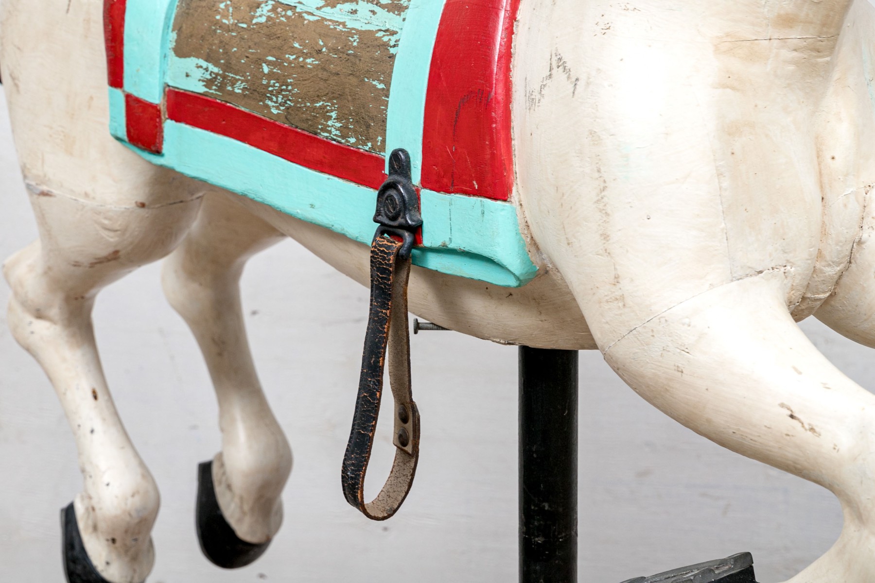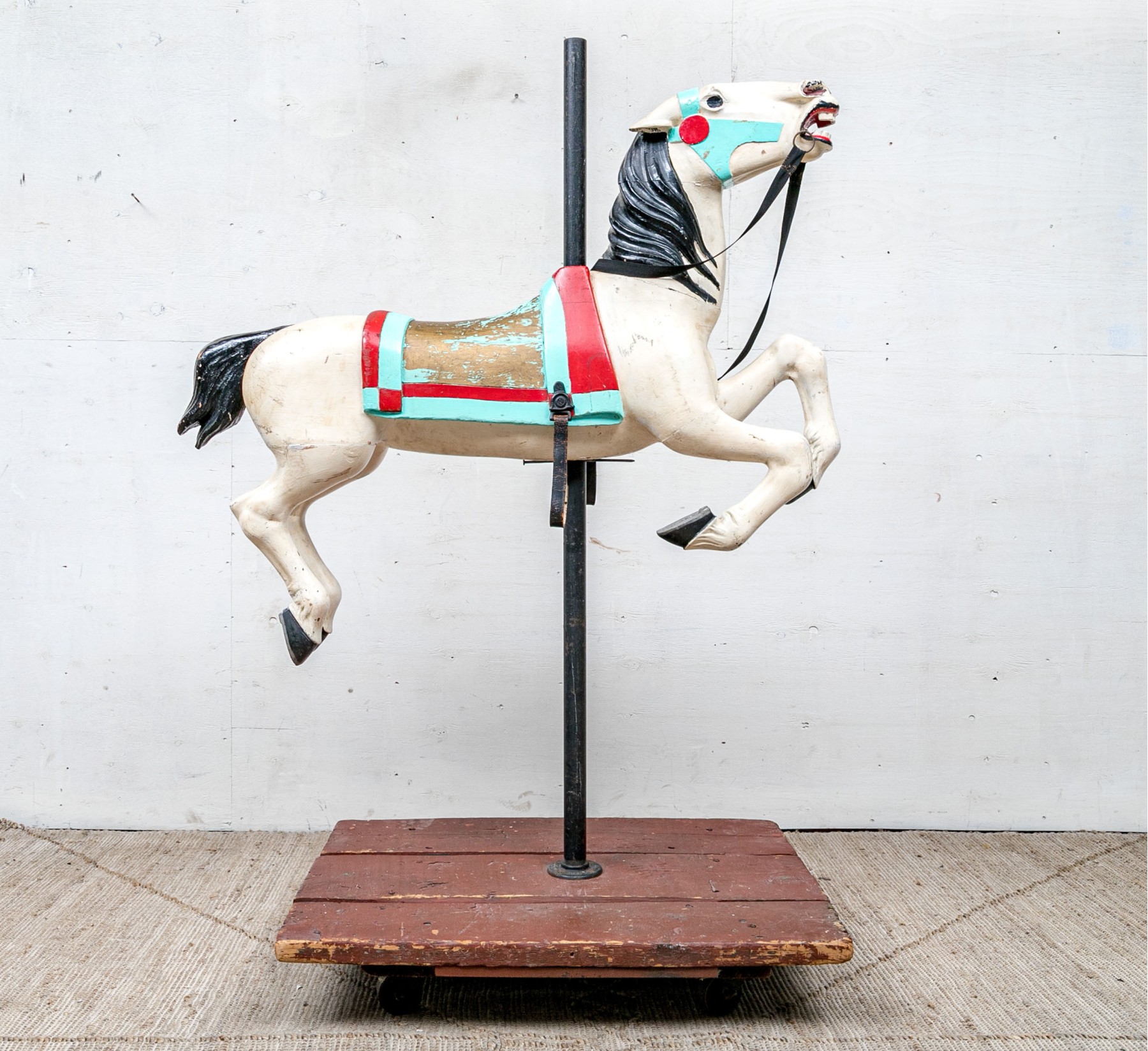 Ca. late 9th century. The horse painted white and black with aqua and red trappings and saddle. With black leather side loops and black ribbon reins. Mounted on a barn red painted base that is the floor of the carousel itself.