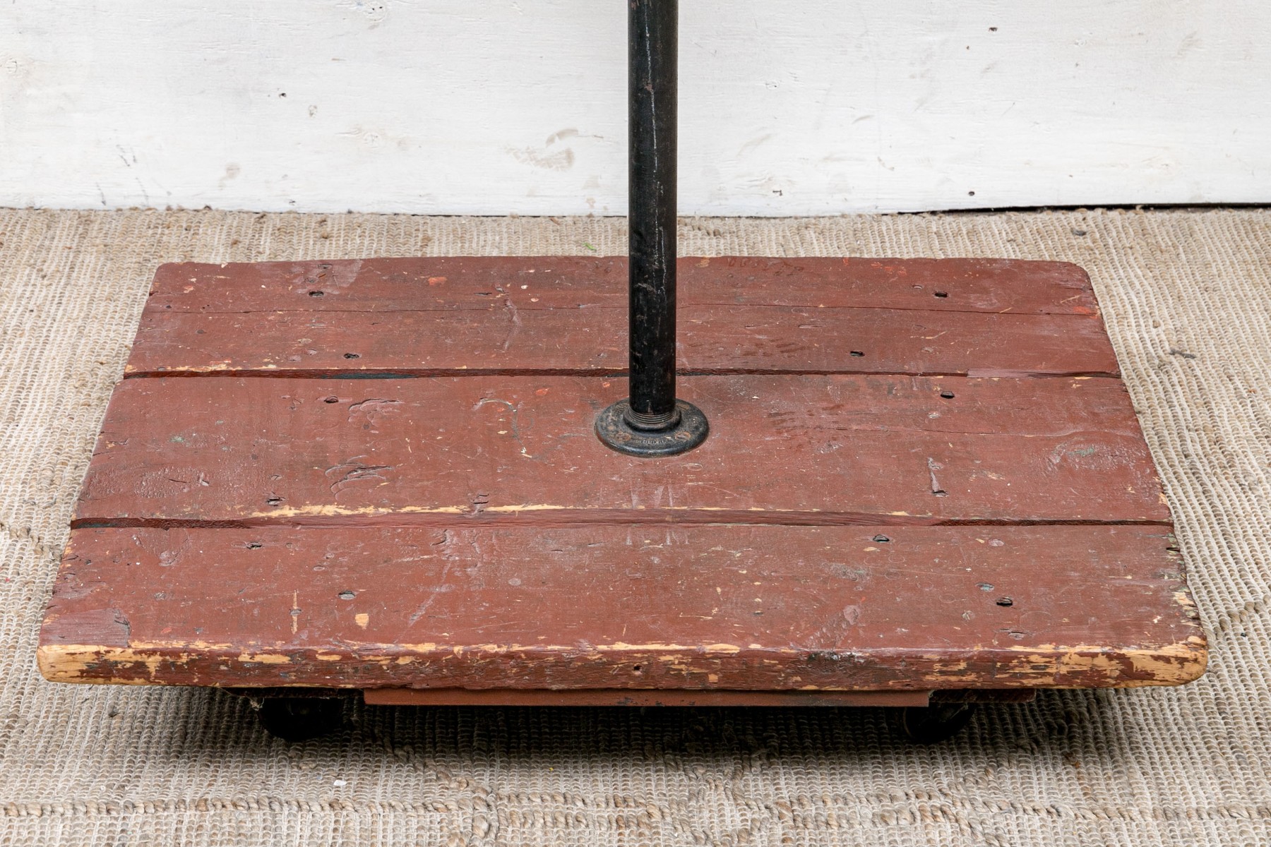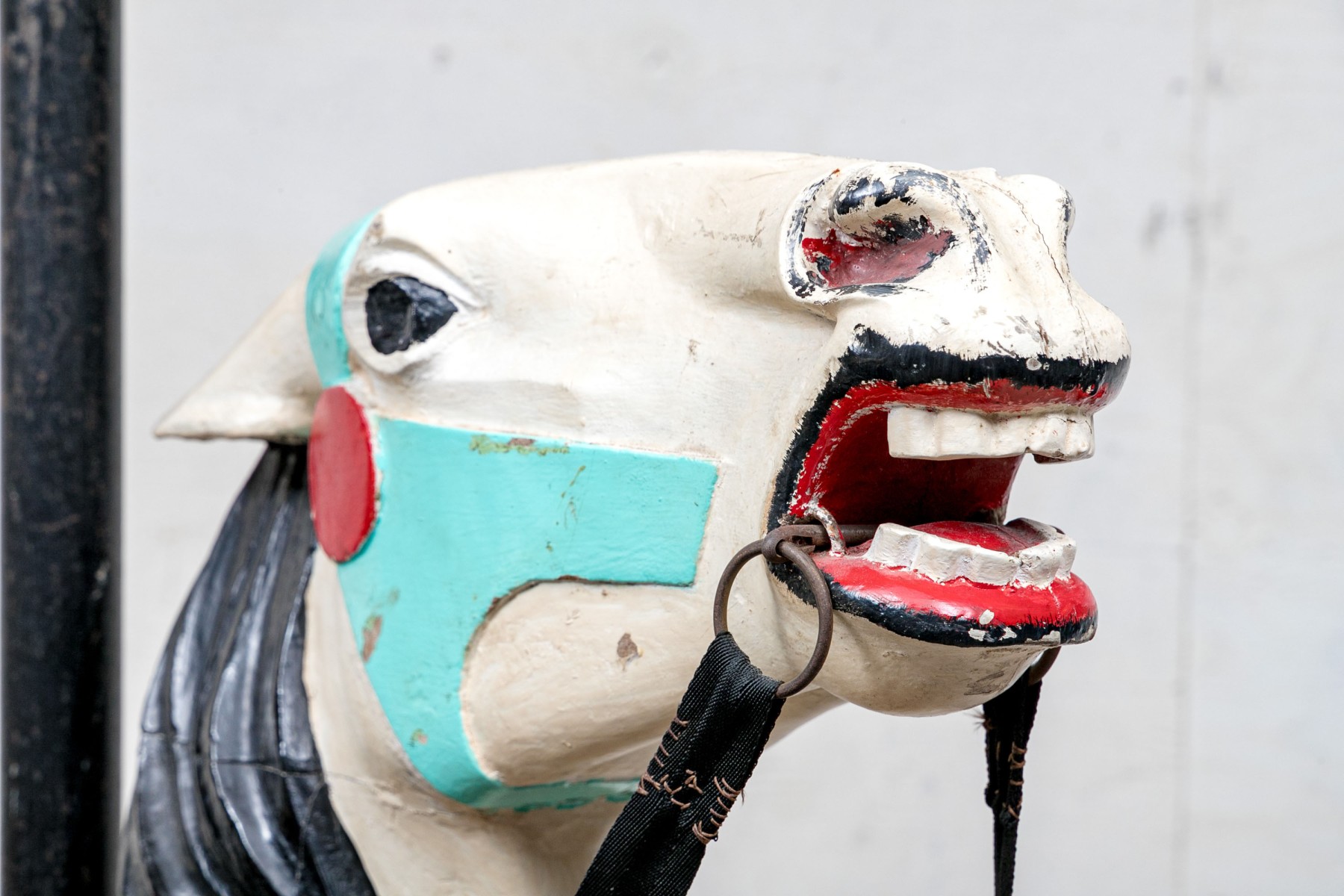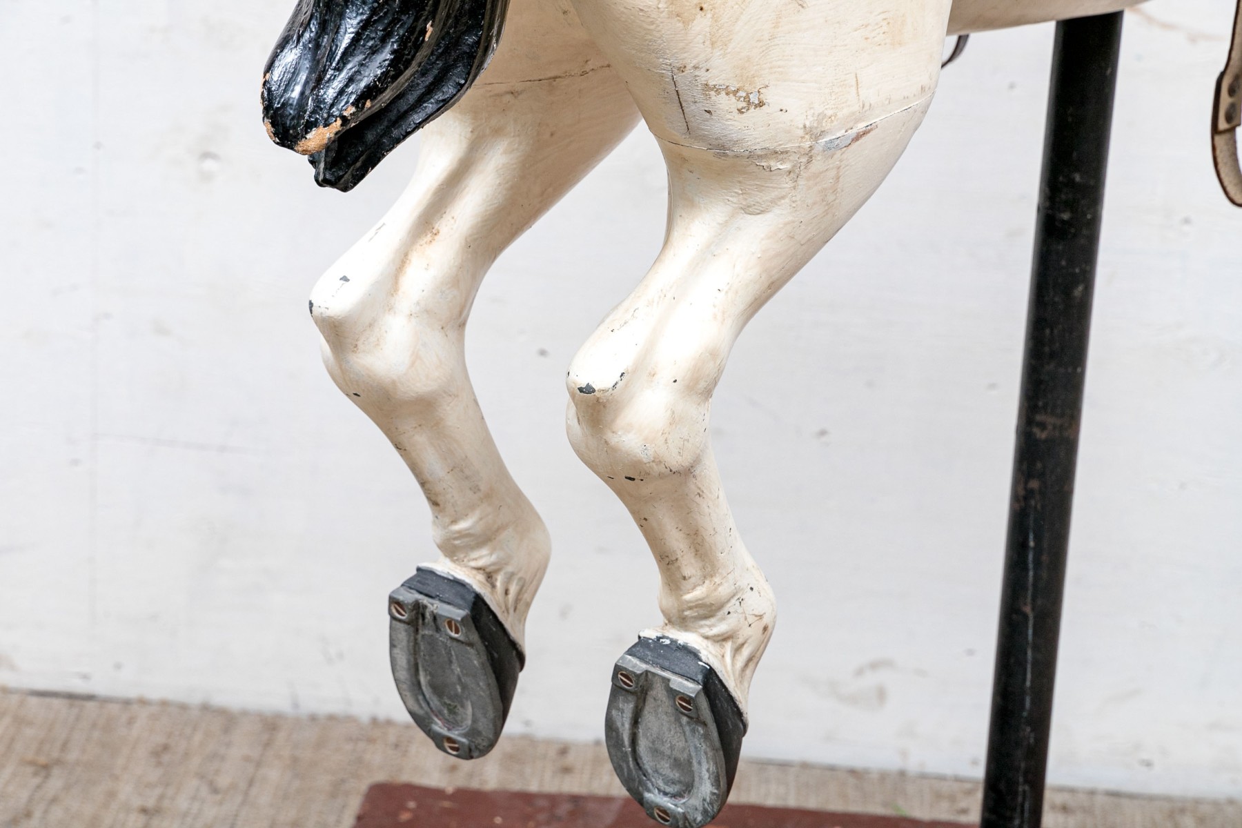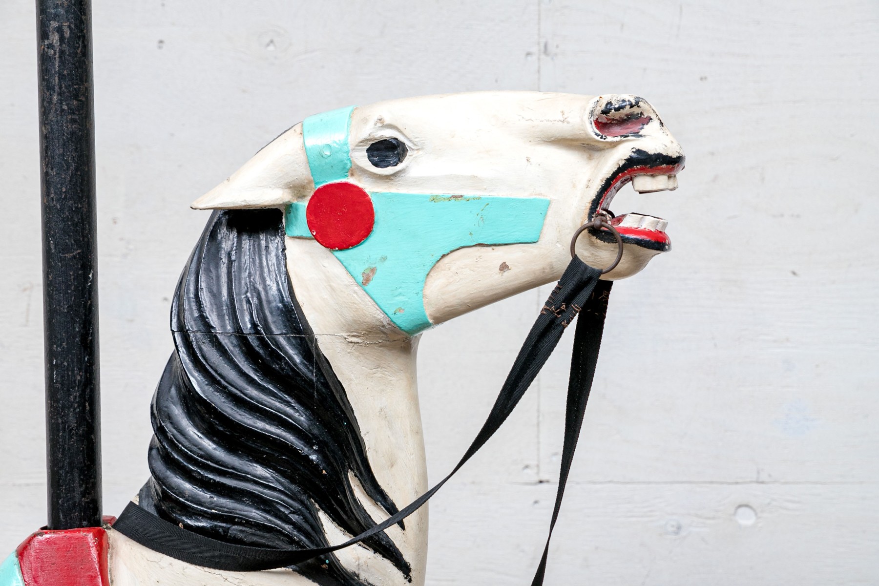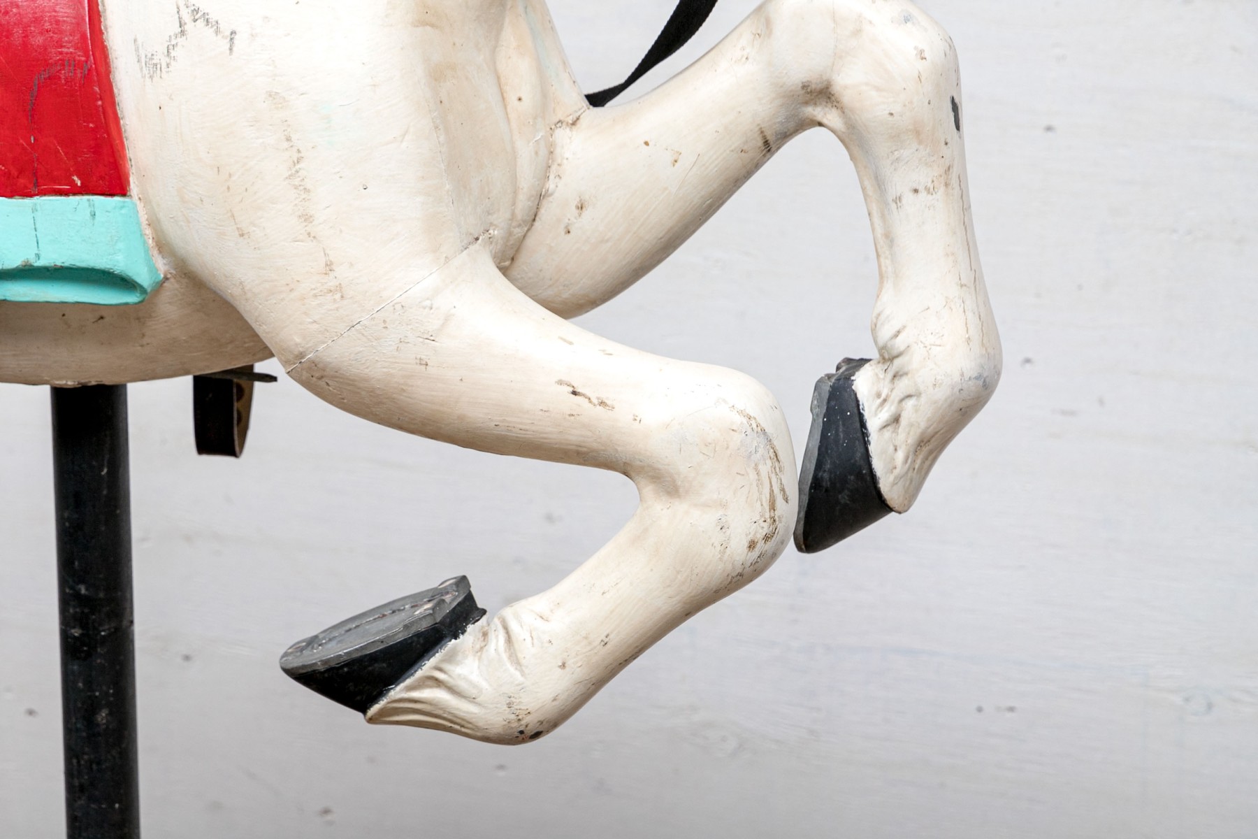 Ca. late 9th century. The horse painted white and black with aqua and red trappings and saddle. With black leather side loops and black ribbon reins. Mounted on a barn red painted base that is the floor of the carousel itself.