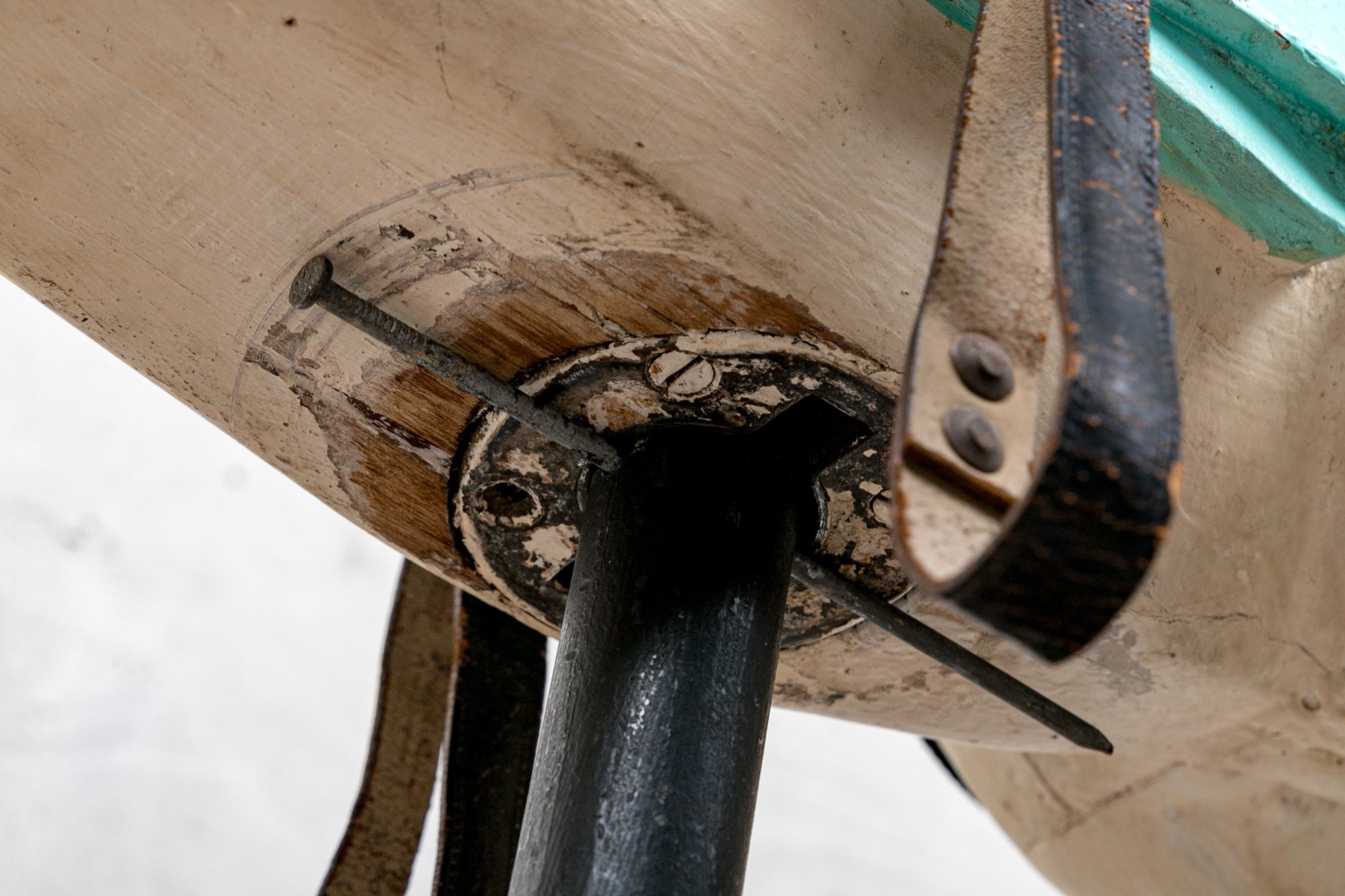 Condition: well-worn saddle, some cracks and wear to the paint. Worn leather. The base worn with chips. Please review the photos as they are part of the condition report.
