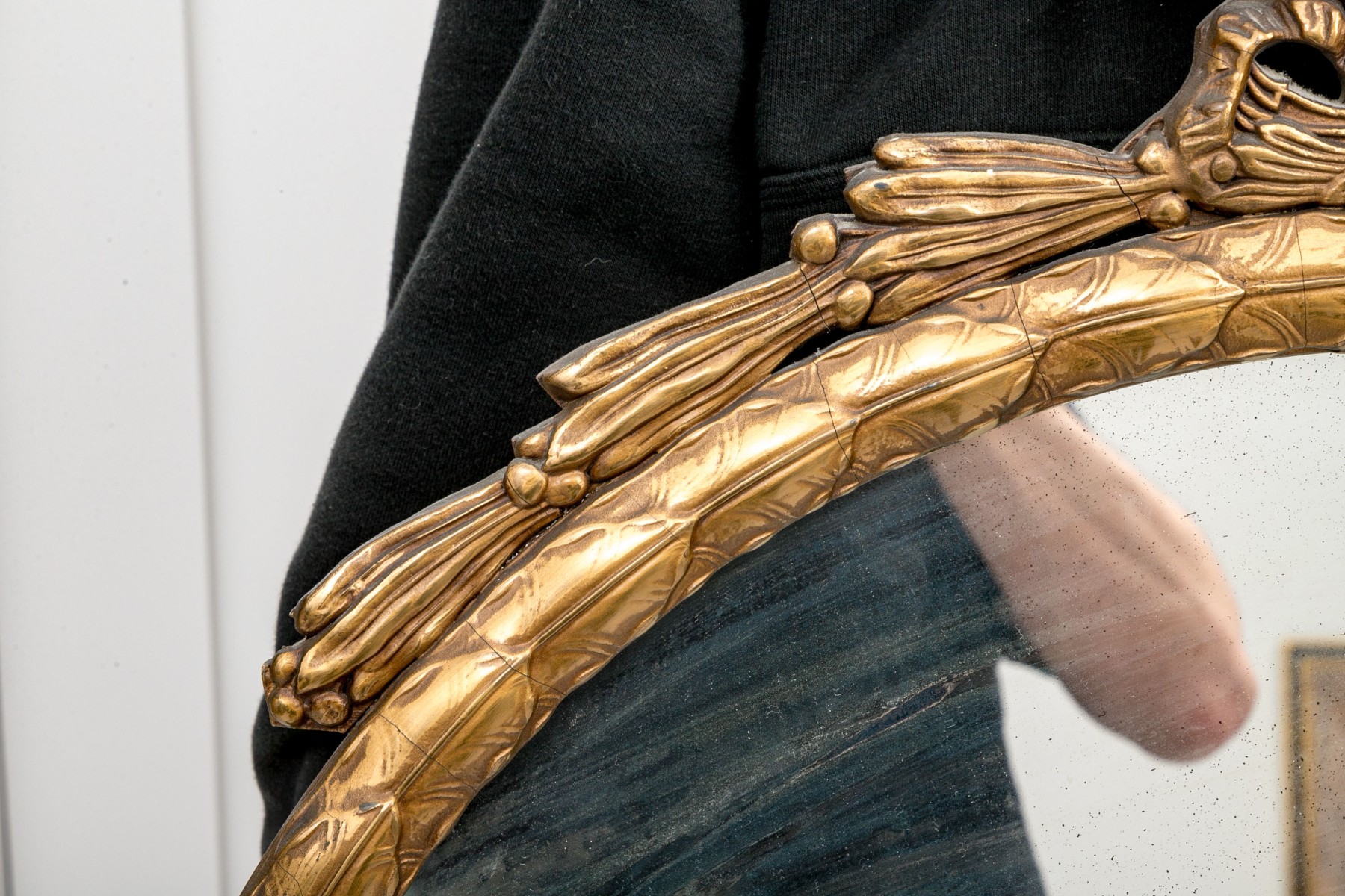 The circular mirrors with a carved and gilt leafy surround and an eagle crest perched on berries and leaves. The terminal with a center ornament on the matching berries and leaves.