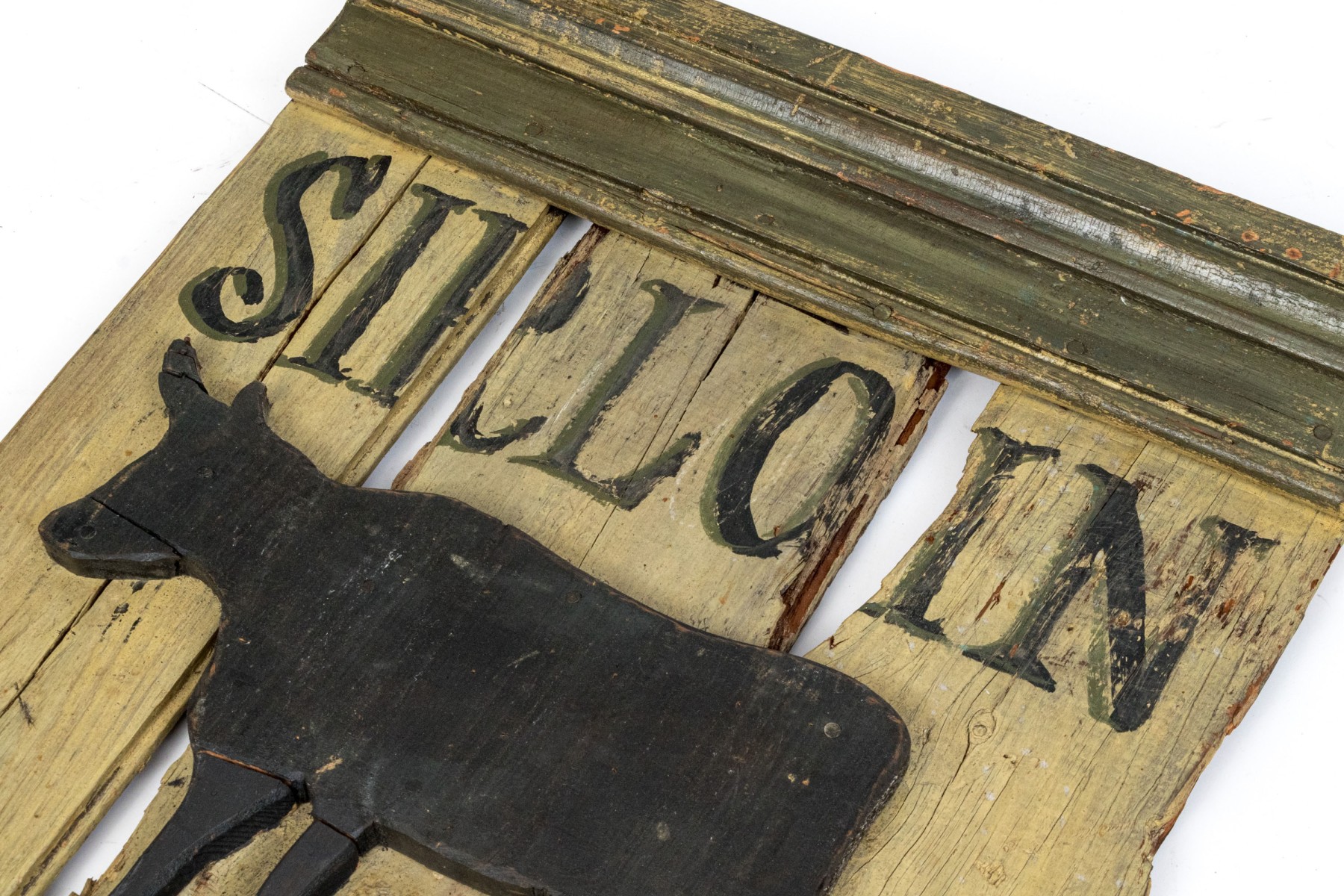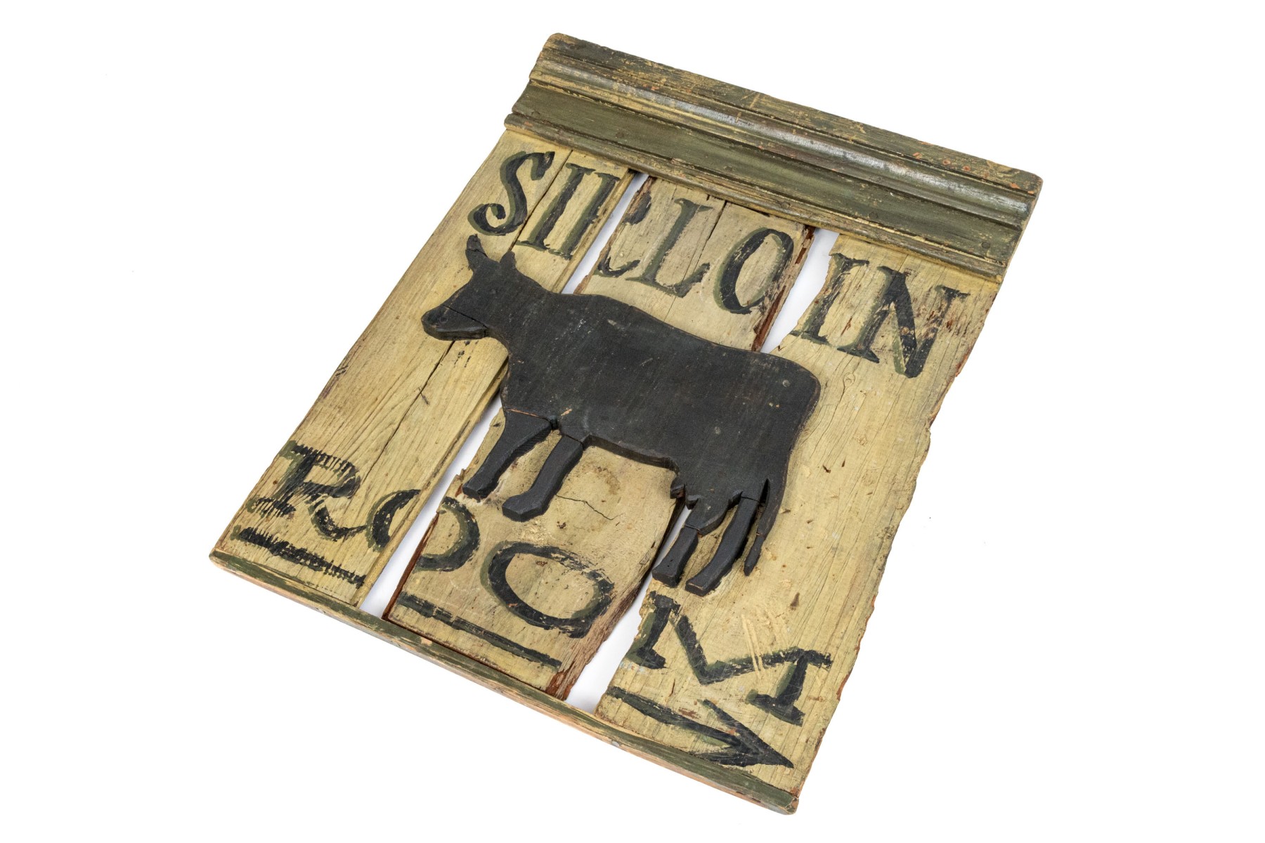 A panel constructed sign with a molding at the top and an attached raised black painted image of a steer.
