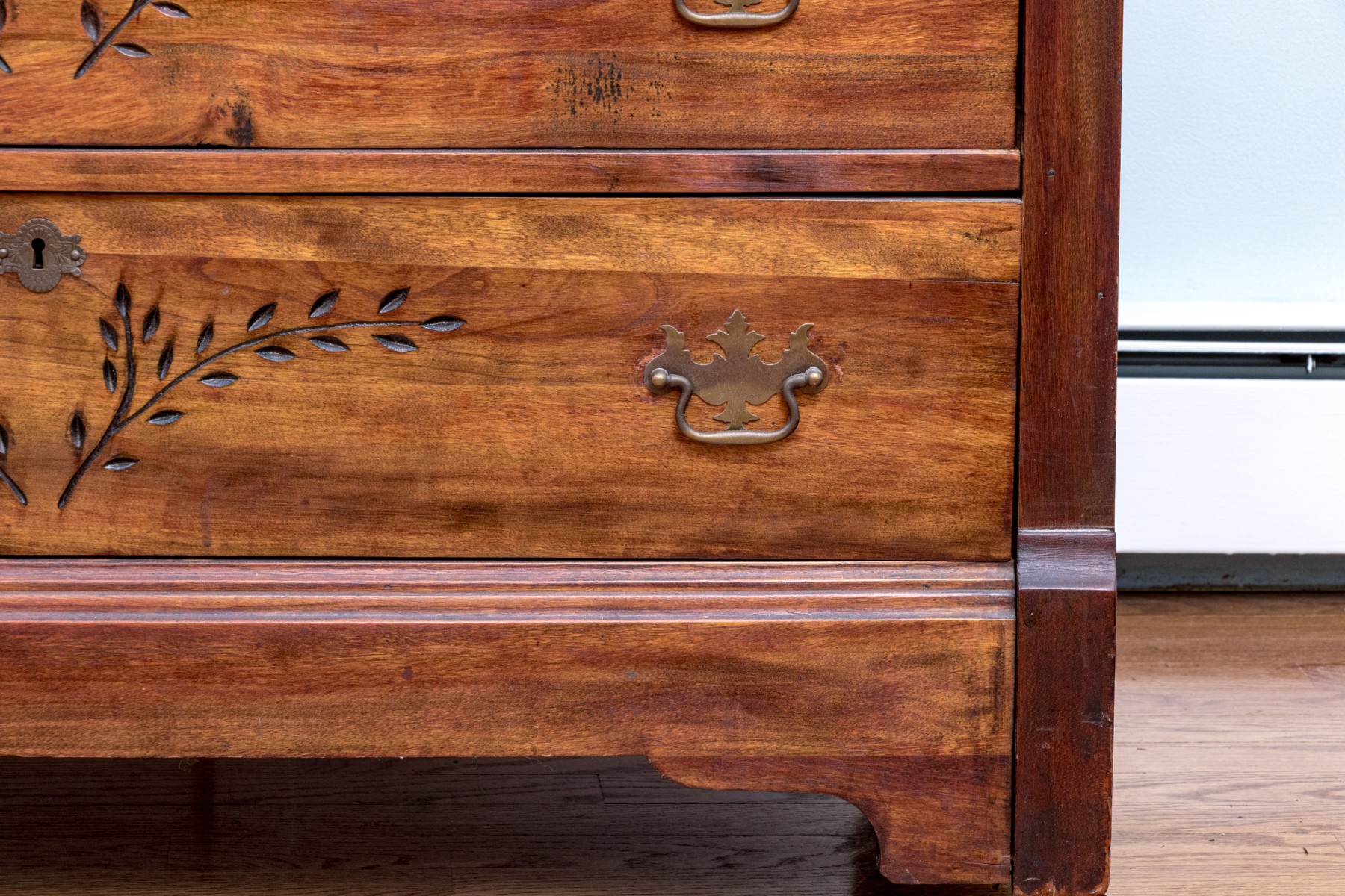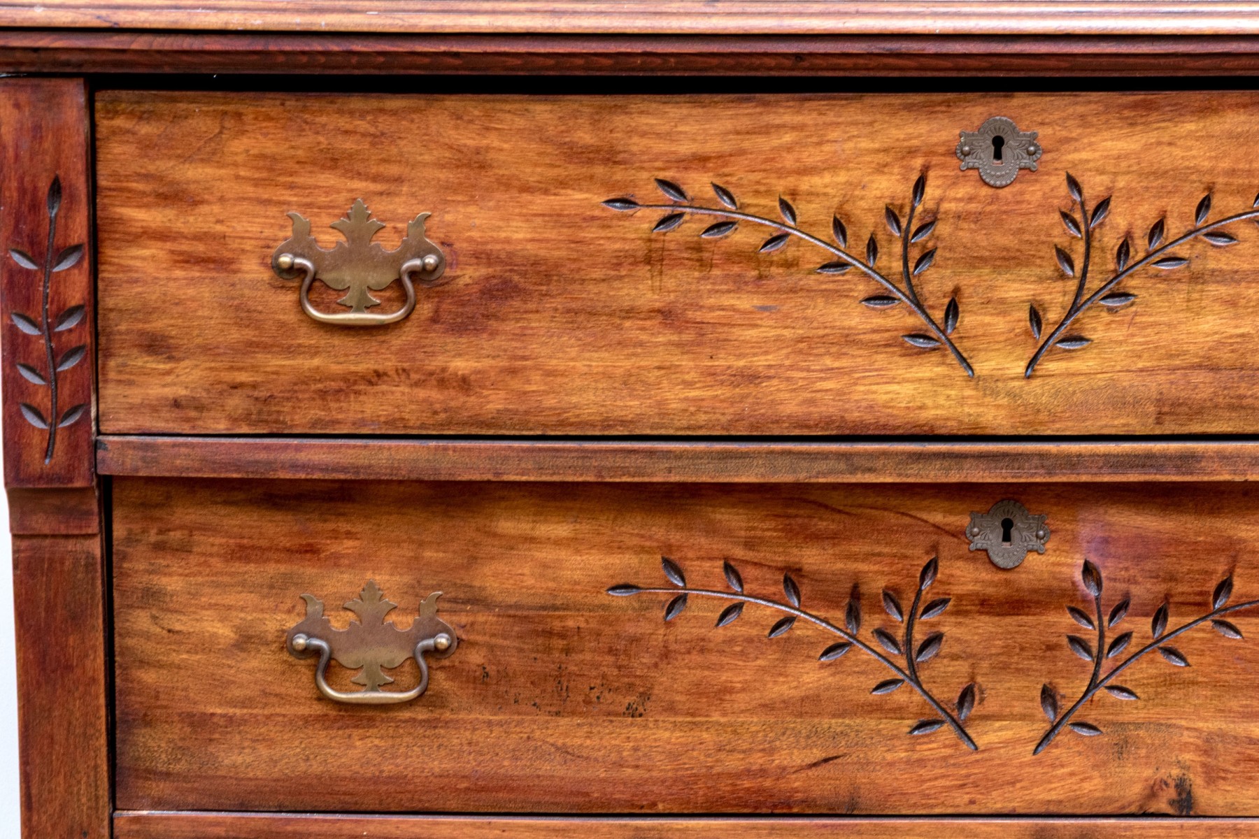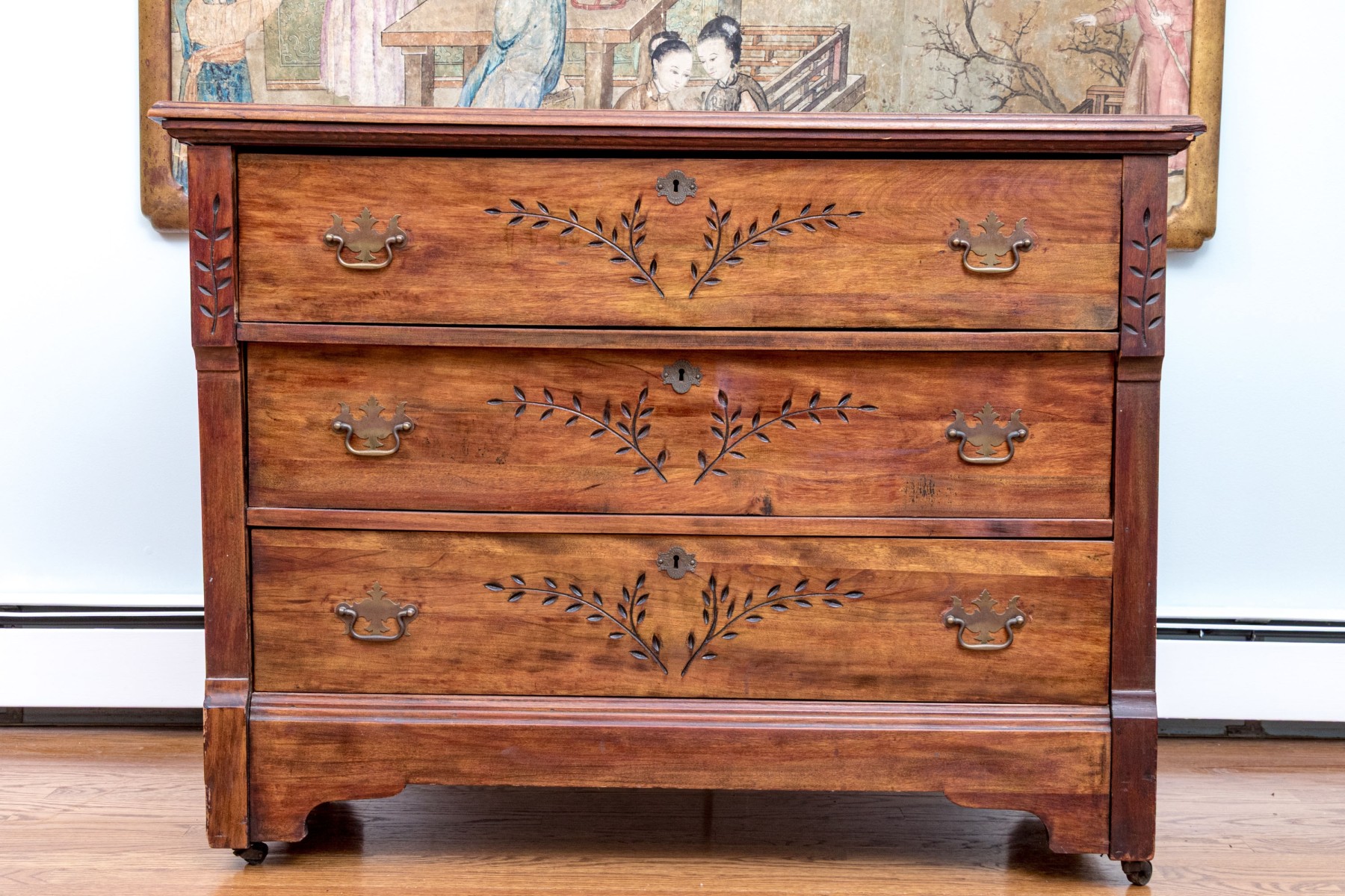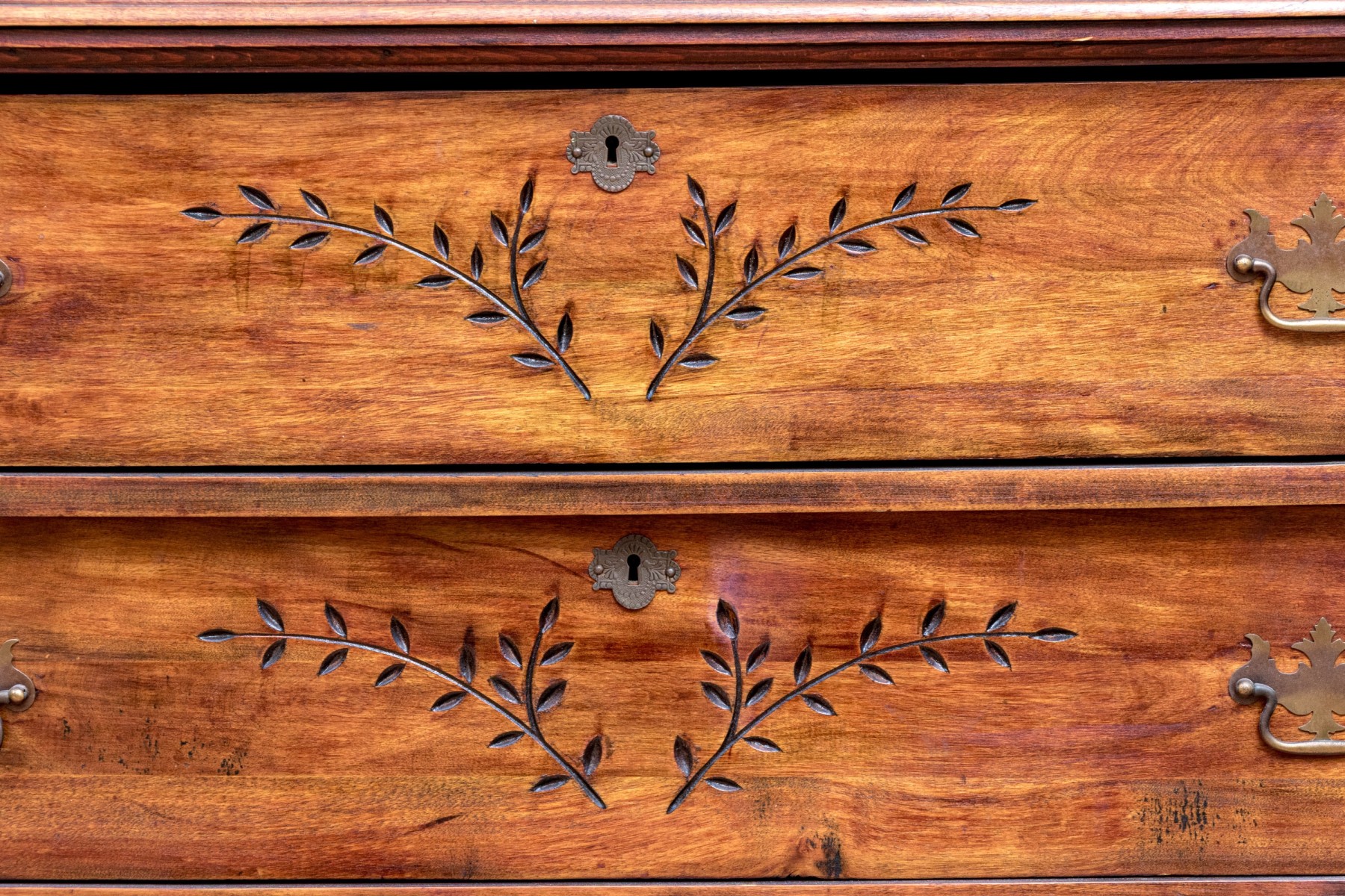 A fabulous chest of drawer beautifully balancing homey rustic appeal with elegant Chippendale and Georgian style. The chest is well crafted out of warm-toned medium brown wood with a rectangular top sporting a beveled edge, over a case of three drawers with carved foliate sprigs at the center and double brass bail handles on batwing plaques. Raised with a bracketed apron over casters for easy mobility.