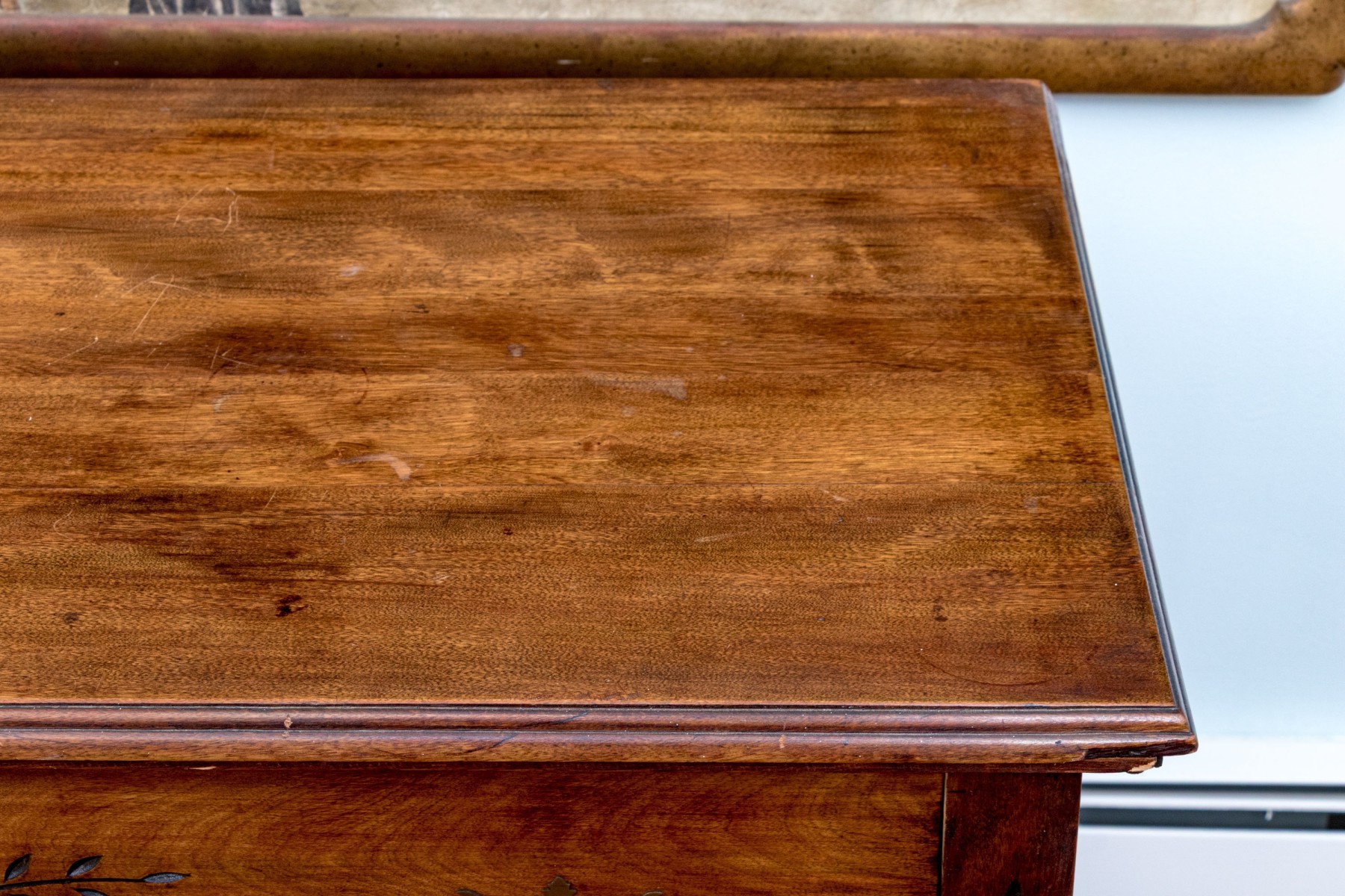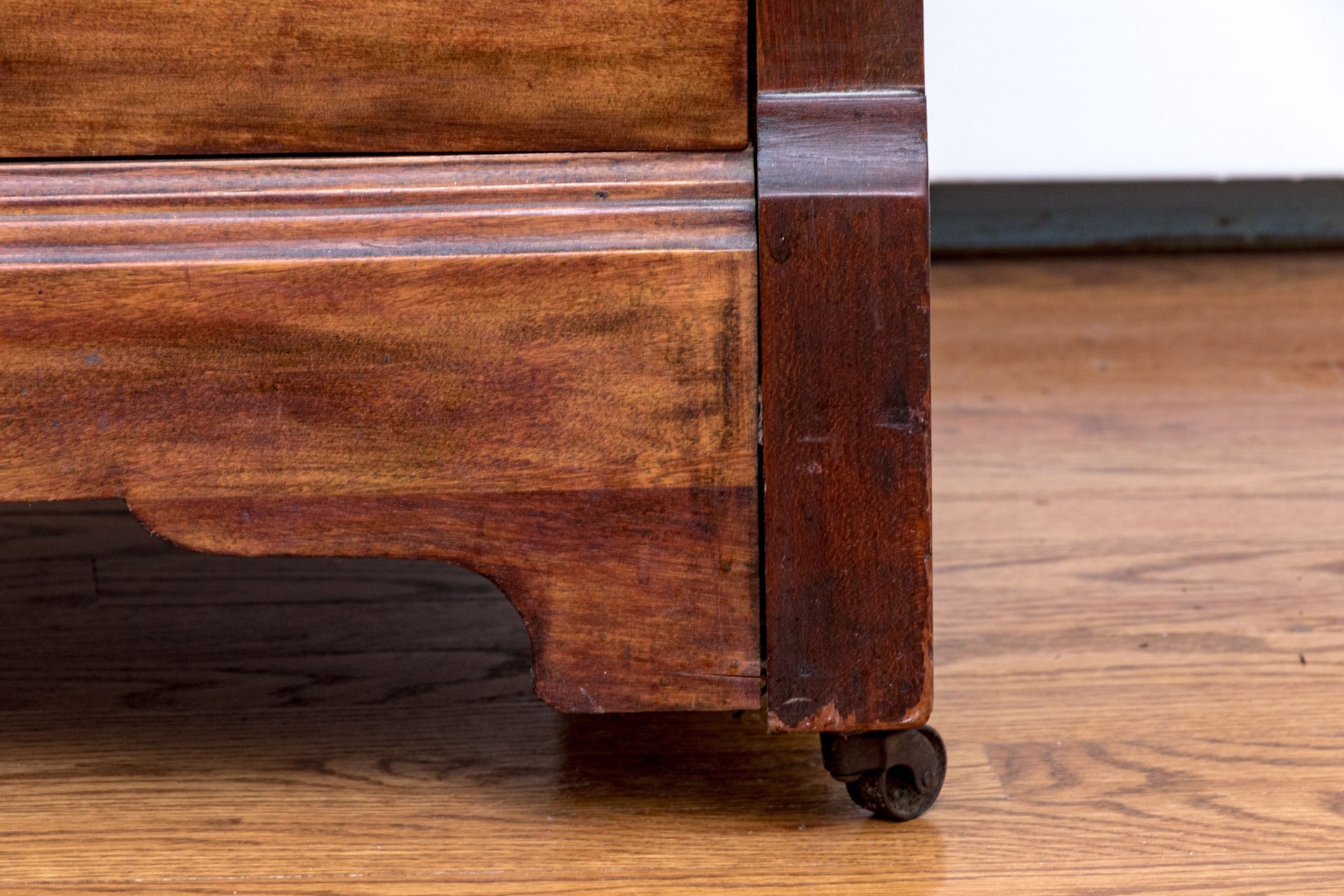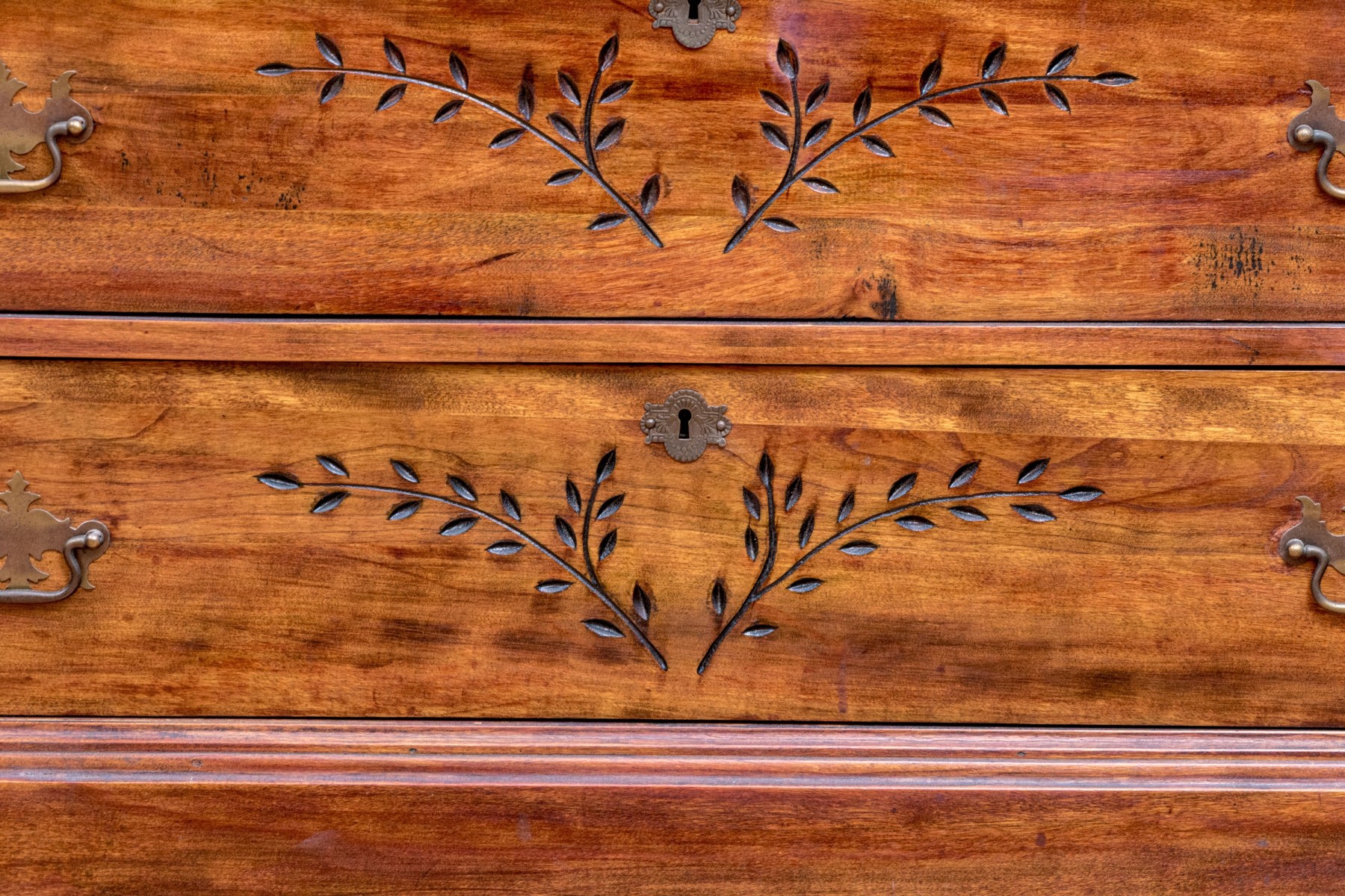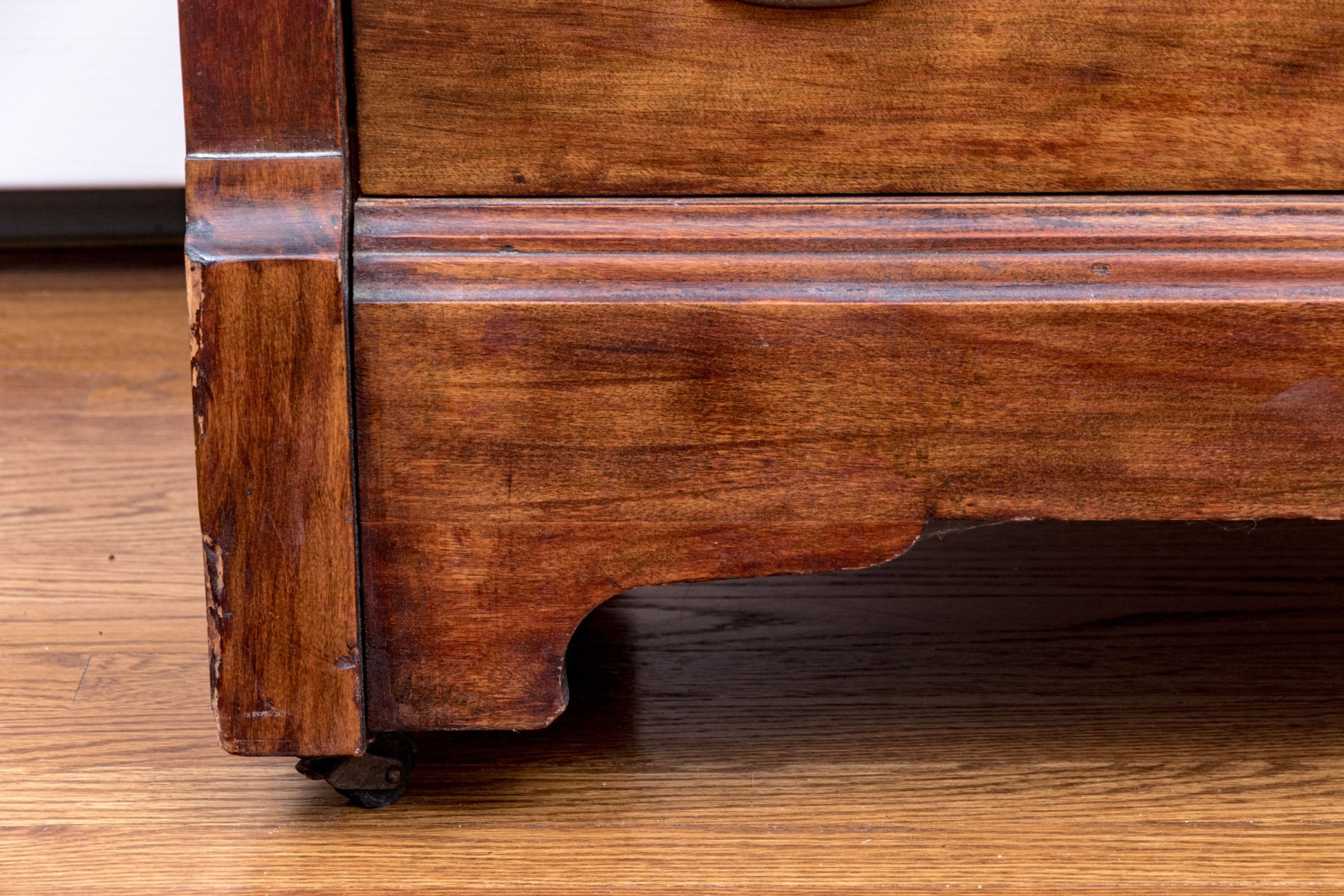 A fabulous chest of drawer beautifully balancing homey rustic appeal with elegant Chippendale and Georgian style. The chest is well crafted out of warm-toned medium brown wood with a rectangular top sporting a beveled edge, over a case of three drawers with carved foliate sprigs at the center and double brass bail handles on batwing plaques. Raised with a bracketed apron over casters for easy mobility.