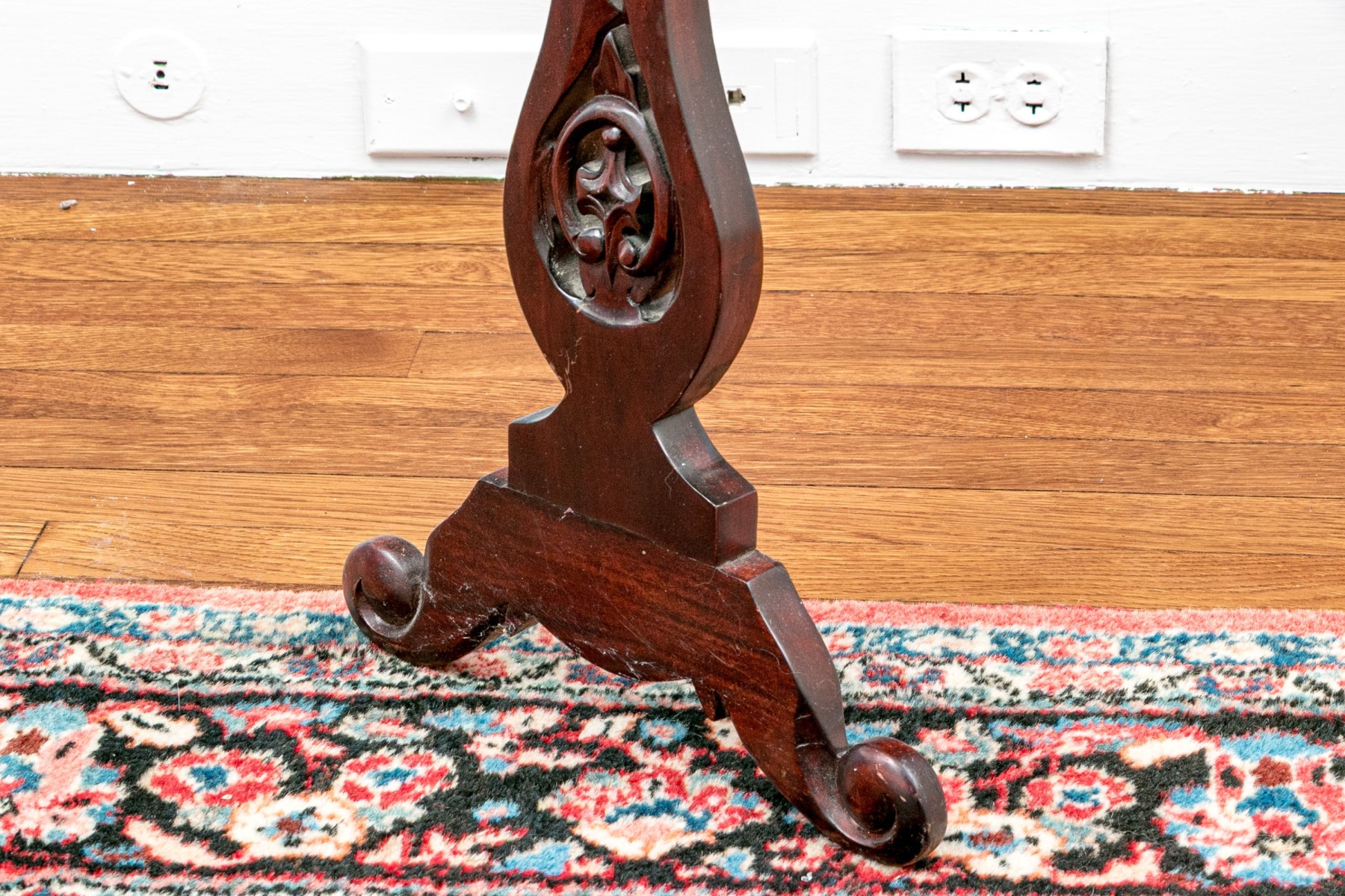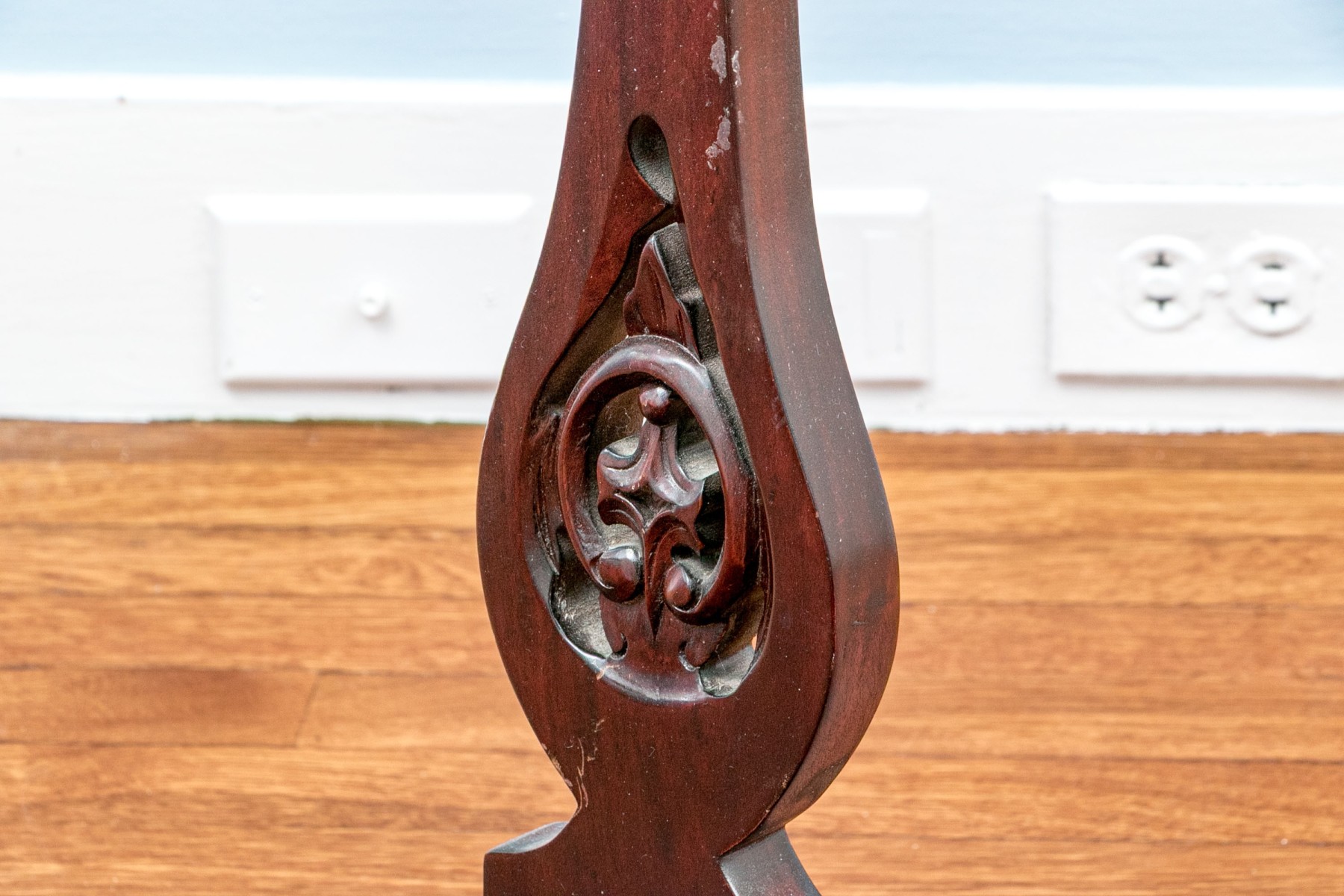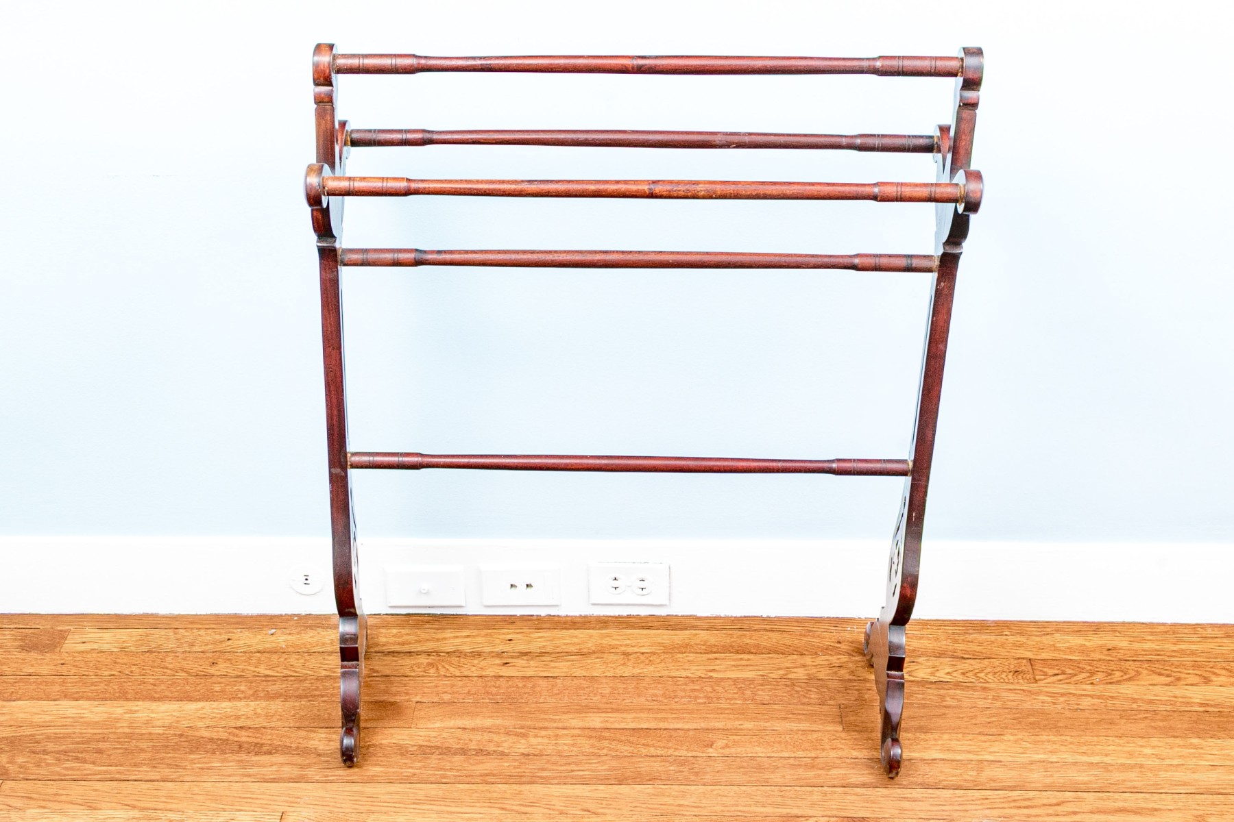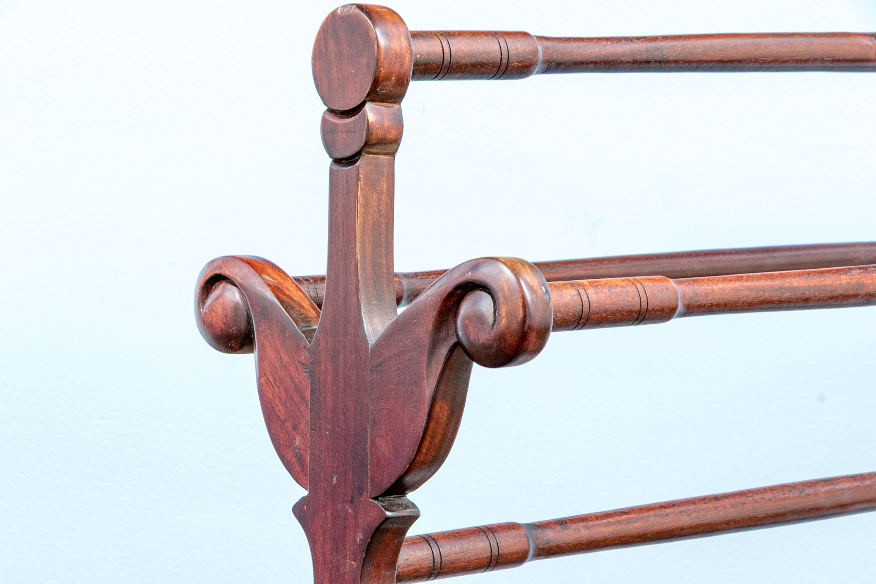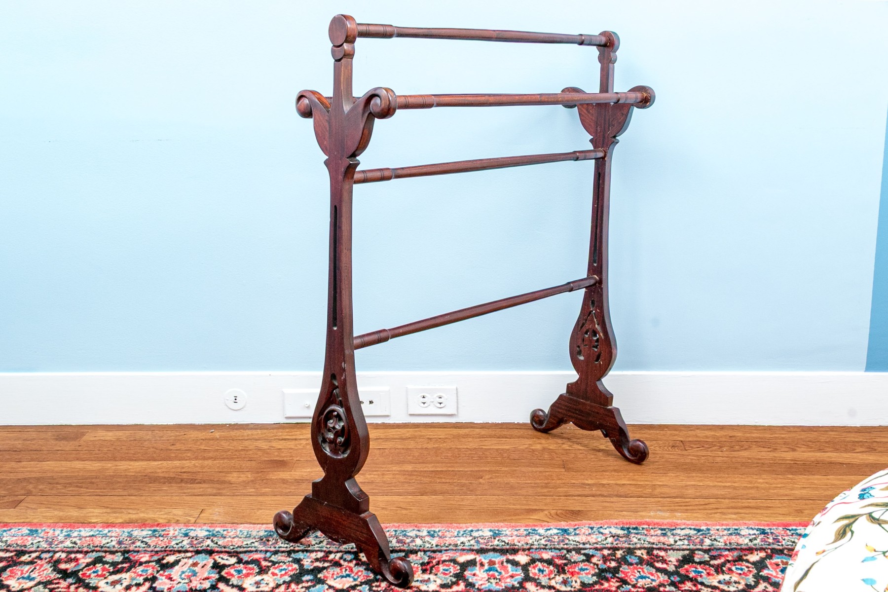 On two carved ends with scrolled feet and pierced openwork below turned support rising up to the trefoil form top with three turned poles. A wonderful antique blanket rack in rich, red-brown finished mahogany. The rack features five dowels with tiers supported by a floral carved trestle. The trestles features a tulip-shaped head over tapered, baluster form sides beautifully carved with scrolled and foliate motifs. Dainty scrolled feet complete the design.