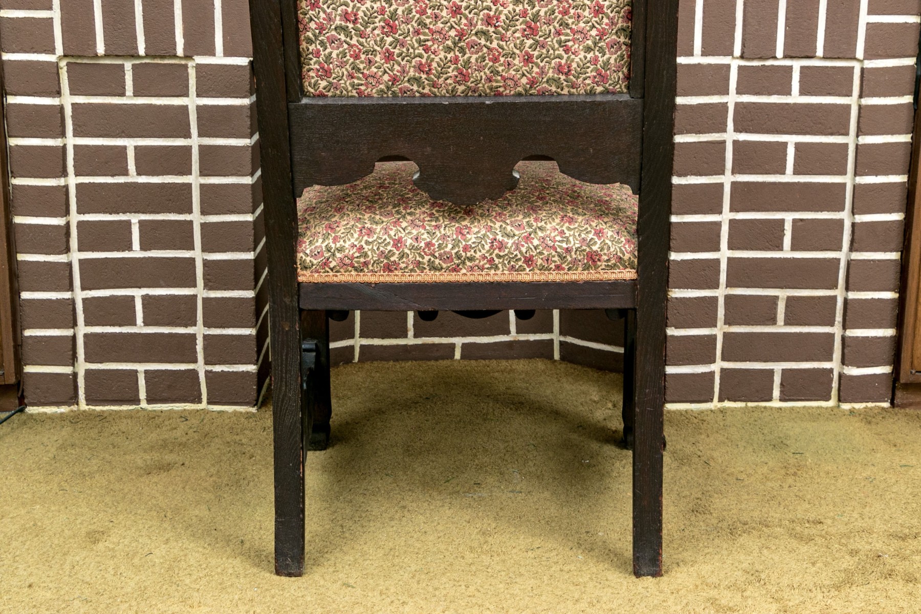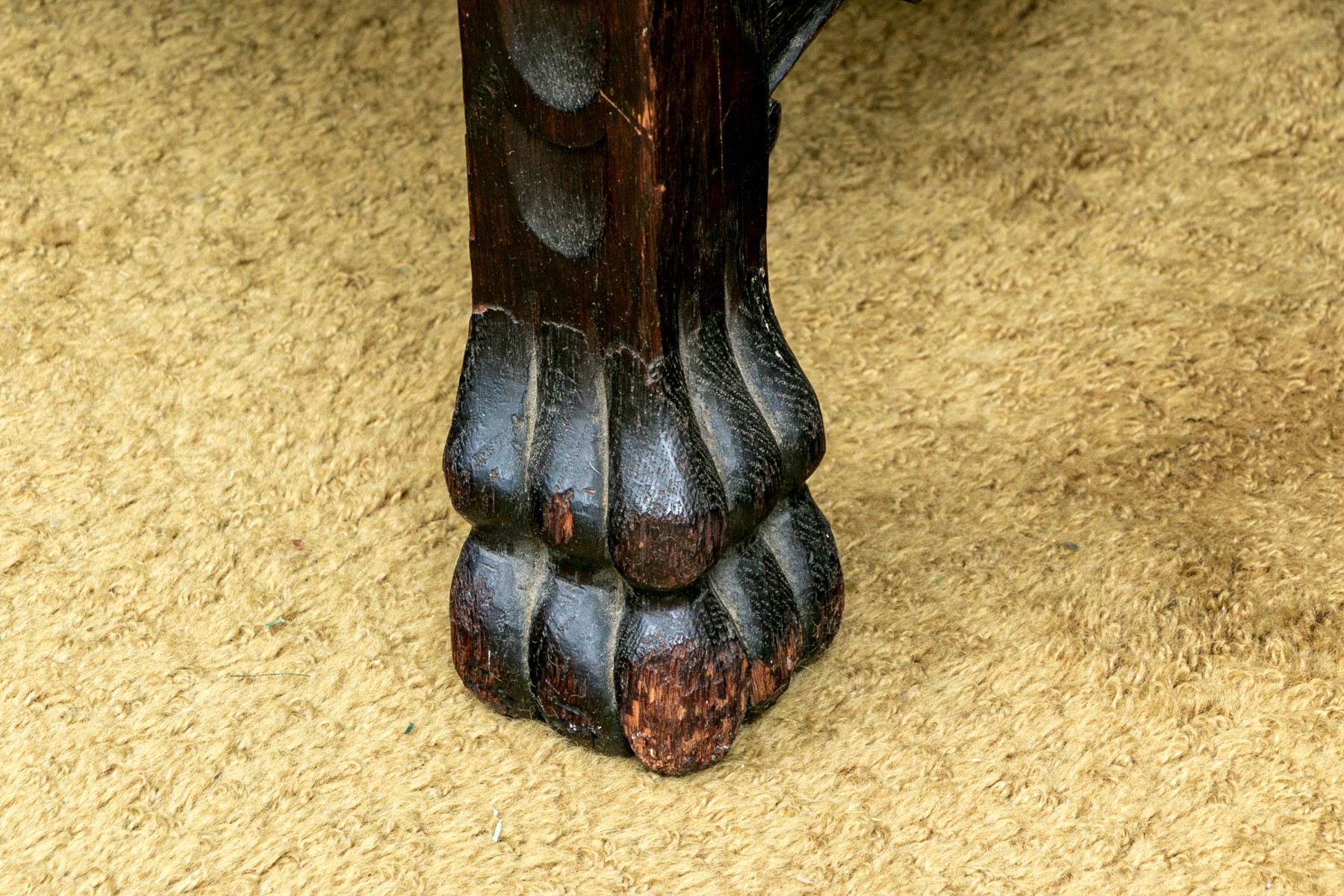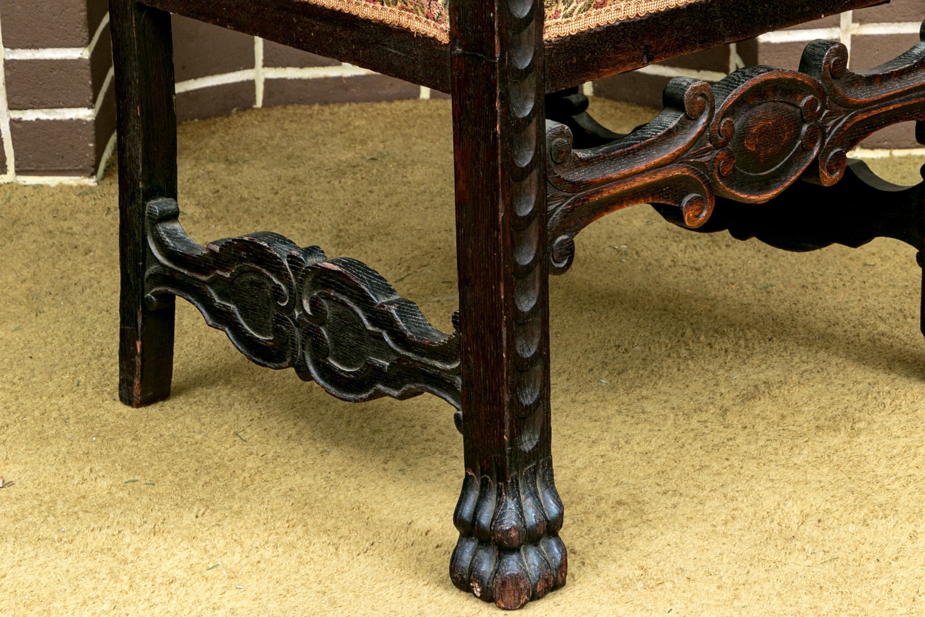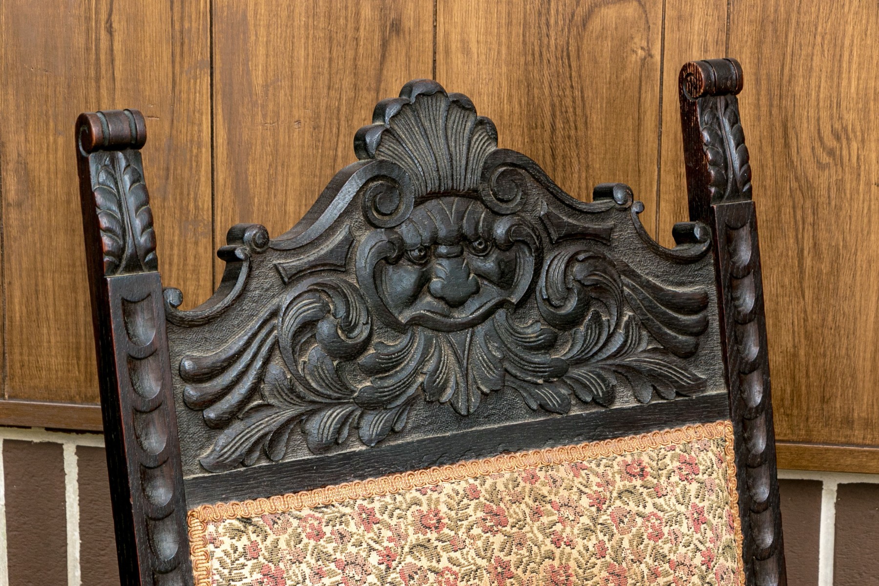 With tall scrolled supports and carved crest rail with a leaf framed mask. With scrolled arms and raised on carved front legs with double lion paw feet and splayed square back legs. Carved and scrolled front and side stretchers. Upholstered in a machine tapestry floral fabric.