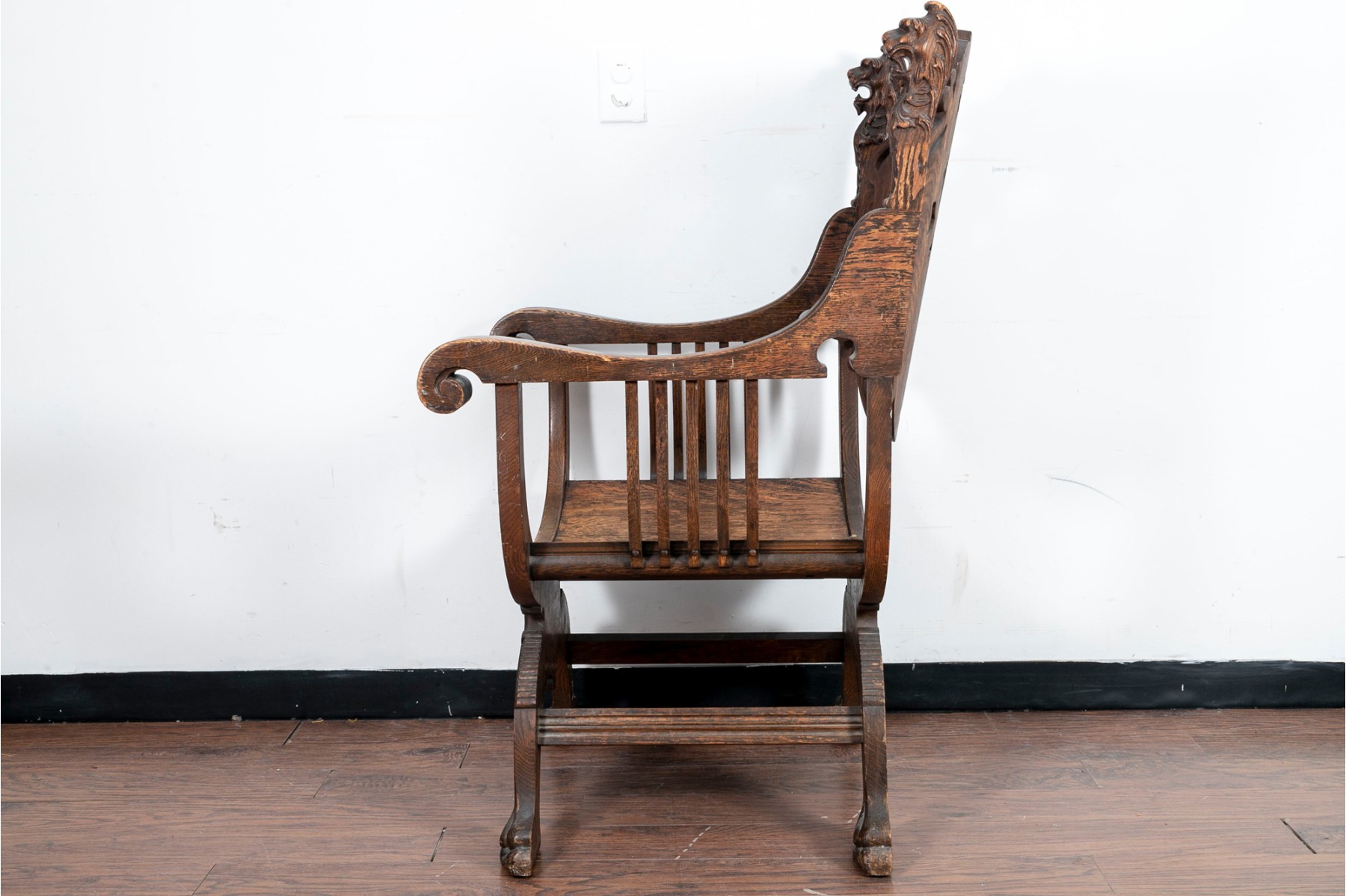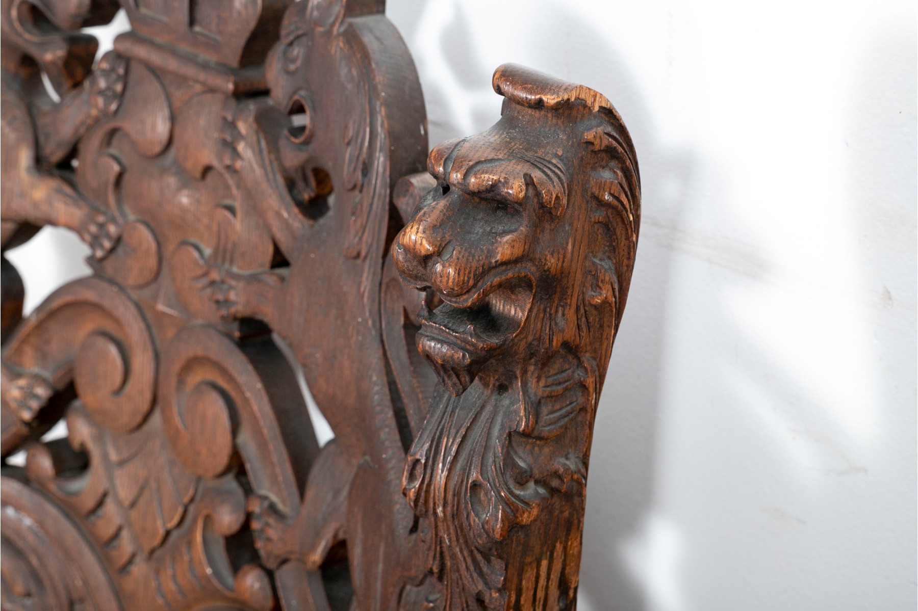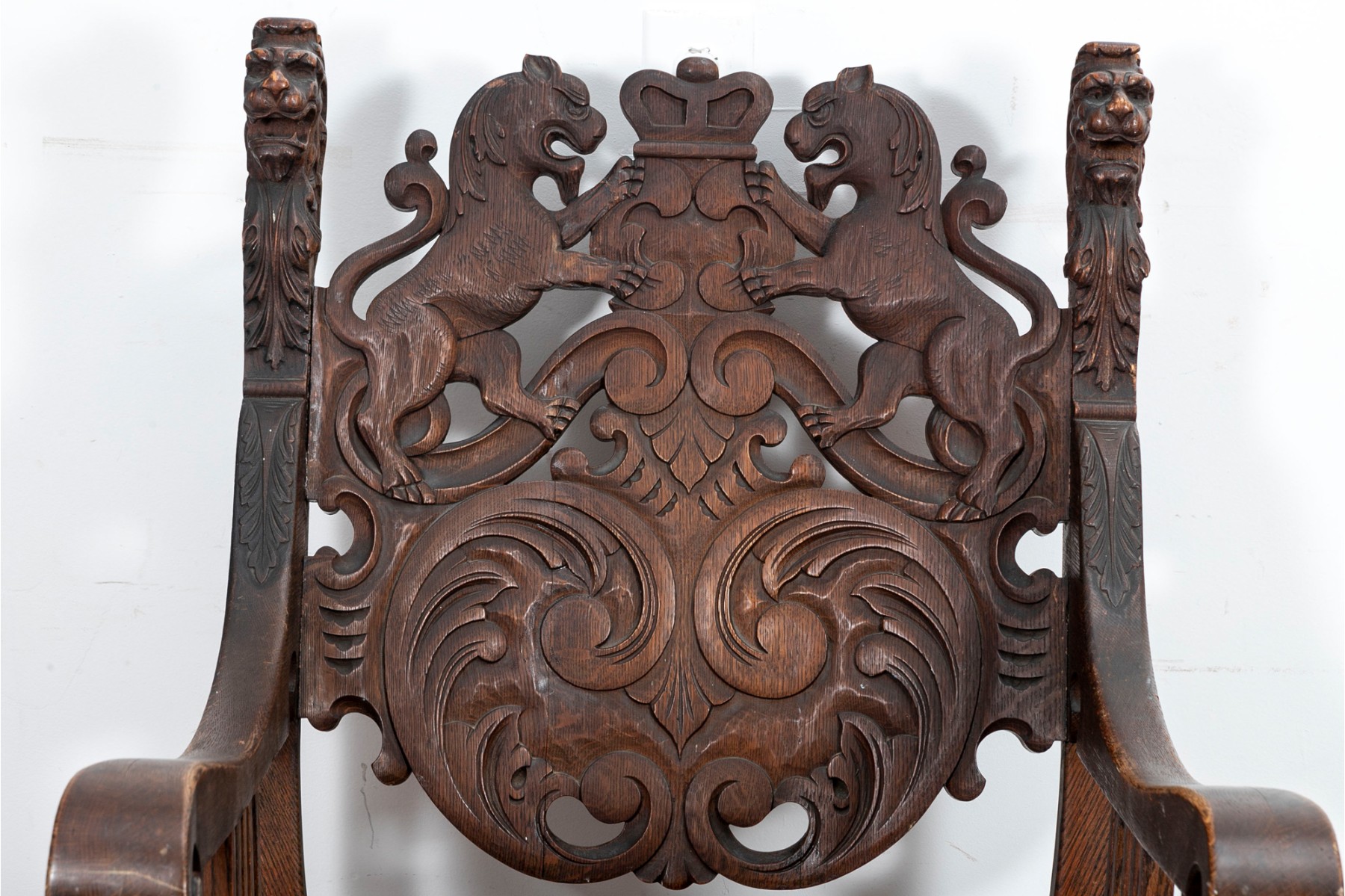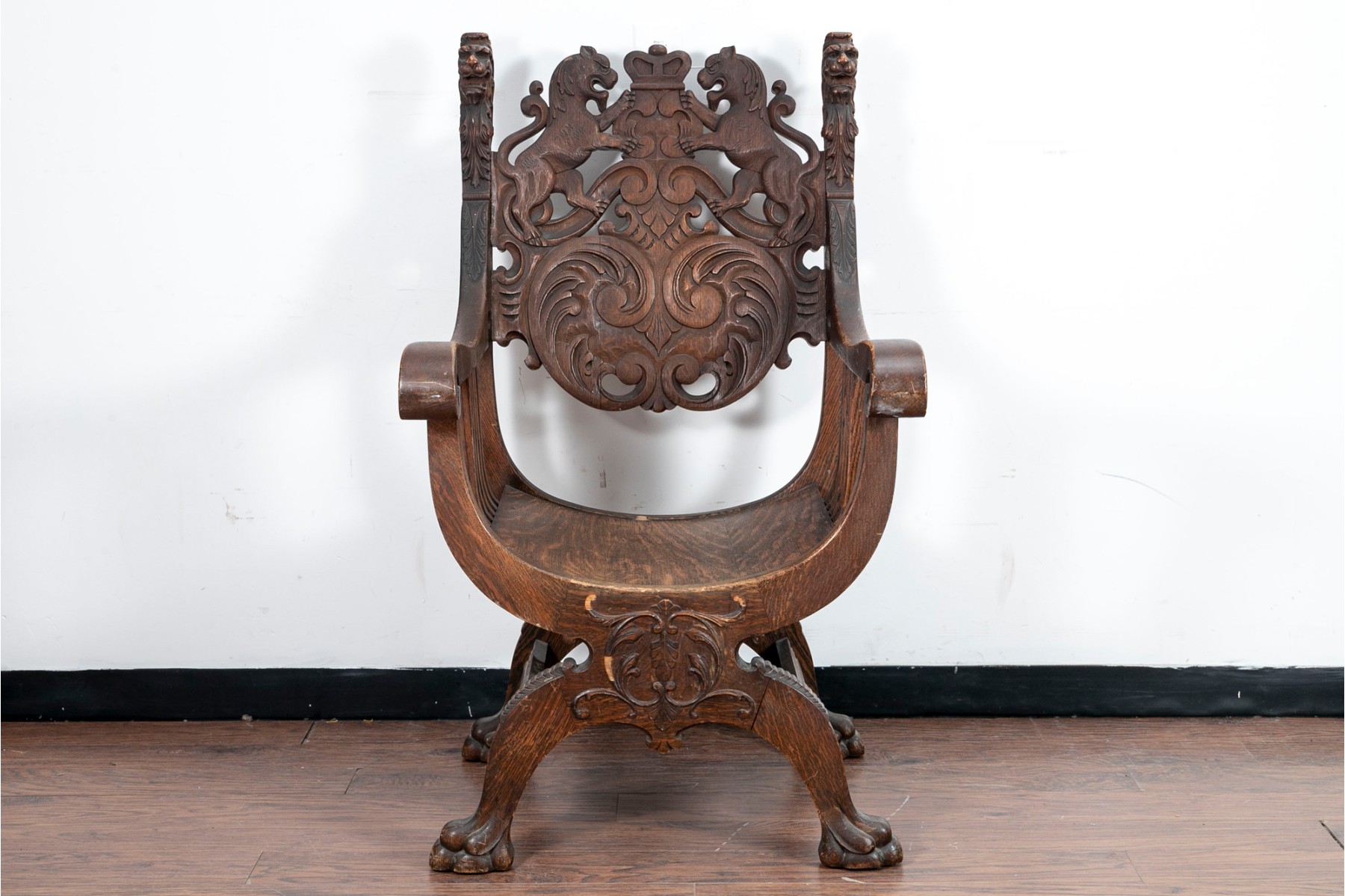 An impressive and throne-like antique oak arm chair with a savonarola renaissance style in medium brown oak with a gorgeous wood grain. The back is carved with heraldic lions flanking a crown over elegantly swooping scrolled forms, leading to lion-head posts and scrolled arms. Supported by arched legs on hairy paw feet.