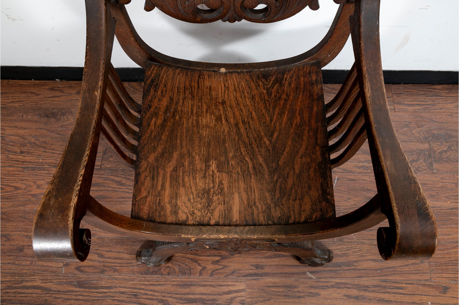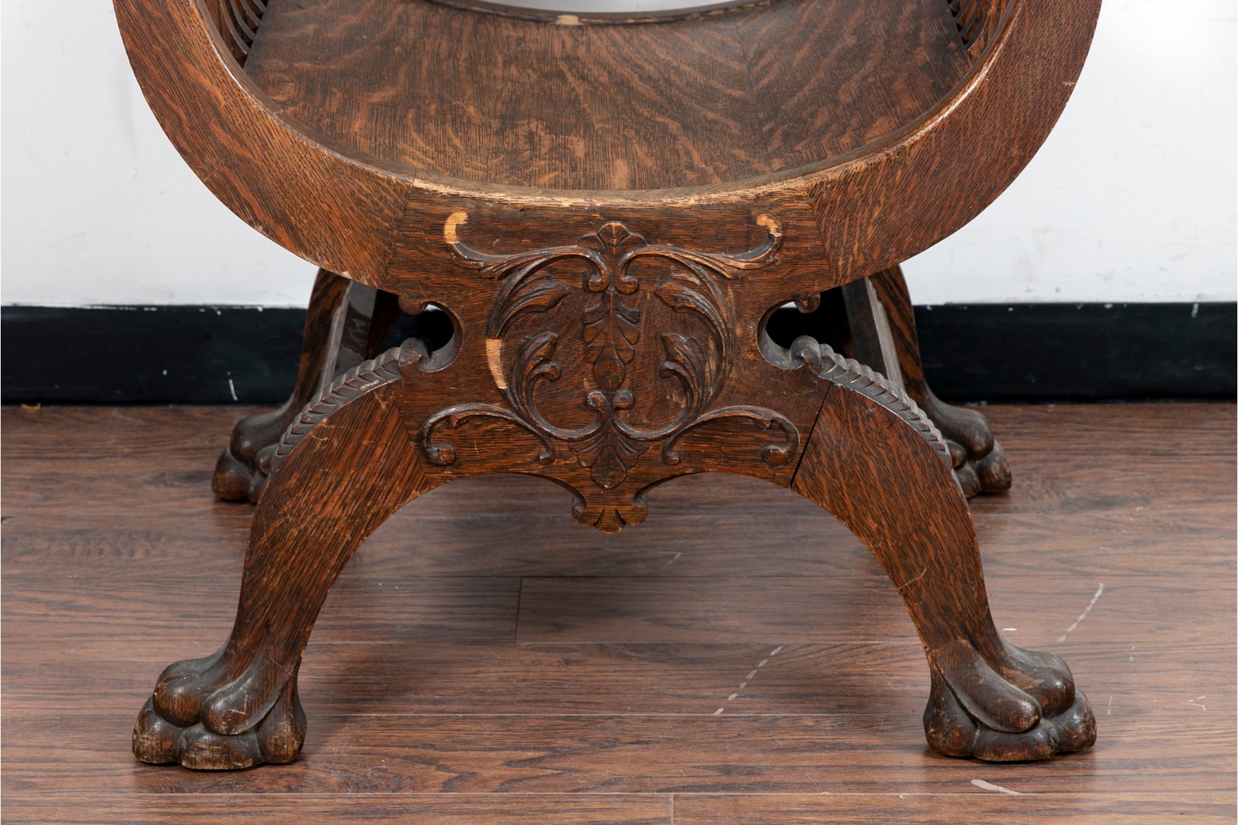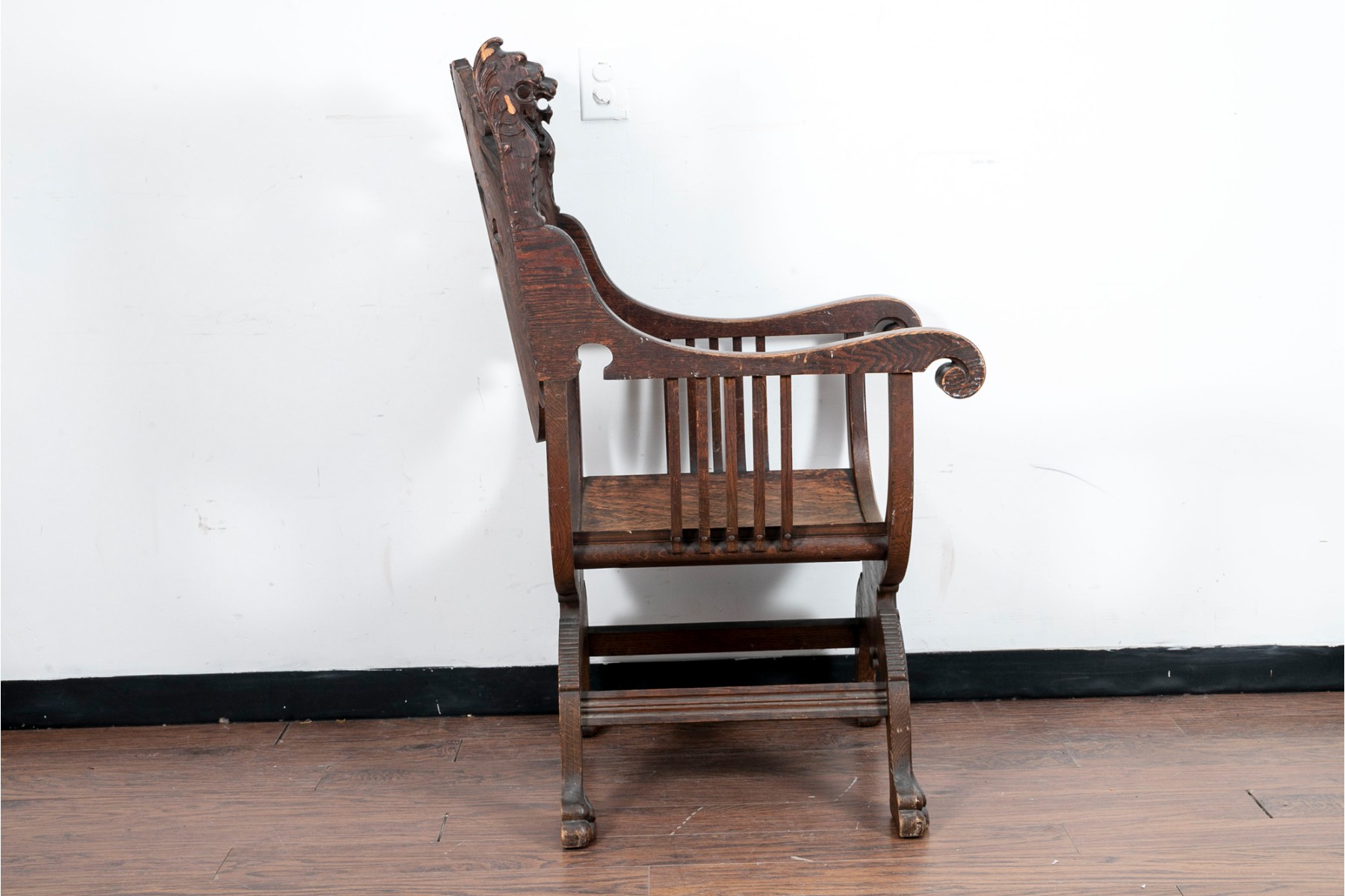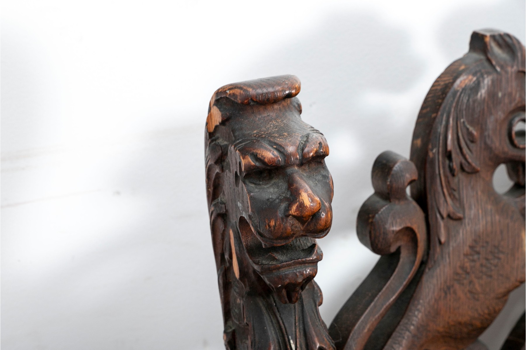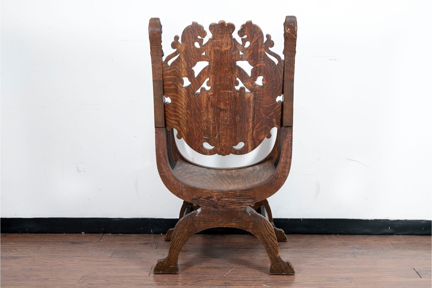 An impressive and throne-like antique oak arm chair with a savonarola renaissance style in medium brown oak with a gorgeous wood grain. The back is carved with heraldic lions flanking a crown over elegantly swooping scrolled forms, leading to lion-head posts and scrolled arms. Supported by arched legs on hairy paw feet.