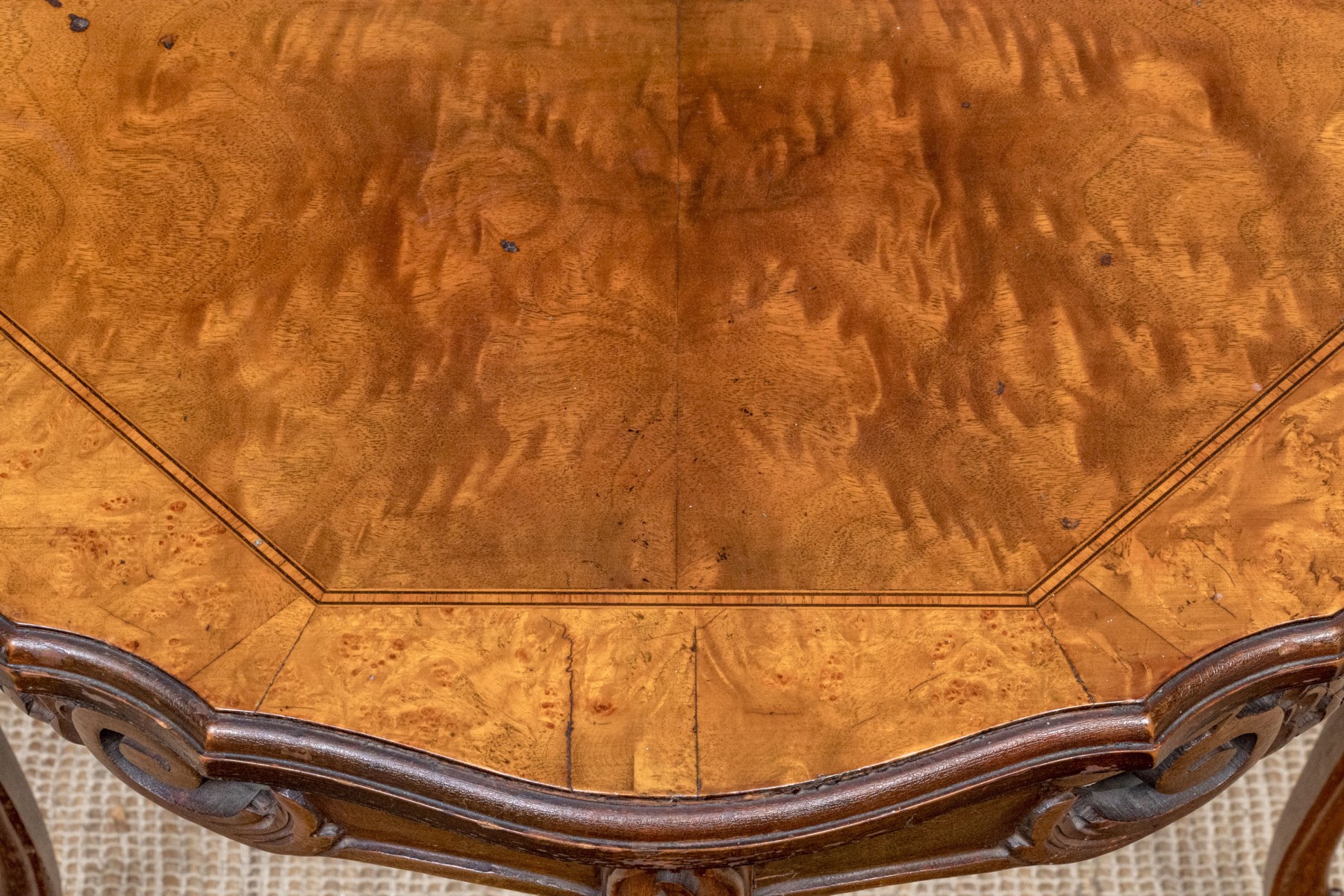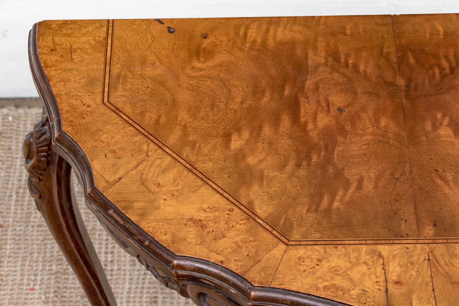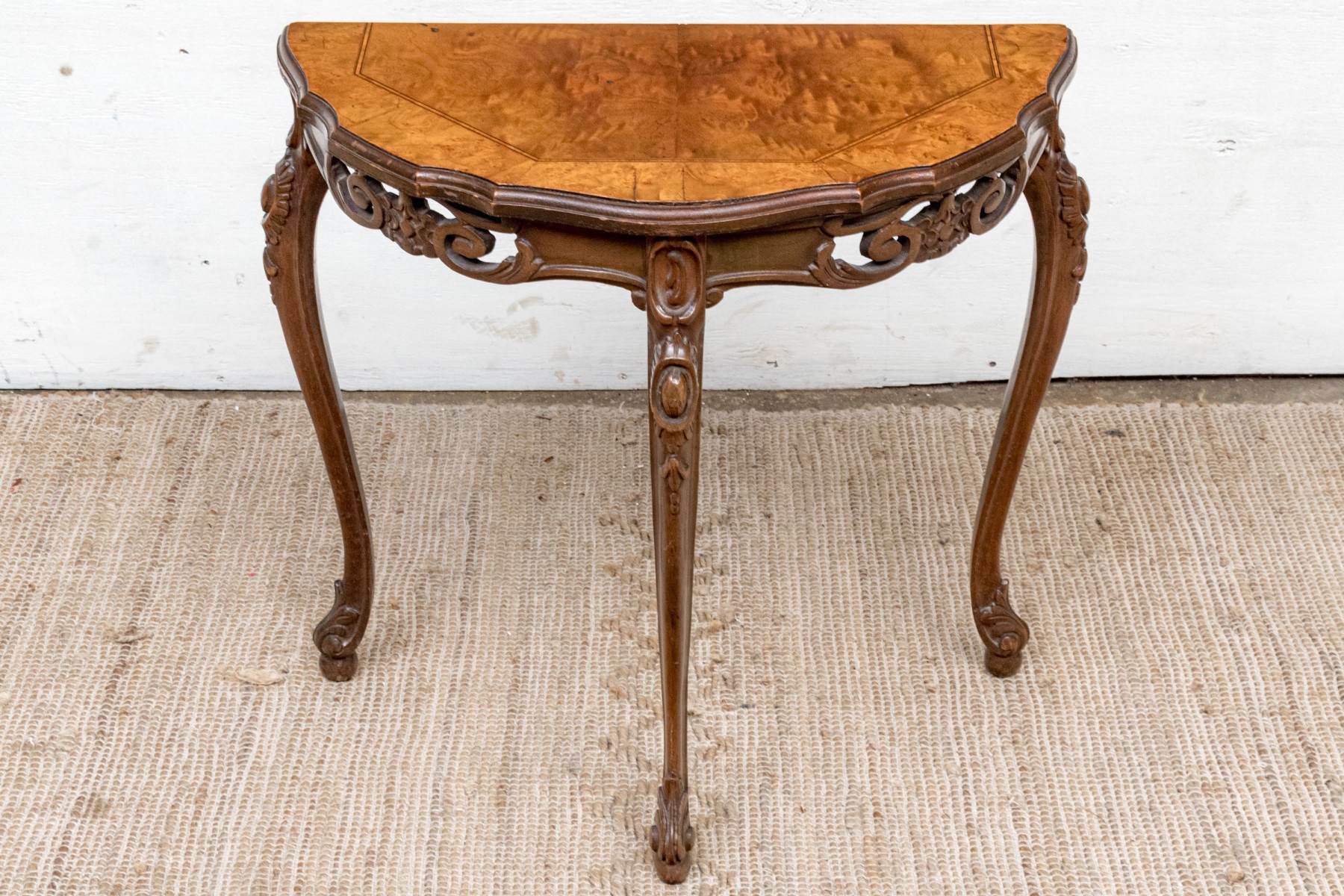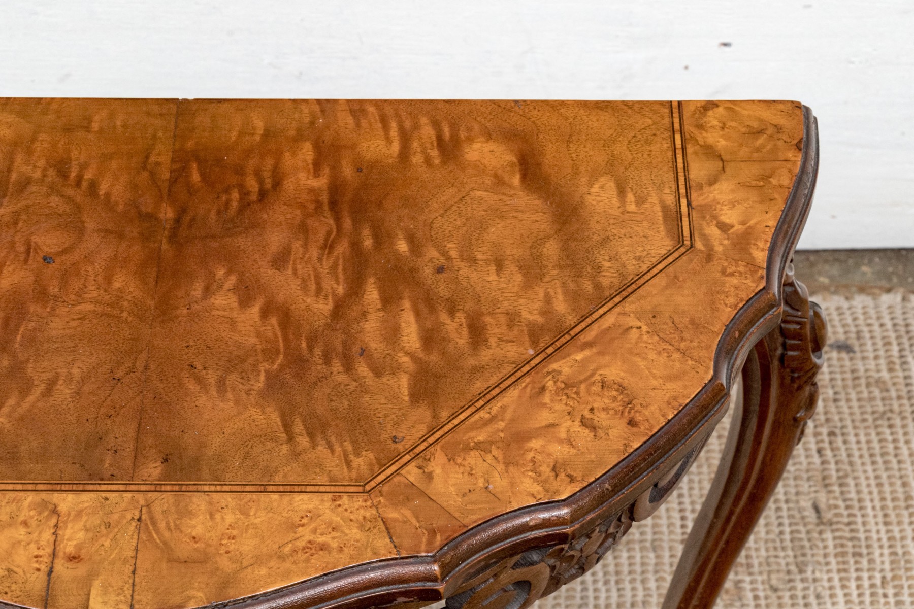 Carved walnut with satinwood inlay and hand carved legs.