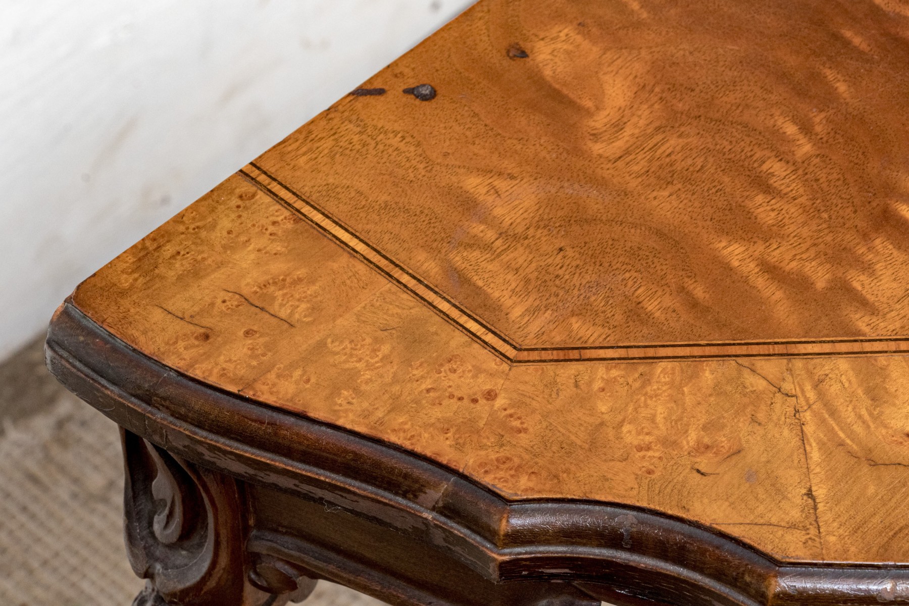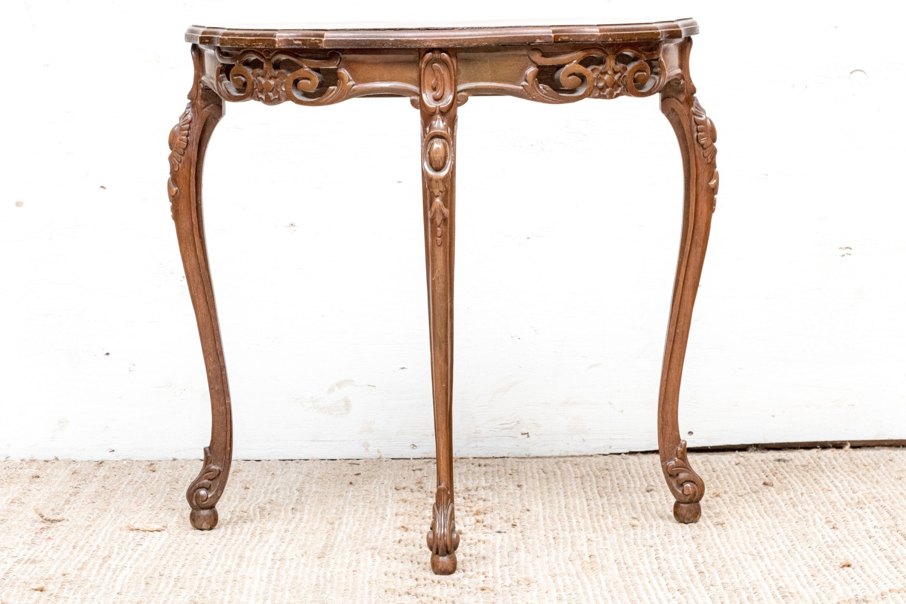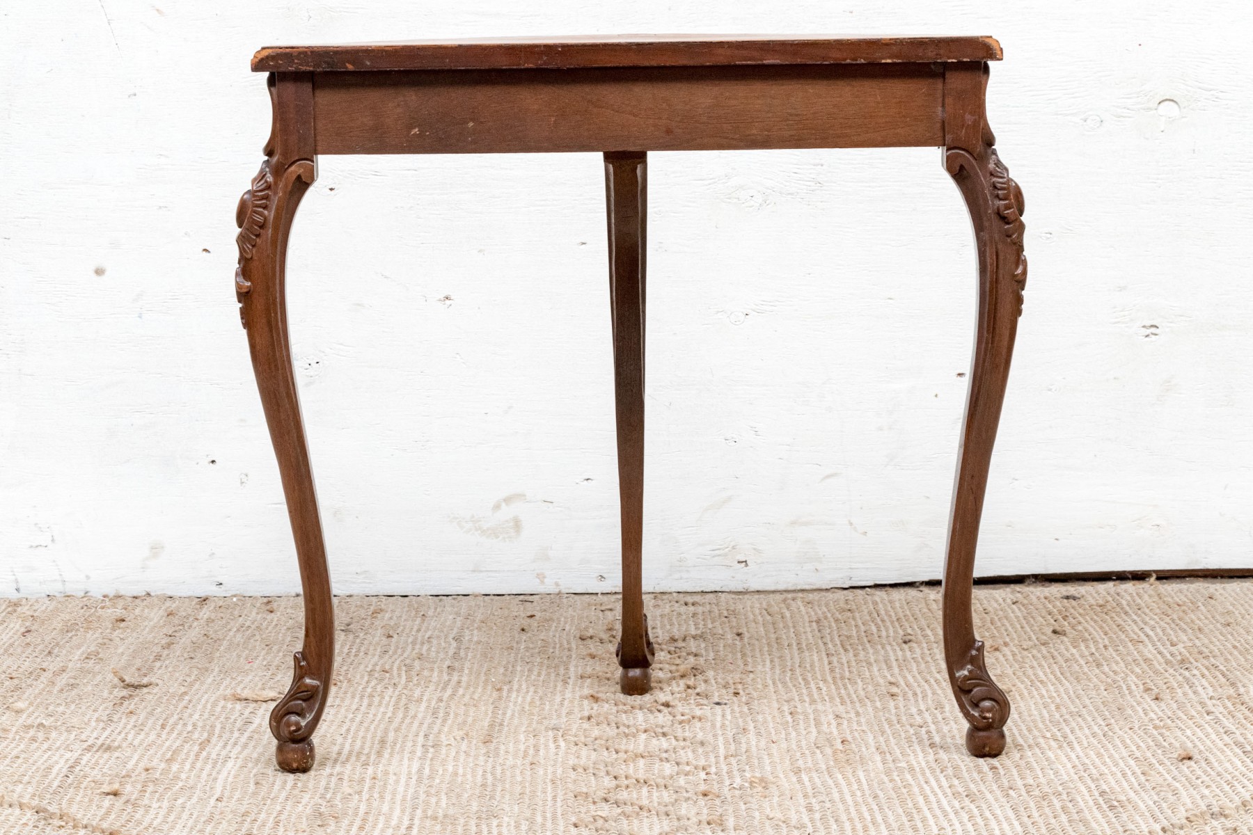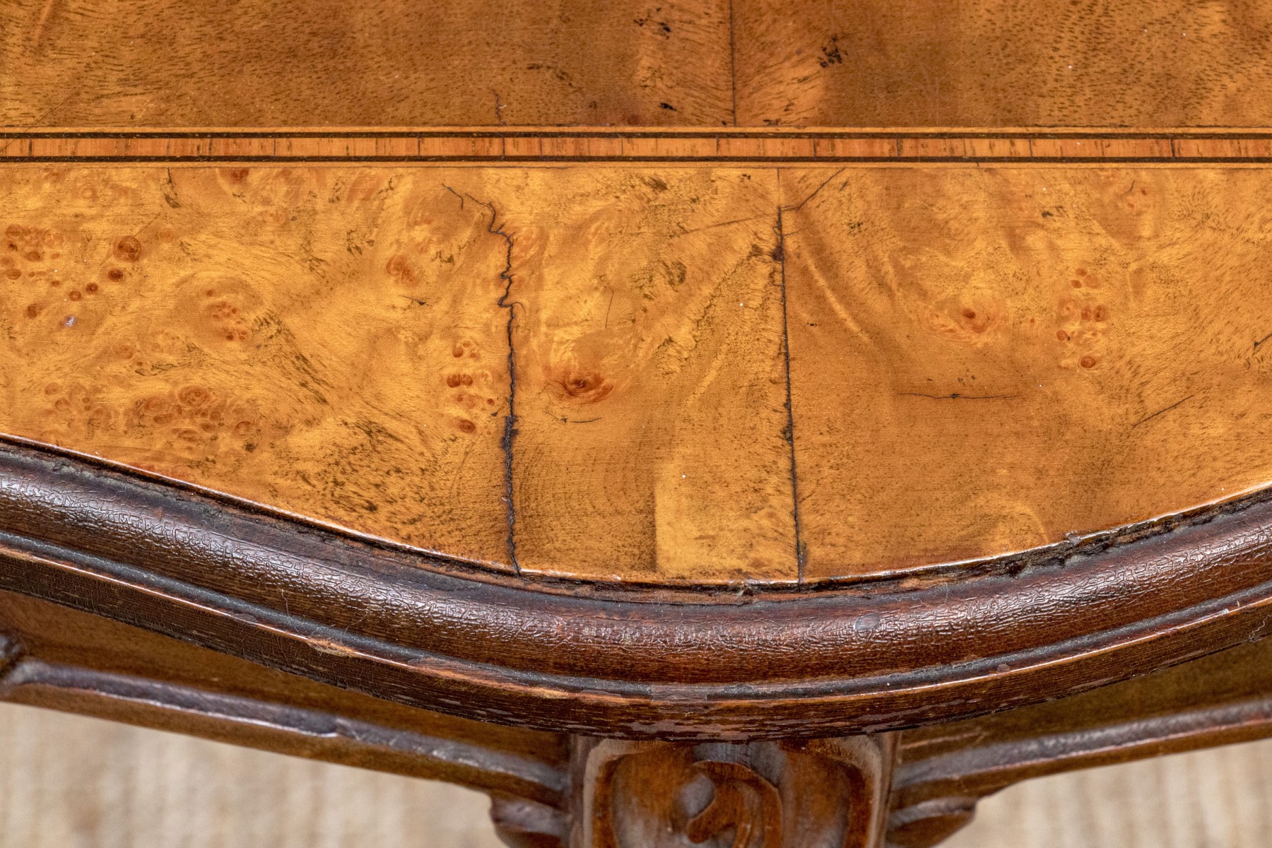 Carved walnut with satinwood inlay and hand carved legs.