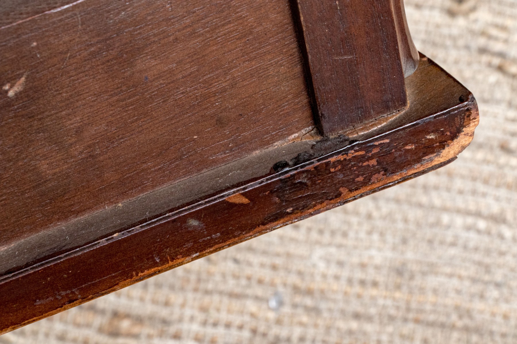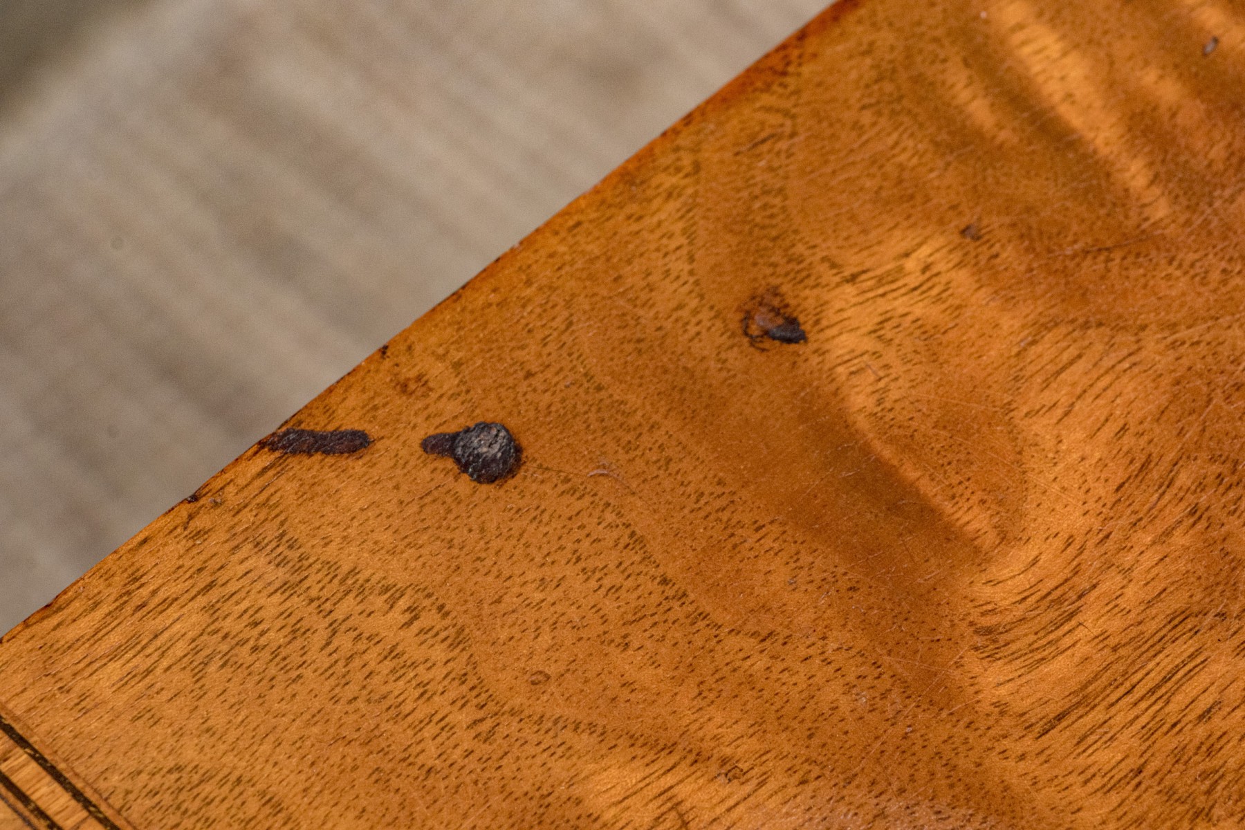 old dry finish on top, a few small burn marks, nice and sturdy and a easy to place size