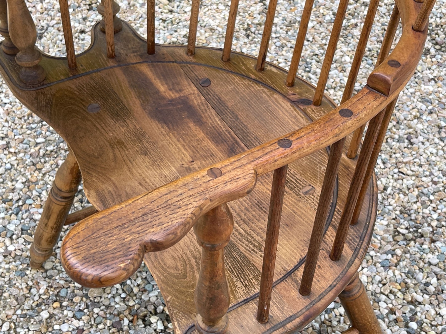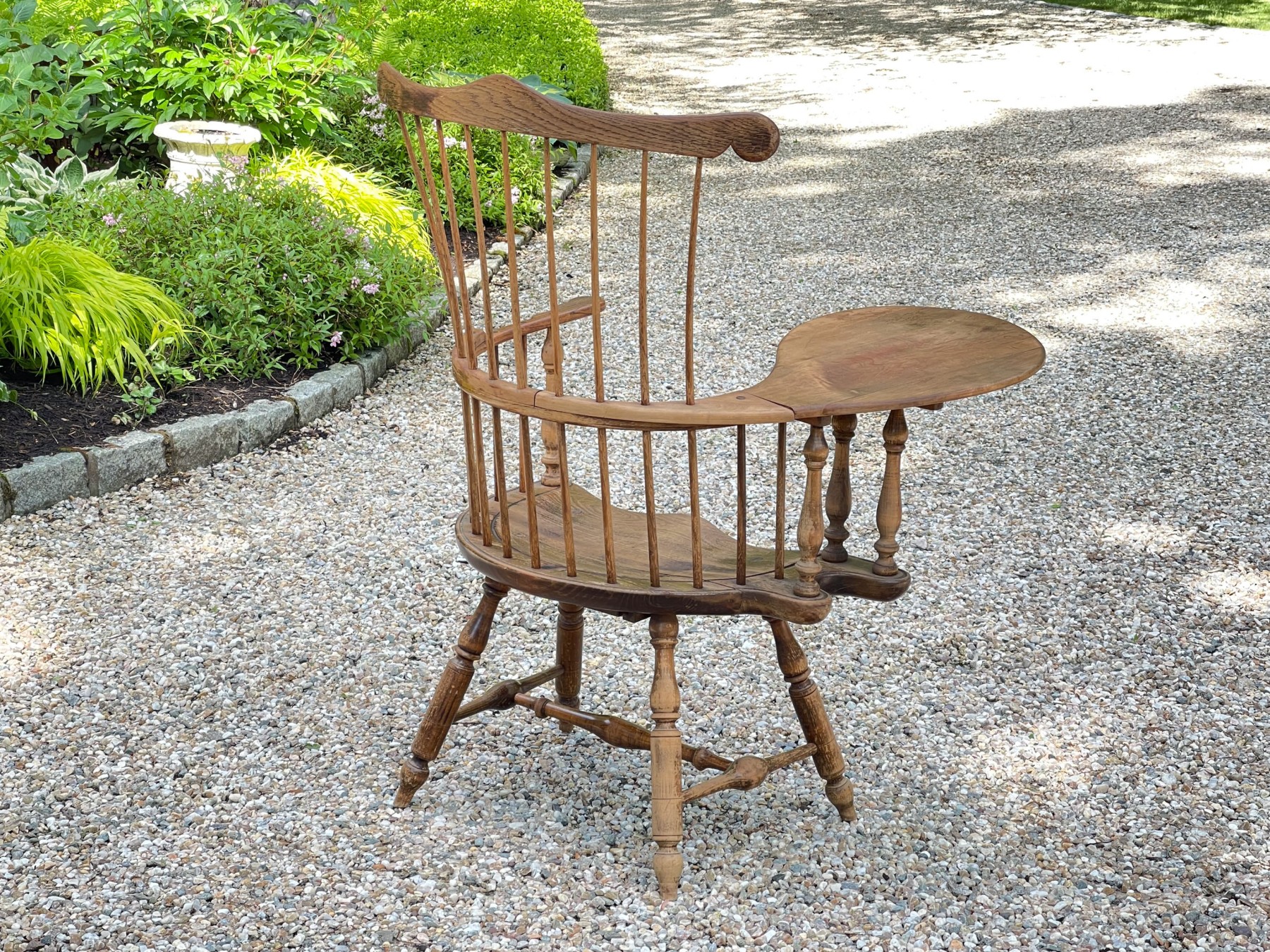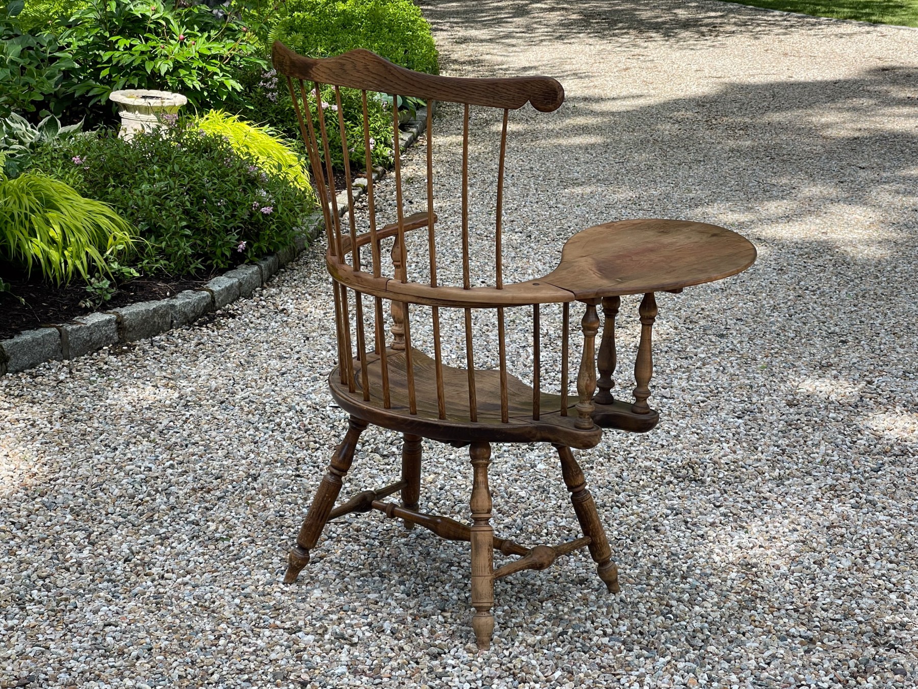 A finely crafted Windsor chair with a scrolled crest rail, one curved arm end and one desk shaped arm end, A double spindle back and shaped seat raised on turned splayed legs with turned H stretcher.