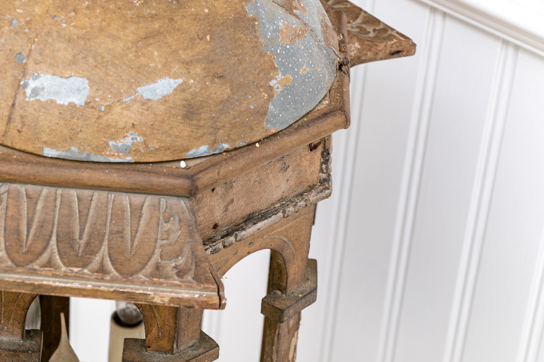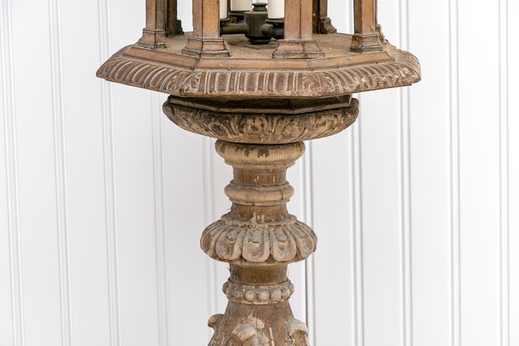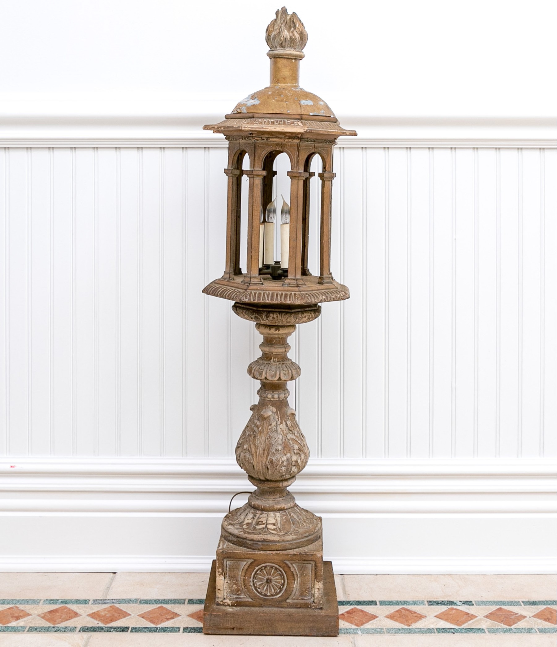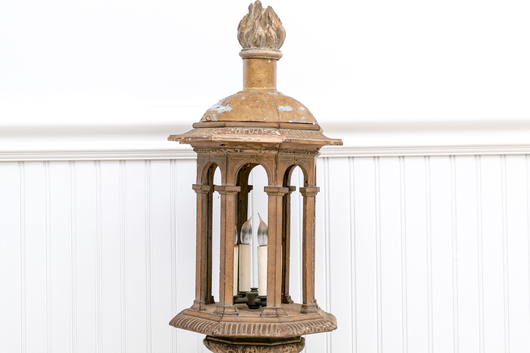 Antique carved wood lantern with four lights, featuring ornate detailing supported by a square silhouette plinth topped with a flame finial. The piece has acquired a nice patina from age, adding to its antique charm.