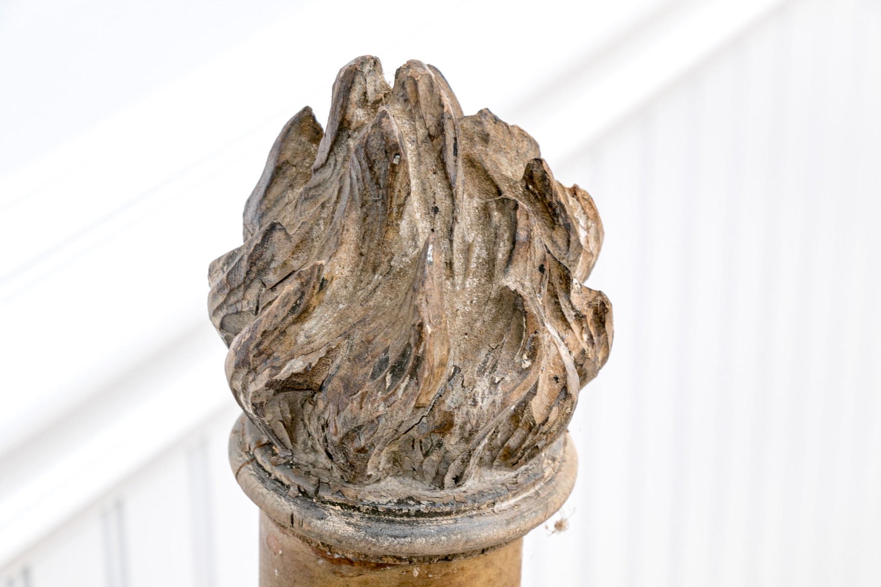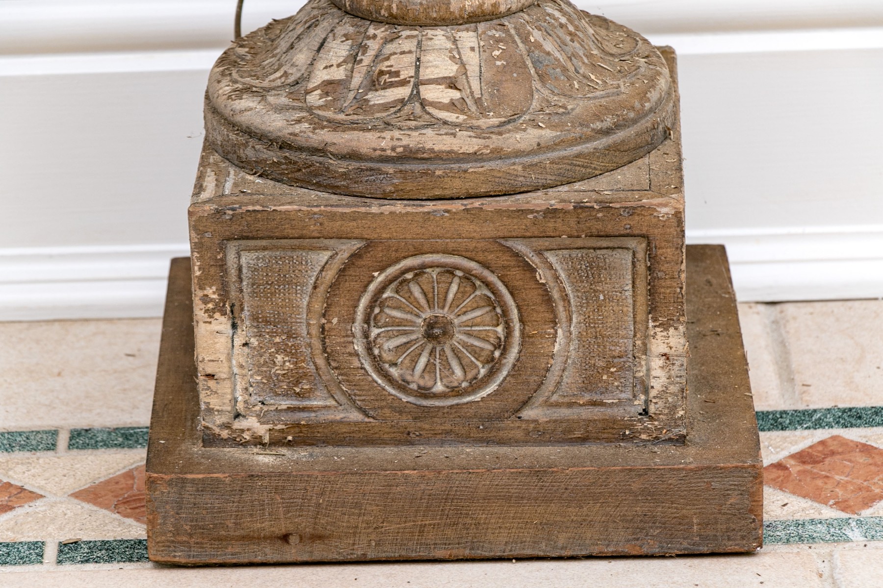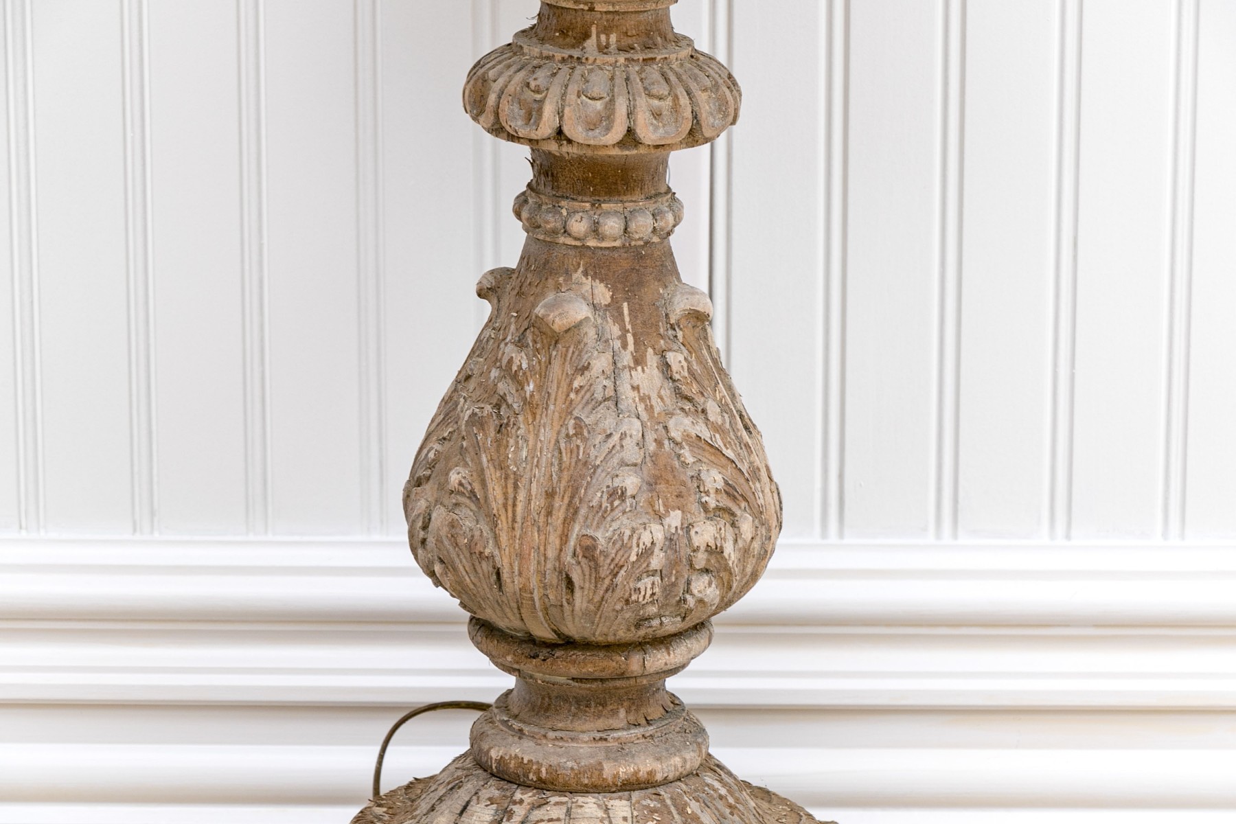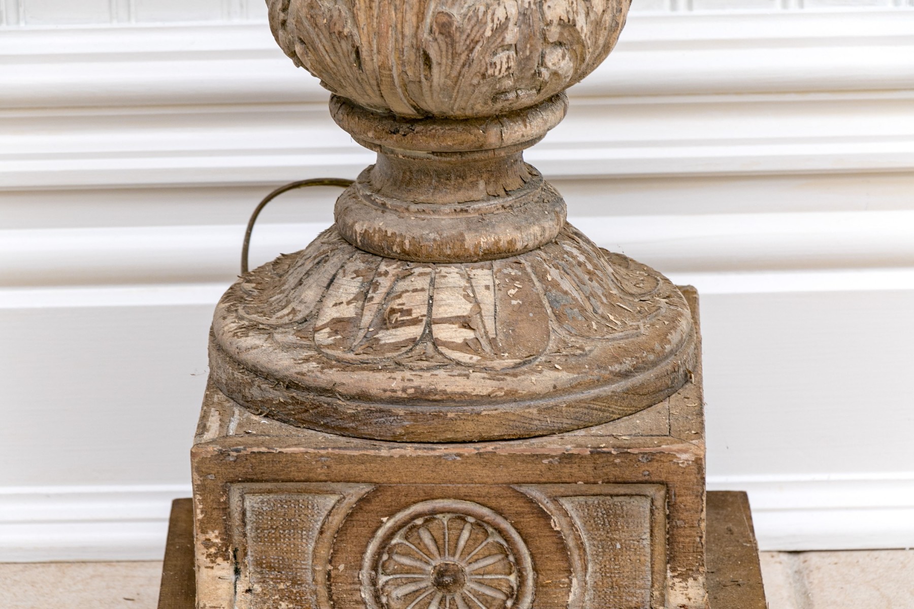 Antique carved wood lantern with four lights, featuring ornate detailing supported by a square silhouette plinth topped with a flame finial. The piece has acquired a nice patina from age, adding to its antique charm.