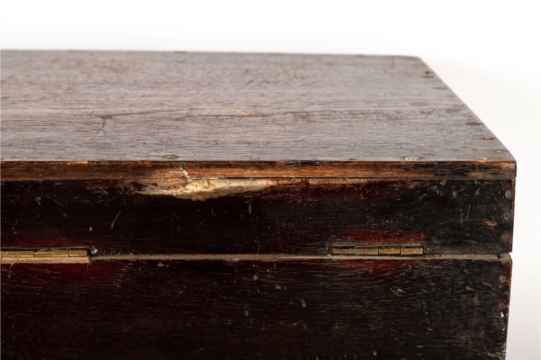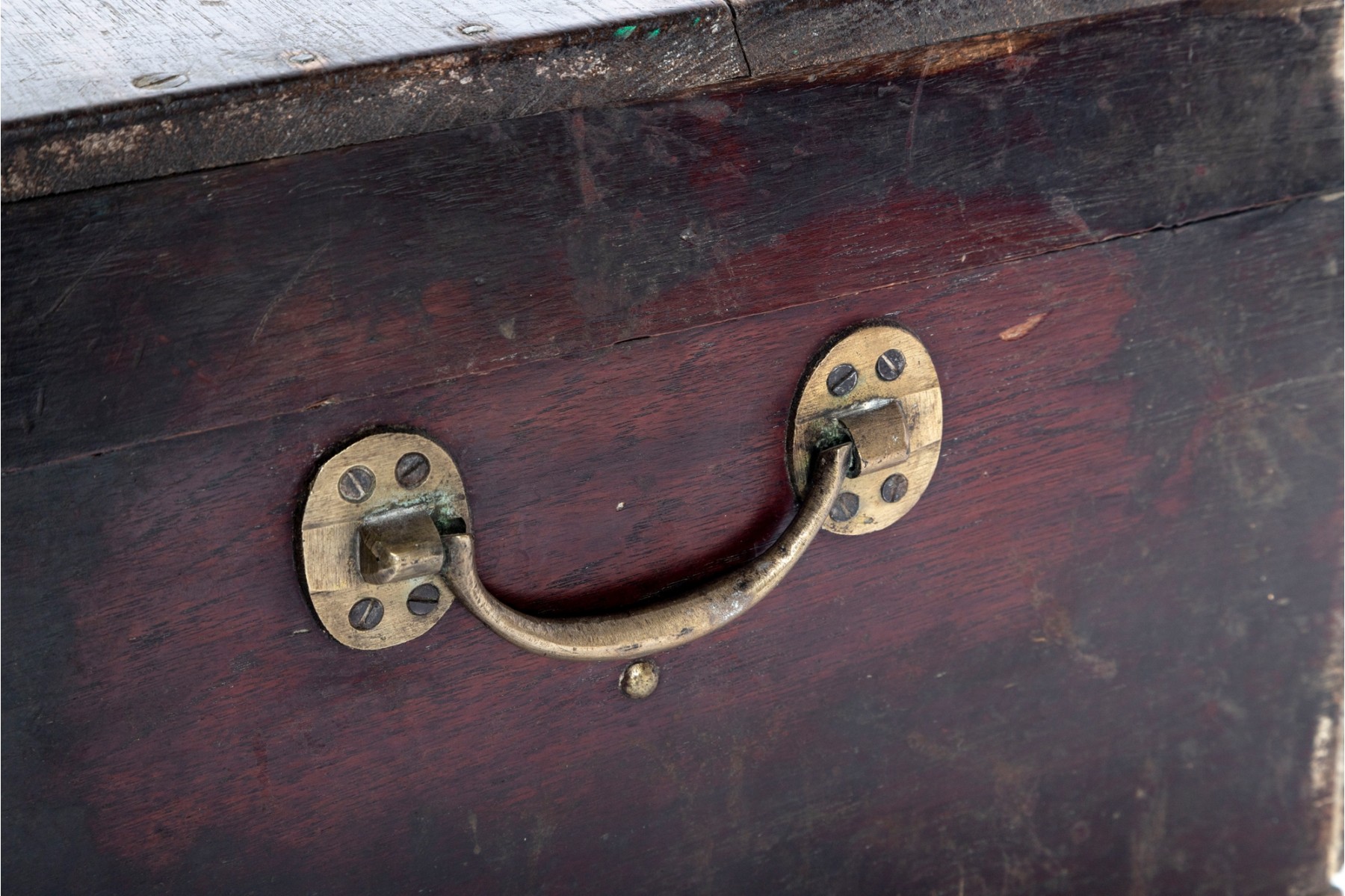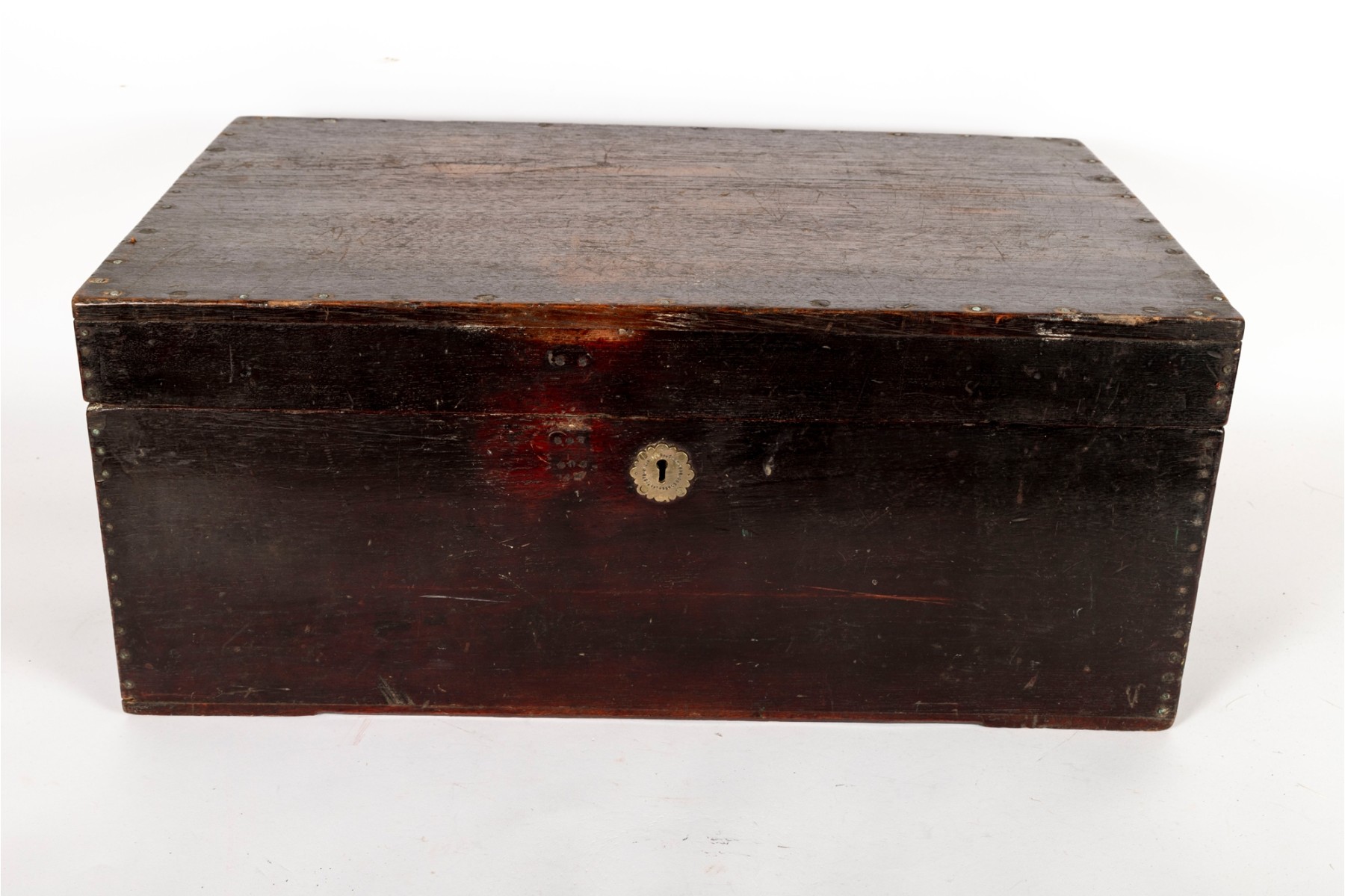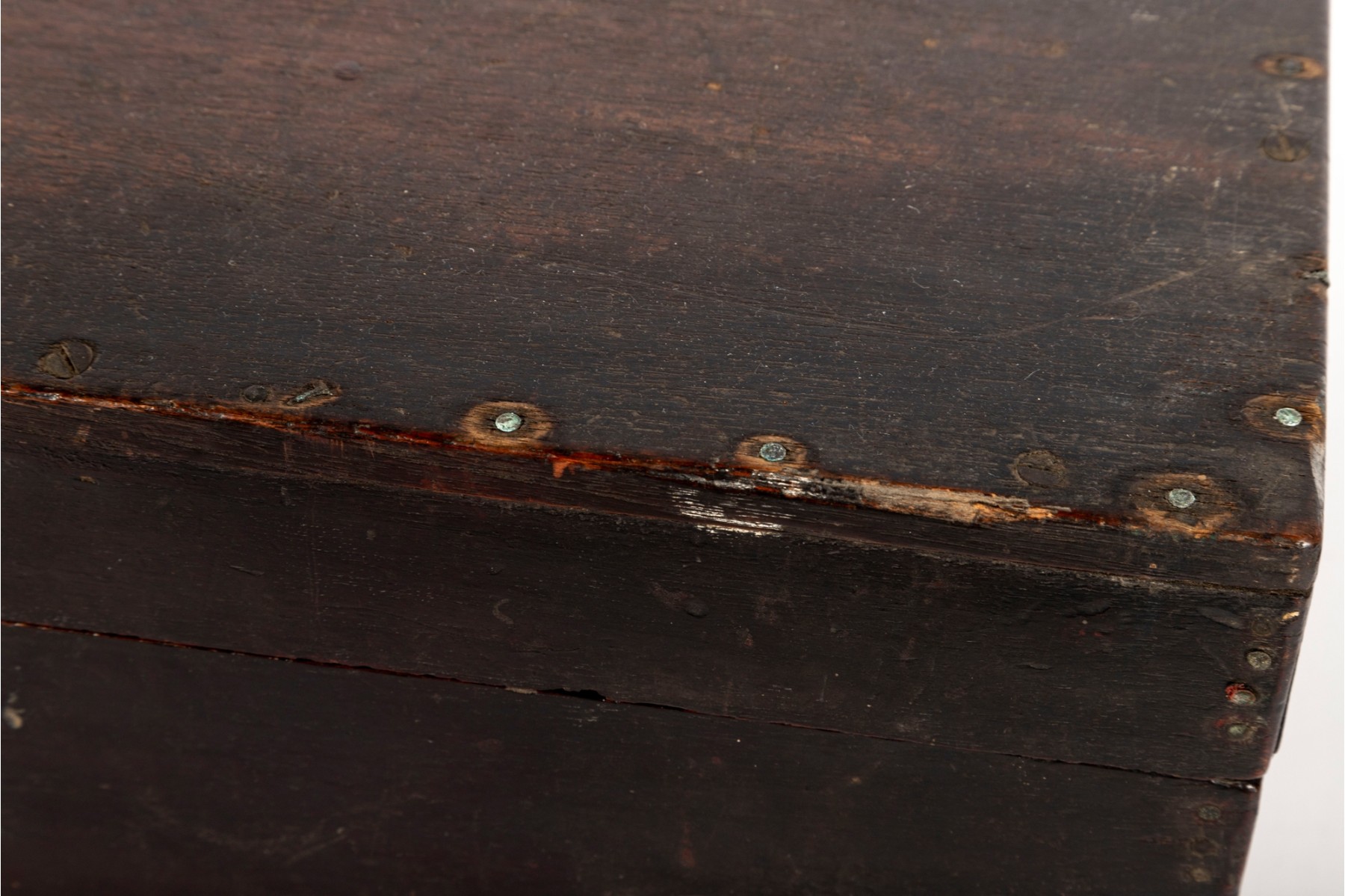 An antique cash chest or trunk, constructed from sturdy wood reinforced with iron nails -- originally designed for secure storage of valuables.